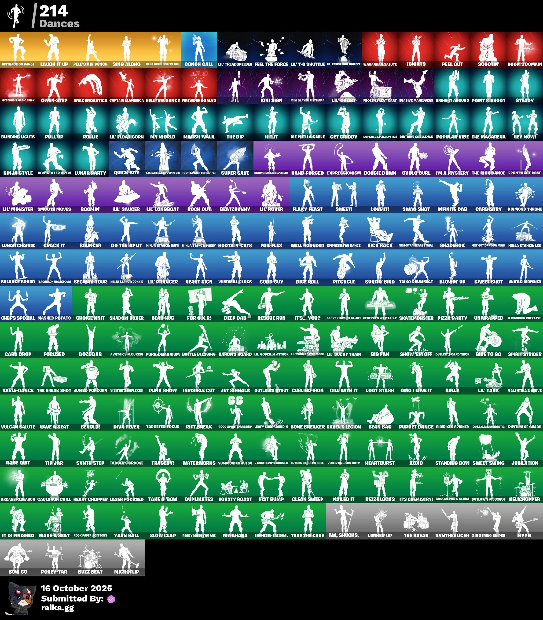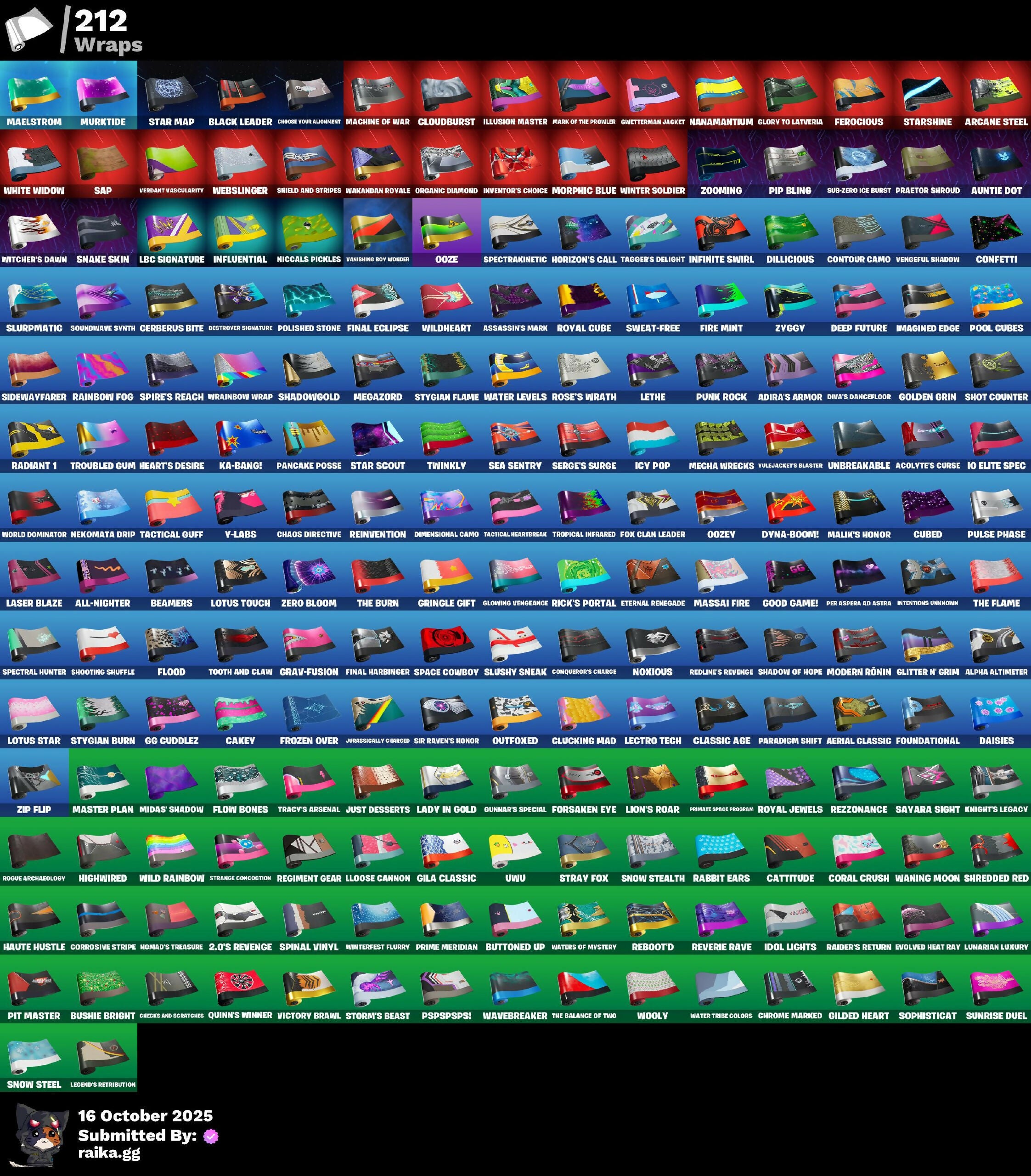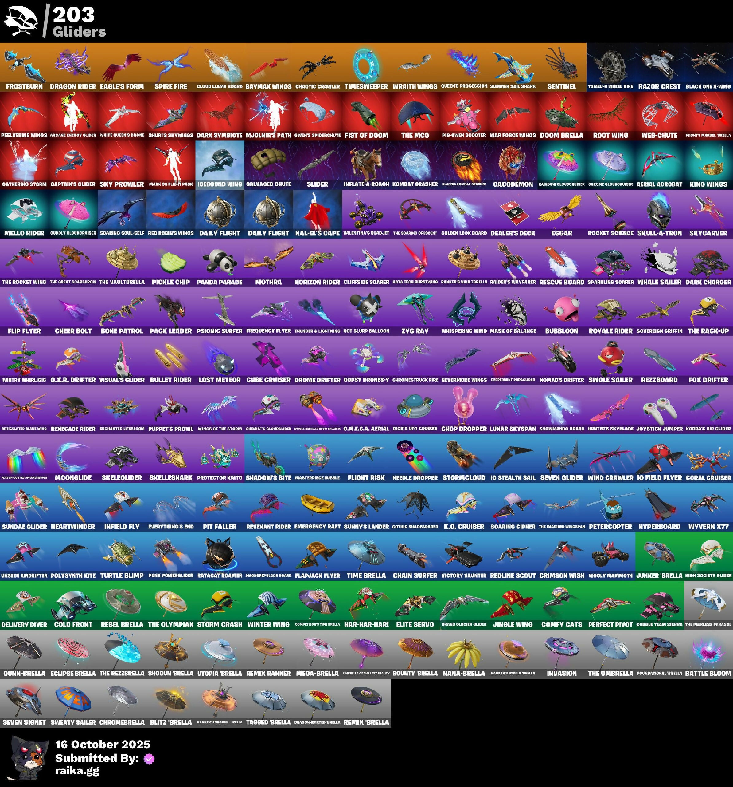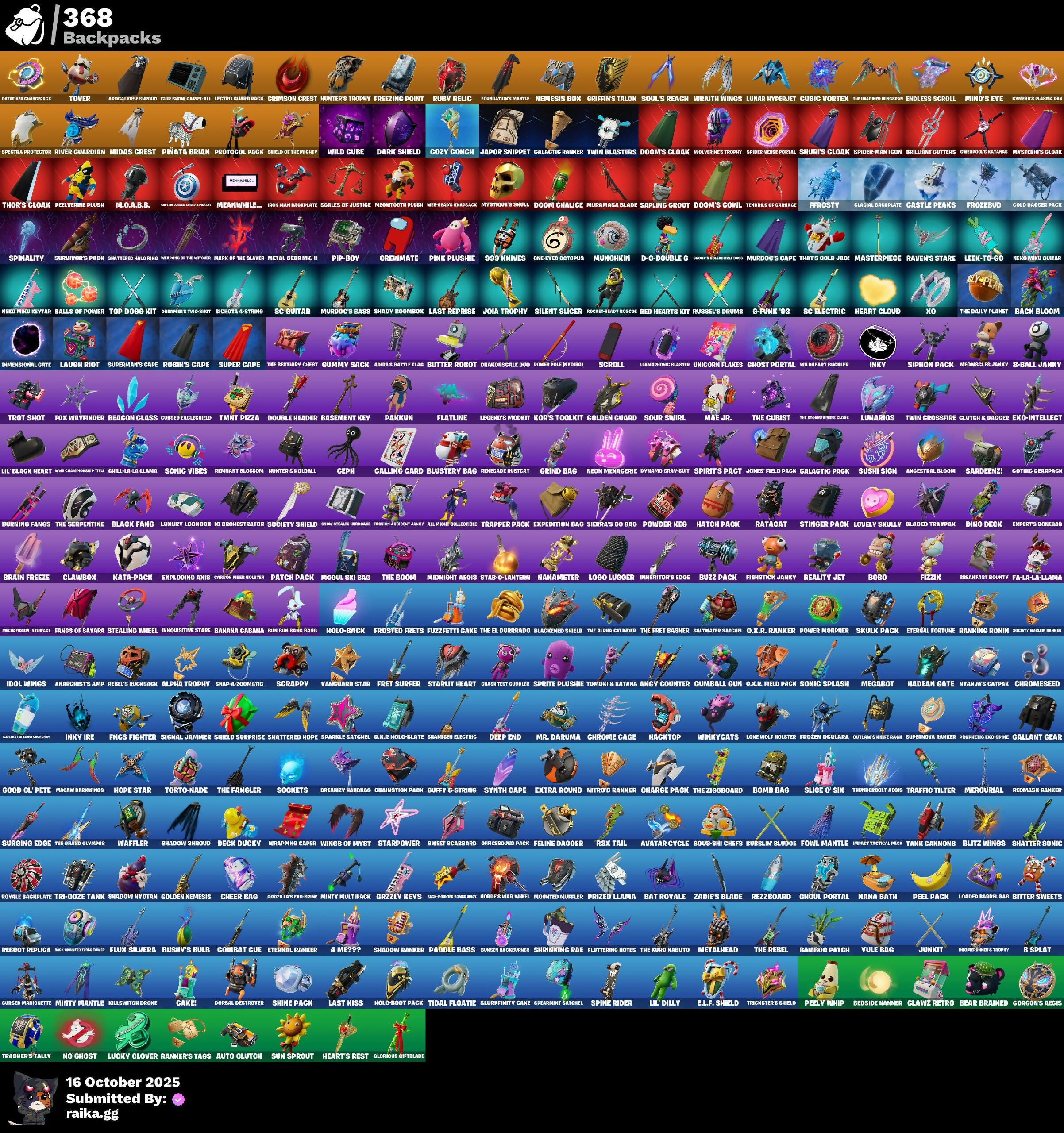 1-Ball, 10 Orchestrator, 18's Kama, 2.O's Revenge, 2022, 4 Mec???, 6-Carat Cutter, 8 Splat, 8-Ball Janky, 998 Knives, 999 Knives, A Warrior Prepares, Abduction, Absenz, Abyssal Blade, Acolyte's Curse, Adira, Adira's Battle Flag, Adira’s Armor, Aerial, Aerial Acrobat, Aerial Assault Bomber, Aerial Classic, Aerial Swagger, Aftermath, Agent Jones, Agent Jones (Jump 31), Agent Patch, Ahsoka Tano, Ahsoka's Staff, All-Nighter, All-Weather Electrofox, Alpha Altimeter, Alpha Trophy, Alto, Anarchist's Amp, Ancestral Bloom, Andy Fangerson, Angy Counter, Anniversary Axe, Antonia, Antonia In Action, Apex Predator, Aphrodite, Apocalypse Shroud, Appeeling Drive, Apprentice Evie, Arachrobatics, Arcade Cat, Arcane Energy Glider, Arcane Research, Arcane Steel, Arctic Achiever, Arctic Adeline, Assassin's Mark, Augury, Auntie Dot, Aura, Aurelian, Auto Clutch, Avatar Cycle, Avatar's Flourish, Aw, Shucks., Axe-Tral Form, Axo's Big Moment, Ayla Winn, Azarath Metro Ventosis, B Splat, B.R.U.T.E. Gunner, Babygirlll, Back Bloom, Backup Blades, Bad Joke, Balance Board, Balanced, Balls Of Power, Bam-Boom!, Bamboo Patch, Bamboo-Tana, Banana Cabana, Baron Kane, Baron's Hoard, Basement Key, Basketball Hoop, Bat Royale, Battle Ball, Battle Blessing, Battle Bloom, Battle Damager Mae, Battle Mode, Bawk Off, Baymax Wings, Be The Mastermind, Beacon Glass, Beamers, Bean Bag, Bear Brained, Bear Hug, Beastfang, Beat Breaker, Beatzbunny, Bedside Nanner, Beef Blade, Behold!, Belt It!, Bernie, Berserker Barrage, Beskar, Bi-Han, Bichota 4-String, Big Dill, Big Fan, Big Guns, Big Smooch, Bike To Go, Birdarang Flourish, Birdie, Birthday Basher, Birthday Dash, Bitter Sweets, Black Fang, Black Hole, Black Leader, Black One X-Wing, Black Panther (Shuri), Black Queen, Blackened Shield, Blade of the Waxing Moon, Bladed Travpak, Blades of Light, Blinding Lights, Blitz 'Brella, Blitz Axe, Blitz Wings, Blizzard's Bite, Blocko, Blowin' Up, Blue-Blood, Blustery Bag, Board Breaker, Bobo, Bomb Bag, Bomb Bouquet, Bombastic Winterfest, Bone Breaker, Bone Patrol, Bones, Boogie Down, Boogieman, Boomin', Boots'n Cats, Both Eyes Open, Bouncer, Bounty 'Brella, Bow Go, Braille Competitor, Brain Freeze, Break Point Ultra, Breakfast Bounty, Breaking Waves, Breakpoint, Breakshore Trident, Breathless Blades, Brilliant Cutters, Bring It Around, Brite Hatsune Miku, Bronzed Scimitars, Bruno's Blue Heart, Bubble Basher, Bubblegum Highwire, Bubbli'n Sludge, Bubblin' Sludge, Bubbloon, Buffer Fish, Bug Punk Sunny, Bug Spray, Bullet Rider, Bullseye, Bully, Bun Bun Bang Bang, Bun Bun Blast, Burning Ambition Valeria, Burning Fangs, Burning Sparks, Burning UFO, Bushie Bright, Bushy's Bulb, Butter Robot, Buttoned Up, Buzz Beat, Buzz Pack, By The Horns, Bytes, Bytes' Sigil, Cacodemon, Cake!, Cakey, Calling Card, Camo War Machine, Candy Axe, Caper, Captain Almerica, Captain James S. Peeker, Captain Jones, Captain Jones (Pen & Ink), Captain Phasma, Captain's Glider, Carbon Fiber Holster, Card Drop, Cardistry, Carmine Rosso, Carnage, Carnage Cleaver, Cassidy Quinn, Castle Peaks, Cattitude, Cauldron Chill, Celebratory Slice, Centurion, Centurion Edge, Ceph, Cerberus, Cerberus Bite, Cerberus Medallion, Chain Surfer, Chainsaur, Chainstick Pack, Chalked Up 1-Ball, Challenger Cerberus, Challenger Menace - Flame, Challenger's Staff, Champions Wants You, Chaos Directive, Chaos Director, Chaos Origins, Chaotic Crawler, Charge Pack, Charlotte, Charlotte's Logo, Checks And Scratches, Cheer Bag, Cheer Bolt, Chef's Special, Chemist's Cloudglider, Chibi, Chill-Axe, Chill-La-La-Llama, Choice 4 Knit, Chomp Cudi, Choose Naughty, Chop Chop, Chop Dropper, Choppy, Chrome Cage, Chrome Cloudcruiser, Chrome Marked, Chromebrella, Chromestruck Fire, Chromoseed, Clang & Basher, Clark Kent, Classic Age, Classic Peelverine, Classic Wolverine, Clawbox, Clawz Retro, Clean Sweep, Cliffside Soarer, Clinical Crosser, Clip Show Carry-All, Clix, Cloud Llama Board, Cloudburst, Cluck (Slurpy), Clucking Mad, Clutch & Dagger, Codecarver, Codename E.L.F., Cold Dagger Pack, Cold Front, Cold Furia, Cold Snap, Cold'en Touch, Collector Kado Thorne, Color Crush, Combat Cue, Combat Elite, Combat Giller, Comfy Cats, Competitor Medusa, Competitor's Time Brella, Conch Call, Confetti, Conjuring Mysterio, Conqueror's Axe, Conqueror's Charge, Conqueror's Claim, Conqueror's Stare, Contour Camo, Contract Giller, Controlled Chaos, Controller Crew, Coral Cruiser, Coral Crush, Corrosive Stripe, Cosmic Legacy, Cosmic Sun, Couldn't Team Specialist, Courageous Mikasa, Cozy Conch, Crack It, Crash Test Cuddler, Crashed Chiller, Crashed Shield, Crescent Shroom, Crewmate, Crimson Crest, Crimson Wish, Cross Your Heart, Crowning Achievement, Crucible Blade, Crystal, Crystal Axe of the Masters, Crystal Fang, Crystal Smasher, Cube Assassin, Cube Cruiser, Cube Edge, Cube Marking, Cubed, Cubic Vortex, Cuddle Carvers, Cuddle Team Sierra, Cuddle's Garden, Cuddly Cloudcruiser, Curling Iron, Cursed Eagleshield, Cursed Marionette, Cyclo Curl, D'Ark, D-O-Double G, D.C. 63, Da Bomb, Daft Punk Profile, Dahlia, Daigo, Daigo's Claws, Daigo's Stance, Daily Flight, Daisies, Dancefloor Diva, Danica, Dark Axe, Dark Blessing, Dark Charger, Dark Gwenpool, Dark Jonesy, Dark Red Knight, Dark Shield, Dark Symbiote, Dark Wild Card, Darth Vader, Datafiber Chargpack, Daughter Of Trigon, Dawn Duelist Nisha, Dayrider Chargeback, De-Rezz De-Stroyer, Deal'em Cassidy Quinn, Dealer's Deck, Deck Ducky, Deep Dab, Deep End, Deep Future, Delivery Diver, Demon Hunter Hope, Demons Beware, Demosnslayer Blade, Designated Hitters, Destroyer Signature, Determined Kendo, Determined Korra, Determined Renegade, Diamond Diva, Diamond Throne, Diamondclaw Picker, Dice Roll, Die With A Smile, Die With A Smile Emote, Digital Dream, Dill With It, Dillicious, Dillinger The Gherk, Dimensional Camo, Dimensional Gate, Dino Deck, Dino Megazord, Dire Goat, Direct The Chaos, Dirtbike Challenge, Distraction Dance, Diva Fever, Diva's Grin, Diva’s Dancefloor, Division, Dizzie, Do The Split,