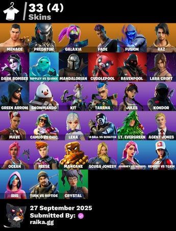[PC/PSN/XBOX] 33 skins | Menace | Predator | Galaxia | Fade | Fusion | Raz | Dark Bomber | Rippley vs Sludge | Mandalorian | Cuddlepool | Ravenpool | 50 VB / FN