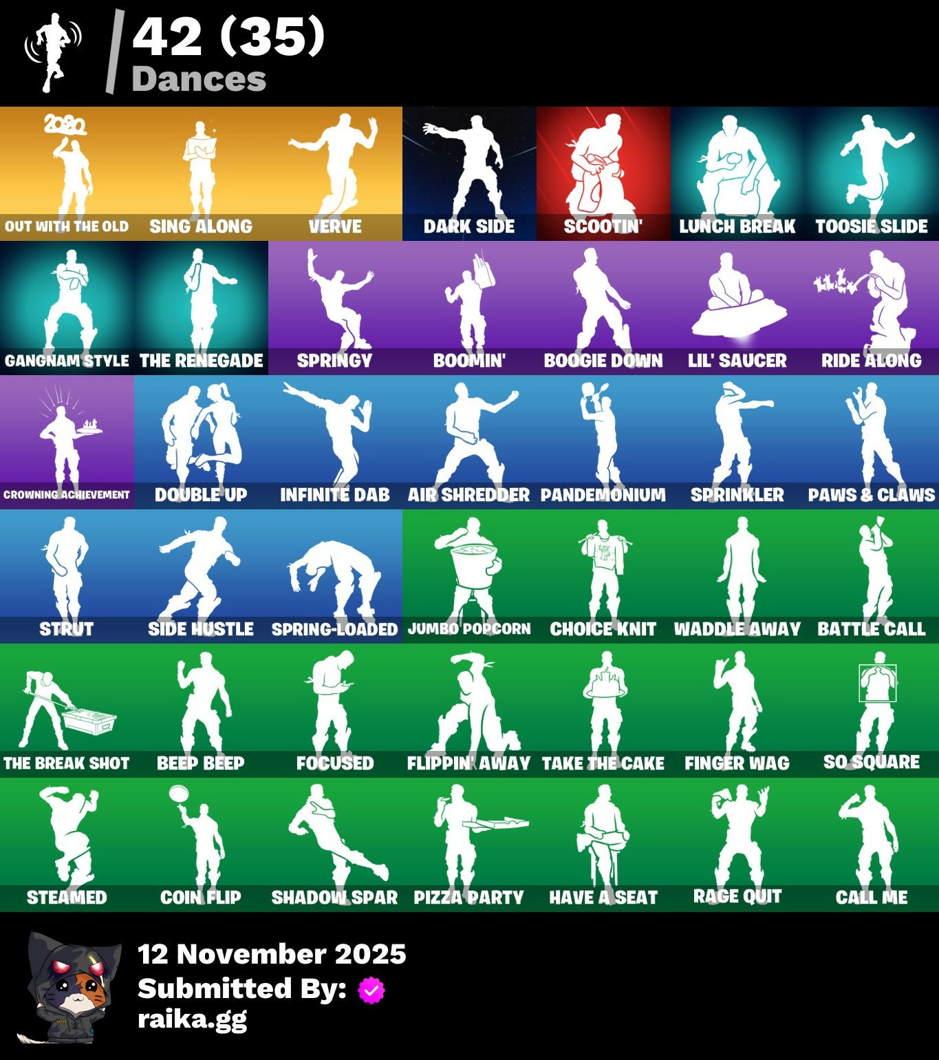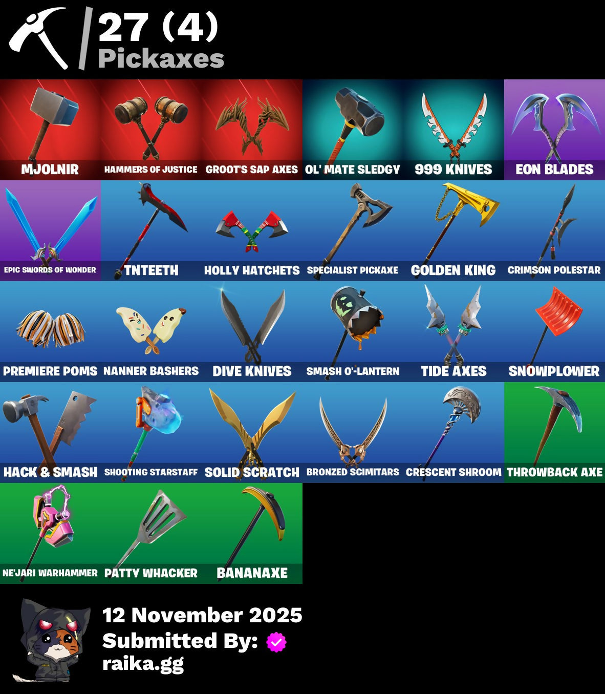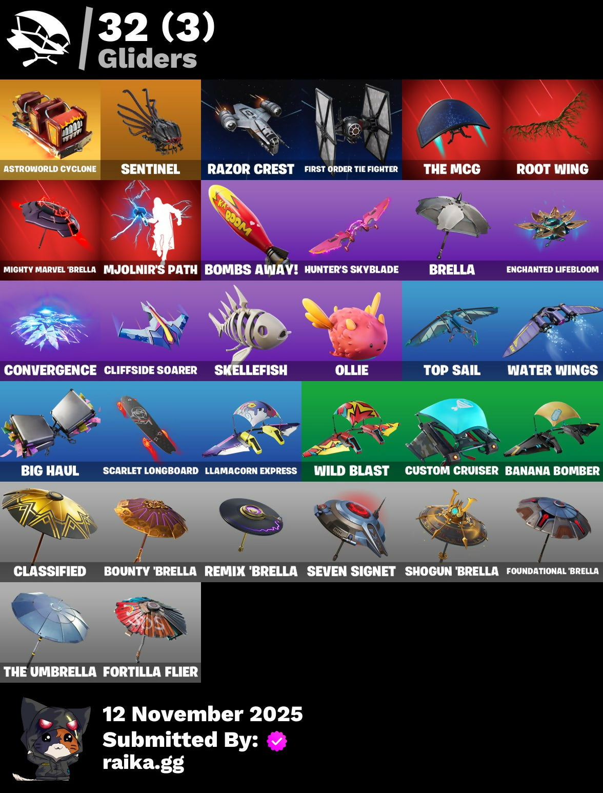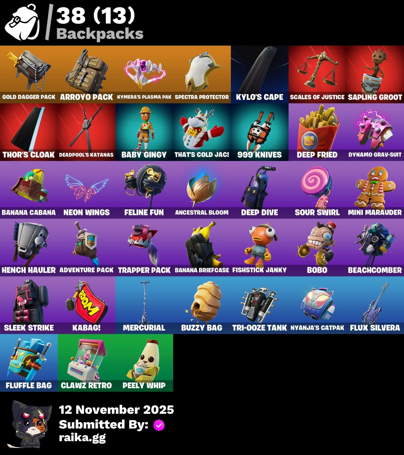 999 Knives, Adventure Pack, Agent Jones, Agent Peely, Air Shredder, Ancestral Bloom, Arroyo Pack, Astroworld Cyclone, Baby Gingy, Banana Bomber, Banana Briefcase, Banana Cabana, Bananaxe, Battle Call, Beachcomber, Beef Boss, Beep Beep, Big Haul, Bobo, Bombs Away!, Boogie Down, Boomin', Bounty 'Brella, Brella, Bronzed Scimitars, Brutus, Bushranger, Buzzy Bag, Call Me, Choice Knit, Classified, Clawz Retro, Cliffside Soarer, Coin Flip, Convergence, Crescent Shroom, Crimson Polestar, Crowning Achievement, Custom Cruiser, Dark Side, Deadpool, Deadpool's Katanas, Deep Dive, Deep Fried, Dive Knives, Double Up, Dynamo Grav-Suit, Enchanted Lifebloom, Eon Blades, Epic Swords Of Wonder, Fade, Feline Fun, Finger Wag, First Order Tie Fighter, Fishstick Janky, Flippin' Away, Fluffle Bag, Flux Silvera, Focused, Fortilla Flier, Foundational 'Brella, Gangnam Style, Gear Specialist Maya, Gold Dagger Pack, Gold Midas, Golden King, Groot, Groot's Sap Axes, Guff, Hack & Smash, Hammers Of Justice, Have A Seat, Hench Hauler, Holly Hatchets, Hunter's Skyblade, Infinite Dab, Jennifer Walters, Jules, Jumbo Popcorn, Kabag!, Krisabelle, Kylo Ren, Kylo's Cape, Kymera, Kymera's Plasma Pak, Lazarbeam, Lil' Saucer, Llamacorn Express, Lunch Break, Mandalorian, Meowscles, Mercurial, Merry Marauder, Mighty Marvel 'Brella, Mini Marauder, Mjolnir, Mjolnir's Path, Nanner Bashers, Ne'Jari Warhammer, Neon Wings, Nyanja's Catpak, Ocean, Ol' Mate Sledgy, Ollie, Out With The Old, Pandemonium, Patty Whacker, Paws & Claws, Peely Whip, Pizza Party, Polar Peely, Premiere Poms, Rage Quit, Razor Crest, Reese, Remix 'Brella, Ride Along, Root Wing, Sapling Groot, Scales Of Justice, Scarlet Longboard, Scootin', Scuba Jonesy, Sentinel, Seven Signet, Shadow Spar, Shanta, Shogun 'Brella, Shooting Starstaff, Side Hustle, Sing Along, Skellefish, Skye, Slayer Juice Wrld, Sleek Strike, Smash O'-Lantern, Snowplower, So Square, Solid Scratch, Sour Swirl, Specialist Pickaxe, Spectra Protector, Spring-Loaded, Springy, Sprinkler, Steamed, Strut, Summer Fable, Take The Cake, That's Cold Jac!, The Brat, The Break Shot, The McG, The Renegade, The Umbrella, Thor, Thor's Cloak, Throwback Axe, Tide Axes, Tnteeth, Tntina, Toosie Slide, Top Sail, Trapper Pack, Tri-Ooze Tank, Tropical Punch Zoey, Unpeely, Verve, Waddle Away, Water Wings, Wild Blast, Wildcat