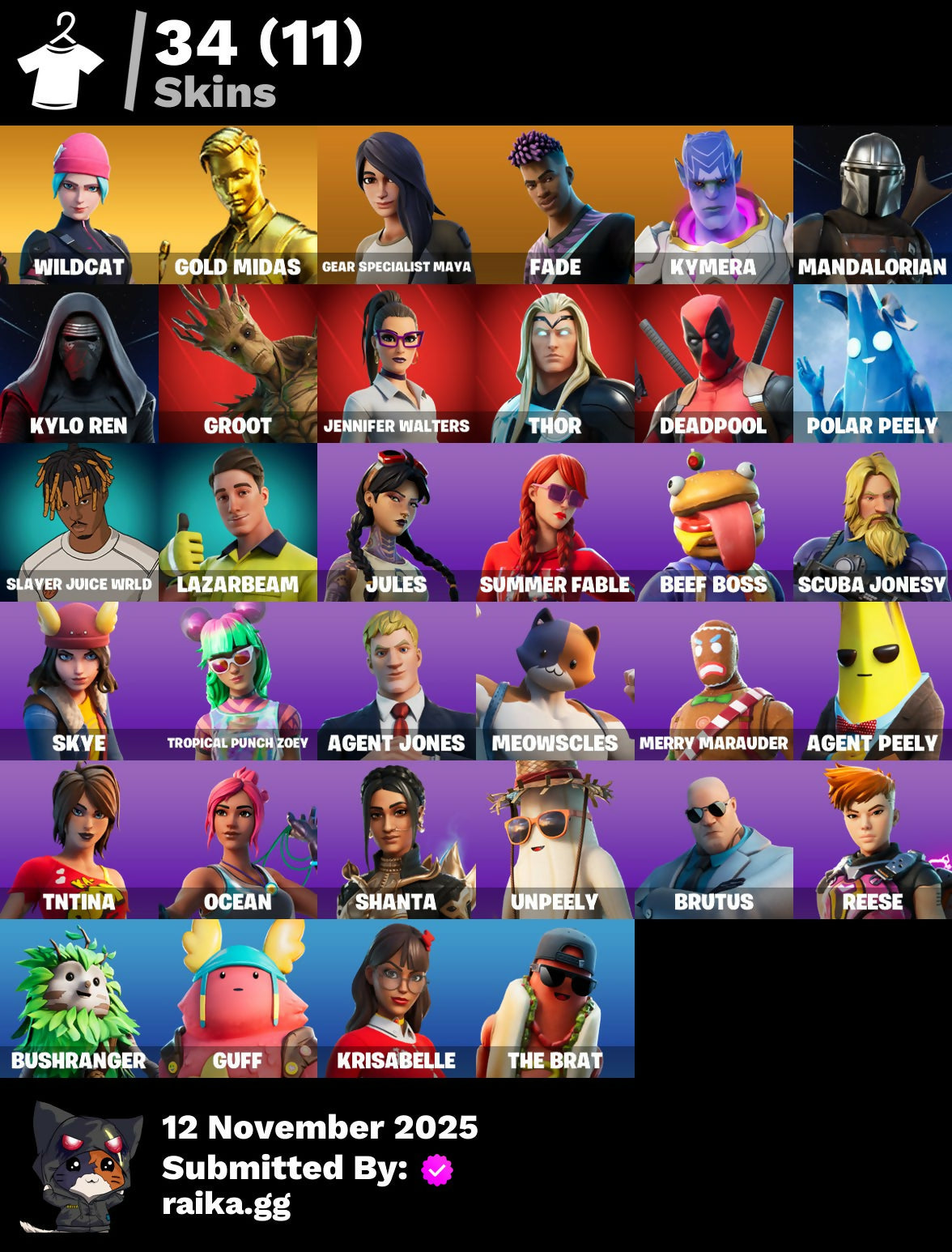 [PC/PSN/XBOX] 34 skins | Wildcat | Gold Midas | Gear Specialist Maya | Fade | Kymera | Mandalorian | Kylo Ren | Groot | Jennifer Walters | Thor | Deadpool | 750 VB
