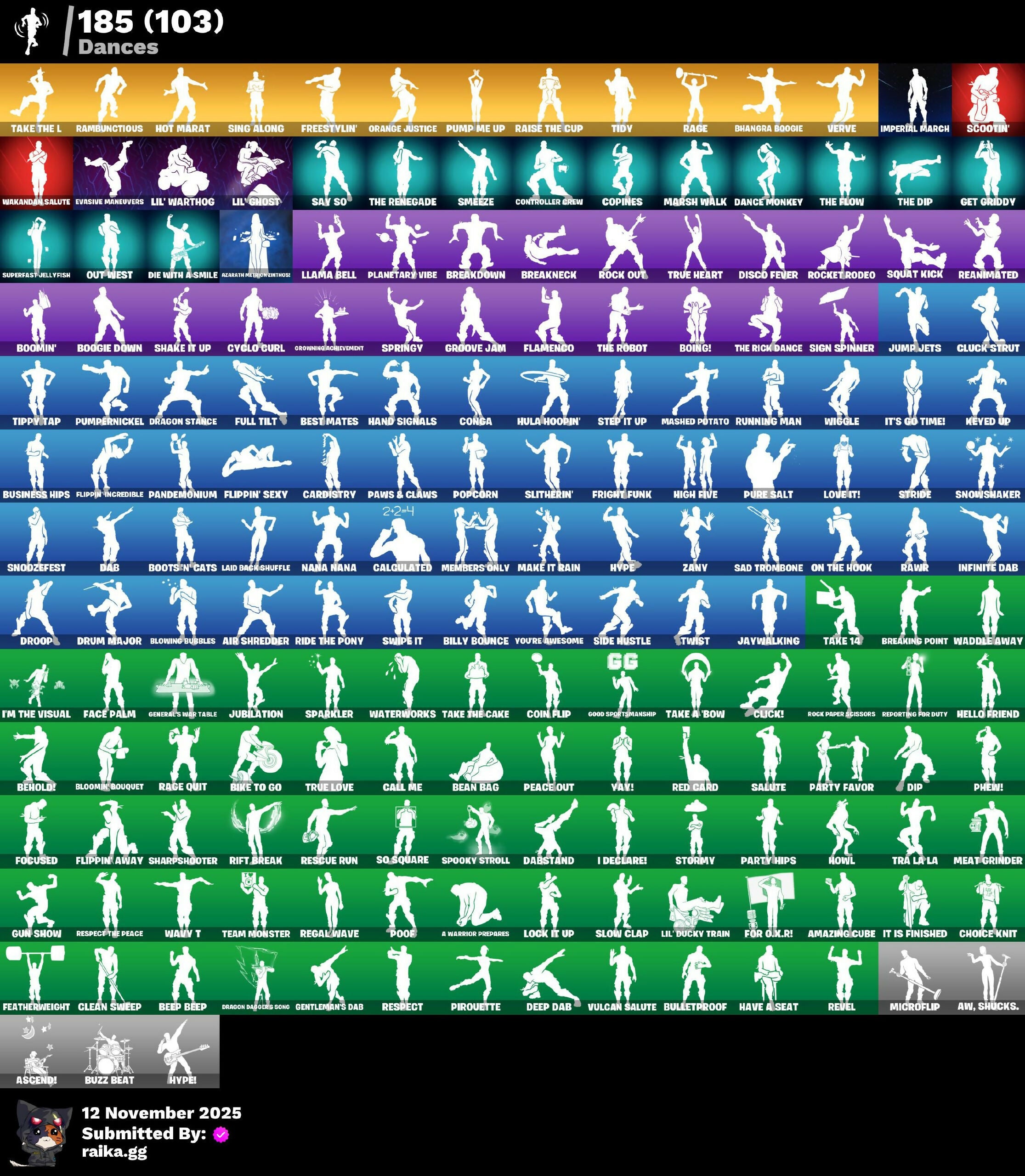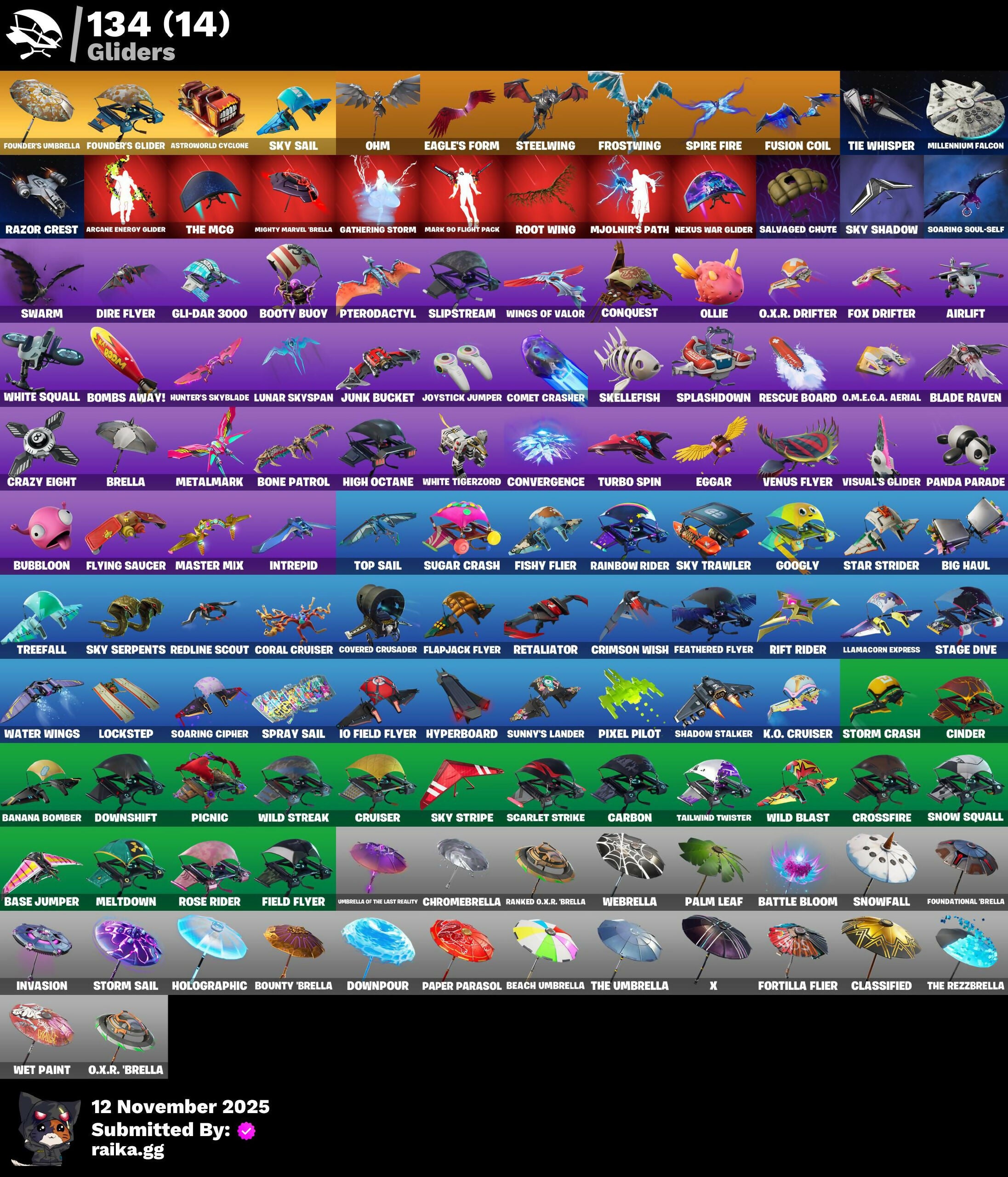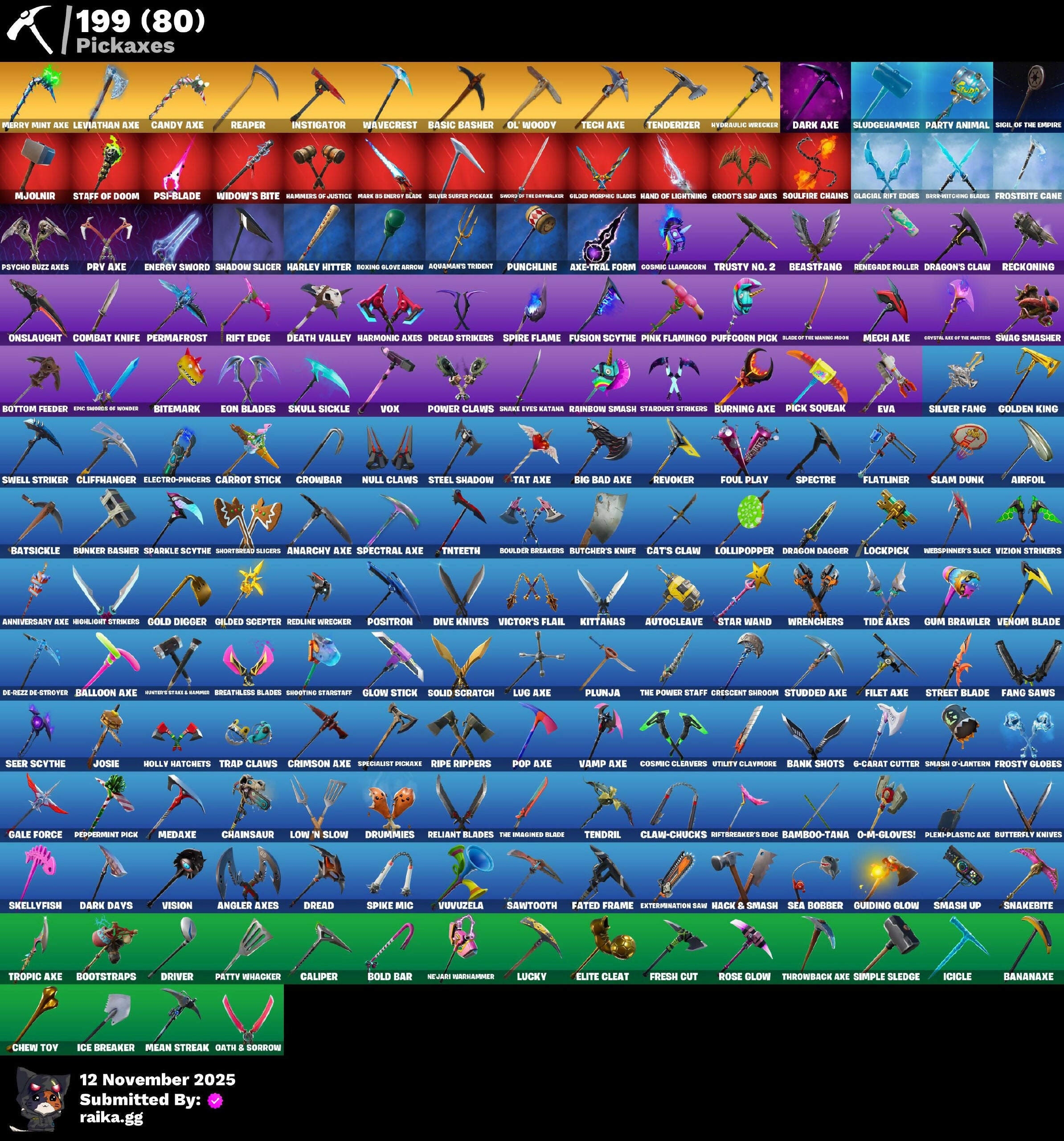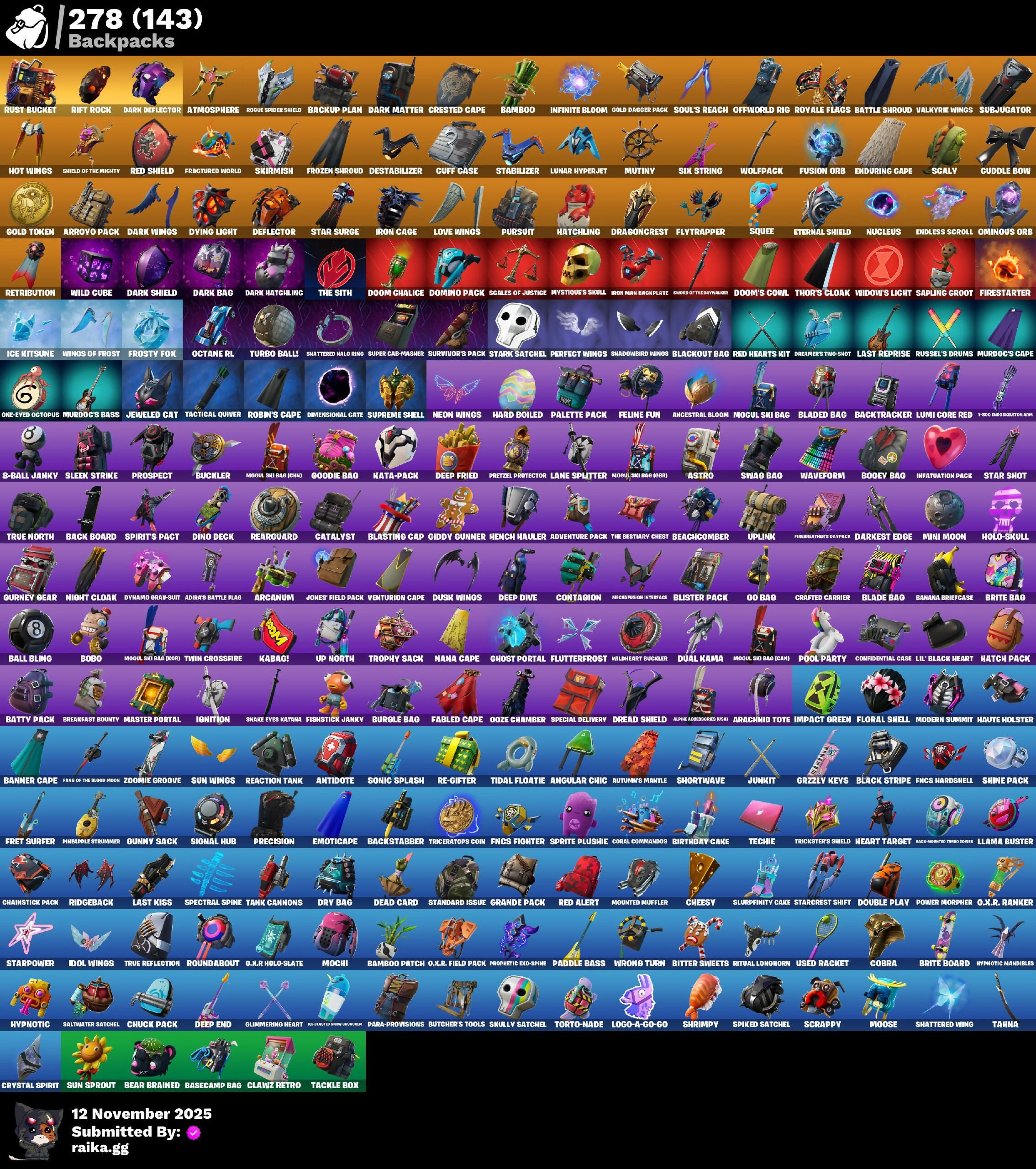 6-Carat Cutter, 8-Ball Janky, A Warrior Prepares, A-Gal vs Scratch, Adeline, Adventure Pack, Agent Jones, Agent Patch, Agent Peely, Air Shredder, Airfoil, Airlift, Alli, Alpine Ace (USA), Amazing Cube, Anarchy Axe, Ancestral Bloom, Angler Axes, Angular Chic, Anniversary Axe, Antidote, Aquaman, Aquaman's Trident, Arachne Couture, Arachnid Tote, Arcane Energy Glider, Arcanum, Arctic Assassin, Arctica, Arroyo Pack, Art The Clown, Ascend!, Assault Trooper, Astro, Astroworld Cyclone, Athleisure Assassin, Atmosphere, Augury, Aura, Autocleave, Autumn's Mantle, Aw, Shucks., Axe-tral Form, B.R.U.T.E. Gunner, Bachi, Back Board, Backstabber, Backtracker, Backup Plan, Ball Bling, Balloon Axe, Bamboo, Bamboo Patch, Bamboo-Tana, Banana Bomber, Banana Briefcase, Bananaxe, Bank Shots, Banner Cape, Base Jumper, Basecamp Bag, Basic Basher, Batsickle, Battle Bloom, Battle Gamer Mai, Battle Hound, Battle Shroud, Battlehawk, Batty Pack, Beach Bomber, Beach Umbrella, Beachcomber, Bean Bag, Bear Brained, Bear-Witching Blades, Beastfang, Beef Boss, Beep Beep, Behold!, Bernie, Best Mates, Bhangra Boogie, Big Bad Axe, Big Haul, Bike To Go, Billy Bounce, Birdie, Birthday Cake, Bitemark, Bitter Sweets, Black Stripe, Blackheart, Blackout Bag, Blade, Blade Bag, Blade Of The Waning Moon, Blade Raven, Bladed Bag, Blasting Cap, Blaze, Blister Pack, Blizzabelle, Bloom'n Bouquet, Blowing Bubbles, Bobo, Bogey Bag, Boing!, Bold Bar, Bolt, Bombs Away!, Bone Patrol, Boogie Down, Boomin', Boots 'n' Cats, Bootstraps, Booty Buoy, Bottom Feeder, Boulder Breakers, Bounty 'Brella, Boxing Glove Arrow, Bracer, Brawler, Breakaway, Breakdown, Breakfast Bounty, Breaking Point, Breakneck, Breathless Blades, Brella, Brite Bag, Brite Board, Brite Bomber, Brite Gunner, Bubbloon, Buckler, Bug Punk Sunny, Bulletproof, Bullseye, Bunker Basher, Bunker Jonesy, BunnyMoon, Burgle Bag, Burning Axe, Business Hips, Butcher's Knife, Butcher's Tools, Butterfly Knives, Buzz Beat, Calamity, Calculated, Caliper, Call Me, Cameo vs Chic, Candy Axe, Carbide, Carbon, Cardistry, Carrot Stick, Cat's Claw, Catalyst, Catwoman Cosmic Origin C31, Chainsaur, Chainstick Pack, Chaos Agent, Cheesy, Chew Toy, Chill Count, Choice Knit, Chromebrella, Chuck Pack, Chun-Li, Cinder, Classified, Claw-Chucks, Clawz Retro, Clean Sweep, Click!, Cliffhanger, Clinical Crosser, Cloaked Star, Cluck, Cluck Strut, Clutch, Cobra, Coin Flip, Combat Knife, Comet Crasher, Commando, Confidential Case, Conga, Conquest, Contagion, Controller Crew, Convergence, Copines, Coral Commandos, Coral Cruiser, Cosmic Cleavers, Cosmic Llamacorn, Covered Crusader, Cozy Jonesy, Crafted Carrier, Crazy Eight, Crescent Shroom, Crested Cape, Crimson Axe, Crimson Wish, Criterion, Crossfire, Crowbar, Cruiser, Cryptic, Crystal, Crystal Axe Of The Masters, Crystal Spirit, Cuddle Bow, Cuddle Team Leader, Cuff Case, Curse Buster, Cyclo Curl, DJ Yonder, Dab, Dabstand, Dance Monkey, Danica, Dark Axe, Dark Bag, Dark Bomber, Dark Days, Dark Deflector, Dark Hatchling, Dark Jonesy, Dark Matter, Dark Red Knight, Dark Shield, Dark Tricera Ops, Dark Vertex, Dark Voyager, Dark Wild Card, Dark Wings, Darkest Edge, Dazzle, De-rezz De-stroyer, Dead Card, Deadpool, Death Valley, Decaying Dreadborn, Deep Dab, Deep Dive, Deep End, Deep Fried, Deflector, Demi, Desert Dominator, Destabilizer, Diamond Diva, Die With A Smile, Die With A Smile Bruno, Dimensional Gate, Dino Deck, Dino Megazord, Dip, Dire, Dire Flyer, Disco Fever, Dive Knives, Doctor Doom, Domino, Domino Pack, Doom Chalice, Doom's Cowl, Double Play, Doublecross, Downpour, Downshift, Dragon Dagger, Dragon Dance Song, Dragon Stance, Dragon's Claw, Dragoncrest, Dread, Dread Fate, Dread Shield, Dread Strikers, Dream, Dreamer's Two-Shot, Drift, Driver, Droop, Drum Major, Drummies, Dry Bag, Dual Kama, Dummy, Dusk, Dusk Wings, Dying Light, Dynamic Dribbler, Dynamo, Dynamo Grav-Suit, Eagle's Form, Echo, Eggar, Electro-Pincers, Elite Agent, Elite Cleat, Ember, Emoticape, Endless Scroll, Enduring Cape, Energy Sword, Enforcer, Envoy, Eon Blades, Epic Swords Of Wonder, Eternal Knight, Eternal Shield, Eternal Voyager, Etheria, Eva, Evasive Maneuvers, Extermination Saw, FNCS Fighter, FNCS Hardshell, Fable, Fabled Cape, Face Palm, Fade, Fang Of The Blood Moon, Fang Saws, Fastball, Fate, Fated Frame, Feathered Flyer, Featherweight, Feline Fun, Field Flyer, Field Surgeon, Filet Axe, Finesse Finisher, Firestarter, Fireworks Team Leader, Fishstick, Fishtick Janky, Fishy Flier, Flamenco, Flapjack Flyer, Flatliner, Flippin' Away, Flippin' Incredible, Flippin' Sexy, Floral Shell, Flutterfrost, Flying Saucer, Flytrap, Flytrapper, Focus, Focused, For O.X.R.!, Fortilla Flier, Foul Play, Foundational 'Brella, Founder's Glider, Founder's Umbrella, Fox Drifter, Fractured World, Freestylin', Fresh Cut, Fret Surfer, Fright Funk, Frost Broker, Frostbite Cane, Frosted Flurry, Frostwing, Frosty Fox, Frosty Globes, Frozen Shroud, Full Tilt, Fusion, Fusion Coil, Fusion Orb, Fusion Scythe, Galaxia, Galaxy Scout, Gale Force, Gathering Storm, Gear Specialist Maya, General's War Table, Gentleman's Dab, Get Griddy, Ghost Portal, Ghoul Trooper, Giddy Gunner, Giddy-Up, Gilded Morphic Blades, Gilded Scepter, Ginger Gunner, Gingerbread Raider, Glacial Rift Edges, Gli-Dar 3000, Glimmering Heart, Glow, Glow Stick, Go Bag, Gold Brutus, Gold Dagger Pack, Gold Digger, Gold Meowscles, Gold Midas, Gold TNTina, Gold Token, Golden King, Good Sportsmanship, Goodie Bag, Googly, Grande Pack, Green Arrow, Green Ranger, Grimoire, Grind, Grizzly Keys, Groot, Groot's Sap Axes, Groove Jam, Guiding Glow, Gum Brawler, Gumshoe, Gun Show, Gunny Sack, Gurney Gear, Hacivat, Hack & Smash, Hammers Of Justice, Hand Of Lightning, Hand Signals, Hard Boiled, Harley Hitter, Harley Quinn, Harmonic Axes, Hatch Pack, Hatchling, Haute Holster, Have A Seat, Havoc, Hazard Agent, Haze, Headhunter Prime, Heart Target, Heart-Stopper, Heidi, Hello Friend, Hench Hauler, High Five, High Octane, Highland Warrior, Highlight Strikers, Holly Hatchets, Holo-Sk