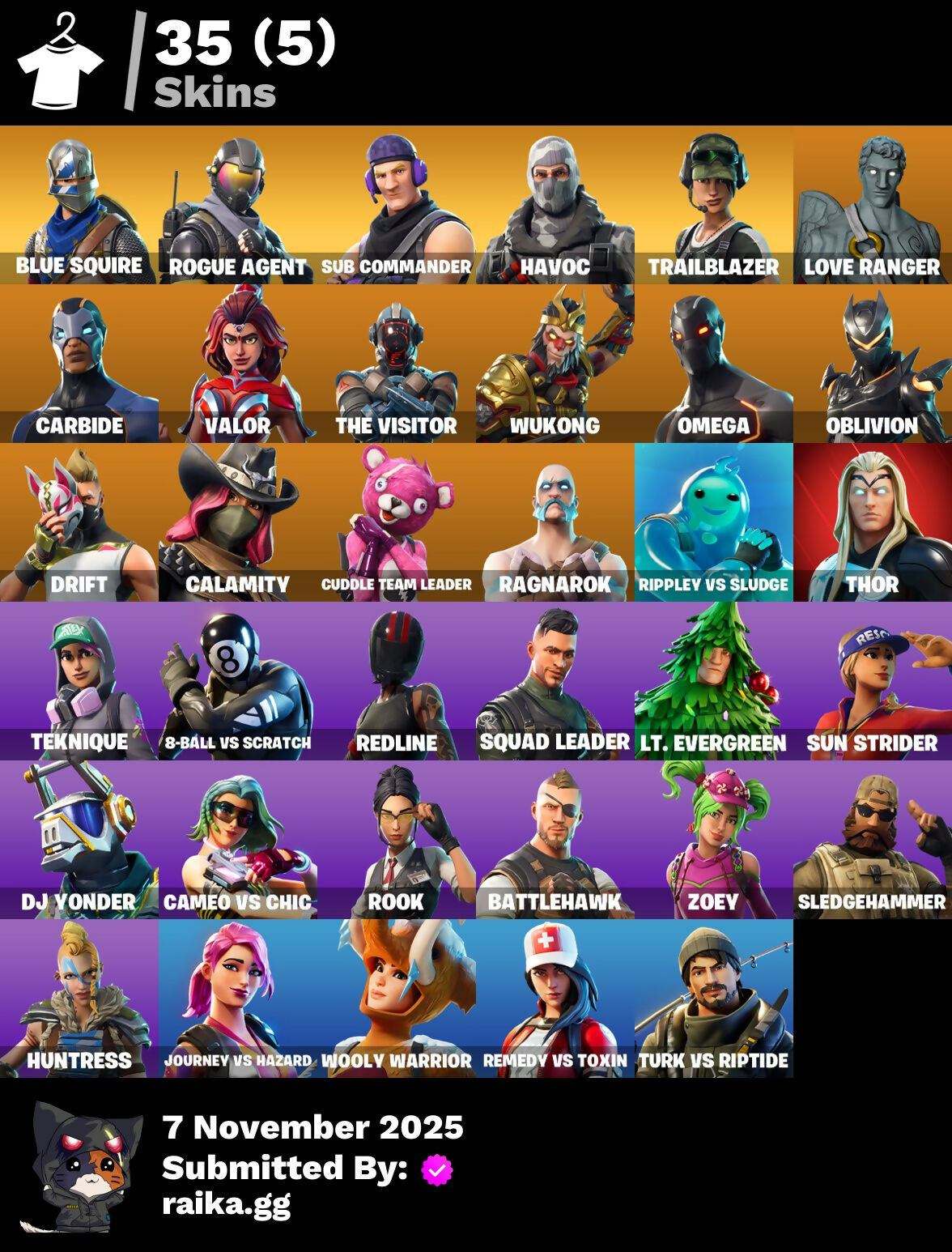 [PC/PSN/XBOX] 35 skins | Blue Squire | Rogue Agent | Sub Commander | Havoc | Trailblazer | Love Ranger | Carbide | Valor | The Visitor | Wukong | Omega | 650 VB / FN