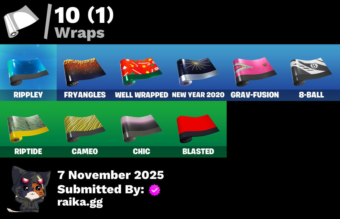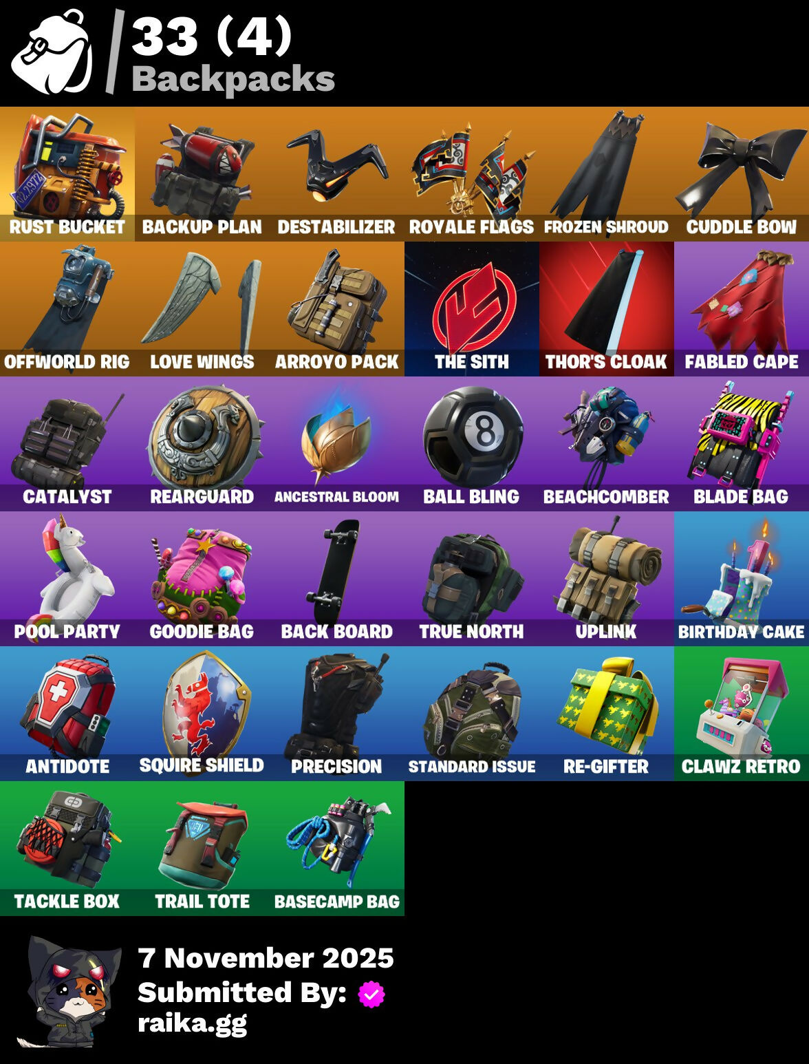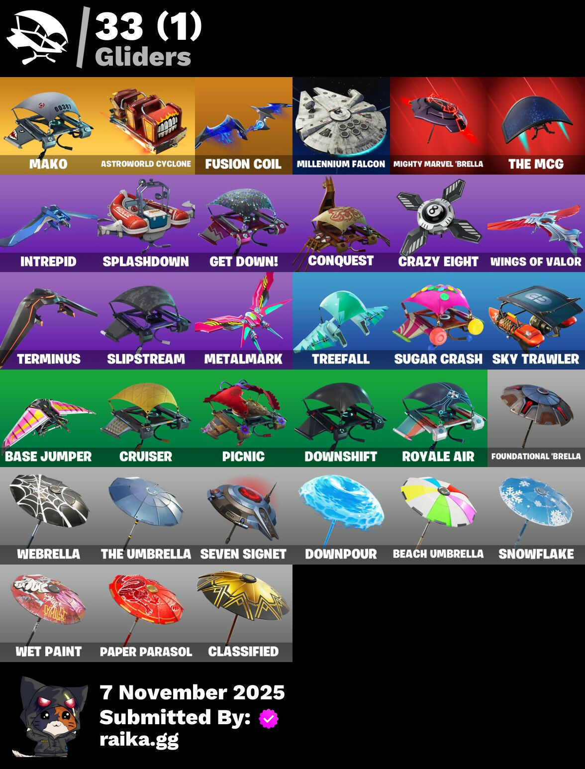 8-Ball, 8-Ball Vs Scratch, A.L.T.E.R., Abstract, Accolades, Agent Jones, Ancestral Bloom, Angler Axes, Antidote, Arrow, Arroyo Pack, Astroworld Cyclone, Back Board, Backup Plan, Ball Bling, Balloon Axe, Bank Shots, Banner, Base Jumper, Basecamp Bag, Battle Bus, Battlehawk, Beach Umbrella, Beachcomber, Bees!, Birthday Cake, Blade Bag, Blade Of The Waning Moon, Blasted, Blue Squire, Boing!, Boogie, Both Eyes Open, Boulder Breakers, Bow, Breakdown, Bush, Calamity, Calculated, Call Me, Cameo, Cameo Vs Chic, Camera, Campfire, Carbide, Cash Grab, Catalyst, Chains, Chalk Outline, Chic, Circle, Classified, Clawz Retro, Clean Sweep, Cobra, Comet, Conquest, Cowboy Chat, Crazy Castle, Crazy Eight, Crowning Achievement, Cruiser, Cuddle Bow, Cuddle Team Leader, D.C. 63, DJ Yonder, Destabilizer, Diamond Shapes, Dinosaur, Do It!, Dog Bowl, Doggo, Dolphin, Downpour, Downshift, Drift, Droop, Duck, Durrr, E.G.O., Fabled Cape, Fake Door, Fence, Fish Hook, Flapper, Flippin' Away, Floating Island, Flowy Hat, Forebearer, Foundational 'Brella, Fox Clan Mask, Freestylin', Frozen Shroud, Fryangles, Fusion Coil, G.O.A.T., Gale Force, Gentleman's Dab, Get Down!, Gg Smiley, Gg Snakes, Gg Snowman, Golf Ball, Golf Clap, Good Vibes, Goodie Bag, Grav-Fusion, Groove Jam, Happy Birthday!, Havoc, Hearts, Hero Emblem, High Five, Highlight Strikers, Hula Hoopin', Huntress, Hype, Ice Cream Truck, Instigator, Intrepid, Journey, Journey Vs Hazard, Kiss, Laser Chomp, Lion Herald, Lobby Classic, Lollipopper, Looted, Love Ranger, Love Wings, Lt. Evergreen, Lucha Gg, Lug Axe, Mako, Mask, Medaxe, Metalmark, Mighty Marvel 'Brella, Millennium Falcon, Mjolnir, Mjolnir Strike, Monks, Mushroom, New Year 2020, Norse Llama, Oblivion, Offworld Rig, Omega, Only 90'S Kids, Onslaught, Orange Justice, Palm Trees, Paper Parasol, Pencil, Peppermint Pick, Permafrost, Phantom, Pickaxe, Picnic, Pink, Pixels Royale, Pool Party, Popcorn, Positron, Potato Aim, Precision, Pulse Axe, Pure Salt, Racing Checkers, Ragnarok, Rainbow, Raven, Razor Edge, Re-Gifter, Reanimated, Rearguard, Reckoning, Redline, Regal Wave, Remedy Vs Toxin, Respect, Respect The Peace, Rift Edge, Rippley, Rippley Vs Sludge, Riptide, Rock Love, Rocket, Rogue Agent, Rook, Royal Stroll, Royale Air, Royale Flags, Rust Bucket, Salt, Salute, Scuba Gear, Sea Serpent, Seven Signet, Sgt. Winter, Shadow Ops, Shanta's Lifebloom, Share The Love, Sharpshooter, Shopping Cart, Shortbread Slicers, Sith, Skull & Beard, Sky Trawler, Sledgehammer, Slipstream, Sludgehammer, Smash Up, Snowflake, Snowshaker, Spectral Axe, Spider Badass, Spiderweb, Splashdown, Spray Can, Squad Leader, Squid Up, Squire Shield, Stage 5, Stage 5 - No Shoulder Pad, Standard Issue, Strawberry Paws, Sub Commander, Sugar Crash, Sun Strider, Sushi, Swipe It, Tackle Box, Tat Axe, Teeth, Teknique, Tenderizer, Terminus, The Mcg, The Sith, The Umbrella, The Visitor, Thor, Thor's Cloak, Three Llamas, Tic-Tac-Toe, Toosie Slide, Trail Tote, Trailblazer, Trap Warning, Treefall, True North, Tunnel, Turk Vs Riptide, Uplink, Valor, Viking Ship, Villain Emblem, Waterworks, Wave, Waves, Wavy (Blitz), Wavy T, Webrella, Weeping Woods, Well Wrapped, Wet Paint, Wiggle, Window, Wings Of Valor, Wooly Warrior, Wukong, X Mark, X-4 Stormwing, You're Awesome, Yummy, Zoey