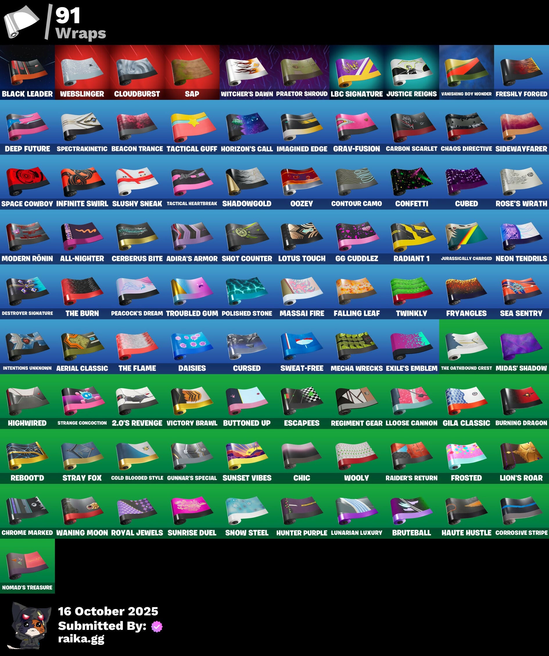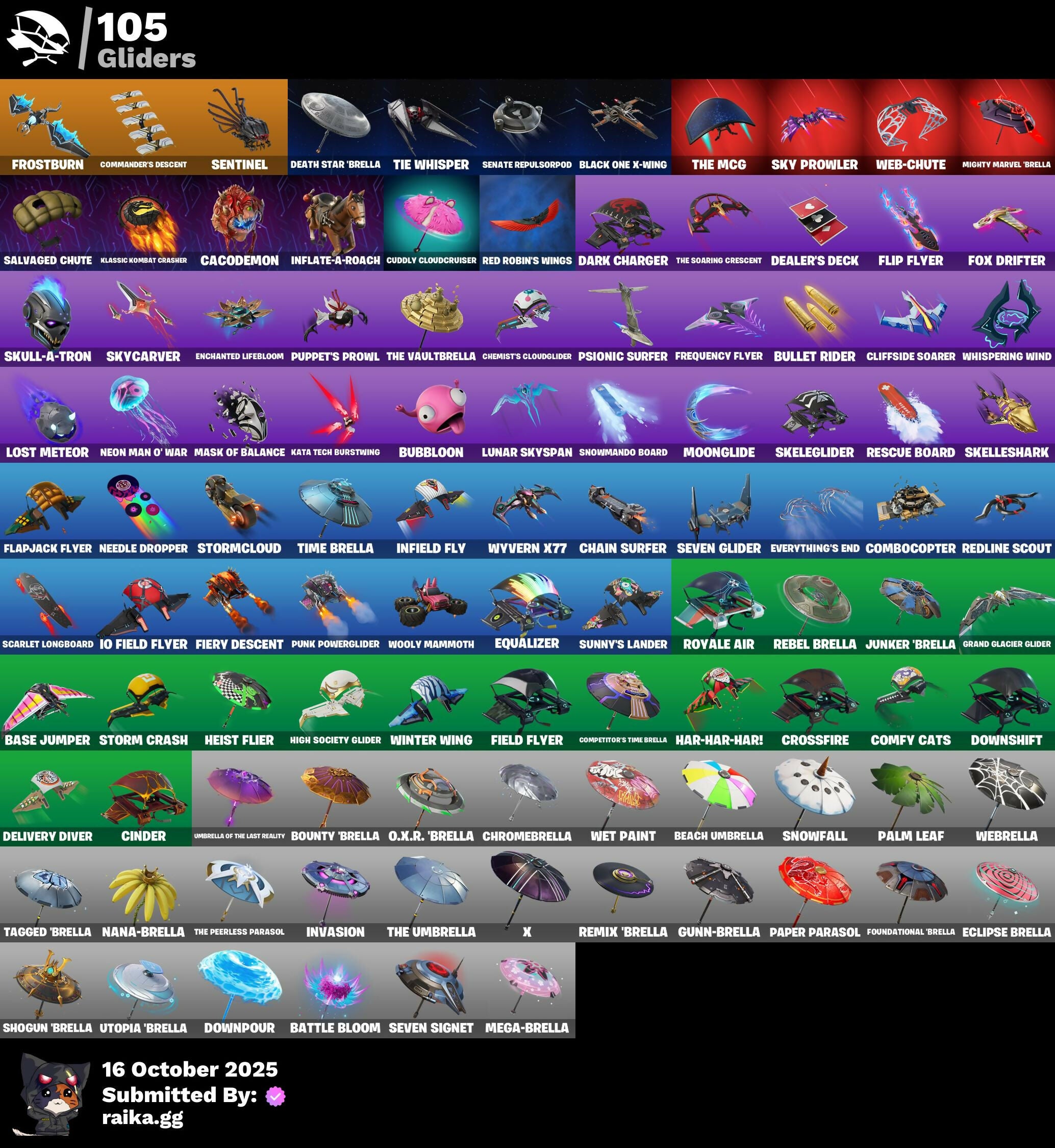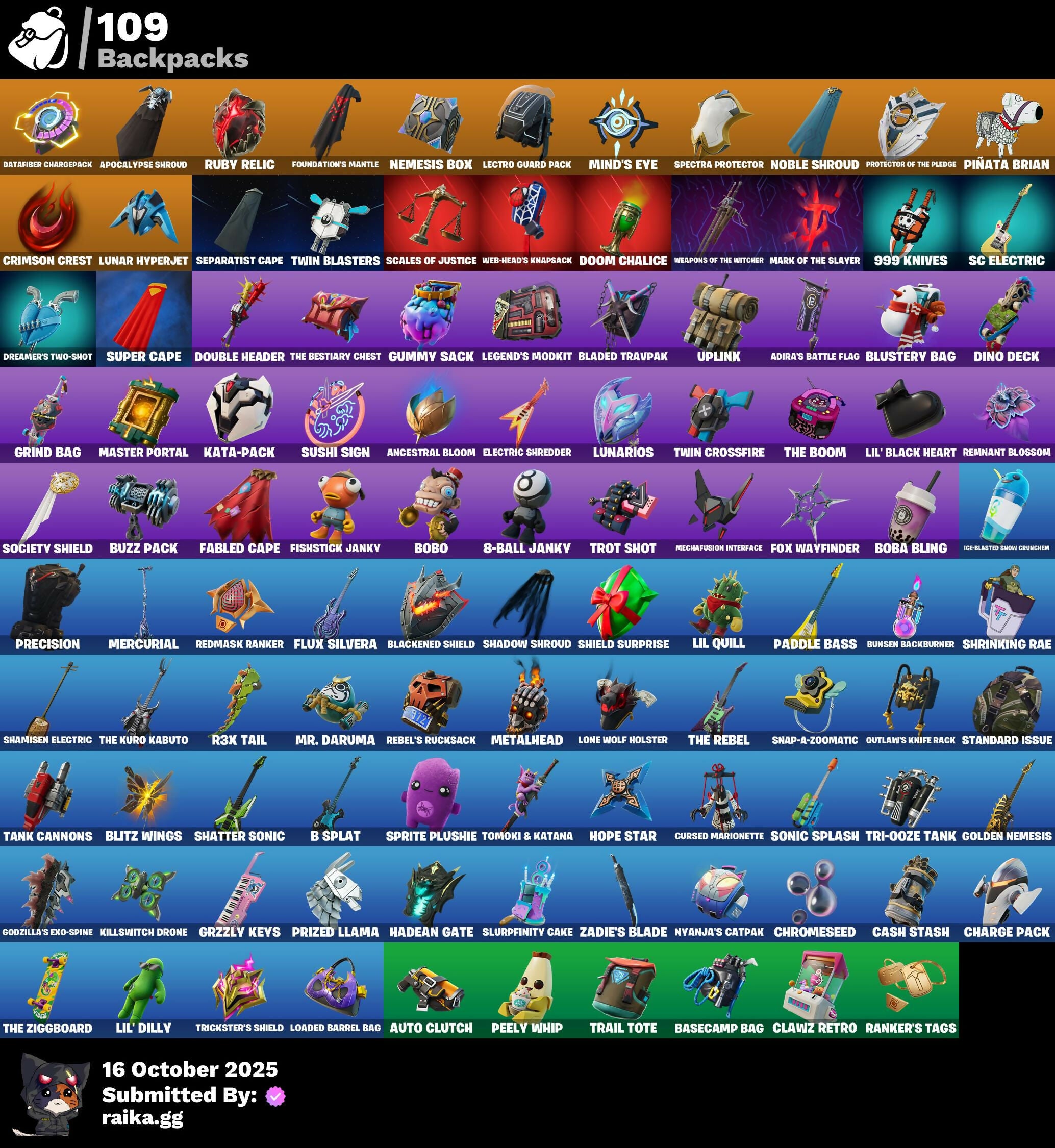 2.0’s Revenge, 8-Ball, 8-Ball Janky, 999 Knives, A Warrior Prepares, A.L.T.E.R., Adira's Battle Flag, Adira’s Armor, Aerial, Aerial Classic, Aerial Swagger, Agent Jones, All-Nighter, Ancestral Bloom, Anniversary Axe, Apocalypse Shroud, Appeeling Drive, Arcade Cat, Arctic Intel, Ascension Nezumi, Astro Armor, Auto Clutch, Axo's Big Moment, B Splat, Backup Blades, Balance Board, Banner, Banner Icon, Baron's Hoard, Base Jumper, Baseball, Basecamp Bag, Batman, Battle Bloom, Battle Mode, Beach Umbrella, Beacon Trance, Big Bite, Bike to Go, Black Hole, Black Leader, Black One X-Wing, Blackened Shield, Blade Of The Waning Moon, Bladed Travpak, Blitz Axe, Blitz Wings, Blustery Bag, Board Breaker, Boba Bling, Boba Snack, Bobo, Bombastic Winterfest, Boneyard Brand, Boogie Down, Both Eyes Open, Boulder Breakers, Bounty 'Brella, Bronzed Scimitars, Bruteball, Bubbloon, Bullet Rider, Bullpen Brawler Dusty, Bunsen Backburner, Burning Dragon, Buttoned Up, Buzz Pack, Bytes' Sigil, Cacodemon, Cactus Club, Called Shot, Carbon Scarlet, Cash Stash, Cerberus Bite, Cerberus Medallion, Chain Surfer, Chaos Directive, Charge Pack, Charlotte's Logo, Chef's Special, Chemist's Cloudglider, Chic, Chimpanski Wants You, Choice Knit, Chomp Cud!!, Choppy, Chrome Marked, Chrome Punk, Chromebrella, Chromeseed, Cinder, Clawz Retro, Clean Sweep, Cliffside Soarer, Cloudburst, Club President Helsie, Cold Blooded Style, Combocopter, Comet, Comfy Cats, Commander's Descent, Competitor's Time Brella, Confetti, Confident Iridia, Contour Camo, Corrosive Stripe, Courageous Mikasa, Crazy Castle, Crescent Shroom, Crimson Crest, Crimson Polestar, Crossfire, Crowning Achievement, Crucible Blade, Crystal Fang, Crystal Smasher, Cubed, Cuddle Carvers, Cuddle's Garden, Cuddly Cloudcruiser, Curling Iron, Cursed, Cursed Marionette, Cyclo Curl, D.C. 63, Daisies, Dance Mat, Dark Charger, Datafiber Chargepack, De-Rezz De-Stroyer, Dealer's Deck, Death Star 'Brella, Deep Future, Delivery Diver, Demons Beware, Designated Hitters, Destroyer Signature, Dino Deck, Diva's Grin, Doctor Doom, Doom Chalice, Doom Slayer, Double Header, Double Tags, Downpour, Downshift, Doze Dab, Dragon Rune Lances, Dragon Spirit, Dreamer's Two-Shot, Dropout, Dusk Knight, Dusty, E.G.O., Easter Egg, Eclipse Brella, Electric Shredder, Electro Pairing Blades, Elegant Crowbar, Enchanted Lifebloom, Energy Claw, Epic Blade Of Floof, Equalizer, Eren Jaeger, Eren's Faceoff, Escapees, Everything's End, Exile’s Emblem, Expressionism, Eye Of Agamotto, Fabled Cape, Falling Leaf, Fanged Foresight, Field Flyer, Fiery Descent, First Order Banner, Fish Hook, Fishstick Janky, Fist Bump, Flapjack Flyer, Flip Flyer, Floating Island, Flux Silvera, Foil Flex, Foundation's Mantle, Foundation's Plasma Spike, Foundational 'Brella, Fox Drifter, Fox Wayfinder, Frequency Flyer, Freshly Forged, Frost Squad, Frostburn, Frosted, Frosty Globes, Fryangles, Fully Charged Drift, GG Cuddlez, GG Potion, GG Snakes, GG Snowman, Gentleman's Dab, Geralt, Geralt Of Rivia, Gila Classic, Godzilla's Exo-Spine, Golden Nemesis, Golden Wolf, Golf Clap, Grand Glacier Glider, Grav-Fusion, Grind Bag, Groots Sap Axes, Groovy!, Grriz, Grzzly Keys, Guggi Was Here, Guiding Glow, Gum Brawler, Gumbo, Gummy Sack, Gunn-Brella, Gunnar, Gunnar’s Special, Hadean Gate, Hand of Trace, Har-Har-Har!, Harlowe, Haute Hustle, Haven, Headpiece, Heavy Metal Omega, Heist Flier, Hello Friend, Helsie, Here Comes Trubble, Hidden Haven, High Society Glider, High Stakes Club, Highwired, Holly Hatchets, Hope Star, Hope's Look, Horizon’s Call, Hot Pokers, Hummingboard, Hunter Purple, Hunter's Crest, Hype!, Hypnot-Eyes, I Declare!, I Need You to Concentrate, IO Field Flyer, Ice-Blasted Snow Cruncher, If Looks Could..., Igni Sign, Imagined Edge, Imagined Order, Imani, Imperial March, In Her Sights, Infield Fly, Infinite Swirl, Inflate-A-Roach, Intentions Unknown, Invasion, It Is Finished, It's... You?, Jar Buster, Je Suis Montague, Jedi Order, Jet Signals, Jolly Roger, Josie, Junker 'Brella, Jurassically Charged, Justice Reigns, Kaiju Cutter, Kata Tech Burstwing, Kata-Pack, Keep The Peace, Killswitch Drone, Kittanas, Klassic Kombat Crasher, Knight's Honor, Krisabelle, Kymera Swarm, LBC Signature, Lectro Guard Pack, Legend's Modkit, Legendary Blade Of Insight, Lil Quill, Lil' Black Heart, Lil' Dilly, Lil' Monster, Lil' Prancer, Lion’s Roar, Llaminator, Lloose Cannon, Loaded Barrel Bag, Lone Wolf Holster, Lord Vader, Lost Meteor, Lotus Touch, Love, Love It!, Lt. John Llama, Lug Axe, Lunar Charge, Lunar Glow, Lunar Hyperjet, Lunar Party, Lunar Skyspan, Lunarian Luxury, Lunarios, Machinist In Control, Mad Mask, Make a Seat, Mark Of The Champion, Mark of the Slayer, Marked Marauder, Mask of Balance, Massai, Massai Fire, Master Portal, Mecha Wrecks, Mechafusion Interface, Mega-Brella, Menace, Menacing Trace, Meow Skulls, Meow-Wow-Wow!, Mercurial, Metalhead, Microbot Mallet, Midas’ Shadow, Mighty Marvel 'Brella, Mind's Eye, Mini Dogfight, Mini Slayer Fistbump, Modern Rōnin, Monstrous Hunger, Moonglide, Moonglow, Alight, Morales Mark, Most Wanted, Mr. Daruma, Muscle Memory, Mwahaha, Mystica, Nailed It, Nana-Brella, Nanner Bashers, Naughty Or Nice?, Needle Dropper, Nemesis Box, Neon Man O' War, Neon Tendrils, Never Yield, Nezumi, Night Kama, Ninja Stance: Leo, Noble Shroud, Nolan Takes Aim, Nomad’s Treasure, Nyanja's Catpak, O.M.E.G.A. Spear, O.X.R. 'Brella, Omni Sword, Ooh Yum!, Oozey, Opaline Slashers, Outlaw's Knife Rack, Outlaw's Whipknives, Paddle Bass, Paint Pummelers, Palm Leaf, Paper Parasol, Paper Plane, Paradigm (Reality-659), Party Beats, Peacock’s Dream, Peas Out, Peely Whip, Piercing Ace, Pinata Brian, Pixels Royale, Planet, Polar Peely, Polished Stone, Praetor Shroud, Precision, Premiere Poms, Prized Llama, Protector of the Pledge, Prowler, Psionic Surfer, Punch Saw, Punk Ororo, Punk Powerglider, Puppet's Prowl, Quicksilver Baton Spear, R3x Tail, Radiant 1, Raider’s Return, Ranker's Tags, Raven's Curse, Raven's Legion, Rebel Br