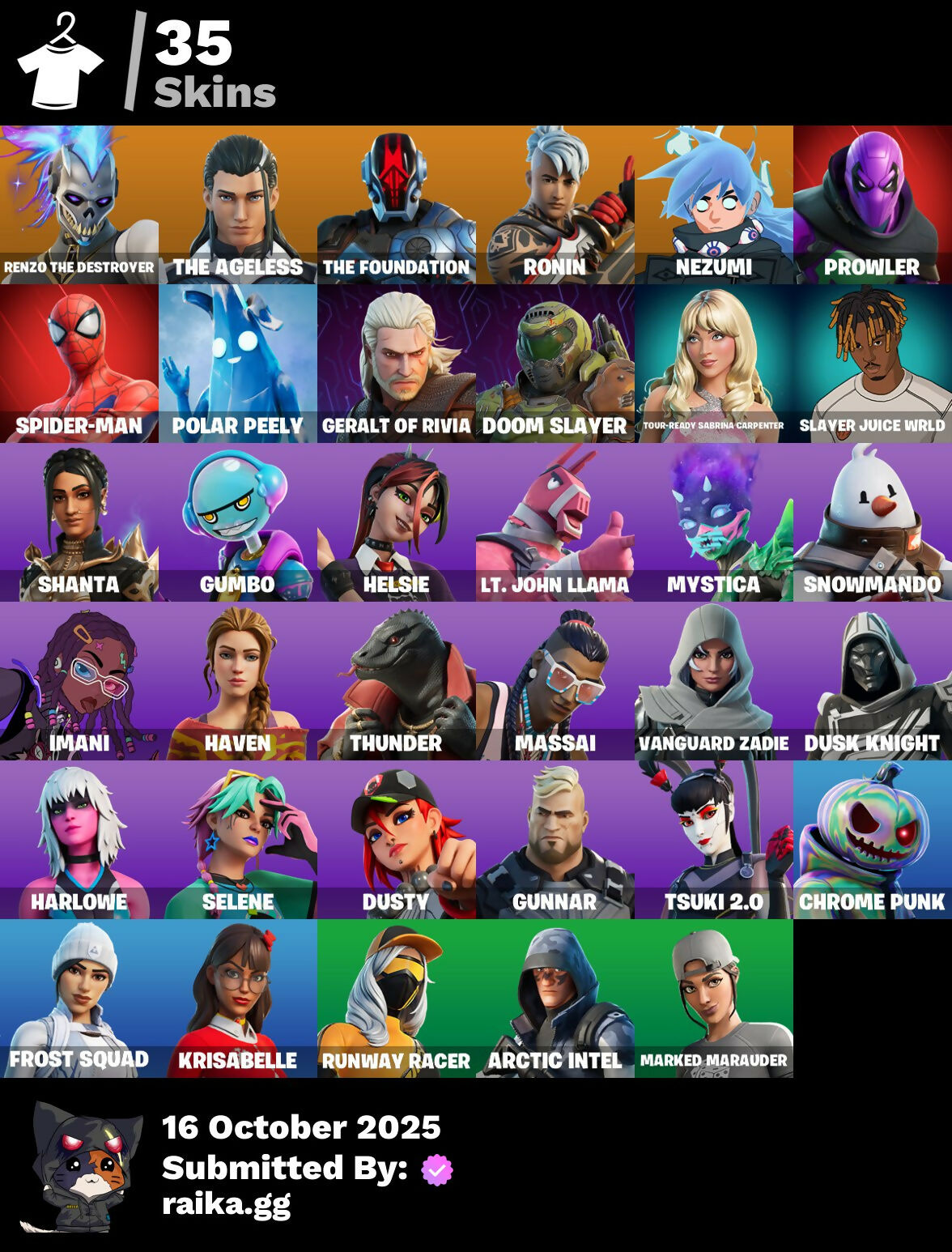 [PC/PSN/XBOX] 35 skins | Renzo the Destroyer | The Ageless | The Foundation | Ronin | Nezumi | Prowler | Spider-Man | Polar Peely | Geralt of Rivia | 1900 VB / FN