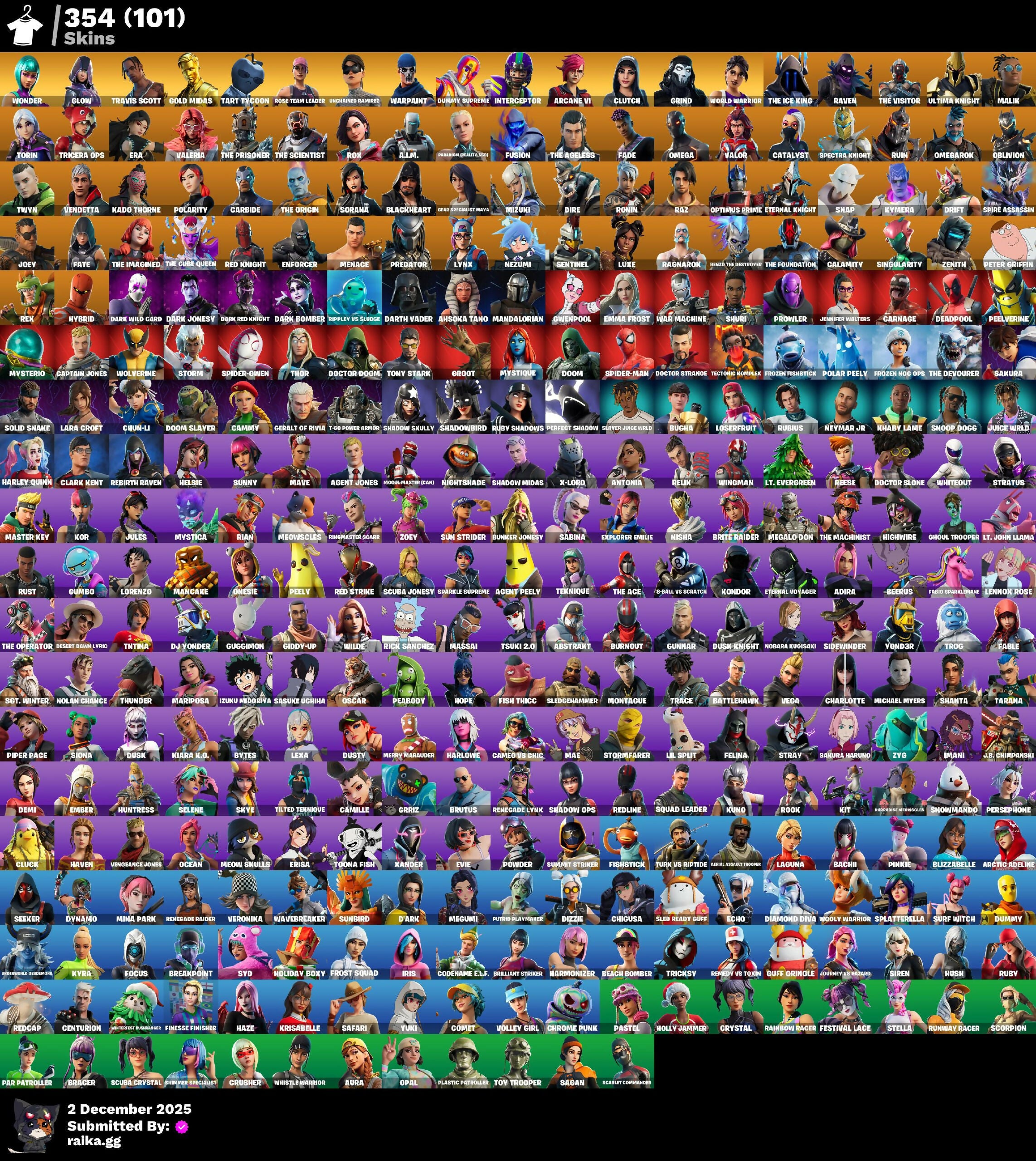 [PC/PSN/XBOX] 354 skins | OG STW |Wild Cat| Minty Axe | Wonder | Glow | Travis Scott | Gold Midas | Tart Tycoon | Unchained Ramirez | 850 VB