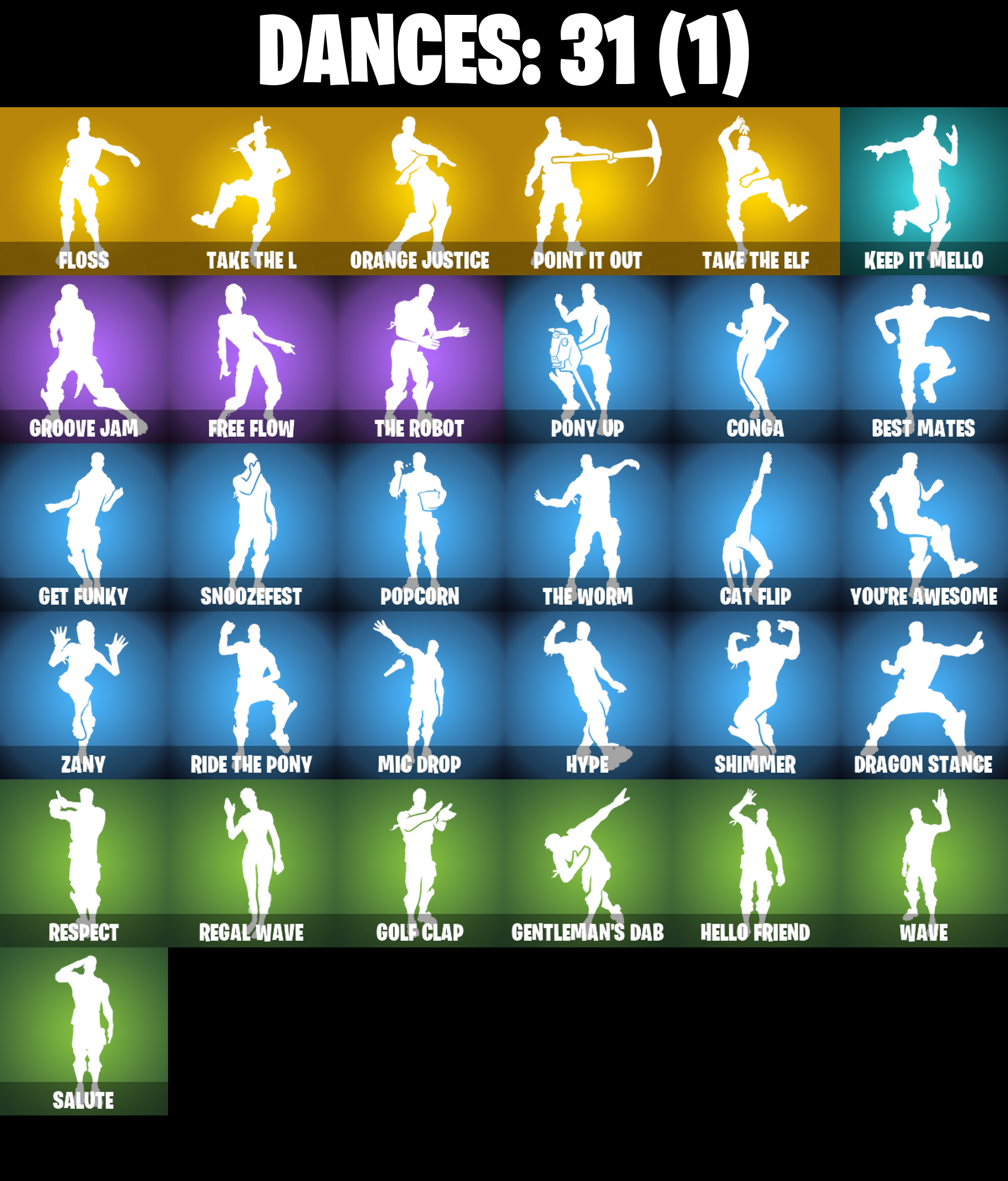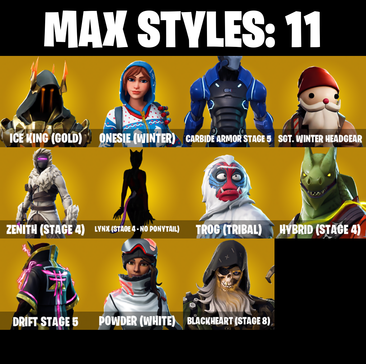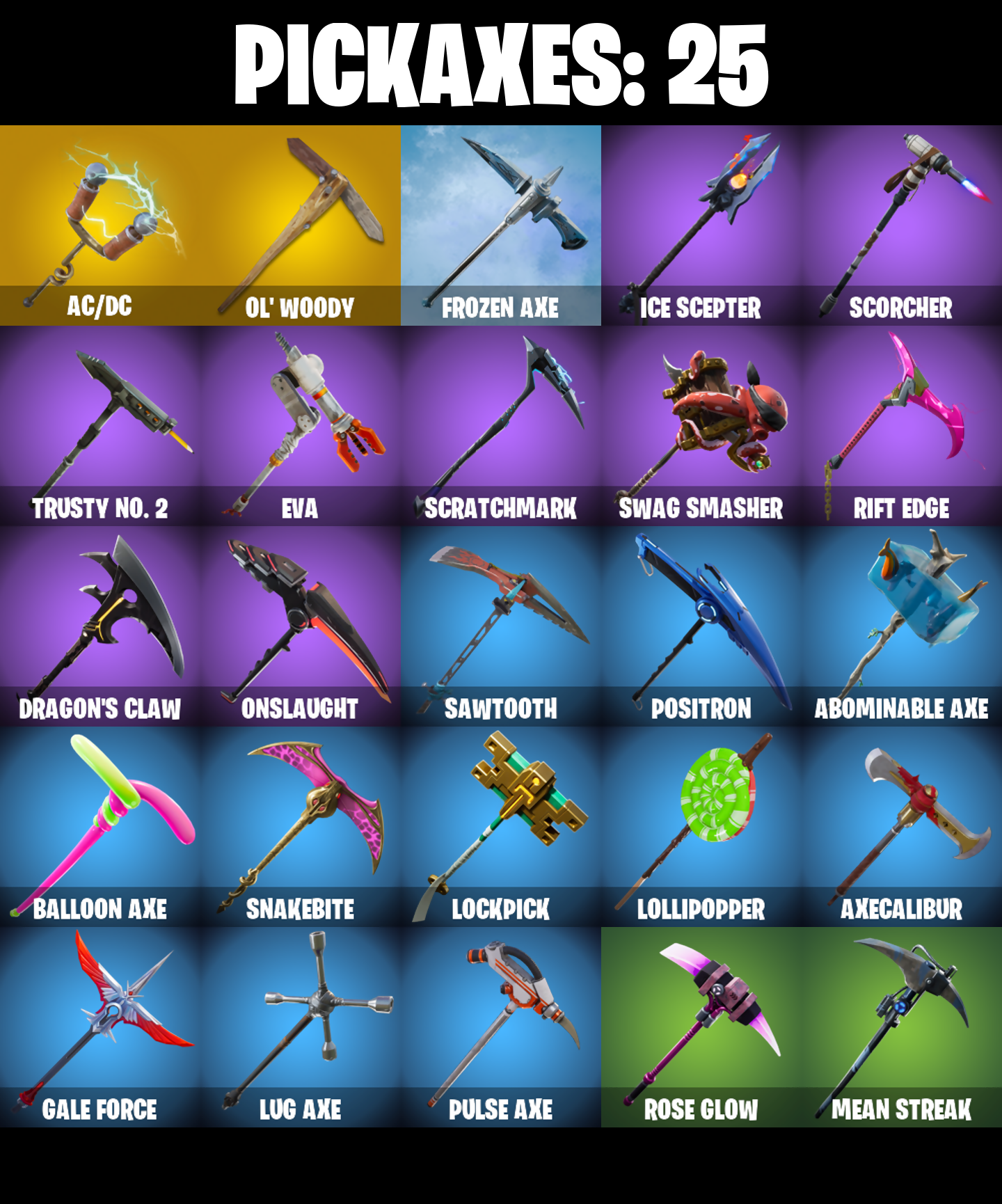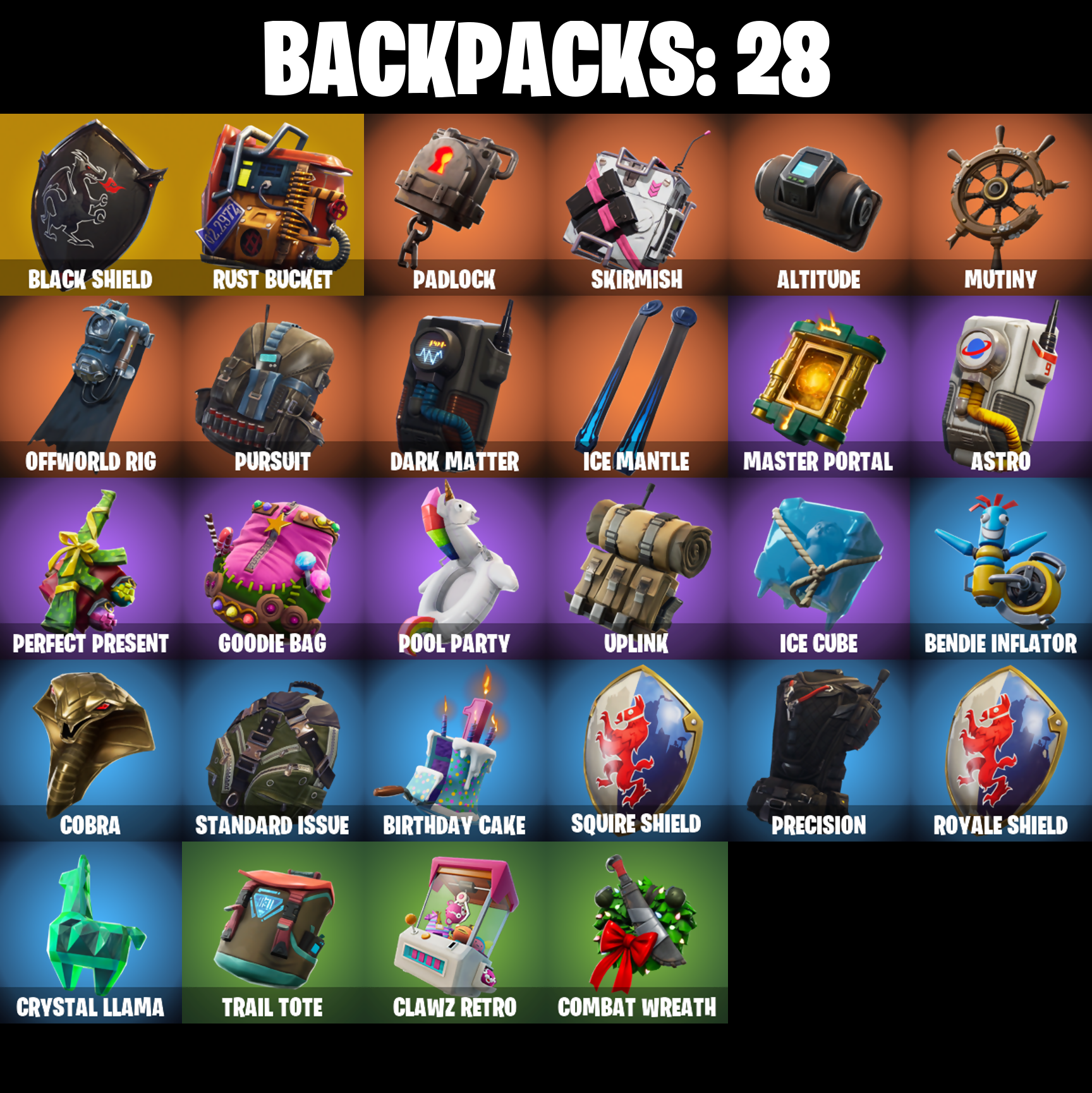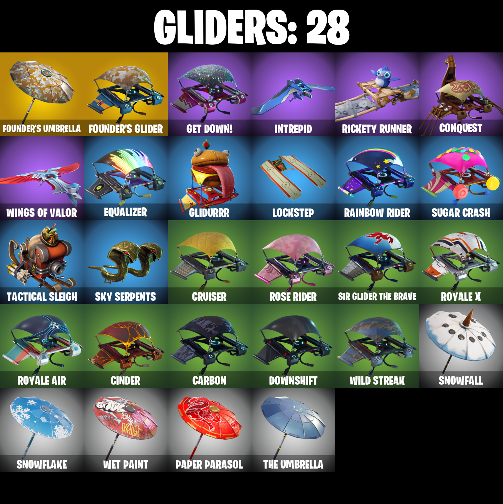 Abominable Axe, Ac/Dc, Altitude, Astro, Axecalibur, Balloon Axe, Battlehawk, Bendie, Bendie Inflator, Best Mates, Birthday Cake, Black Knight, Black Shield, Blackheart, Blackheart (Stage 8), Blue Squire, Carbide, Carbide Armor Stage 5, Carbon, Cat Flip, Cinder, Clawz Retro, Cobra, Combat Wreath, Conga, Conquest, Cruiser, Crystal Llama, Dark Matter, Dark Voyager, Downshift, Dragon Stance, Dragon's Claw, Drift, Drift Stage 5, Elite Agent, Equalizer, Eva, Floss, Founder's Glider, Founder's Umbrella, Free Flow, Frozen Axe, Gale Force, Gentleman's Dab, Get Down!, Get Funky, Glidurr, Golf Clap, Goodie Bag, Groove Jam, Hello Friend, Huntress, Hybrid, Hybrid (Stage 4), Hype, Ice Cube, Ice King (Gold), Ice Mantle, Ice Scepter, Intrepid, Keep It Mello, Lockpick, Lockstep, Lollipopper, Lug Axe, Lynx, Lynx (Stage 4 - No Ponytail), Master Portal, Mean Streak, Mic Drop, Mission Specialist, Moonwalker, Mutiny, Offworld Rig, Ol' Woody, Omega, Onesie, Onesie (Winter), Onslaught, Orange Justice, Padlock, Paper Parasol, Peely, Perfect Present, Point It Out, Pony Up, Pool Party, Popcorn, Positron, Powder, Powder (White), Precision, Pulse Axe, Pursuit, Rainbow Rider, Redline, Regal Wave, Respect, Rickety Runner, Ride The Pony, Rift Edge, Rose Glow, Rose Rider, Rose Team Leader, Royale Air, Royale Knight, Royale Shield, Royale X, Rust Bucket, Rust Lord, Salute, Sawtooth, Scorcher, Scratchmark, Sgt. Winter, Sgt. Winter Headgear, Shimmer, Sidewinder, Sir Glider the Brave, Skirmish, Sky Serpents, Snakebite, Snoozefest, Snowfall, Snowflake, Sparkle Specialist, Squad Leader, Squire Shield, Standard Issue, Sugar Crash, Swag Smasher, Tactical Sleigh, Take The Elf, Take The L, Teknique, The Ice King, The Prisoner, The Reaper, The Robot, The Umbrella, The Visitor, The Worm, Trail Tote, Trog, Trog (Tribal), Trusty No. 2, Uplink, Valor, Warpaint, Wave, Wet Paint, Wild Streak, Wings of Valor, You're Awesome, Zany, Zenith, Zenith (Stage 4), Zoey
