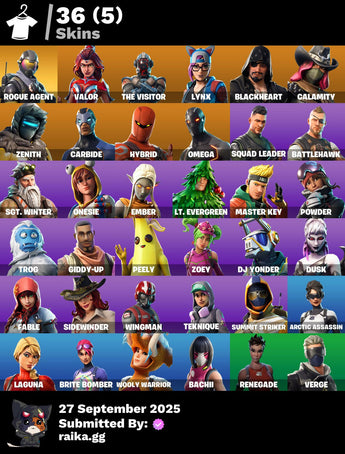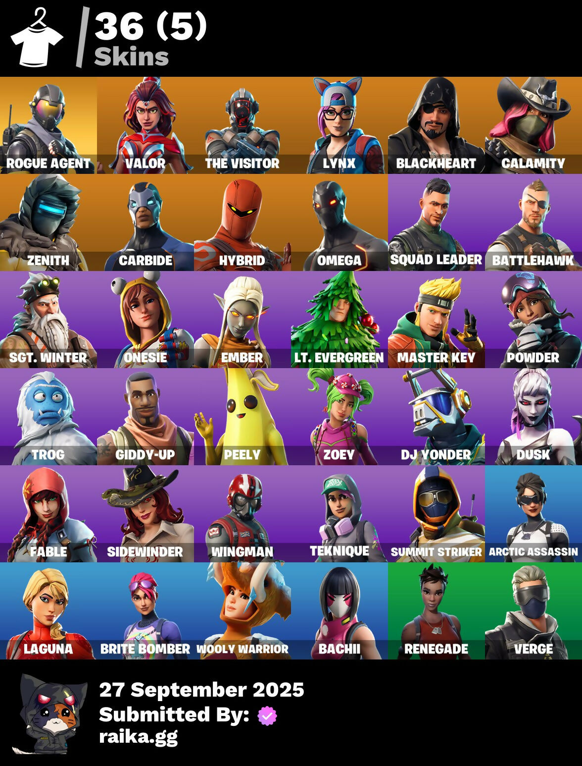 [PC/PSN/XBOX] 36 skins | Rogue Agent | Valor | The Visitor | Lynx | Blackheart | Calamity | Zenith | Carbide | Hybrid | Omega | Squad Leader | Battlehawk | 650 VB / FN