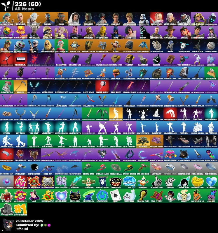 #1 Victory Royale, Adira, Afterwater Cult, Angelican, Apexpredator Evie, Apprentice Evie, Arcrobatics, Ash Williams, Astro Armor, Aurelian, Baby Seal, Backin', Balance Board, Battle Bloom, Battlehawk, Batty Grim, Beef Pack, Big Shark, Bitter Sweets, Blazing Jet Jockey, Blown Up, Bluecross, Bluwing Callings, Board Breaker, Boba Fett, Boom Bauble, Boomer HQ Arms, Boomstick, Brain Bolt, Burdened With Gems, Burning Ember, Burning Eye Festival, Cackle Demon, Cacodemon, Calmland, Carbide, Carride, Ch chrome punk, Changwan Band, Charge, Chrombrella, Chrome Cage, Chrome Punk, Chromesked, Chugga Chugga, Clawsz, Clawsz Retro, Comfy Cats, Cottonjaw, Cozy Commander, Crocidle Blade, Crossfetisch Rugby Riot Slump Balloon, Dairmo Blades, Dare's Battle Rage, Double Header, Downriver Cliffing, Dragon Rider, Drip Dropper, Dusty, Dynamike, E-34 Landsknecht, Easy, Echo, Echo Jet, Electrostaff, Emergency Raft, Epitaph Edge, Everything's Odd, Evie, Feel The Force, Flip Flyer, Fuzzetti Cake, Gaffi Stick, Gale Force, Gangawkstyle, Gargusk's Helm, Geez Grim, Get Gone, Ghost's Playground, Gingerbread Raider, Gingersledge, Glimmo, Gold Clap, Good Game Crown, Grafitaxe, Gray Commander, Griffin's Talon, Grimey, Grind Bag, Guitar Walk, Gutbomb, Gwen Stacy, Hadcan Gate, Han Solo, Har-Har-Har!, Heart's Carrier, Hero's Heart, Hey Home!, Hibernation Bag, Hope, Hot Spring Herd, Hunter's Emblem, Hydro Flayers, I'm a Mystery, Icy Heart, Ignition, Imperial Stormtrooper, Indiana Jones, Infield Fly, Inflate-A-Roach, Intrataz's Hammer, It Is Finished, It's Thedeck, Jane Skywalker, Jawbreaker, Jigglejiggle, Jordan, Kick Ups, Laser Focused, Latching Guard Black, Leia Organa, Lil Prancer, Lil Speeder Bike, Llama Bell, Love You Long Time, Lowdown, Luke Skywalker, Lunar Defender, Lunar Glow, Lunar Hyperjet, Lunar Skysnap, Lunarios, Lunarparty, Malik, Massai, Meanwhile, Mega-Brella, Millennium Falcon, Moonblade, Mornin Glories, Nemesis Box, Nothing's Up, Nurellan, OMG I Love It, Observer Scepter, Orange Justice, Orcbit Dodger, Ornney, Outbomb, Pastel Stryder, Pind's Eye, Pizza Party, Polysynth Kit, Pony Tails, Popcorn, Powered Up, Powerharparchen, Prairie Fons, Psycho Driver Glow, R2-D2, Raider's Blues, Ratcat, Reality Master, Reaper, Rebel Brella, Redmask Ranger, Relaxed Fit Jonesy, Rhino Claw, Riddle Dropper, Rogue Out, Ruby Beach, Run Run Run, Runaway, Scaregem21, Seasons Fever, Sir Obverse, Slidebreaker, Slushy Swisher, Snap, Spider Snare, Spooky, Standard Issue, Steady, Stinger Pack, Storm Crash, Stormbreake Llam, Stormfarer, Stun Knife, Sugar Crash, Sunlit Seeker, Sunlit Selene, Swirly Soarer, Swisher Nessa, Take It Easy, Tamedust, Tanked Destroyer, Team Work, Teknique, Tenebro, The Fambler, The King's Oath, The Mutiny's Gift, The Prison Peeler, The Umbrella, Thrasher, Thrasher Massai, Tonic Crossover, Tover, Training Remote, Trance, Trophy Time, True Reflection, Twin Blasters, Universal Blades, Unleash Earth Lamb, Unruly Cliffspro, Vibro-Staff, Viper School, Wandering Elf, Warmth of the Sun, Warthog, Wasteland Cat, Watcherwing Halo, Wet Paint, Wild Beary Grizz, Wild Beary Grriz, Wild Heavywater, Wings of Valor, Worn On The Lake, Z6 Jetpack, ZZZ...