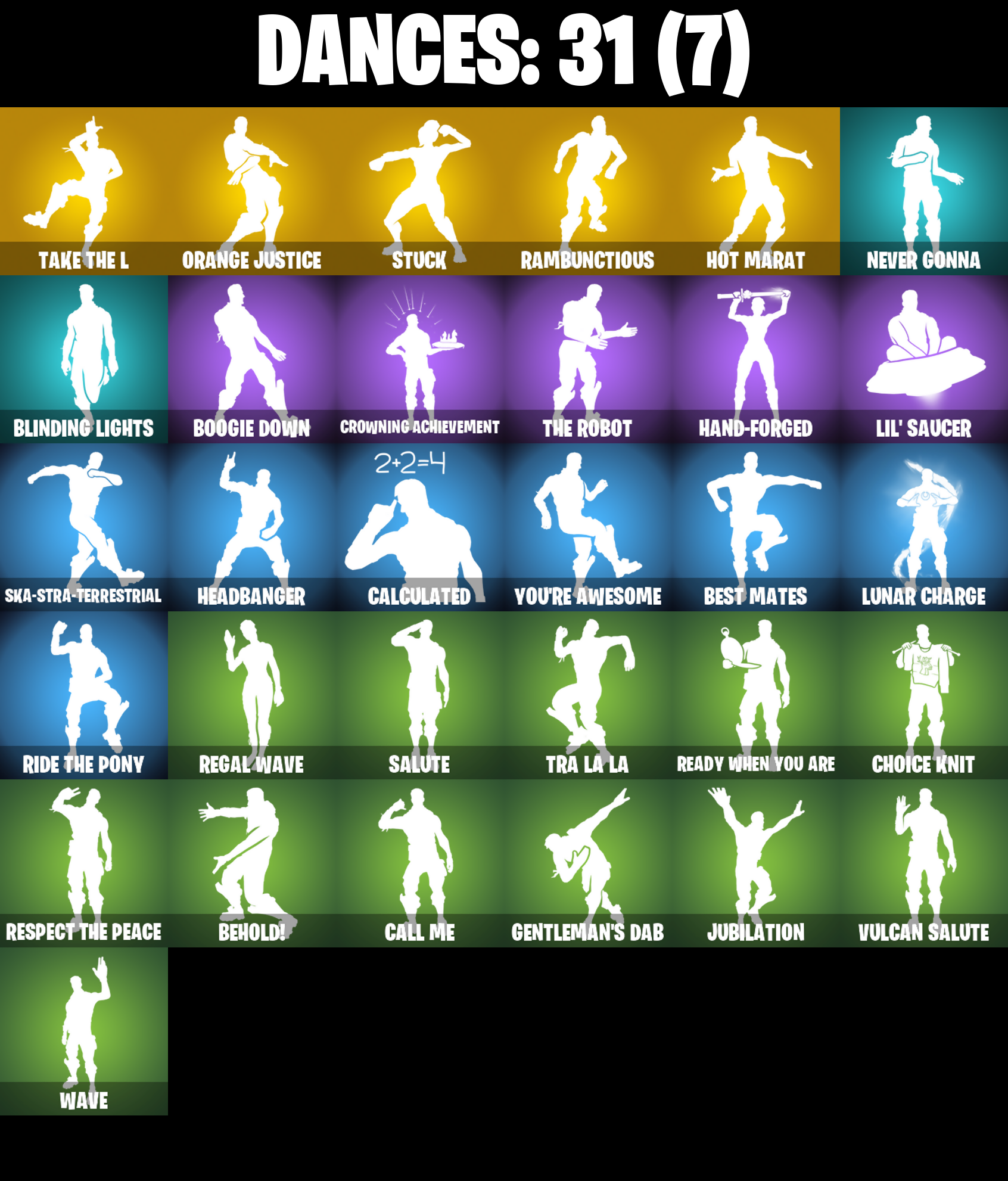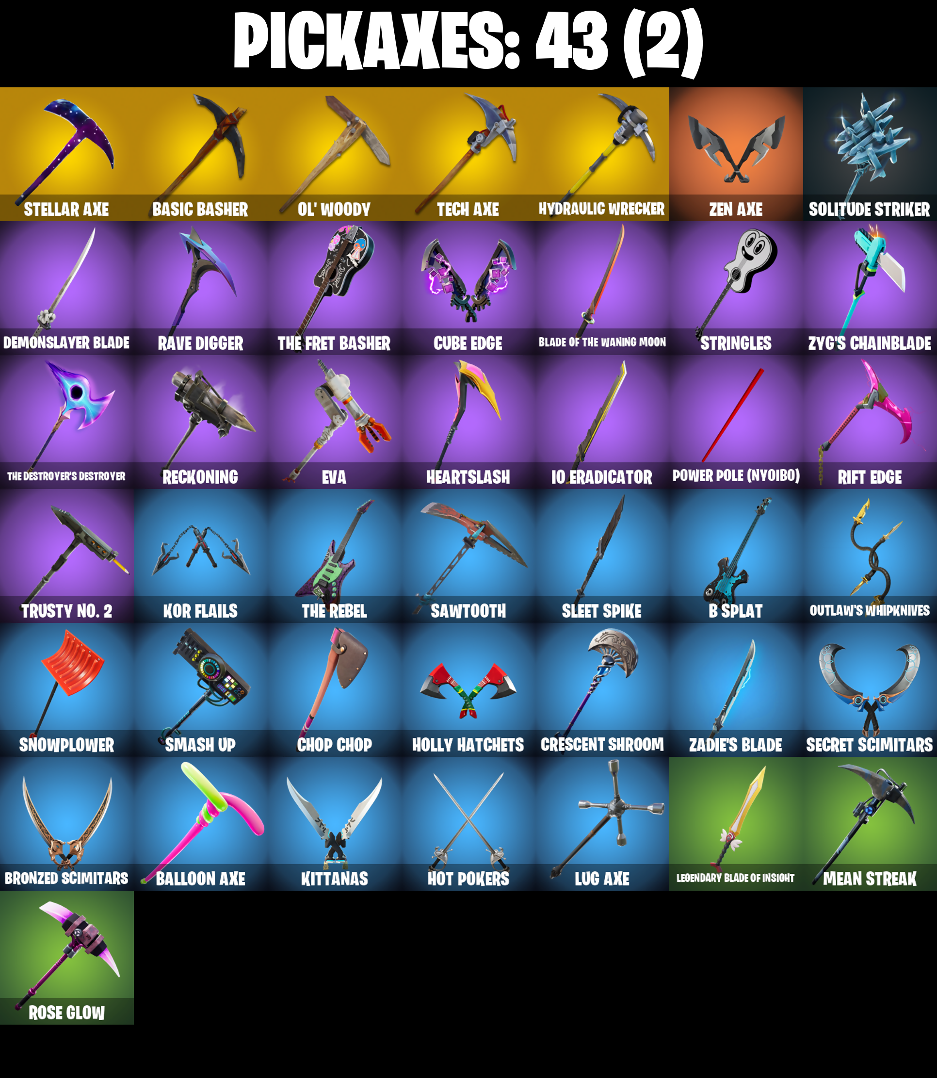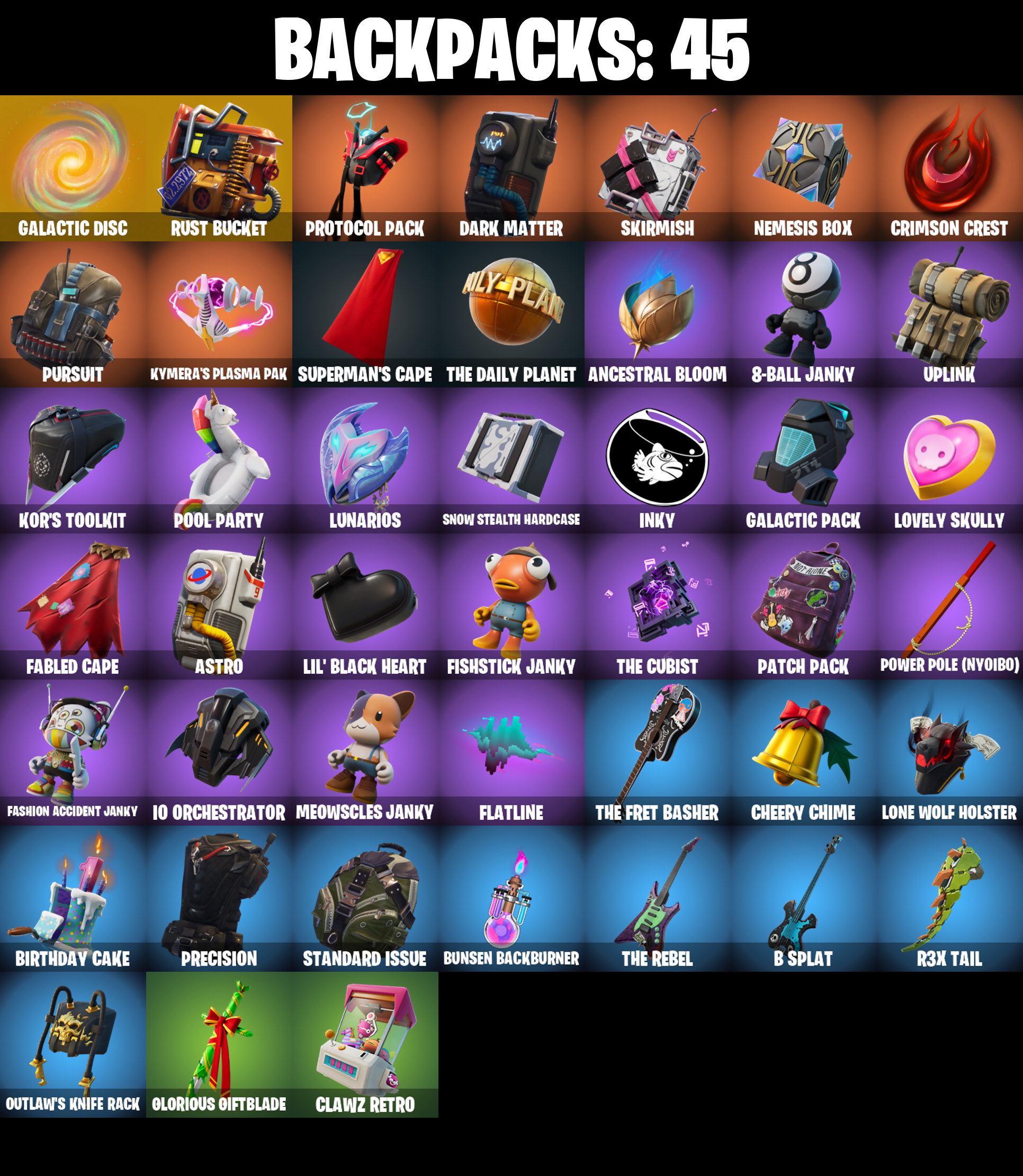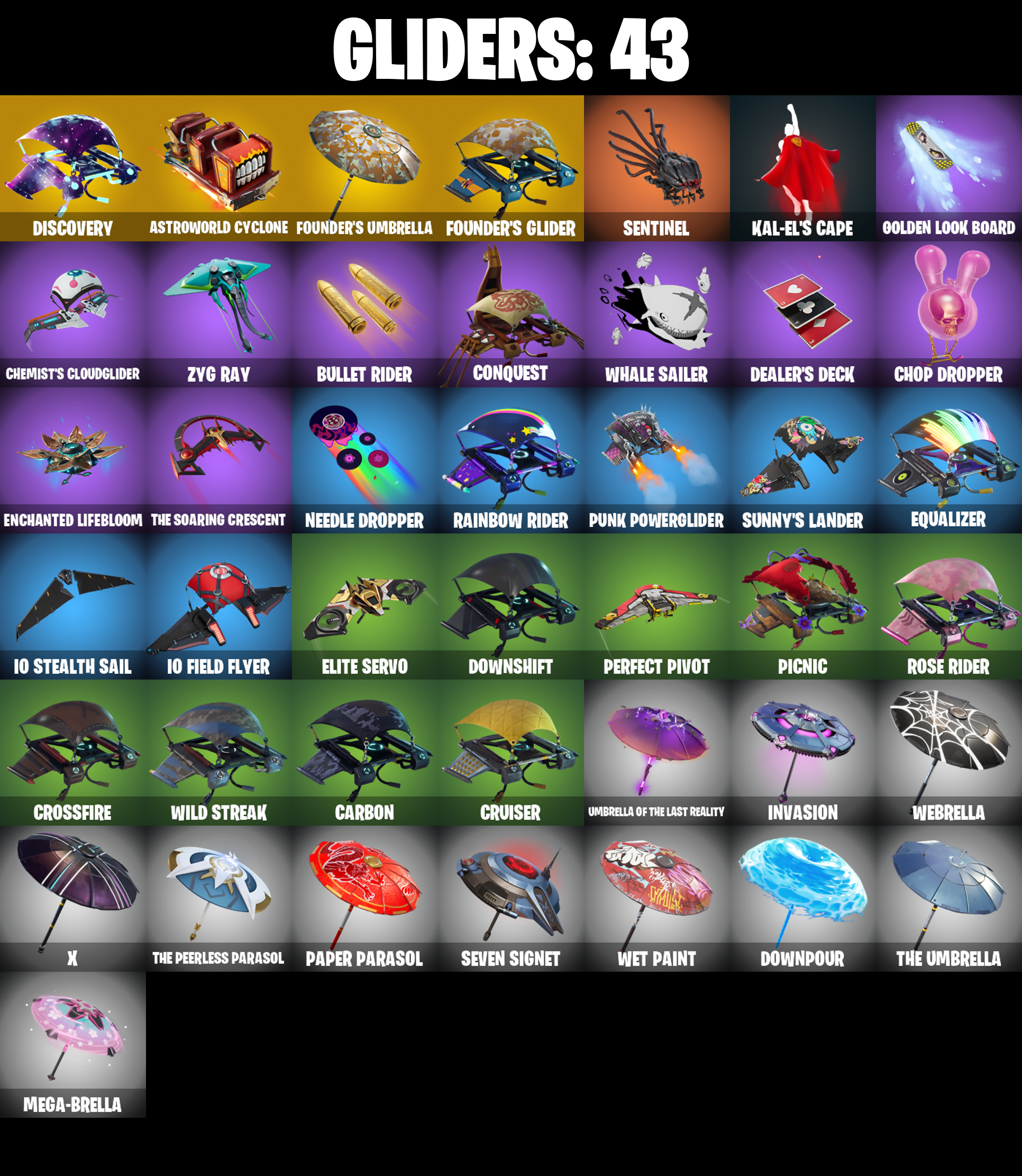 8-Ball Janky, Aftermath, Ancestral Bloom, Astro, Astroworld Cyclone, B Splat, B.R.U.T.E. Navigator, Balloon Axe, Basic Basher, Behold!, Best Mates, Birthday Cake, Blade of the Waning Moon, Blinding Lights, Blizzabelle, Boogie Down, Bronzed Scimitars, Bullet Rider, Bunsen Backburner, Calamity, Calamity Stage 5, Calculated, Call Me, Carbon, Charlotte, Cheery Chime, Chemist's Cloudglider, Choice Knit, Chop Chop, Chop Dropper, Clark Kent, Clark Kent (Superman), Clawz Retro, Conquest, Crescent Shroom, Crimson Crest, Crossfire, Crowning Achievement, Cruiser, Cube Assassin, Cube Edge, DJ Yonder, Dark Matter, Dark Voyager, Dealer's Deck, Demonslayer Blade, Discovery, Downpour, Downshift, Drift, Drift Stage 5, Elite Agent, Elite Servo, Enchanted Lifebloom, Equalizer, Eva, Fabled Cape, Fashion Accident Janky, Fishstick Janky, Flatline, Founder's Glider, Founder's Umbrella, Galactic Disc, Galactic Pack, Galaxy, Gentleman's Dab, Giddy-Up, Glorious Giftblade, Golden Look Board, Guggimon, Hand-Forged, Head (Droopy), Headbanger, Heartslash, Holiday Boxy, Holly Hatchets, Hot Marat, Hot Pokers, Huntress, Hydraulic Wrecker, IO Field Flyer, IO Orchestrator, IO Stealth Sail, Inky, Invasion, Io Eradicator, Joey, Jubilation, Kal-El's Cape, Kittanas, Kor, Kor Flails, Kor's Toolkit, Kymera, Kymera's Plasma Pak, Legendary Blade of Insight, Lil' Black Heart, Lil' Saucer, Lone Wolf Holster, Lovely Skully, Lug Axe, Lunar Charge, Lunarios, Mean Streak, Mega-Brella, Meowscles Janky, Mission Specialist, Moonwalker, Needle Dropper, Nemesis Box, Never Gonna, Ol' Woody, Orange Justice, Outlaw's Knife Rack, Outlaw's Whipknives, Paper Parasol, Patch Pack, Perfect Pivot, Picnic, Pool Party, Power Pole (Nyoibo), Precision, Protocol Pack, Punk Powerglider, Pursuit, R3X Tail, Rainbow Rider, Rambunctious, Rave Digger, Ready When You Are, Reckoning, Redline, Regal Wave, Respect The Peace, Ride The Pony, Rift Edge, Ronin, Rose Glow, Rose Rider, Rose Team Leader, Rust Bucket, Rust Lord, Salute, Sawtooth, Secret Scimitars, Sentinel, Seven Signet, Shanta, Ska-stra-terrestrial, Skirmish, Sleet Spike, Smash Up, Snow Stealth Hardcase, Snow Stealth Slone, Snowbell, Snowplower, Solitude Striker, Son Goku, Standard Issue, Stellar Axe, Stock, Stringles, Sun Strider, Sunny, Sunny's Lander, Superman's Cape, Take The L, Tech Axe, The Cubist, The Daily Planet, The Destroyer's Destroyer, The Fret Basher, The Peerless Parasol, The Reaper, The Rebel, The Robot, The Soaring Crescent, The Umbrella, Toona Fish, Tra La La, Tracy Trouble, Trusty No. 2, Umbrella Of The Last Reality, Uplink, Vulcan Salute, Warpaint, Wave, Webrella, Wet Paint, Whale Sailer, Wild Streak, Winterfest Bushranger, X, You're Awesome, Zadie's Blade, Zen Axe, Zyg, Zyg Ray, Zyg's Chainblade