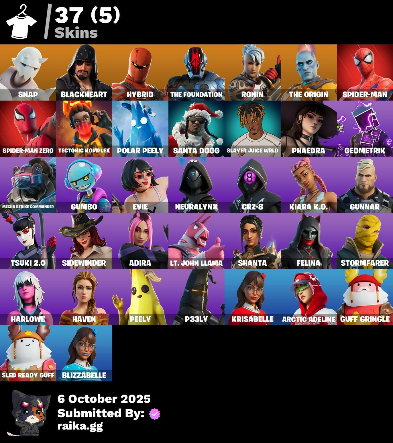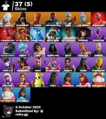 [PC/PSN/XBOX] 37 skins | Snap | Blackheart | Hybrid | The Foundation | Ronin | The Origin | Spider-Man | Spider-Man Zero | Tectonic Komplex | Polar Peely | 550 VB / FN