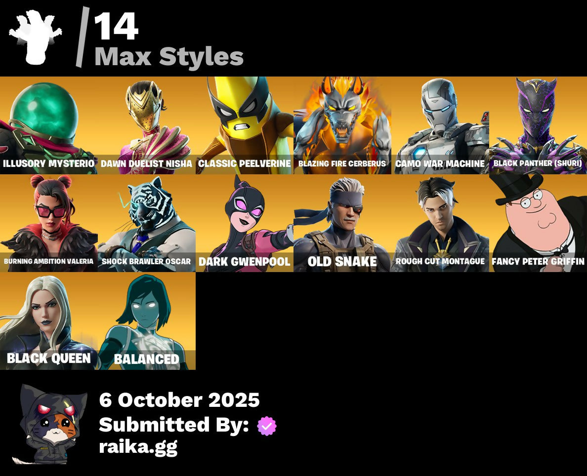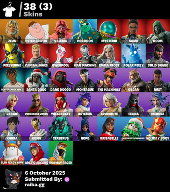 [PC/PSN/XBOX] 38 skins | Zeus | Peter Griffin | Valeria | Poseidon | Mysterio | Shuri | Doom | Peelverine | Captain Jones | Gwenpool | War Machine | 150 VB / FN