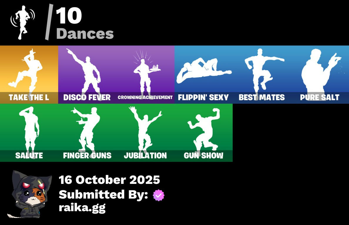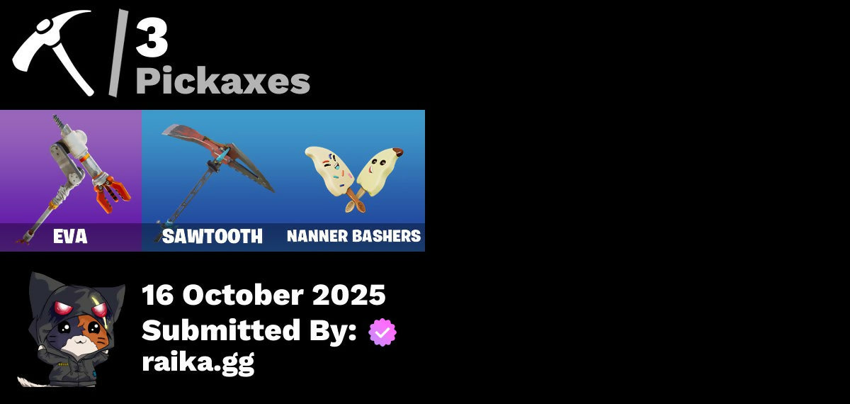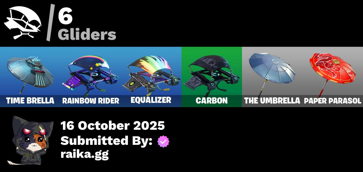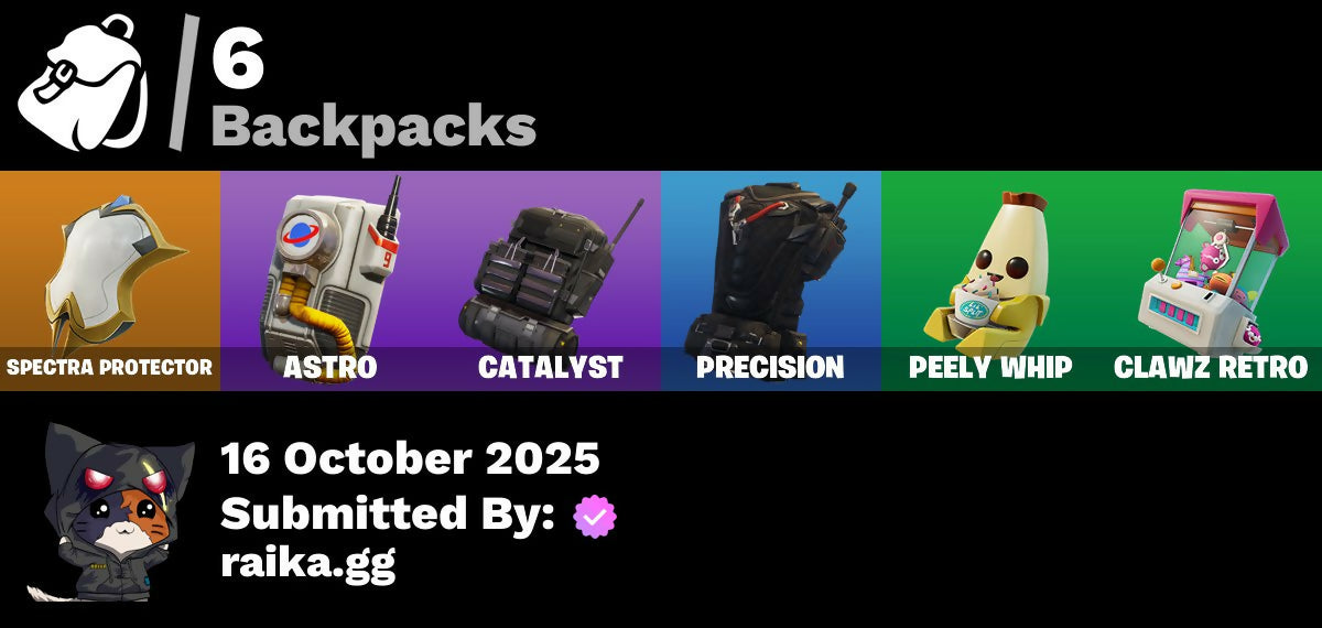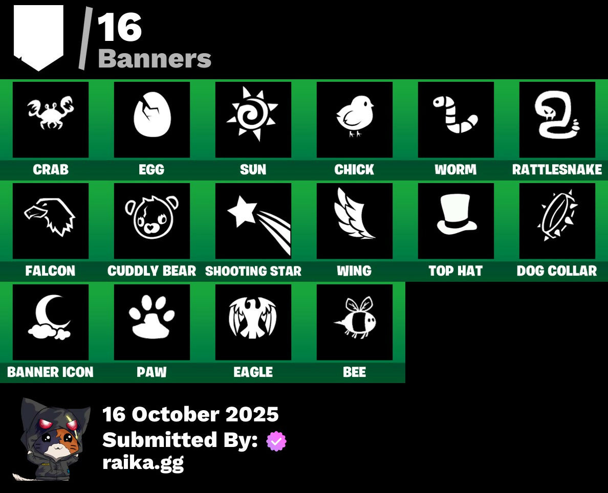 Astro, Banner Icon, Bee, Best Mates, Carbon, Catalyst, Chick, Clawz Retro, Comet, Crab, Crowning Achievement, Cuddly Bear, Disco Fever, Dog Collar, Eagle, Egg, Equalizer, Eva, Falcon, Finger Guns, Flippin' Sexy, Fryangles, GG Snowman, Gun Show, Jubilation, Knight's Honor, Lunarian Luxury, Mission Specialist, Moonwalker, Nanner Bashers, Paper Parasol, Paw, Peely Whip, Precision, Pure Salt, Rainbow Rider, Rattlesnake, Rogue Agent, Rust Lord, Salute, Sawtooth, Shooting Star, Spectra Protector, Spectrakinetic, Sun, Take The L, The Umbrella, Time Brella, Top Hat, Wing, Worm