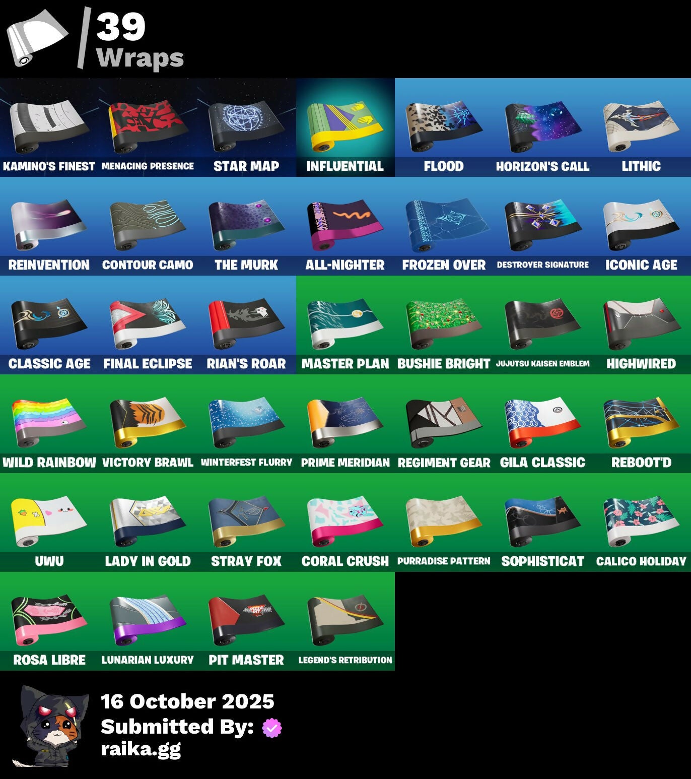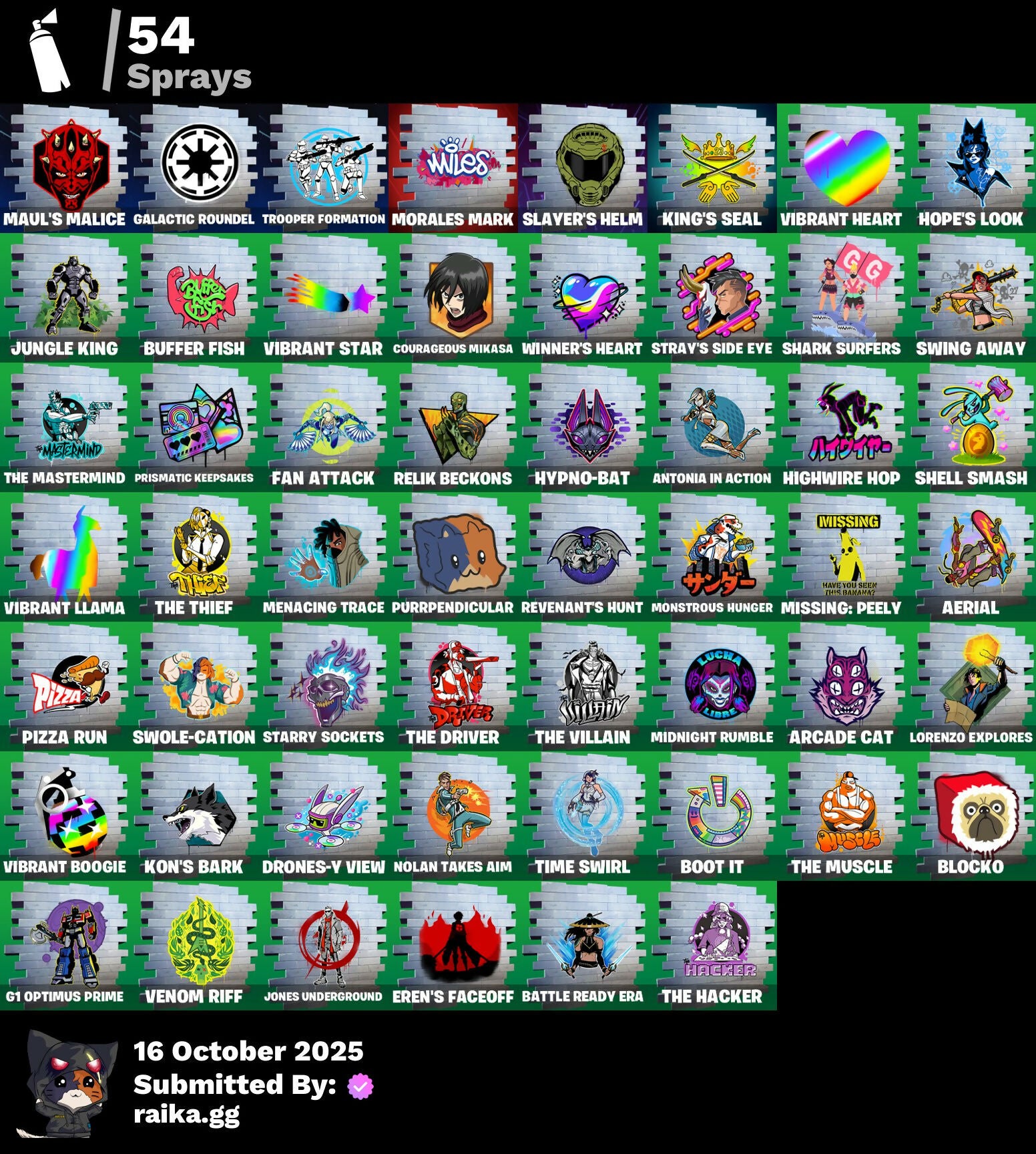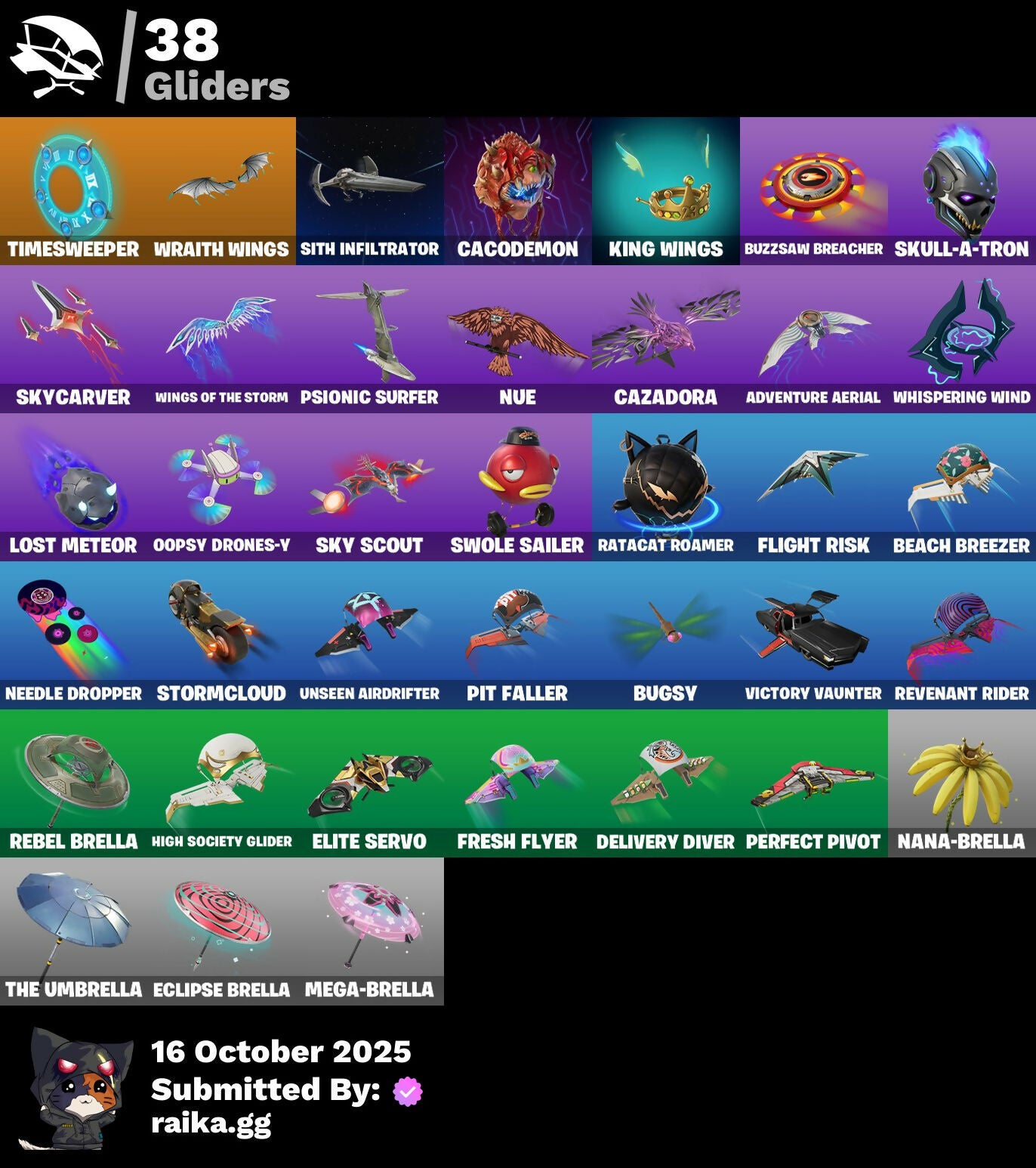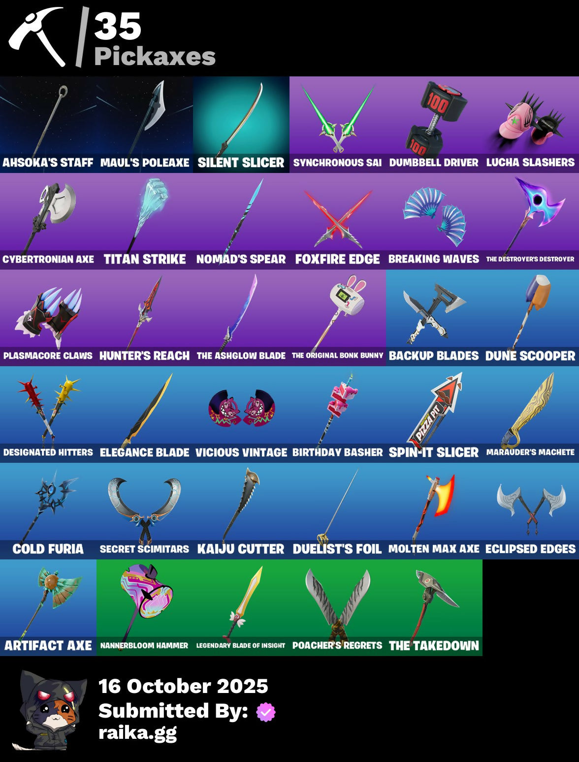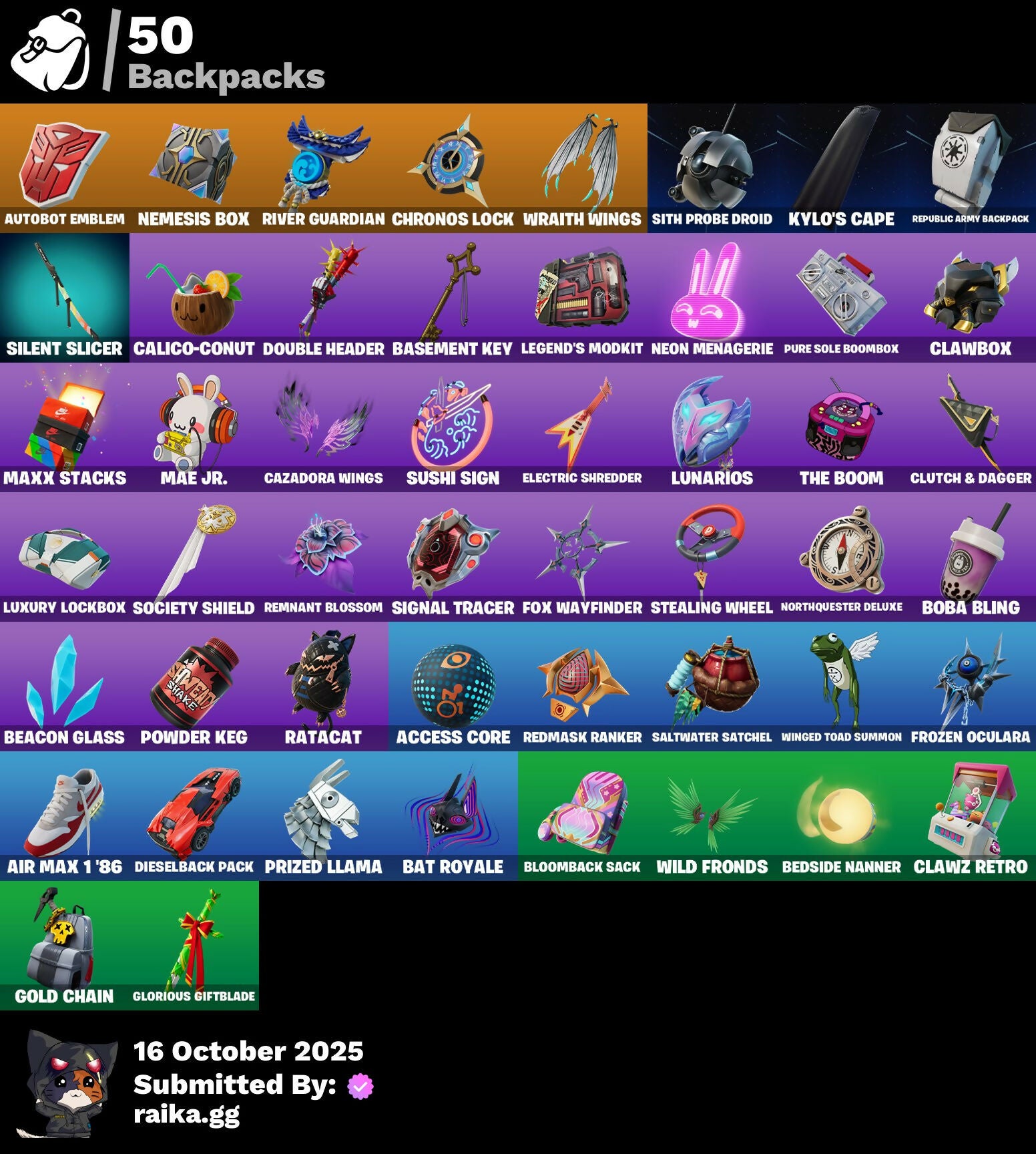 Access Core, Adventure Aerial, Aerial, Ahsoka's Clone Trooper, Ahsoka's Staff, Air Max 1 '86, Airie, All-Nighter, Antonia, Antonia In Action, Arcade Cat, Artifact Axe, Autobot, Autobot Emblem, Autograph, Please!, Backup Blades, Banner Icon, Basement Key, Bat Royale, Battle Ready Era, Battle-Tested, Beach Breezer, Beacon Glass, Beatzbunny, Bedside Nanner, Big Fan, Birthday Basher, Blocko, Bloomback Sack, Boba Bling, Boot It, Breaking Waves, Bubblegum Highwire, Buffer Fish, Bugsy, Bushie Bright, Buzzsaw Breacher, Cacodemon, Calico Holiday, Calico-Conut, Cazadora, Cazadora Wings, Chef's Special, Chronos Lock, Classic Age, Clawbox, Clawz Retro, Clone Trooper, Clutch & Dagger, Cold Furia, Collector Kado Thorne, Console Cup, Contour Camo, Coral Crush, Coruscant Guard, Count It!, Courageous Mikasa, Crack It, Crowning Achievement, Cybertronian Axe, Darth Maul, Delivery Diver, Designated Hitters, Destroyer Signature, Dice Roll, Dieselback Pack, Double Header, Dramatic Flares, Drones-Y View, Duelist's Foil, Dumbbell Driver, Dumbell Driver, Dune Scooper, Easter Egg, Eclipse Brella, Eclipsed Edges, Electric Shredder, Elegance Blade, Elite Servo, Empress Fan Dance, Era, Eren Jaeger, Eren's Faceoff, Expressionism, Fan Attack, Fang Dance, Final Eclipse, Finger Wag, Fish Thicc, Fishstick, Flaky Feast, Flight Risk, Flood, Foil Flex, Fox Wayfinder, Foxfire Edge, Fresh Flyer, Frozen Oculora, Frozen Over, G1 Optimus Prime, Galactic Roundel, Get Griddy, Get Out Of Your Mind, Gila Classic, Glorious Giftblade, Gold Chain, Good Game, Well Played, Hand Of Trace, Headbanger, Heartburst, High Society Glider, Highwire, Highwire Hop, Highwired, Holiday Boxy, Hope, Hope's Look, Horizon's Call, Hunter's Reach, Hypno-Bat, Hypnot-Eyes, I'm A Mystery, IWD 2023 Banner, Iconic Age, Imani, Influential, It's Like This, Jones Underground, Jujutsu Kaisen Emblem, Jungle King, Kado Thorne, Kaiju Cutter, Kamino's Finest, Kaws Skeleton, Keep 'Em Crispy, Khaby Lame, King Wings, King's Seal, Kon's Bark, Kylo Ren, Kylo's Cape, Lady In Gold, Legend's Modkit, Legend's Retribution, Legendary Blade Of Insight, Lil' Diplodoculus, Lil' Podracer, Lil' T-6 Shuttle, Lithic, Lorenzo, Lorenzo Explores, Lorenzo The Reckless, Lost Meteor, Lovely Skully, Lucha Slashers, Lunarian Luxury, Lunarios, Lunch Break, Luxury Lockbox, Mae, Mae Jr., Mae's Sigil, Magmatic Mizuki (Cover-Up Off), Marauder's Machete, Mariposa, Mariposa's Mask, Master Plan, Maul's Malice, Maul's Poleaxe, Maxx Stacks, Maxxed Out Max, Mega-Brella, Menacing Presence, Menacing Trace, Midnight Rumble, Mind's Eye, Missing: Peely, Mizuki, Molten Max Axe, Monstrous Hunger, Morales Mark, Mystica, Nana-Brella, Nannerbloom Hammer, Needle Dropper, Nemesis Box, Neon Menagerie, Never Gonna, Nisha, Nolan Chance, Nolan Takes Aim, Nolan's Sigil, Nomad's Spear, Northquester Deluxe, Nue, On, Oopsy Drones-V, Optimus Prime, Oscar, Pack Leader, Perfect Pivot, Piper Pace, Pit Faller, Pit Master, Pitcycle, Pizza Pit, Pizza Run, Plasmacore Claws, Poacher's Regrets, Point & Shoot, Powder Keg, Prime Meridian, Prismatic Keepsakes, Prized Llama, Psionic Surfer, Pure Sole Boombox, Purradise Meowscles, Purradise Pattern, Purrpendicular, Quick Bite, Ratacat, Ratacat Roamer, Rebel Brella, Reboot'd, Redmask Ranker, Reef Cake Fish Thicc, Regal Hunter Mariposa, Regal Hunter Relik, Regal Hunter Rian, Regal Hunter Trace, Regiment Gear, Reinvention, Relik, Relik Beckons, Remnant Blossom, Renzo The Destroyer, Republic Army Backpack, Revenant Rider, Revenant's Hunt, Rian, Rian Skull, Rian's Roar, River Guard, River Guardian, Rococo Cloak-O, Rosa Libre, Saltwater Satchel, Scout Regiment Salute, Secret Scimitars, Self Reflexing, Shadow Play: Toad, Shark Surfers, Shell Smash, Signal Tracer, Silent Slicer, Sith Infiltrator, Sith Probe Droid, Skull-A-Tron, Sky Scout, Skycarver, Slap Juice., Slayer's Helm, Slurp Co., Society Shield, Sophisticat, Spin-It Slicer, Standing Bow, Star Glyph, Star Map, Starry Sockets, Stealing Wheel, Stormcloud, Stray, Stray Fox, Stray's Side Eye, Sushi Sign, Swag Shot, Sweet Shot, Sweet!, Swing Away, Swole Sailer, Swole-Cation, Synchronous Sai, Sypher's Strut, Taiko Drumbeat, Take A 'Bow, Target Training, The Ashglow Blade, The Boom, The Destroyer's Destroyer, The Dip, The Driver, The Hacker, The Mastermind, The Murk, The Muscle, The Original Bonk Bunny, The Takedown, The Thief, The Umbrella, The Villain, This Is Fine, Thorne's Mask, Thunder, Time Swirl, Timesweeper, Titan Run: Freestyle, Titan Run: Rampage, Titan Run: Rush, Titan Strike, Trace, Traditional Khaby, Trooper Formation, Underworld Desdemona, Unseen Airdrifter, Uwu, Vengeance Jones, Venom Riff, Vibrant Boogie, Vibrant Heart, Vibrant Llama, Vibrant Star, Vicious Vintage, Victory Brawl, Victory Vaunter, Vinyl, Whispering Wind, Wild Fronds, Wild Rainbow, Winged Toad Summon, Wings Of The Storm, Winner's Heart, Winterfest Bushranger, Winterfest Flurry, Wintersong Mystica, Wolf Pack Trooper, Wraith Wings