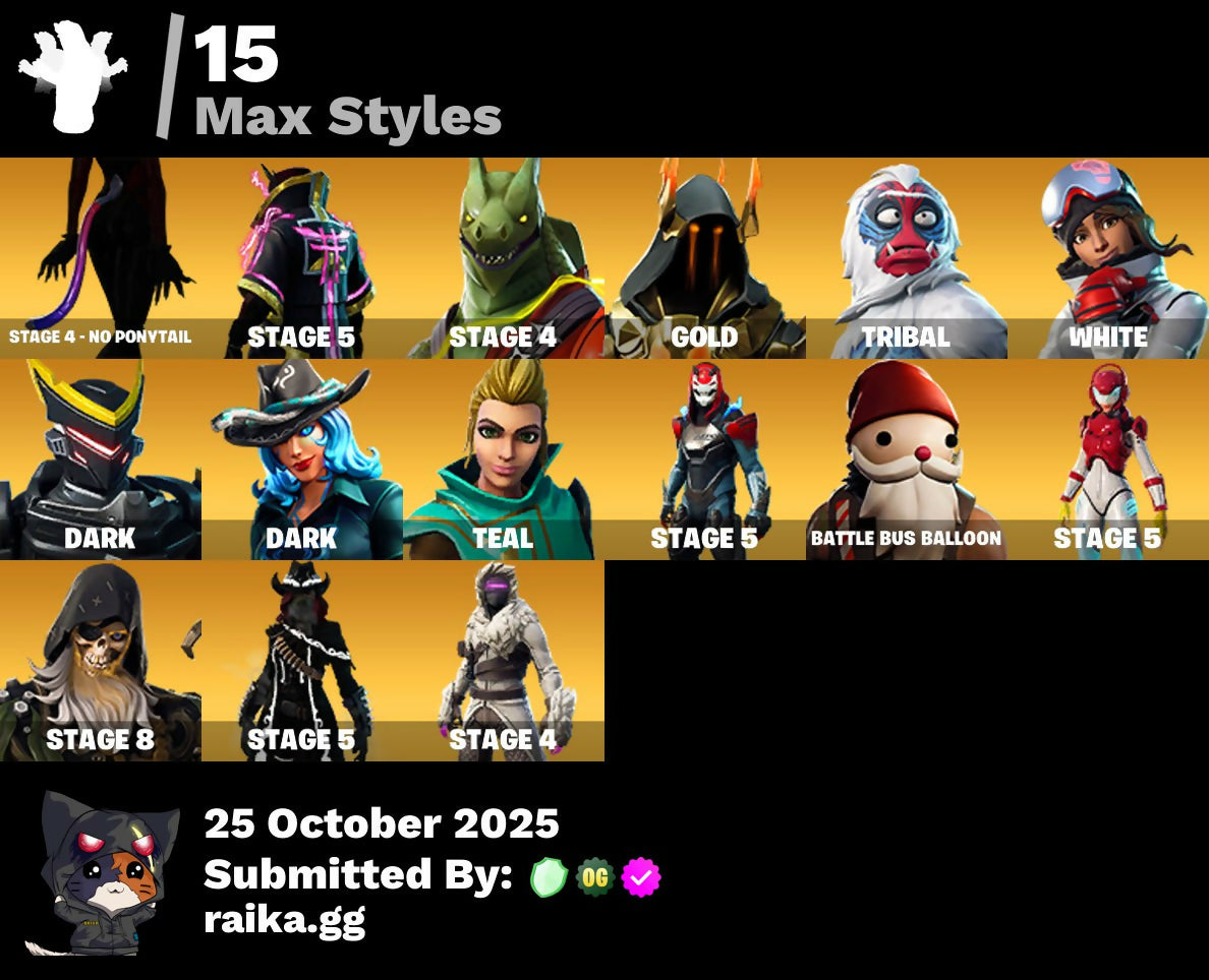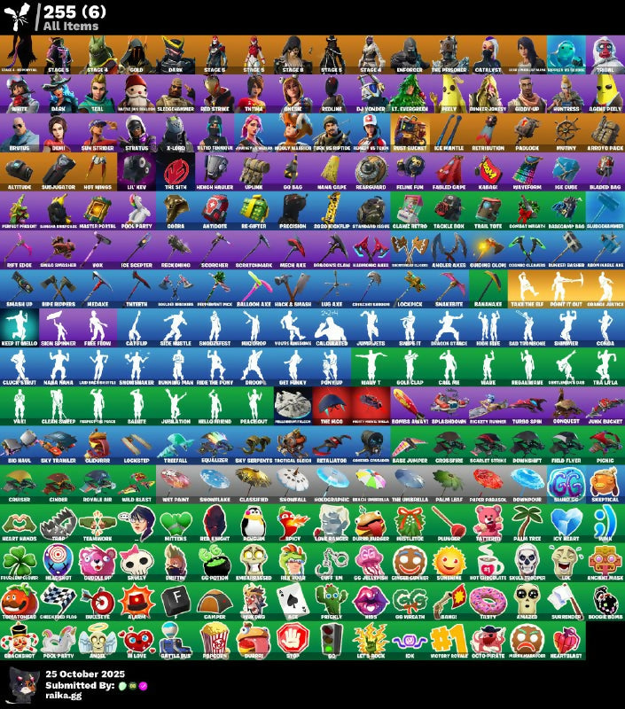 Acid Peely, Aero Blade Axe, Agent Peely, Altitude, Amazing, Anchor Mask, Angler Axes, Antidote, Arroyo Pack, Bad Tombstone, Balloon Axe, Barrel, Bash Jumper, Battle Bus, Battle Bus Balloon, Beach Umbrella, Big Gifter, Big Haul, Bittys, Bladed Bag, Bombs Away!, Boogie Bomb, Boogiedown Kid, Brutus, Bullseye, Bunker Basher, Bunker Jonesy, Calibrated, Call Me, Cat Flip, Catalyst, Checkered Flag, Chicken Clucker, Chilly, Cinder, Classified, Claw Retro, Clean Sweep, Cluck Shot, Cobra, Conda, Conquest, Cosmic Cleavers, Cosmic Justice, Crackshot, Crossfire, Cruiser, Cuddle Up, DJ Yonder, Da Wonder, Dark, Demi, Dinner Jonesy, Don’t it out, Doomsday Claim, Downpour, Downshift, Dragon Stance, Droop, Duck Racer, Durrr, Ember Fused, Enforcer, Equalizer, F., Fabled Cape, Feline Fun, Field Flyer, Firefighter’s Friend, Free Flow, Frosted Clover, GG Jellyfish, GG Potion, GG Viretta, Game Breaker, Gamer, Gear Specialist Maya, Get Funky, Ghostly Crusader, Giddy Up, Giddy-Up, Ginger Ginger, Go Bag, Gobrat Malorn, Gold, Golden Basher, Golf Ball, Golf Clap, Guiding Glow, Hack & Smash, Hamicron Axe, Haunch Hauler, Headshot, Heart Hands, Heartblast, Hello Friend, Hic! Drop, High Rise, Holly Marauder, Holographic, Hot Wings, Huntress, IDK, Ice Cube, Ice Mantle, Ice Pickers, Ice Scepter, Jack O Lantern, Jonesy Skull Trooper, Journey vs Hazard, Jubilation, Jump, Jumpstyles, Jungle, Junk Bucket, Kabagi, Keep it Mello, Lads Beach Bum, Laser Beam, Let’s Rock, Lil Kev, Llama Barricade, Lockpick, Lockstep, Lt. Evergreen, Lug Axe, Mana Cape, Marine Marauder, Master Portal, Mech Axe, Medaxe, Mermalordian, Mistletone, Mutiny, My Love, Nana Nana, Octo Pirate, Olddurr, Onesie, Orange Justice, Padlock, Palm Leaf, Palm Tree, Paper Parasol, Peace Out, Peely, Penguin, Picnic, Plushcap, Point It Out, Pony Up, Pool Party, Precision, Prickly, Ragnaraxe, Rascal Bag, Ready T, Realm Marine, Rearguard, Reboot Request, Reckoning, Red Fiend, Red Knight, Red Rippers, Red Strike, Redline, Remedy vs Toxin, Retaliator, Retribution, Rickety Runner, Ride The Pony, Rift Edge, Rippley vs Sludge, Royale Run, Running Man, Rust Bucket, Scarlet Strike, Scorcher, Scratchmark, Scuba Jonesy, Shadowfest, Shieldland Dash, Shining Shaker, Shush, Side Hustle, Sign Spinner, Silma Slasher, Skeptical, Skull Trooper, Sky Serpents Tactical Design, Sky Tramler, Slackdawmin, Slasher, Sledgehammer, Smash Up, Snarlbite, Snowfall, Snowflake, Snugly, Spicy, Spiky, Splashdown, Stage 1, Stage 2, Stage 3, Stage 4, Stage 4 - No Ponytail, Stage 5, Stage 8, Stage 9, Stamped, Standard Issue, Staycation, Stratus, Straw, Subjugator, Sun Strider, Sunshine, Surrender, Swipe it, Tackle Box, Take The Elf, Teal, The Prisoner, The Riggo, The Sith, The Umbrella, Thrasher, Tico Us Reptile, Tico Us Tank, Tilted Teknique, Timeless Ultima, Timetram, Tntina, Tomatohead, Tra La La, Trail Tool, Treefall, Tribal, Trog, Turbo Spin, Turk vs Riptide, Unnamed, Uplink, Valki, Victory Royale, Vox, Wave, Waveform, Wet Paint, White, Wicked, Wild Blast, Wooly Warrior, X-Lord, Your’s Awesome
