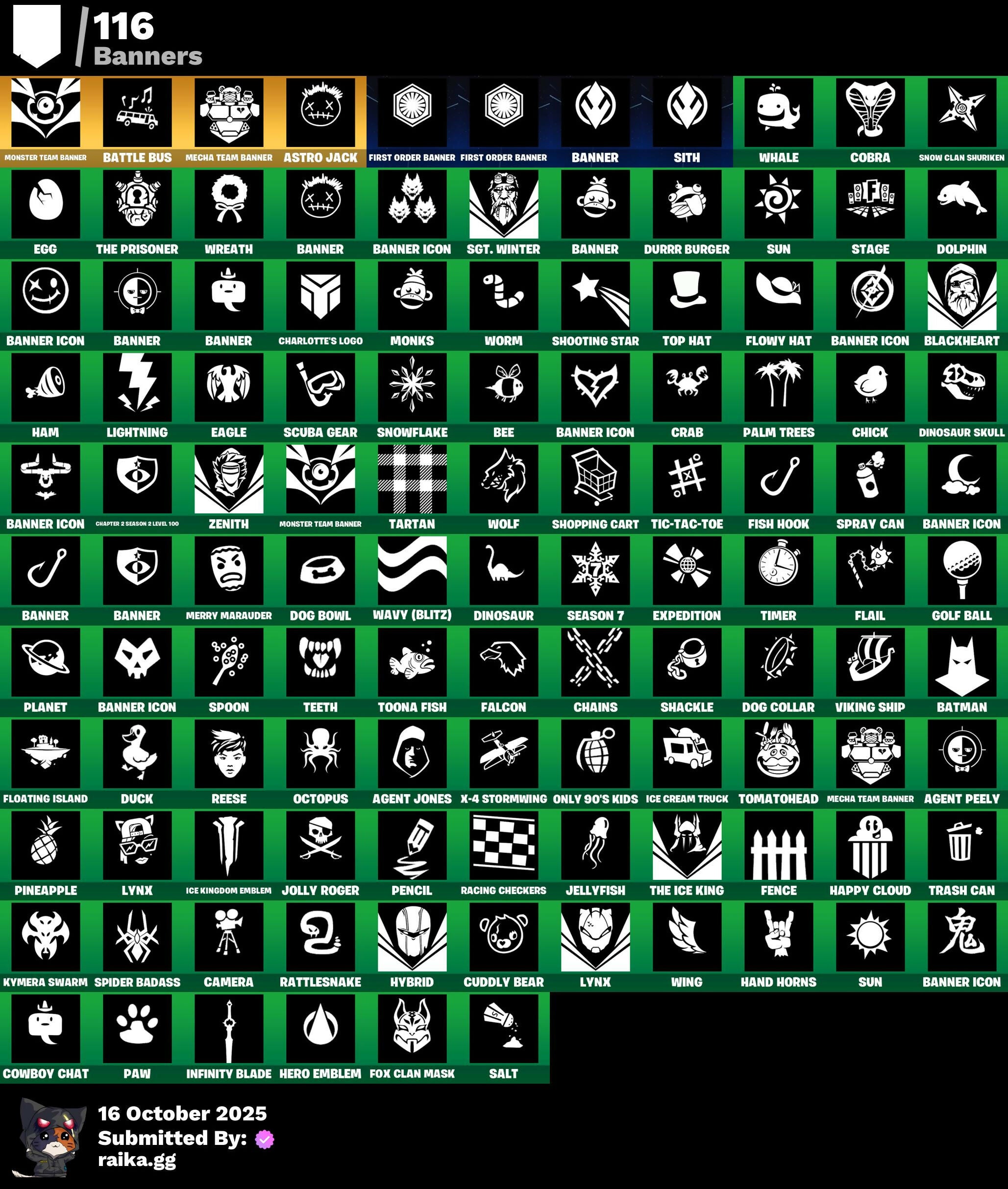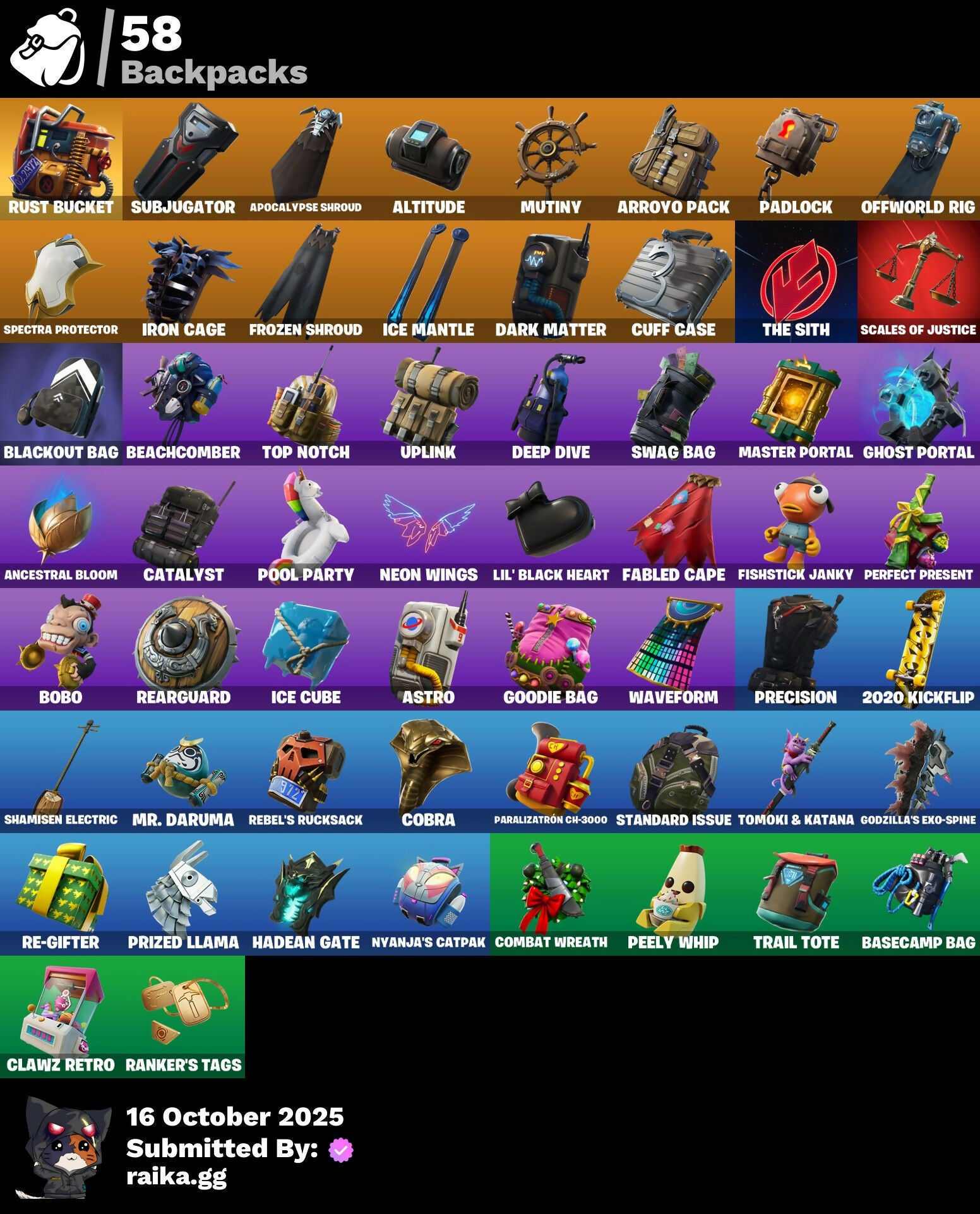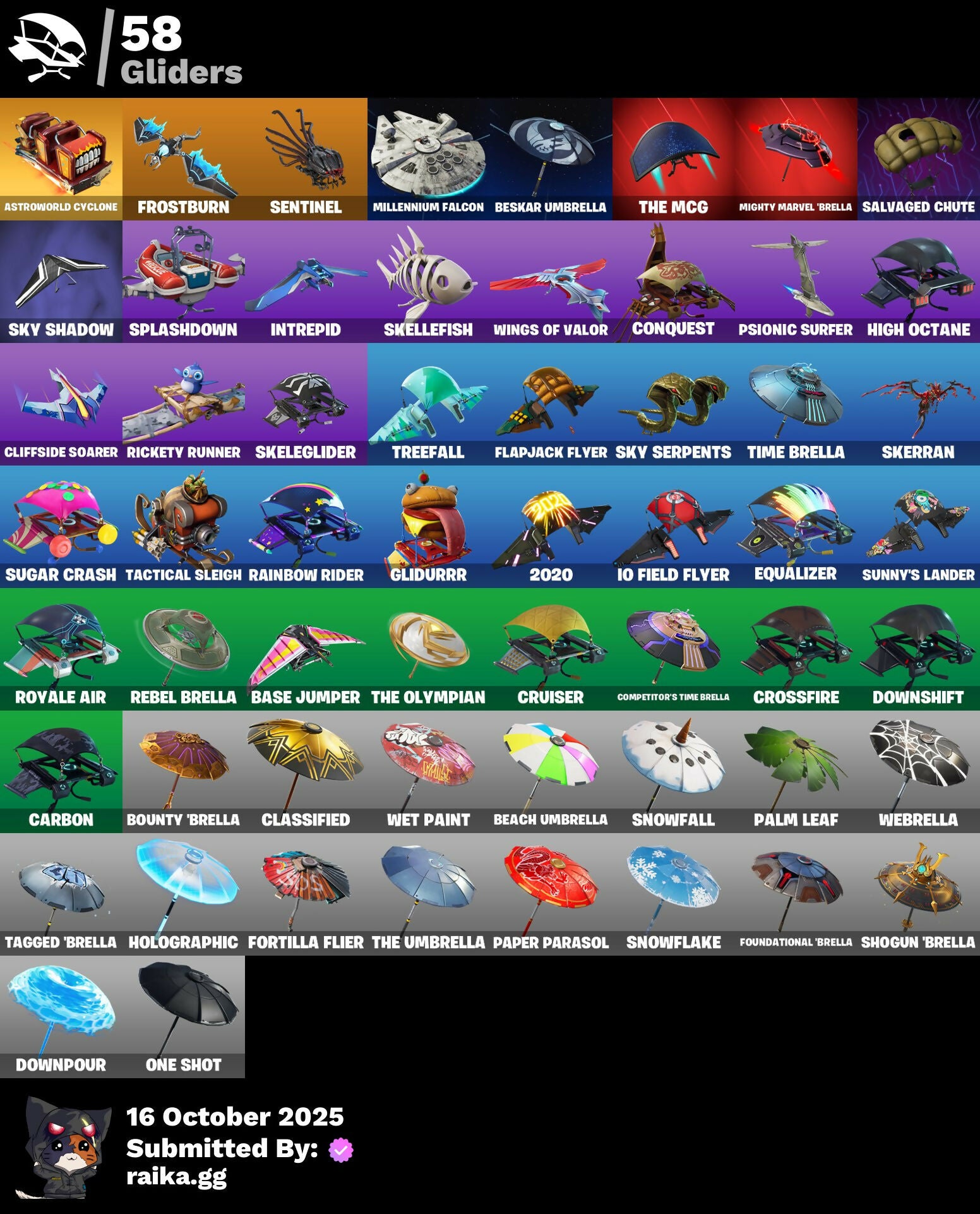 2020, 2020 Kickflip, Abominable Axe, Abstract, Aerial Classic, Aerial Swagger, Afterparty, Agent Jones, Agent Peely, Altitude, Ancestral Bloom, Apocalypse Shroud, Arctic Camo, Arrow, Arroyo Pack, Astro, Astro Antidote, Astro Jack, Astroworld Cyclone, Bag of Coal, Baited, Balloon Axe, Bananas, Bananaxe, Banner, Banner Icon, Base Jumper, Basecamp Bag, Basic Basher, Batman, Battle Bus, Battle Bus Balloon, Battlehawk, Beach Umbrella, Beachcomber, Bee, Beep Beep, Beskar Umbrella, Best Mates, Blackheart, Blackout Bag, Blasted, Bobo, Bombastic Winterfest, Boogie, Boogie Down, Both Eyes Open, Boulder Breakers, Bounty 'Brella, Breakdown, Burning Dragon, Calculated, Call Me, Camera, Carbide, Carbon, Carbon & Gold, Cash Grab, Cat Flip, Catalyst, Cerberus Bite, Chains, Chalk Outline, Charlotte's Logo, Chick, Chillshot, Choice Knit, Circle, Classified, Clawz Retro, Clean Sweep, Cliffside Soarer, Cobra, Combat Wreath, Comet, Competitor's Time Brella, Conquest, Cowboy Chat, Crab, Crazy Castle, Crescent Shroom, Crossfire, Crowbar, Crowning Achievement, Cruiser, Crystal Fang, Cuddle Hearts, Cuddle Team Hula, Cuddly Bear, Cuff Case, D.C. 63, Dark Matter, Dark Voyager, Deep Dive, Demons Beware, Denim Destiny, Dinosaur, Dinosaur Skull, Do It!, Dog Bowl, Dog Collar, Dolphin, Downpour, Downshift, Doze Dab, Dragon Stance, Dragon's Claw, Drift, Dropout, Duck, Durrr, Durrr Burger, E.G.O., Eagle, Egg, El Chapulín Colorado, Electro Shuffle, Elite Agent, Elite Cleat, Enforcer, Equalizer, Eva, Everything's Fine, Expedition, Fabled Cape, Fake Door, Falcon, Fence, Festive Paper, First Order Banner, Fish Hook, Fishstick Janky, Flail, Flapjack Flyer, Flippin' Away, Floating Island, Flowy Hat, Fortilla Flier, Foundational 'Brella, Fox Clan Mask, Free Flow, Frostburn, Frosty Globes, Frozen Shroud, Fryangles, GG Ornament, GG Potion, GG Smiley, GG Snakes, GG Snowman, Gale Force, Gentleman's Dab, Get Funky, Ghost Portal, Glidurrr, Godzilla's Exo-Spine, Gold, Golf Ball, Golf Clap, Good Vibes, Goodie Bag, Grav-Fusion, Groot's Sap Axes, Grumpy Tree, Guggi Was Here, Guiding Glow, Hadean Gate, Hades Insignia, Ham, Hammerhead, Hand Horns, Happy Cloud, Haute Hustle, Hearts, Hello Friend, Hero Emblem, High Octane, Holly Hatchets, Holographic, Hope's Look, Hot Marat, Huntress, Hybrid, Hype, IO Field Flyer, Ice Cream Truck, Ice Cube, Ice Kingdom Emblem, Ice Mantle, Ice Scepter, Indigo Ice, Infinity Blade, Intrepid, Iron Cage, It's Go Time!, Jellyfish, Jet Signals, Jolly Roger, Josie, Jurassically Charged, Keep It Mello, Kiss, Kittanas, Knight's Honor, Knight's Treachery, Krisabelle, Kymera Swarm, Laser Chomp, Lightning, Lil' Black Heart, Lollipopper, Looted, Lt. Evergreen, Lucha GG, Lug Axe, Lynx, Marshmello, Marshy Smasher, Mask, Master Portal, Mecha Team Banner, Mello Made It Right, Melting Snowman, Menacing Trace, Mercurial, Mermaid, Merry Marauder, Mic Drop, Midas' Shadow, Mighty Marvel 'Brella, Millennium Falcon, Mission Specialist, Modern Rōnin, Monks, Monster Team Banner, Moonwalker, Moth, Mr. Daruma, Mutiny, Nailed It, Nanner Bashers, Neon Cat, Neon Wings, Never Yield, New Year 2020, Night Kama, Norse Llama, Nyanja's Catpak, Octopus, Offworld Rig, Ol' Woody, One Shot, Onesie, Only 90's Kids, Oozey, Orange Justice, Padlock, Palm Leaf, Palm Trees, Paper Parasol, Paralizatron CH-3000, Paw, Peeled, Peely Whip, Pencil, Peppermint Pick, Perfect Present, Permafrost, Pineapple, Pixel Ramirez, Pixels Royale, Planet, Point It Out, Polar Peely, Pool Party, Popcorn, Porthole, Positron, Potato Aim, Powder, Precision, Premiere Poms, Prized Llama, Psionic Surfer, Racing Checkers, Rage, Ragnarok, Raider's Return, Rainbow, Rainbow Rider, Ranker's Tags, Rattlesnake, Raven, Re-Gifter, Rearguard, Rebel Brella, Rebel's Rucksack, Redcap's Revenge, Redline, Reese, Regal Wave, Respect, Respect The Peace, Rickety Runner, Rift Edge, Rock Love, Rocket, Rocket Blaster, Rogue Agent, Rook, Royal Stroll, Royale Air, Ruby Shadows, Rust Bucket, Rust Lord, Salt, Salute, Salvaged Chute, Sap, Sawtooth, Scales Of Justice, Scorcher, Scratchmark, Scuba Gear, Season 7, Secret Scimitars, Sentinel, Sgt. Winter, Shackle, Shadow Ghost, Shadow Slicer, Shamisen Electric, Shanta's Lifebloom, Shaolin Sip, Shimmer, Shogun 'Brella, Shooting Star, Shopping Cart, Shortbread Slicers, Sidewayfarer, Sing Along, Sith, Skeleglider, Skellefish, Skerran, Skull & Beard, Skull Trooper, Sky Serpents, Sky Shadow, Sledgehammer, Smash O'-Lantern, Snow Clan Shuriken, Snowfall, Snowflake, Snowplower, Snowshaker, Snowy, Spectra Protector, Spectrakinetic, Spider Badass, Spiderweb, Spinal Slicer, Splashdown, Splinter Faction, Spoon, Spray Can, Spreading Chaos, Stacked!, Stage, Stage 4, Stage 4 - No Ponytail, Stage 5, Stage 5 - No Shoulder Pad, Stage 8, Stalwart Sweeper, Standard Issue, Stay Smooth, Strawberry Paws, Subjugator, Sugar Crash, Suited Up, Summit Striker, Sun, Sun Strider, Sunny's Lander, Sushi, Swag Bag, Swag Smasher, Swipe It, Tactical Sleigh, Tagged 'Brella, Take The Elf, Take The L, Tartan, Teeth, Teknique, The Ace, The Break, The Brood, The Destroyer's Destroyer, The Ice King, The McG, The Olympian, The Prisoner, The Reaper, The Robot, The Sith, The Takedown, The Umbrella, The Visitor, Three Llamas, Tic-Tac-Toe, Time Brella, Timer, Tomatohead, Tomoki & Katana, Toona Fish, Top Hat, Top Notch, Trail Tote, Trap Warning, Trash Can, Treefall, Tribal, Trog, Trog Drawings, Tropical Camo, True Love, Trusty No. 2, Turbulent Blade, Twinkly, Ultra Red, Undercurrent, Unity, Unwrapped, Uplink, Valentine, Valor, Verve, Victory Brawl, Viking Ship, Vulcan Salute, Wakandan Salute, Wave, Waveform, Wavy (Blitz), Webrella, Well Wrapped, Wet Paint, Whale, White, Wild Card, Wild Rainbow, Wild Redcaps, Window, Wing, Wings Of Valor, Winter, Wolf, Woodblock Print Jade, Woodblock Print Nyanja, Wooly, Wooly Warrior, Work It Out, Worm, Wreath, X Mark, X-4 Stormwing, Yay!, You're Awesome, Yummy, Zenith, Zeus Insignia, Zoey
