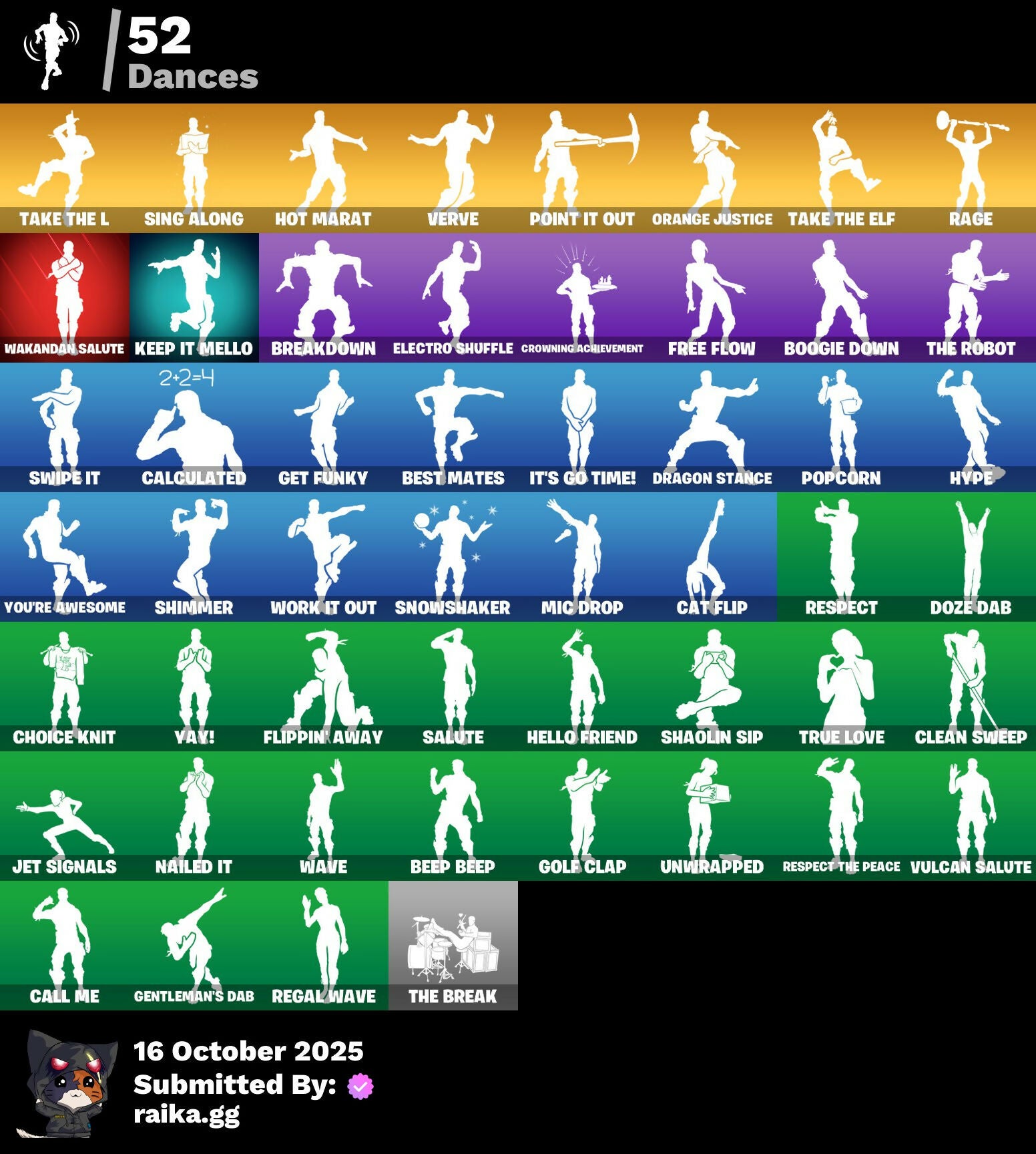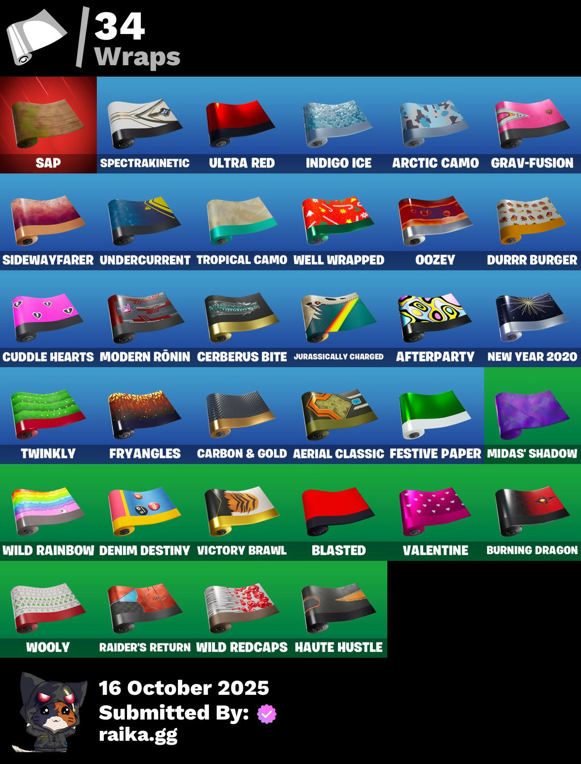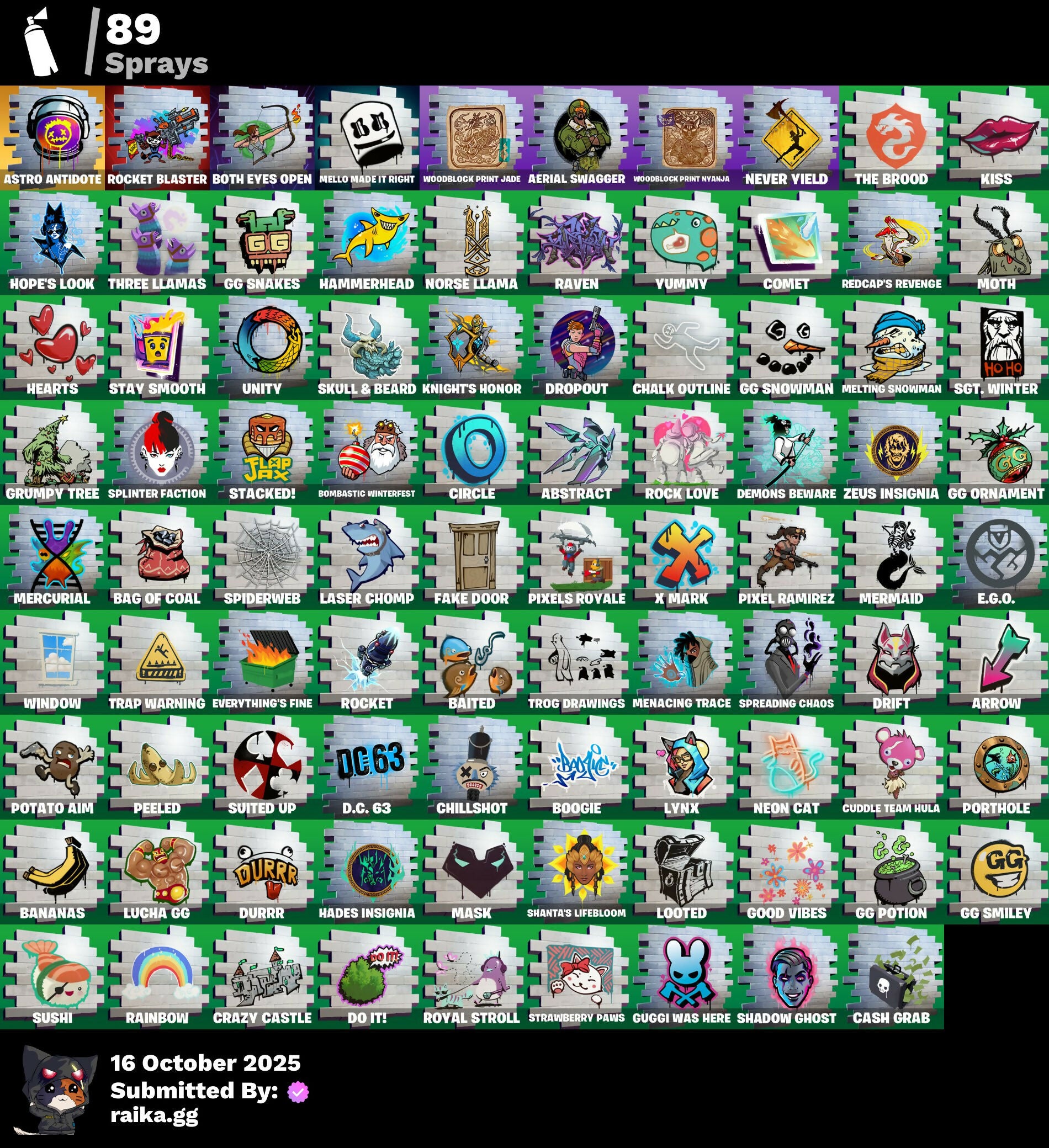 2020, 2020 Kickflip, Abominable Axe, Abstract, Aerial Classic, Aerial Swagger, Afterparty, Agent Jones, Agent Peely, Altitude, Ancestral Bloom, Apocalypse Shroud, Arctic Camo, Arrow, Arroyo Pack, Astro, Astro Antidote, Astro Jack, Astroworld Cyclone, Bag of Coal, Baited, Balloon Axe, Bananas, Bananaxe, Banner, Banner Icon, Base Jumper, Basecamp Bag, Basic Basher, Batman, Battle Bus, Battle Bus Balloon, Battlehawk, Beach Umbrella, Beachcomber, Bee, Beep Beep, Beskar Umbrella, Best Mates, Blackheart, Blackout Bag, Blasted, Bobo, Bombastic Winterfest, Boogie, Boogie Down, Both Eyes Open, Boulder Breakers, Bounty 'Brella, Breakdown, Burning Dragon, Calculated, Call Me, Camera, Carbide, Carbon, Carbon & Gold, Cash Grab, Cat Flip, Catalyst, Cerberus Bite, Chains, Chalk Outline, Charlotte's Logo, Chick, Chillshot, Choice Knit, Circle, Classified, Clawz Retro, Clean Sweep, Cliffside Soarer, Cobra, Combat Wreath, Comet, Competitor's Time Brella, Conquest, Cowboy Chat, Crab, Crazy Castle, Crescent Shroom, Crossfire, Crowbar, Crowning Achievement, Cruiser, Crystal Fang, Cuddle Hearts, Cuddle Team Hula, Cuddly Bear, Cuff Case, D.C. 63, Dark Matter, Dark Voyager, Deep Dive, Demons Beware, Denim Destiny, Dinosaur, Dinosaur Skull, Do It!, Dog Bowl, Dog Collar, Dolphin, Downpour, Downshift, Doze Dab, Dragon Stance, Dragon's Claw, Drift, Dropout, Duck, Durrr, Durrr Burger, E.G.O., Eagle, Egg, El Chapulín Colorado, Electro Shuffle, Elite Agent, Elite Cleat, Enforcer, Equalizer, Eva, Everything's Fine, Expedition, Fabled Cape, Fake Door, Falcon, Fence, Festive Paper, First Order Banner, Fish Hook, Fishstick Janky, Flail, Flapjack Flyer, Flippin' Away, Floating Island, Flowy Hat, Fortilla Flier, Foundational 'Brella, Fox Clan Mask, Free Flow, Frostburn, Frosty Globes, Frozen Shroud, Fryangles, GG Ornament, GG Potion, GG Smiley, GG Snakes, GG Snowman, Gale Force, Gentleman's Dab, Get Funky, Ghost Portal, Glidurrr, Godzilla's Exo-Spine, Gold, Golf Ball, Golf Clap, Good Vibes, Goodie Bag, Grav-Fusion, Groot's Sap Axes, Grumpy Tree, Guggi Was Here, Guiding Glow, Hadean Gate, Hades Insignia, Ham, Hammerhead, Hand Horns, Happy Cloud, Haute Hustle, Hearts, Hello Friend, Hero Emblem, High Octane, Holly Hatchets, Holographic, Hope's Look, Hot Marat, Huntress, Hybrid, Hype, IO Field Flyer, Ice Cream Truck, Ice Cube, Ice Kingdom Emblem, Ice Mantle, Ice Scepter, Indigo Ice, Infinity Blade, Intrepid, Iron Cage, It's Go Time!, Jellyfish, Jet Signals, Jolly Roger, Josie, Jurassically Charged, Keep It Mello, Kiss, Kittanas, Knight's Honor, Knight's Treachery, Krisabelle, Kymera Swarm, Laser Chomp, Lightning, Lil' Black Heart, Lollipopper, Looted, Lt. Evergreen, Lucha GG, Lug Axe, Lynx, Marshmello, Marshy Smasher, Mask, Master Portal, Mecha Team Banner, Mello Made It Right, Melting Snowman, Menacing Trace, Mercurial, Mermaid, Merry Marauder, Mic Drop, Midas' Shadow, Mighty Marvel 'Brella, Millennium Falcon, Mission Specialist, Modern Rōnin, Monks, Monster Team Banner, Moonwalker, Moth, Mr. Daruma, Mutiny, Nailed It, Nanner Bashers, Neon Cat, Neon Wings, Never Yield, New Year 2020, Night Kama, Norse Llama, Nyanja's Catpak, Octopus, Offworld Rig, Ol' Woody, One Shot, Onesie, Only 90's Kids, Oozey, Orange Justice, Padlock, Palm Leaf, Palm Trees, Paper Parasol, Paralizatron CH-3000, Paw, Peeled, Peely Whip, Pencil, Peppermint Pick, Perfect Present, Permafrost, Pineapple, Pixel Ramirez, Pixels Royale, Planet, Point It Out, Polar Peely, Pool Party, Popcorn, Porthole, Positron, Potato Aim, Powder, Precision, Premiere Poms, Prized Llama, Psionic Surfer, Racing Checkers, Rage, Ragnarok, Raider's Return, Rainbow, Rainbow Rider, Ranker's Tags, Rattlesnake, Raven, Re-Gifter, Rearguard, Rebel Brella, Rebel's Rucksack, Redcap's Revenge, Redline, Reese, Regal Wave, Respect, Respect The Peace, Rickety Runner, Rift Edge, Rock Love, Rocket, Rocket Blaster, Rogue Agent, Rook, Royal Stroll, Royale Air, Ruby Shadows, Rust Bucket, Rust Lord, Salt, Salute, Salvaged Chute, Sap, Sawtooth, Scales Of Justice, Scorcher, Scratchmark, Scuba Gear, Season 7, Secret Scimitars, Sentinel, Sgt. Winter, Shackle, Shadow Ghost, Shadow Slicer, Shamisen Electric, Shanta's Lifebloom, Shaolin Sip, Shimmer, Shogun 'Brella, Shooting Star, Shopping Cart, Shortbread Slicers, Sidewayfarer, Sing Along, Sith, Skeleglider, Skellefish, Skerran, Skull & Beard, Skull Trooper, Sky Serpents, Sky Shadow, Sledgehammer, Smash O'-Lantern, Snow Clan Shuriken, Snowfall, Snowflake, Snowplower, Snowshaker, Snowy, Spectra Protector, Spectrakinetic, Spider Badass, Spiderweb, Spinal Slicer, Splashdown, Splinter Faction, Spoon, Spray Can, Spreading Chaos, Stacked!, Stage, Stage 4, Stage 4 - No Ponytail, Stage 5, Stage 5 - No Shoulder Pad, Stage 8, Stalwart Sweeper, Standard Issue, Stay Smooth, Strawberry Paws, Subjugator, Sugar Crash, Suited Up, Summit Striker, Sun, Sun Strider, Sunny's Lander, Sushi, Swag Bag, Swag Smasher, Swipe It, Tactical Sleigh, Tagged 'Brella, Take The Elf, Take The L, Tartan, Teeth, Teknique, The Ace, The Break, The Brood, The Destroyer's Destroyer, The Ice King, The McG, The Olympian, The Prisoner, The Reaper, The Robot, The Sith, The Takedown, The Umbrella, The Visitor, Three Llamas, Tic-Tac-Toe, Time Brella, Timer, Tomatohead, Tomoki & Katana, Toona Fish, Top Hat, Top Notch, Trail Tote, Trap Warning, Trash Can, Treefall, Tribal, Trog, Trog Drawings, Tropical Camo, True Love, Trusty No. 2, Turbulent Blade, Twinkly, Ultra Red, Undercurrent, Unity, Unwrapped, Uplink, Valentine, Valor, Verve, Victory Brawl, Viking Ship, Vulcan Salute, Wakandan Salute, Wave, Waveform, Wavy (Blitz), Webrella, Well Wrapped, Wet Paint, Whale, White, Wild Card, Wild Rainbow, Wild Redcaps, Window, Wing, Wings Of Valor, Winter, Wolf, Woodblock Print Jade, Woodblock Print Nyanja, Wooly, Wooly Warrior, Work It Out, Worm, Wreath, X Mark, X-4 Stormwing, Yay!, You're Awesome, Yummy, Zenith, Zeus Insignia, Zoey