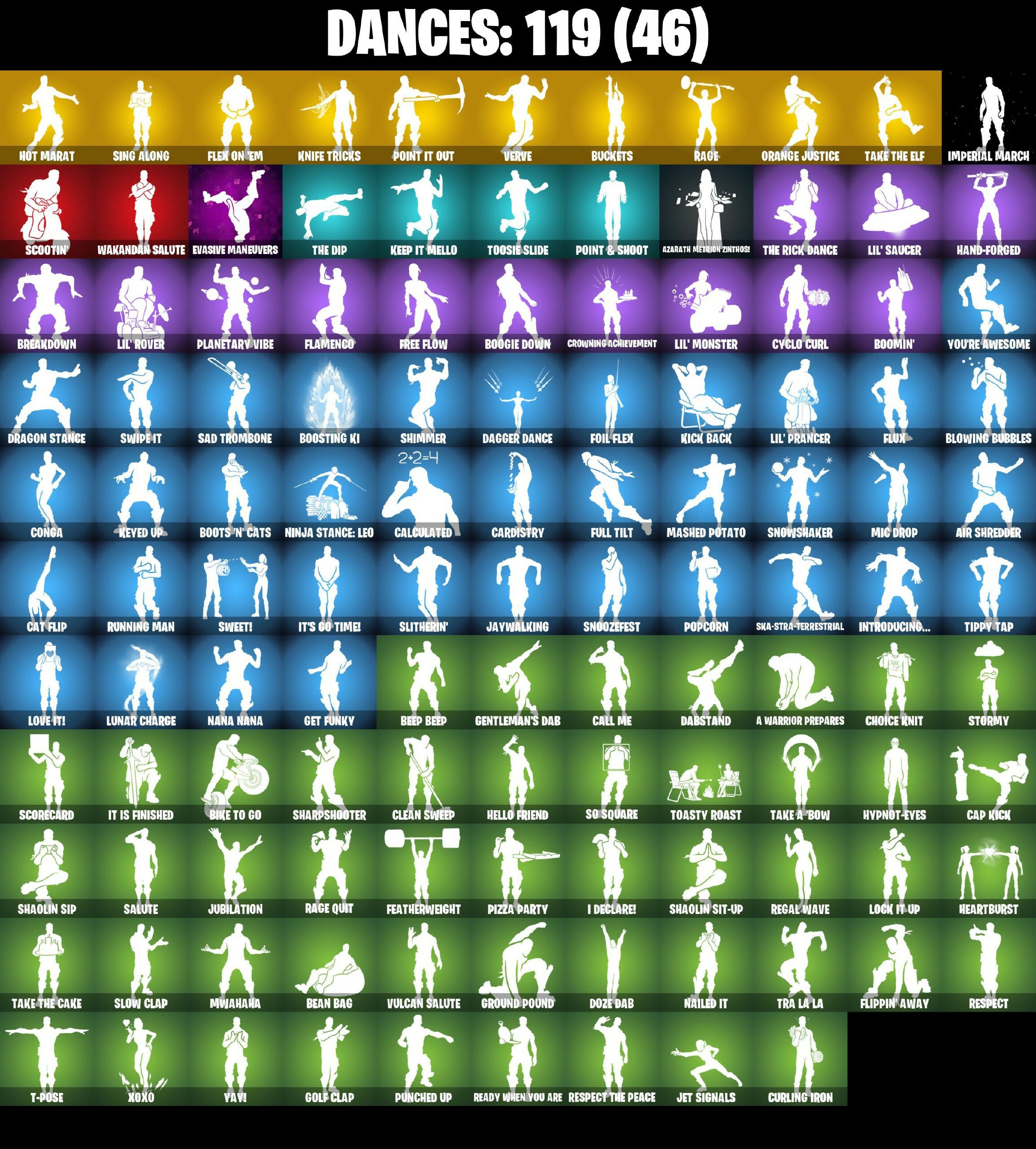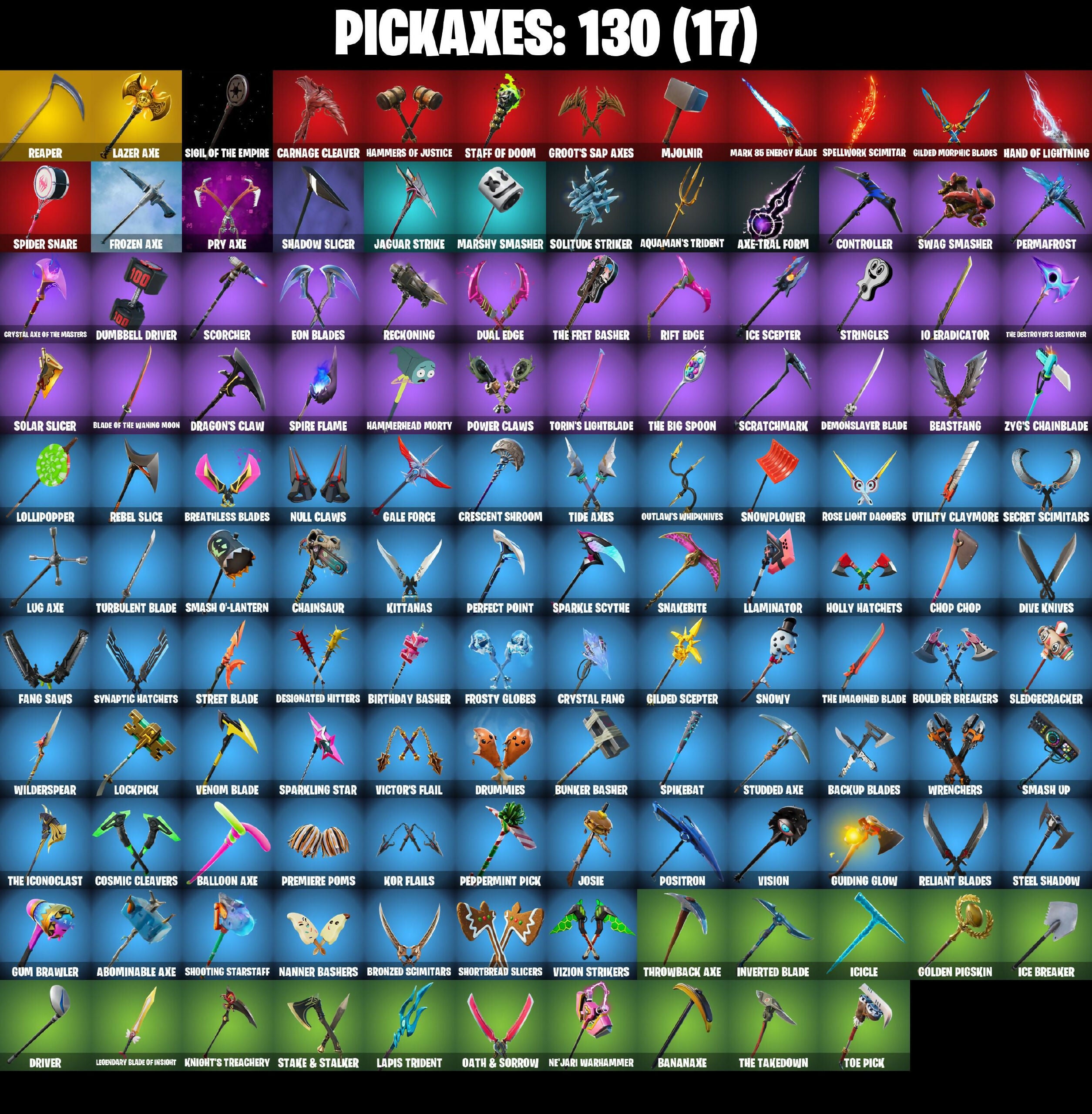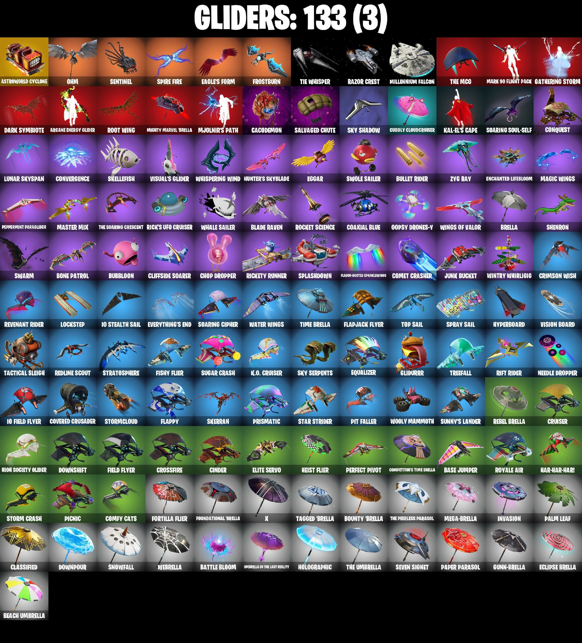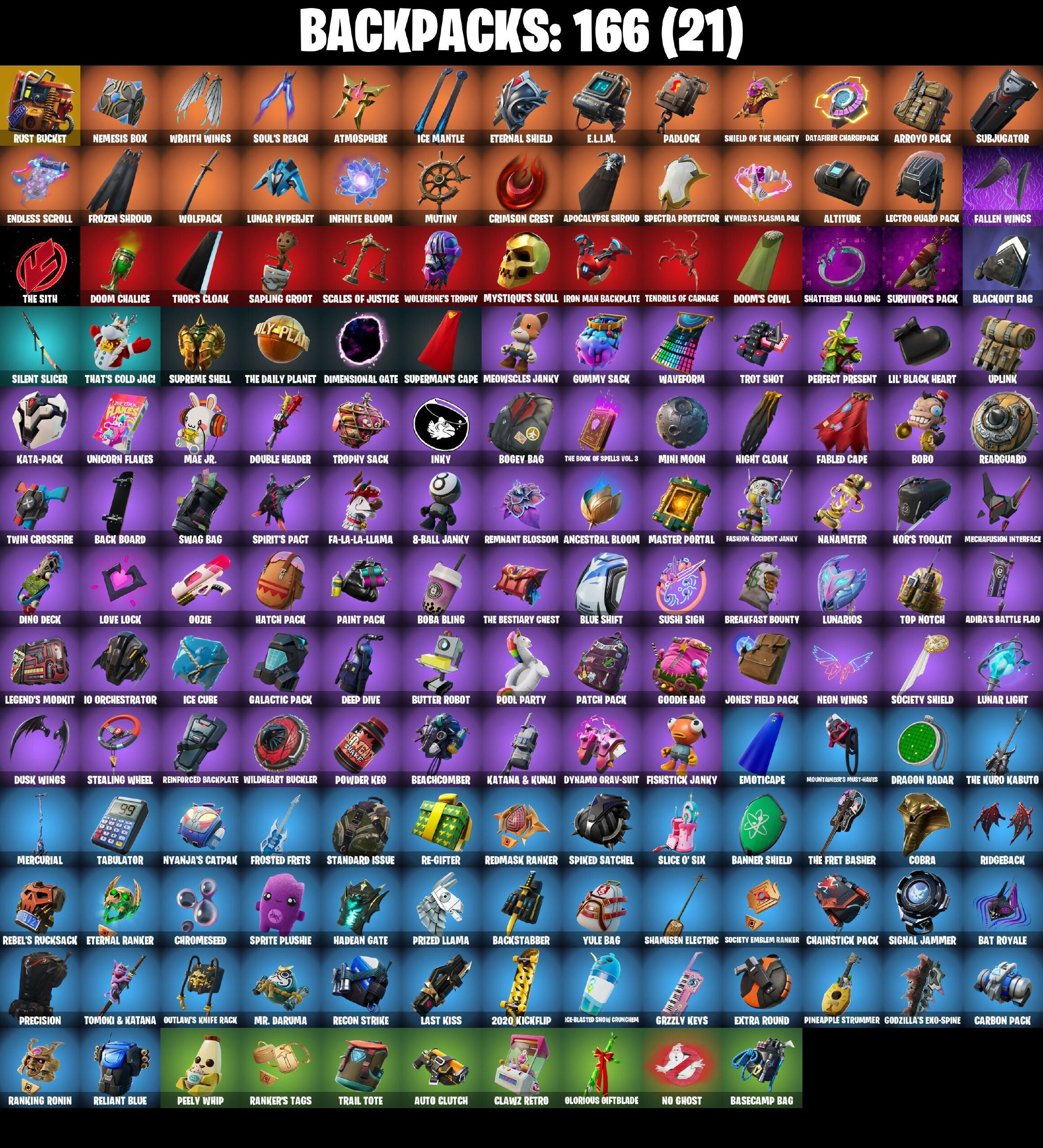 10 Field Flyer, 10 Orchestrator, 10 Stealth Sail, 2020 Kickflip, 8-Ball Janky, A Warrior Prepares, A.I.M., Abominable Axe, Adira's Battle Flag, Agent Jones, Agent Jones (Jump 31), Air Shredder, Altitude, Ancestral Bloom, Apocalypse Shroud, Aquaman, Aquaman's Trident, Arcane Energy Glider, Arctic Adeline, Armadillo, Arroyo Pack, Arthur Curry, Astroworld Cyclone, Atmosphere, Aura, Auto Clutch, Axe-Tral Form, Azarath Metrion Zinthos!, Back Board, Backstabber, Backup Blades, Balloon Axe, Bananaxe, Banner Shield, Base Jumper, Basecamp Bag, Bat Royale, Battle Bloom, Battle Bus Balloon, Battlehawk, Beach Umbrella, Beachcomber, Bean Bag, Beastfang, Beep Beep, Bike To Go, Birdie, Birthday Basher, Black Werewolf, Blackheart, Blackout Bag, Blade Raven, Blade of the Waning Moon, Blizzabelle, Blizzard Bomber, Blowing Bubbles, Blue Shift, Blue Striker, Boba Bling, Bobo, Bogey Bag, Bone Patrol, Boogie Down, Boomin', Boosting Ki, Boots 'N' Cats, Boulder Breakers, Bounty 'Brella, Breakdown, Breakfast Bounty, Breakpoint, Breathless Blades, Brella, Brite Bomber, Bronzed Scimitars, Bubbloon, Buckets, Bullet Rider, Bunker Basher, Butter Robot, Cacodemon, Calamity, Calculated, Call Me, Cap Kick, Carbide, Carbon Commando, Carbon Pack, Cardistry, Carnage, Carnage Cleaver, Castaway Jonesy, Cat Flip, Catalyst, Chainsawr, Chainstick Pack, Challenger Menace - Flame, Charlotte, Choice Knit, Chop Chop, Chop Dropper, Chromeseed, Cinder, Circuit Breaker, Clark Kent, Classified, Clawz Retro, Clean Sweep, Cliffside Soarer, Cluck, Cluck (Slurpy), Coaxial Blue, Cobalt, Cobra, Comet Crasher, Comfy Cats, Competitor's Time Brella, Conga, Conquest, Controller, Convergence, Cosmic Cleavers, Covered Crusader, Crescent Shroom, Crimson Crest, Crimson Wish, Crossfire, Crowning Achievement, Cruiser, Crystal, Crystal Axe of the Masters, Crystal Fang, Cuddly Cloudcruiser, Curling Iron, Cyclo Curl, DJ Yonder, Dabstand, Dagger Dance, Dark Symbiote, Datafiber Chargepack, Dazzle, Deep Dive, Demonslayer Blade, Designated Hitters, Dimensional Gate, Dino Deck, Dire, Dive Knives, Dizzie, Doctor Doom, Doctor Slone, Doom Chalice, Doom's Cowl, Double Header, Downpour, Downshift, Doze Dab, Dragon Radar, Dragon Stance, Dragon's Claw, Drift, Driver, Droopy, Drummies, Dual Edge, Dumbbell Driver, Dusk, Dusk Wings, Dynamo, Dynamo Grav-Suit, E.L.I.M., Eagle's Form, Eclipse Brella, Eggar, Elite Servo, Ember, Emoticape, Enchanted Lifebloom, Endless Scroll, Enforcer, Eon Blades, Equalizer, Eternal Knight, Eternal Ranker, Eternal Shield, Evasive Maneuvers, Everything's End, Extra Round, Fa-La-La-Llama, Fabio Sparklemane, Fable, Fabled Cape, Fade, Fallen Love Ranger, Fallen Wings, Fang Saws, Fashion Accident Janky, Featherweight, Field Flyer, Finesse Finisher, Firewalker, Fishstick Janky, Fishy Flier, Flamenco, Flapjack Flyer, Flappy, Flavor-Dusted Sparklinging, Flex On 'Em, Flippin' Away, Flux, Foil Flex, Fortilla Flier, Foundational 'Brella, Free Flow, Frostburn, Frosted Frets, Frosty Globes, Frozen Axe, Frozen Shroud, Full Tilt, Galactic Pack, Gale Force, Gathering Storm, Gentleman's Dab, Get Funky, Giddy-Up, Gilded Morphic Blades, Gilded Scepter, Glidurrr, Glorious Giftblade, God Emperor Doom, Godzilla's Exo-Spine, Gold, Golden Pigskin, Golf Clap, Goodie Bag, Grill Sergeant, Groot, Groot's Sap Axes, Ground Pound, Grzzly Keys, Guff Gringle, Guggimon, Guiding Glow, Gum Brawler, Gumbo, Gummy Sack, Gunn-Brella, Hadean Gate, Hammerhead Morty, Hammers of Justice, Hand of Lightning, Hand-Forged, Happy Kit, Har-Har-Har!, Harlowe, Hatch Pack, Haven, Haze, Heartburst, Heist Flier, Hello Friend, High Society Glider, Holiday Boxy, Holly Hatchets, Holographic, Hoodie, Hot Marat, Hunter's Skyblade, Huntress, Hybrid, Hyperboard, Hypnot-Eyes, I Declare!, IO Eradicator, Ice Breaker, Ice Cube, Ice Mantle, Ice Scepter, Ice-Blasted Snow Crunchm, Icicle, Imperial March, Infinite Bloom, Inky, Introducing..., Invasion, Inverted Blade, Iron Man Backplate, Isabelle, It Is Finished, It's Go Time!, J.B. Chimpanski, Jaguar Strike, Jaywalking, Jennifer Walters, Jet Signals, Joey, Jones' Field Pack, Josie, Jubilation, Jules, Junk Bucket, K.O. Cruiser, Kal-El's Cape, Kata-Pack, Katana & Kunai, Keep It Mello, Kenji, Keyed Up, Kick Back, Kit, Kittanas, Knife Tricks, Knight's Treachery, Kondor, Kor, Kor Flails, Kor's Toolkit, Krisabelle, Kymera, Kymera's Plasma Pak, Laguna, Lapis Trident, Lara Croft, Last Kiss, Lazer Axe, Lectro Guard Pack, Legend's Modkit, Legendary Blade of Insight, Lexa, Lil' Black Heart, Lil' Monster, Lil' Prancer, Lil' Rover, Lil' Saucer, Liteshow, Llaminator, Lock It Up, Lockpick, Lockstep, Log Axe, Lollipopper, Love It!, Love Lock, Lt. Evergreen, Lt. John Llama, Luminos, Lunar Charge, Lunar Hyperjet, Lunar Light, Lunar Skyspan, Lunarios, Lynx, Mae Jr., Magic Wings, Mancake, Mandalorian, Mark 85 Energy Blade, Mark 90 Flight Pack, Marshy Smasher, Mashed Potato, Masked Scuba Jonesy, Master Mix, Master Portal, Mave, Maximum Carnage, Mechafusion Interface, Mega-Brella, Menace, Meowscles Janky, Mercurial, Mic Drop, Mighty Marvel 'Brella, Millennium Falcon, Mini Moon, Mjolnir, Mjolnir's Path, Mountaineer's Must-Haves, Mr. Daruma, Mutiny, Mwahaha, Mystique, Mystiques Skull, Nailed It, Nana Nana, Nanameter, Nanner Bashers, Ne'Jari Warhammer, Needle Dropper, Nemesis Box, Neon Wings, Neymar Jr, Night Cloak, Nightshade, Ninja Stance: Leo, No Ghost, Null Claws, Nyanja's Catpak, Oath & Sorrow, Ocean, Off, Ohm, On, Onesie, Oopsy Drones-V, Oozie, Orange Justice, Outlaw's Knife Rack, Outlaw's Whipknives, Padlock, Paint Pack, Palm Leaf, Paper Parasol, Patch Pack, Peely, Peely Whip, Peppermint Paraglider, Peppermint Pick, Perfect Pivot, Perfect Point, Perfect Present, Permafrost, Picnic, Pineapple Strummer, Pit Faller, Pizza Party, Planetary Vibe, Point & Shoot, Point It Out, Point Patroller, Polar Peely, Pool Party, Popcorn, Positron, Powder, Powder Keg, Power Claws, Precision, Predator, Premiere Poms, Prismatic, Prized Llama, Prodigy, Pry Axe, Punched Up, Rage, Rage Quit, Ragnaro