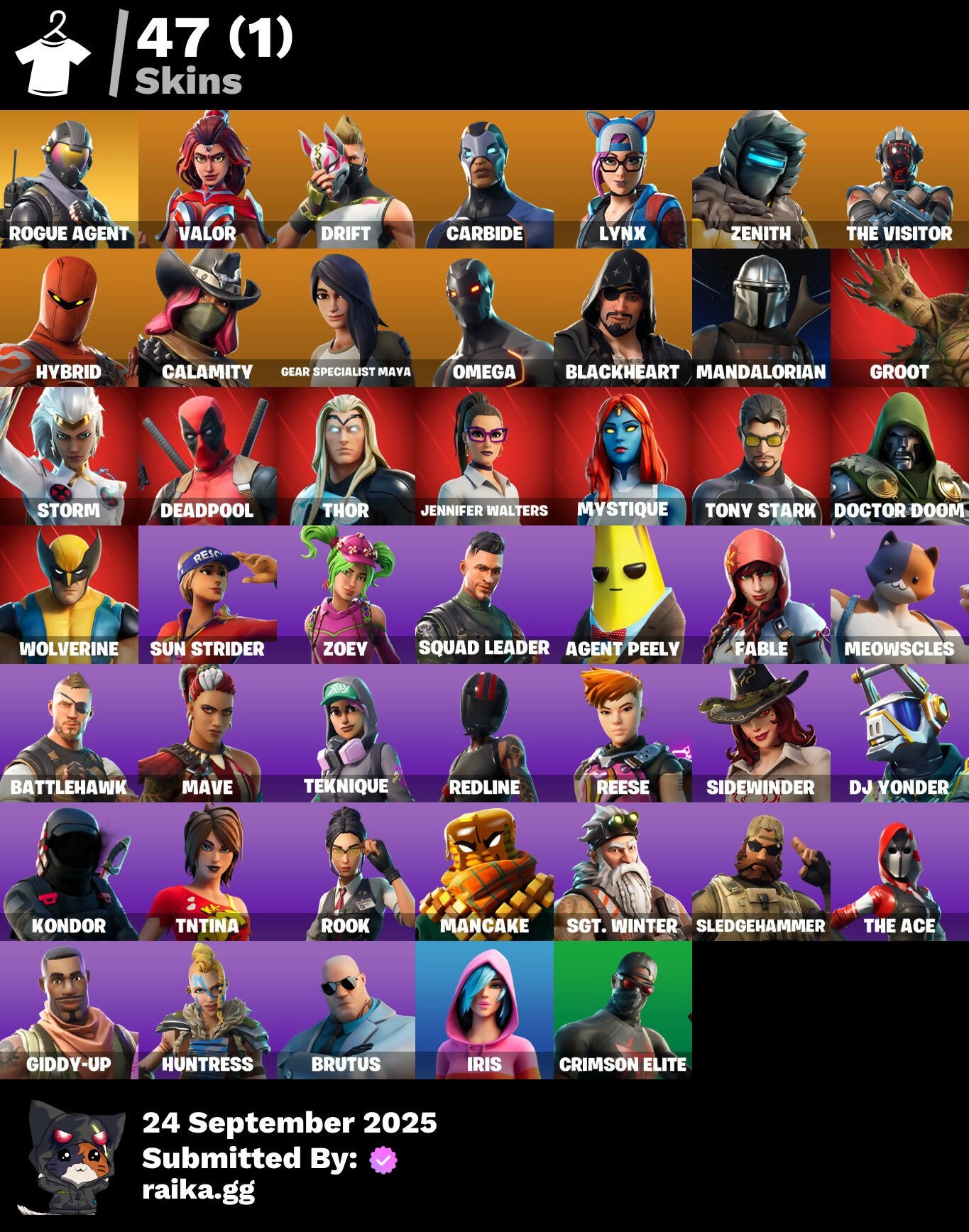 [PC/PSN/XBOX] 47 skins | Rogue Agent | Valor | Drift | Carbide | Lynx | Zenith | The Visitor | Hybrid | Calamity | Gear Specialist Maya | Omega | Blackheart | 500 VB / FN