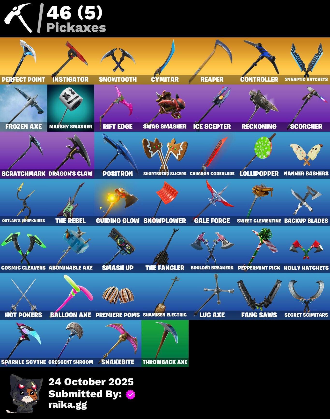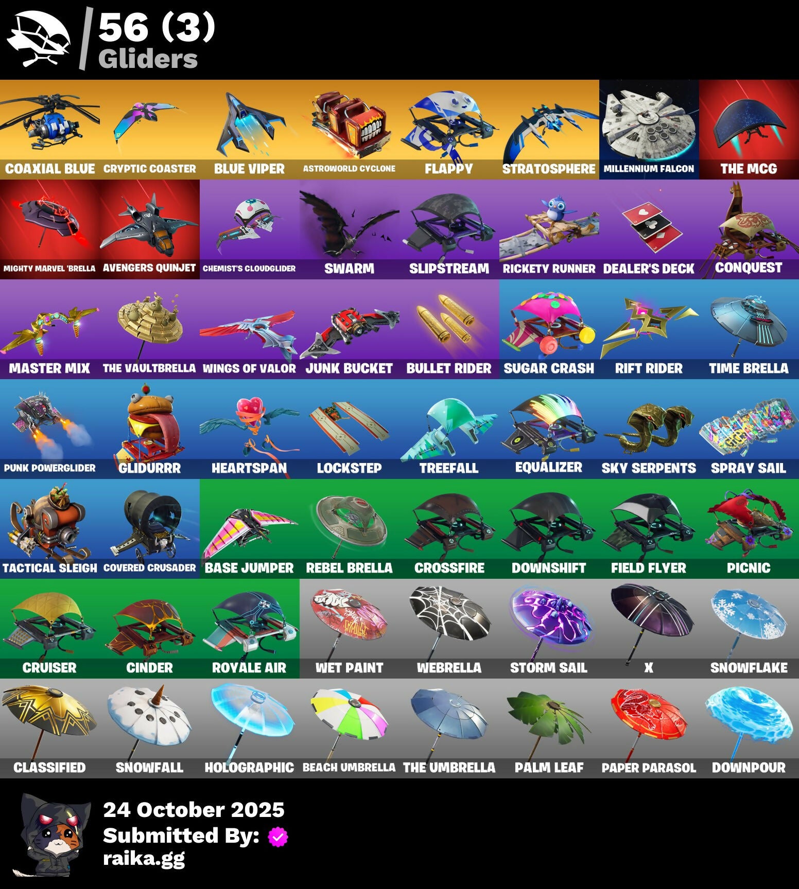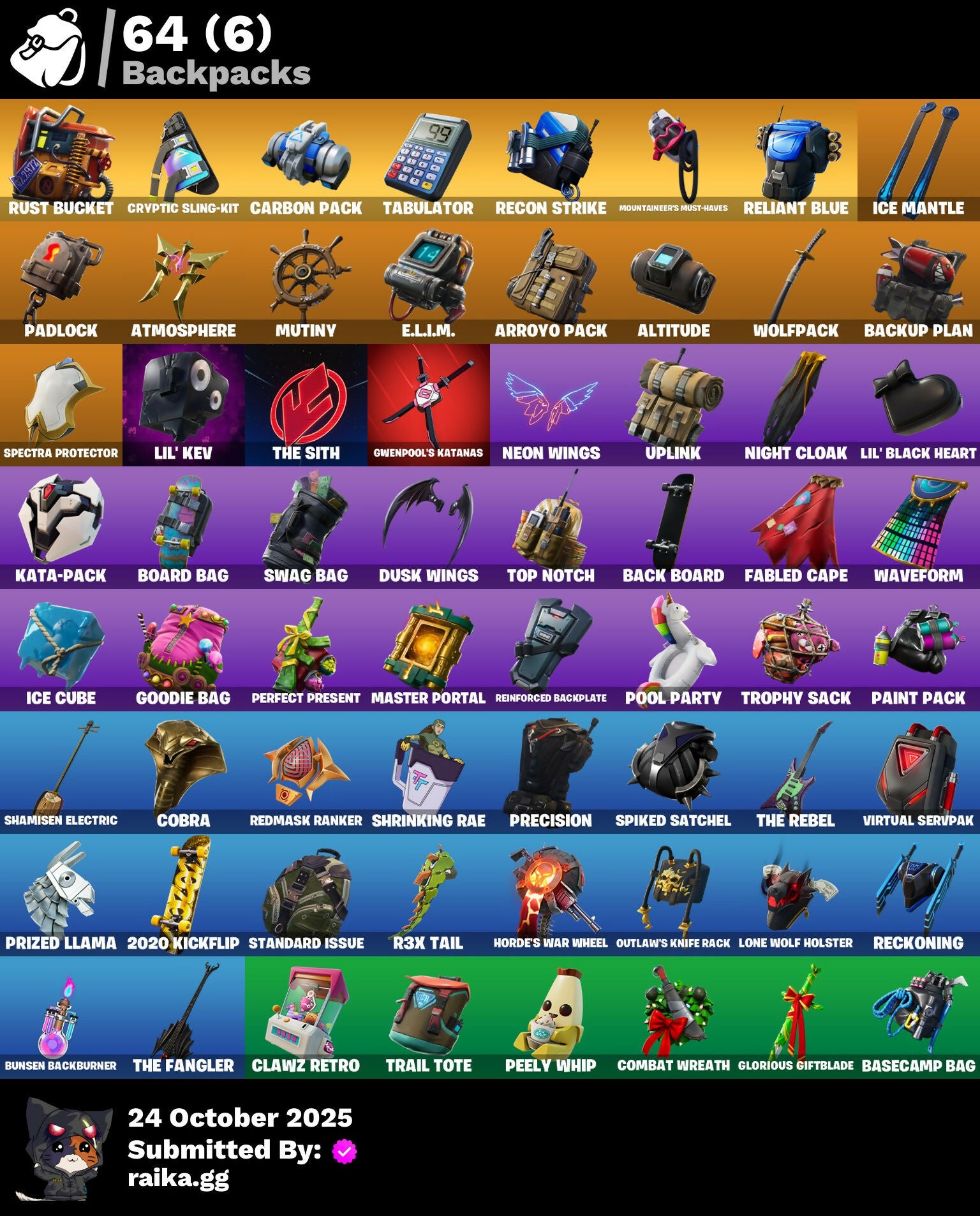 2020 Kickflip, 8-Ball, A.I.M., A.L.T.E.R., Abominable Axe, Abstract, Altitude, Arctic Camo, Arrow, Arroyo Pack, Astro Jack, Astroworld Cyclone, Atmosphere, Avengers, Avengers Logo, Avengers Quinjet, Axo's Big Moment, Back Board, Backup Blades, Backup Plan, Bag Of Coal, Baited, Balloon Axe, Bananas, Banner, Banner Icon, Base Jumper, Basecamp Bag, Bat, Batman, Battle Bus, Battle Bus Balloon, Battlehawk, Beach Umbrella, Black Werewolf, Blackheart, Blizzard Bomber, Blowing Bubbles, Blue Metallic, Blue Viper, Board Bag, Bombastic Winterfest, Boogeyman, Boogie, Boogie Down, Boulder Breakers, Brood, Bullet Rider, Bunsen Backburner, Butterfly, Cactus Maze, Calamity, Calculated, Call Me, Campfire, Captain America's Shield, Carbide, Carbon & Gold, Carbon Commando, Carbon Fiber, Carbon Pack, Cash Grab, Cat Flip, Catalyst, Chains, Chalk Outline, Charlotte's Logo, Chemist's Cloudglider, Choice Knit, Chromatic, Cinder, Circle, Classified, Clawz Retro, Coaxial Blue, Cobalt, Cobalt Overdrive, Cobra, Coconuts, Combat Wreath, Comet, Conga, Conquest, Controller, Cosmic Cleavers, Covered Crusader, Crazy Castle, Crescent Shroom, Crimson Codeblade, Crossfire, Cruiser, Cryptic Coaster, Cryptic Sling-Kit, Cube, Cuddle Hearts, Cuddle Team Hula, Cymitar, D.C. 63, DJ Yonder, Dabstand, Dance Mat, Dealer's Deck, Dice, Dinosaur, Dire, Do It!, Dog Bowl, Dolphin, Downpour, Downshift, Dragon Stance, Dragon's Claw, Drift, Driftwood, Duck, Durrr, Durrr Burger, Dusk, Dusk Wings, E.G.O., E.L.I.M., Emote Camo, Eq, Equalizer, Eye Of Agamotto, Fable, Fabled Cape, Falling Leaf, Fang Saws, Fence, Festive Paper, Field Flyer, Fire V Ice, Fish Hook, Fixer, Flamenco, Flappy, Floating Island, Flowy Hat, Fly, Fox Clan Mask, Free Flow, Frosted, Frostwing, Frozen Axe, Fryangles, Full Tilt, G.O.A.T., GG Ornament, GG Potion, GG Smiley, GG Snakes, GG Snowman, Gale Force, Game Over, Gameface, Gentleman's Dab, Get Funky, Giddy-Up, Glidurr, Glorious Giftblade, Glow, Gold, Golden Wolf, Golf Clap, Good Vibes, Goodie Bag, Gremlins, Grid, Grumpy Tree, Guiding Glow, Gwenpool's Katanas, Gwetterman Jacket, Ham, Hand Horns, Have A Seat, Havoc, Hearts, Heartspan, Hello Friend, Hero Emblem, Holly Hatchets, Holographic, Hoodie, Hope's Look, Horde's War Wheel, Hot Pokers, Howl, Huntress, Hybrid, Hybrid Egg, I Declare!, Ice Cube, Ice Mantle, Ice Scepter, Indigo Ice, Infinity Blade, Instigator, Introducing..., It's Go Time!, Jaywalking, Jellyfish, Jolly Roger, Jubilation, Junk Bucket, Kata-Pack, Keep It Mello, Kevin, Kevin Runes, King's Wrath, Knight's Honor, Knighted, L, Lil' Black Heart, Lil' Kev, Llama De Muertos, Llamacorn, Lobby Classic, Lockstep, Lollipoppor, Lone Wolf Holster, Looted, Love Ranger, Lucha GG, Lug Axe, Lynx, Manhole Cover, Marshy Smasher, Master Mix, Master Portal, Mecha Wrecks, Mello Made It Right, Melting Snowman, Meow Moon, Mermaid, Merry Marauder, Mic Drop, Mighty Marvel 'Brella, Millennium Falcon, Moisty Mire, Monks, Moth, Mutiny, Nanner Bashers, Neon Cat, Neon Wings, Night Cloak, Nightshade, Octopus, Onesie, Oni, Only 90's Kids, Orange Justice, Outlaw's Knife Rack, Outlaw's Whipknives, Padlock, Paint Pack, Palm Leaf, Paper Parasol, Paper Plane, Party Beats, Peeled, Peely, Peely Whip, Peppermint Pick, Perfect Point, Perfect Present, Phantom, Phone It In, Pickaxe, Picnic, Piercing Ace, Pigskin, Pineapple, Pixel Ramirez, Pixel Raven, Pixels Royale, Play To Win, Point It Out, Point Patrol, Point Patroller, Polar Peely, Polka Dots, Pool Party, Popcorn, Porthole, Positron, Powder, Precision, Premiere Poms, Prized Llama, Prodigy, Psycho, Punk Powerglider, R3X Tail, Rainbow, Reaper, Rebel Brella, Reboot'd, Reckoning, Recon Strike, Redline, Redmask Ranker, Regal Wave, Reinforced Backplate, Reliant Blue, Respect, Respect The Peace, Retro Llama, Revolt, Rickety Runner, Rift, Rift Edge, Rift Rider, Risky Reels, Rock Love, Rocket, Rose, Royal Stroll, Royale Air, Running Man, Rust Bucket, Rust Lord, Salt, Salute, Scavenger, Scorcher, Scratchmark, Secret Scimitars, Sgt. Winter, Shackle, Shades, Shadow Boxer, Shaka, Shamisen Electric, Sharpshooter, Shimmer, Shinji, Shopping Cart, Shortbread Slicers, Shrinking Rae, Sidewinder, Sing Along, Sith, Skeleton Key, Skull Trooper, Sky Serpents, Slam Dunk, Slipstream, Slitherin', Smash Up, Snakebite, Snap, Snoozefest, Snow Clan Shuriken, Snowfall, Snowflake, Snowplower, Snowshaker, Snowsuited, Snowtooth, Sparkle Scythe, Sparkle Specialist, Spectra Protector, Spectrakinetic, Spiderweb, Spiked Satchel, Spray Can, Spray Sail, Spreading Chaos, Square Up, Stacked!, Stage, Standard Issue, Stay Smooth, Storm Sail, Strange Concoction, Stratosphere, Strawberry Paws, Stride, Sub Commander, Subzero Cryptic, Sugar Crash, Sultura, Summit Striker, Sun, Sunprint, Sushi, Swag Bag, Swag Smasher, Swarm, Sweet Clementine, Synaptic Hatchets, Tabulator, Tactical Sleigh, Take The Elf, Tartan, Teeth, Teknique, The Ace, The Brood, The Crack, The Fangler, The Ice King, The Mcg, The Prisoner, The Rebel, The Sith, The Storms, The Umbrella, The Vaultbrella, This Many, Throwback Axe, Tic-Tac-Toe, Tilted Map, Tilted Teknique, Time Brella, Timer, Top Notch, Tra La La, Trail Tote, Trash Can, Treasure Chest, Treefall, Tribal, Trilogy, Trog, Trog Drawings, Trophy Sack, Tropical Camo, Tsuki 2.0, Twinkly, Ultra Red, Uplink, Valentine, Victory Brawl, Viking Ship, Virtual Servpak, Voyager, Wallcrawler, Wave, Waveform, Webrella, Well Wrapped, Wet Paint, White, Wings Of Valor, Winter, Wolfpack, Wooly, Woot Bonesy, Work It, Wreath, X, X Mark, X-4 Stormwing, X-Lord, Yay!, Yond3r, You're Awesome, Zenith, Zig-Zag, Ziggurat, Zoey