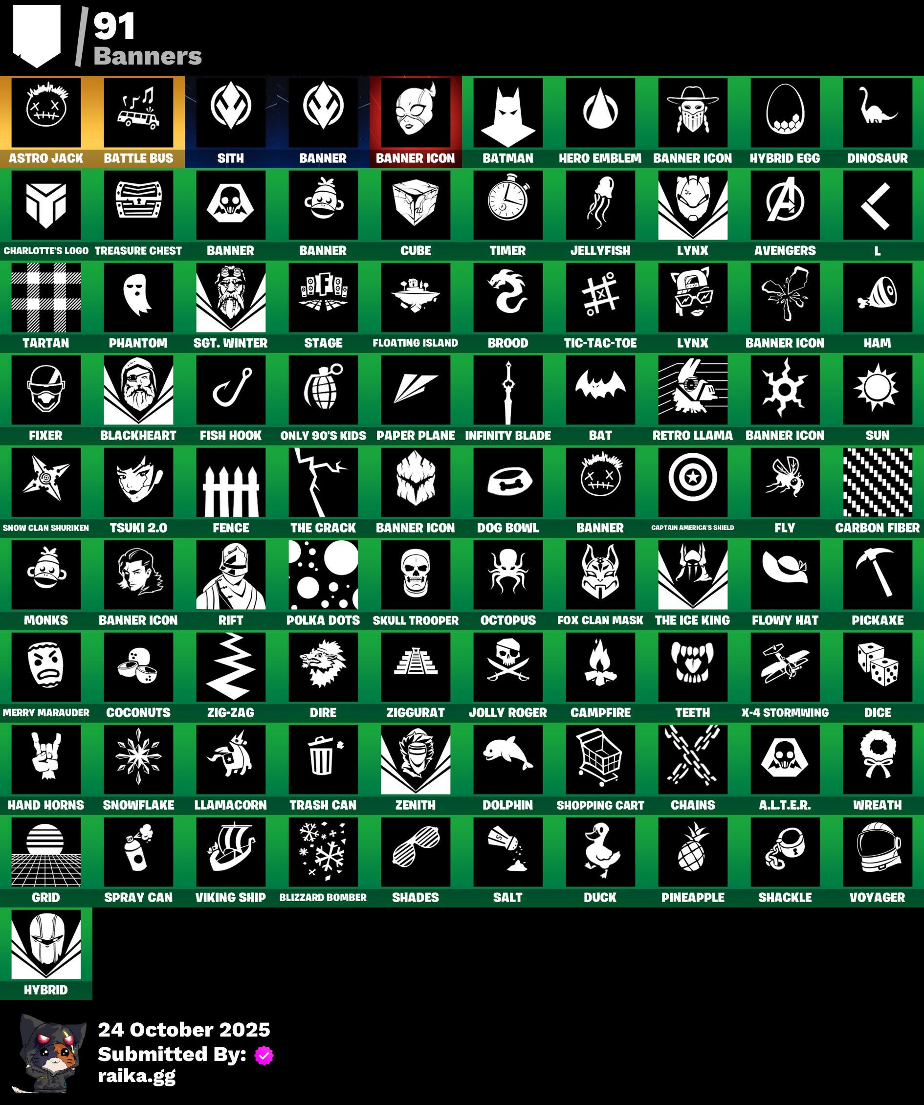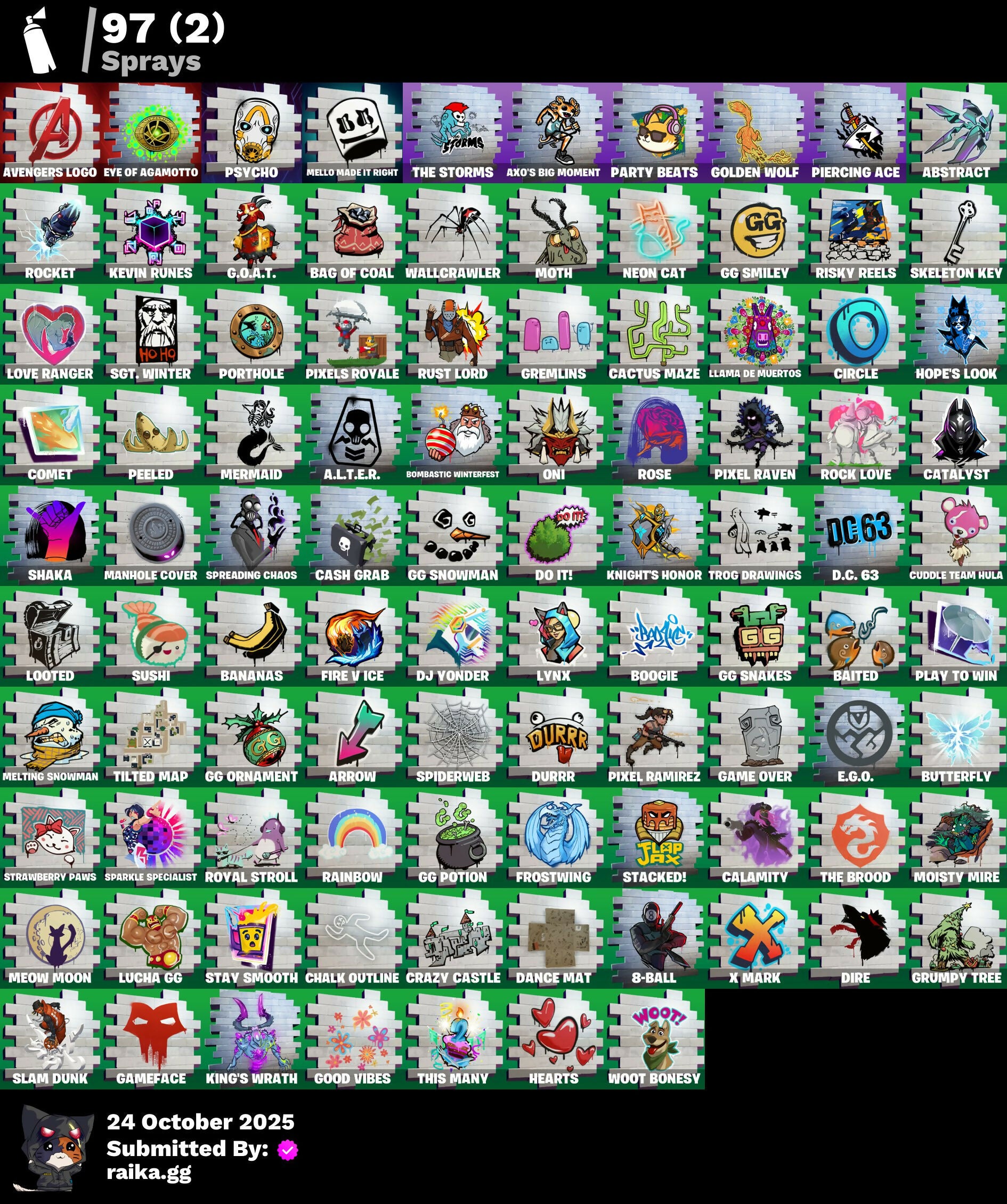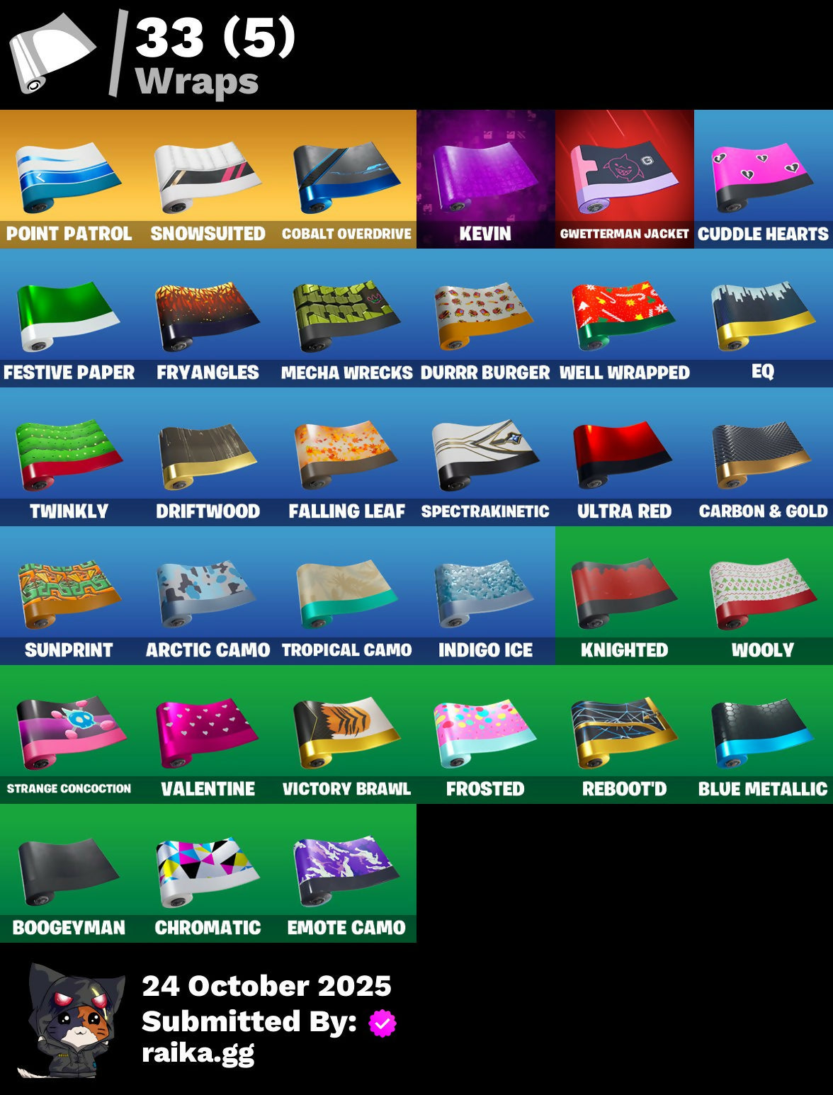 2020 Kickflip, 8-Ball, A.I.M., A.L.T.E.R., Abominable Axe, Abstract, Altitude, Arctic Camo, Arrow, Arroyo Pack, Astro Jack, Astroworld Cyclone, Atmosphere, Avengers, Avengers Logo, Avengers Quinjet, Axo's Big Moment, Back Board, Backup Blades, Backup Plan, Bag Of Coal, Baited, Balloon Axe, Bananas, Banner, Banner Icon, Base Jumper, Basecamp Bag, Bat, Batman, Battle Bus, Battle Bus Balloon, Battlehawk, Beach Umbrella, Black Werewolf, Blackheart, Blizzard Bomber, Blowing Bubbles, Blue Metallic, Blue Viper, Board Bag, Bombastic Winterfest, Boogeyman, Boogie, Boogie Down, Boulder Breakers, Brood, Bullet Rider, Bunsen Backburner, Butterfly, Cactus Maze, Calamity, Calculated, Call Me, Campfire, Captain America's Shield, Carbide, Carbon & Gold, Carbon Commando, Carbon Fiber, Carbon Pack, Cash Grab, Cat Flip, Catalyst, Chains, Chalk Outline, Charlotte's Logo, Chemist's Cloudglider, Choice Knit, Chromatic, Cinder, Circle, Classified, Clawz Retro, Coaxial Blue, Cobalt, Cobalt Overdrive, Cobra, Coconuts, Combat Wreath, Comet, Conga, Conquest, Controller, Cosmic Cleavers, Covered Crusader, Crazy Castle, Crescent Shroom, Crimson Codeblade, Crossfire, Cruiser, Cryptic Coaster, Cryptic Sling-Kit, Cube, Cuddle Hearts, Cuddle Team Hula, Cymitar, D.C. 63, DJ Yonder, Dabstand, Dance Mat, Dealer's Deck, Dice, Dinosaur, Dire, Do It!, Dog Bowl, Dolphin, Downpour, Downshift, Dragon Stance, Dragon's Claw, Drift, Driftwood, Duck, Durrr, Durrr Burger, Dusk, Dusk Wings, E.G.O., E.L.I.M., Emote Camo, Eq, Equalizer, Eye Of Agamotto, Fable, Fabled Cape, Falling Leaf, Fang Saws, Fence, Festive Paper, Field Flyer, Fire V Ice, Fish Hook, Fixer, Flamenco, Flappy, Floating Island, Flowy Hat, Fly, Fox Clan Mask, Free Flow, Frosted, Frostwing, Frozen Axe, Fryangles, Full Tilt, G.O.A.T., GG Ornament, GG Potion, GG Smiley, GG Snakes, GG Snowman, Gale Force, Game Over, Gameface, Gentleman's Dab, Get Funky, Giddy-Up, Glidurr, Glorious Giftblade, Glow, Gold, Golden Wolf, Golf Clap, Good Vibes, Goodie Bag, Gremlins, Grid, Grumpy Tree, Guiding Glow, Gwenpool's Katanas, Gwetterman Jacket, Ham, Hand Horns, Have A Seat, Havoc, Hearts, Heartspan, Hello Friend, Hero Emblem, Holly Hatchets, Holographic, Hoodie, Hope's Look, Horde's War Wheel, Hot Pokers, Howl, Huntress, Hybrid, Hybrid Egg, I Declare!, Ice Cube, Ice Mantle, Ice Scepter, Indigo Ice, Infinity Blade, Instigator, Introducing..., It's Go Time!, Jaywalking, Jellyfish, Jolly Roger, Jubilation, Junk Bucket, Kata-Pack, Keep It Mello, Kevin, Kevin Runes, King's Wrath, Knight's Honor, Knighted, L, Lil' Black Heart, Lil' Kev, Llama De Muertos, Llamacorn, Lobby Classic, Lockstep, Lollipoppor, Lone Wolf Holster, Looted, Love Ranger, Lucha GG, Lug Axe, Lynx, Manhole Cover, Marshy Smasher, Master Mix, Master Portal, Mecha Wrecks, Mello Made It Right, Melting Snowman, Meow Moon, Mermaid, Merry Marauder, Mic Drop, Mighty Marvel 'Brella, Millennium Falcon, Moisty Mire, Monks, Moth, Mutiny, Nanner Bashers, Neon Cat, Neon Wings, Night Cloak, Nightshade, Octopus, Onesie, Oni, Only 90's Kids, Orange Justice, Outlaw's Knife Rack, Outlaw's Whipknives, Padlock, Paint Pack, Palm Leaf, Paper Parasol, Paper Plane, Party Beats, Peeled, Peely, Peely Whip, Peppermint Pick, Perfect Point, Perfect Present, Phantom, Phone It In, Pickaxe, Picnic, Piercing Ace, Pigskin, Pineapple, Pixel Ramirez, Pixel Raven, Pixels Royale, Play To Win, Point It Out, Point Patrol, Point Patroller, Polar Peely, Polka Dots, Pool Party, Popcorn, Porthole, Positron, Powder, Precision, Premiere Poms, Prized Llama, Prodigy, Psycho, Punk Powerglider, R3X Tail, Rainbow, Reaper, Rebel Brella, Reboot'd, Reckoning, Recon Strike, Redline, Redmask Ranker, Regal Wave, Reinforced Backplate, Reliant Blue, Respect, Respect The Peace, Retro Llama, Revolt, Rickety Runner, Rift, Rift Edge, Rift Rider, Risky Reels, Rock Love, Rocket, Rose, Royal Stroll, Royale Air, Running Man, Rust Bucket, Rust Lord, Salt, Salute, Scavenger, Scorcher, Scratchmark, Secret Scimitars, Sgt. Winter, Shackle, Shades, Shadow Boxer, Shaka, Shamisen Electric, Sharpshooter, Shimmer, Shinji, Shopping Cart, Shortbread Slicers, Shrinking Rae, Sidewinder, Sing Along, Sith, Skeleton Key, Skull Trooper, Sky Serpents, Slam Dunk, Slipstream, Slitherin', Smash Up, Snakebite, Snap, Snoozefest, Snow Clan Shuriken, Snowfall, Snowflake, Snowplower, Snowshaker, Snowsuited, Snowtooth, Sparkle Scythe, Sparkle Specialist, Spectra Protector, Spectrakinetic, Spiderweb, Spiked Satchel, Spray Can, Spray Sail, Spreading Chaos, Square Up, Stacked!, Stage, Standard Issue, Stay Smooth, Storm Sail, Strange Concoction, Stratosphere, Strawberry Paws, Stride, Sub Commander, Subzero Cryptic, Sugar Crash, Sultura, Summit Striker, Sun, Sunprint, Sushi, Swag Bag, Swag Smasher, Swarm, Sweet Clementine, Synaptic Hatchets, Tabulator, Tactical Sleigh, Take The Elf, Tartan, Teeth, Teknique, The Ace, The Brood, The Crack, The Fangler, The Ice King, The Mcg, The Prisoner, The Rebel, The Sith, The Storms, The Umbrella, The Vaultbrella, This Many, Throwback Axe, Tic-Tac-Toe, Tilted Map, Tilted Teknique, Time Brella, Timer, Top Notch, Tra La La, Trail Tote, Trash Can, Treasure Chest, Treefall, Tribal, Trilogy, Trog, Trog Drawings, Trophy Sack, Tropical Camo, Tsuki 2.0, Twinkly, Ultra Red, Uplink, Valentine, Victory Brawl, Viking Ship, Virtual Servpak, Voyager, Wallcrawler, Wave, Waveform, Webrella, Well Wrapped, Wet Paint, White, Wings Of Valor, Winter, Wolfpack, Wooly, Woot Bonesy, Work It, Wreath, X, X Mark, X-4 Stormwing, X-Lord, Yay!, Yond3r, You're Awesome, Zenith, Zig-Zag, Ziggurat, Zoey