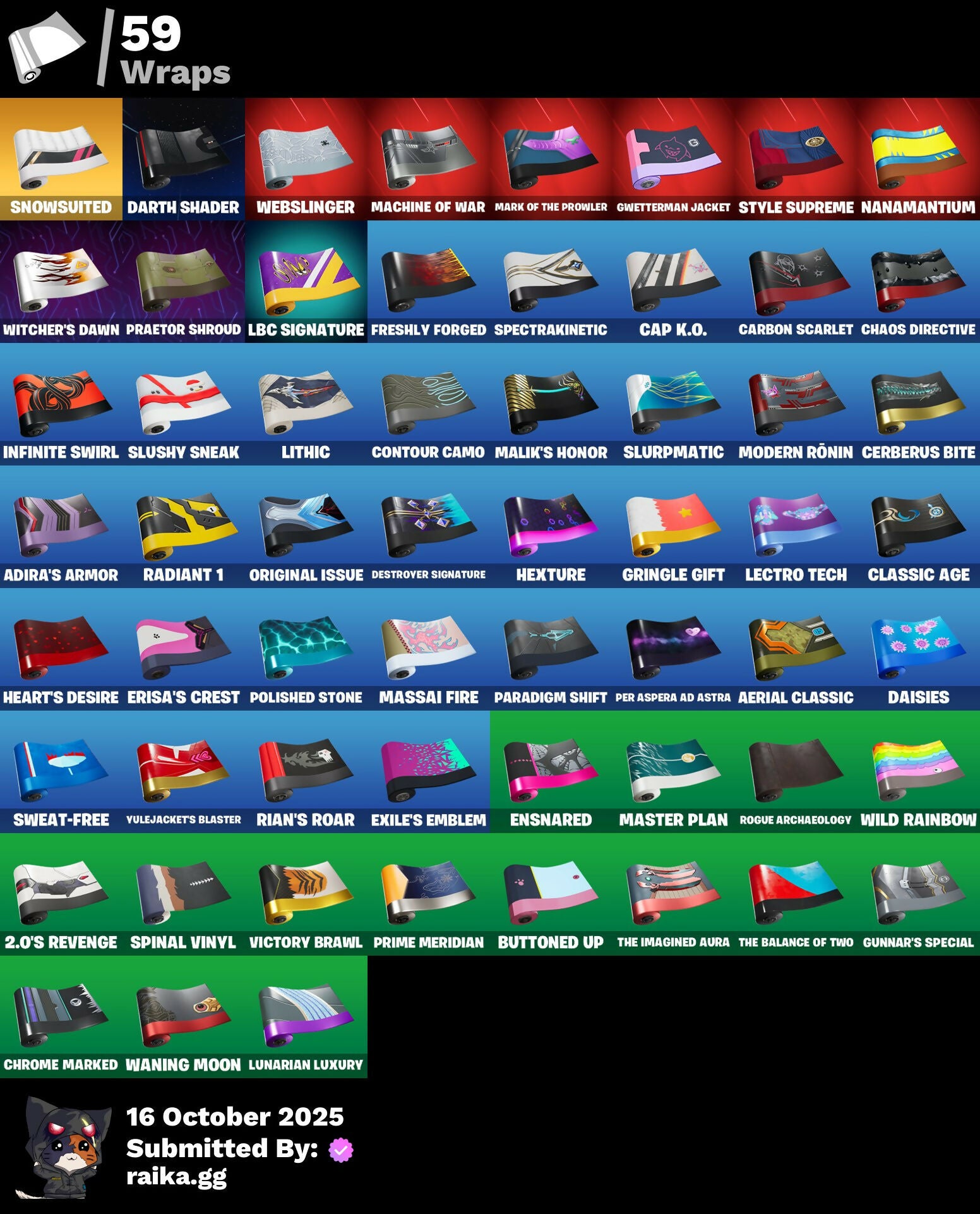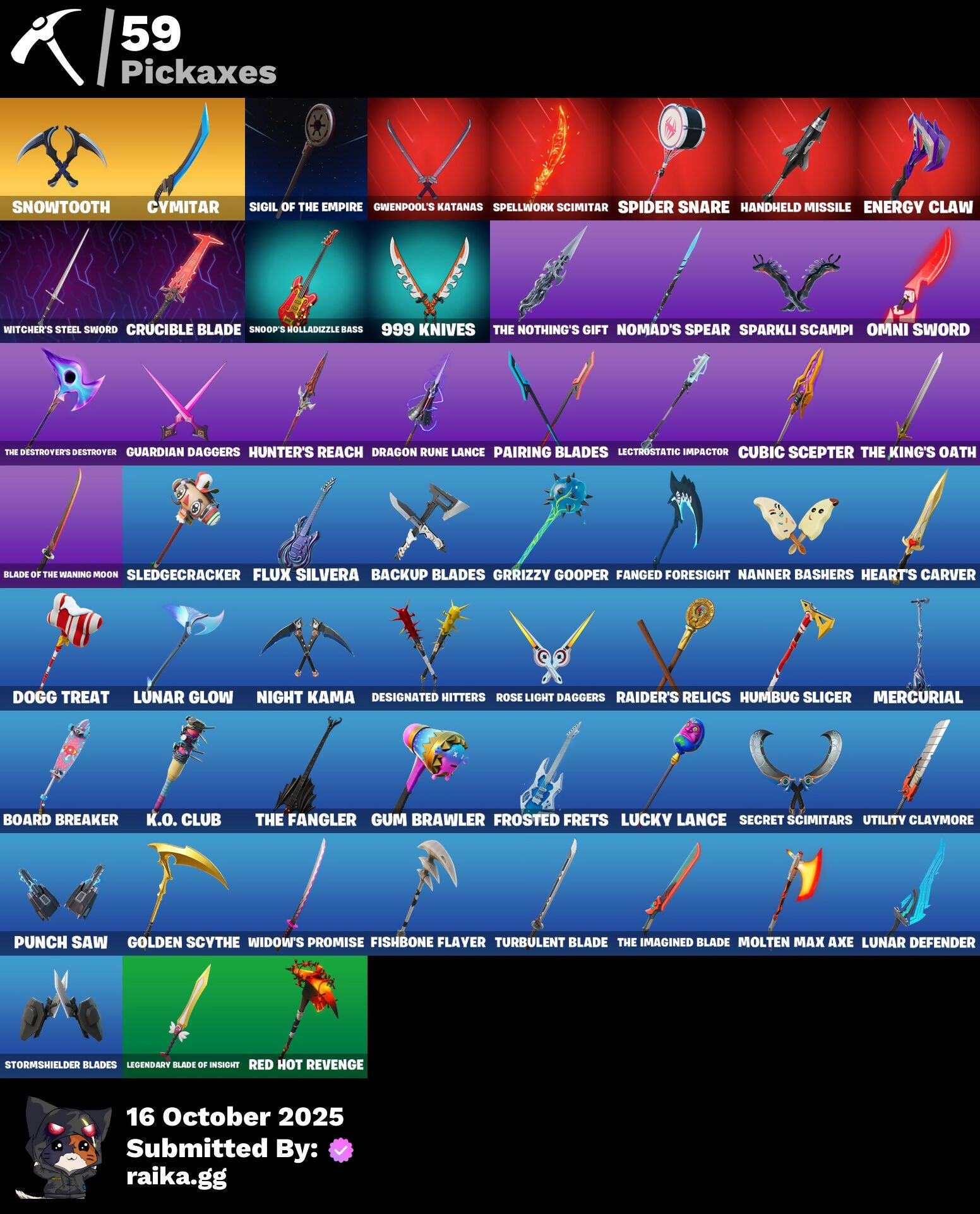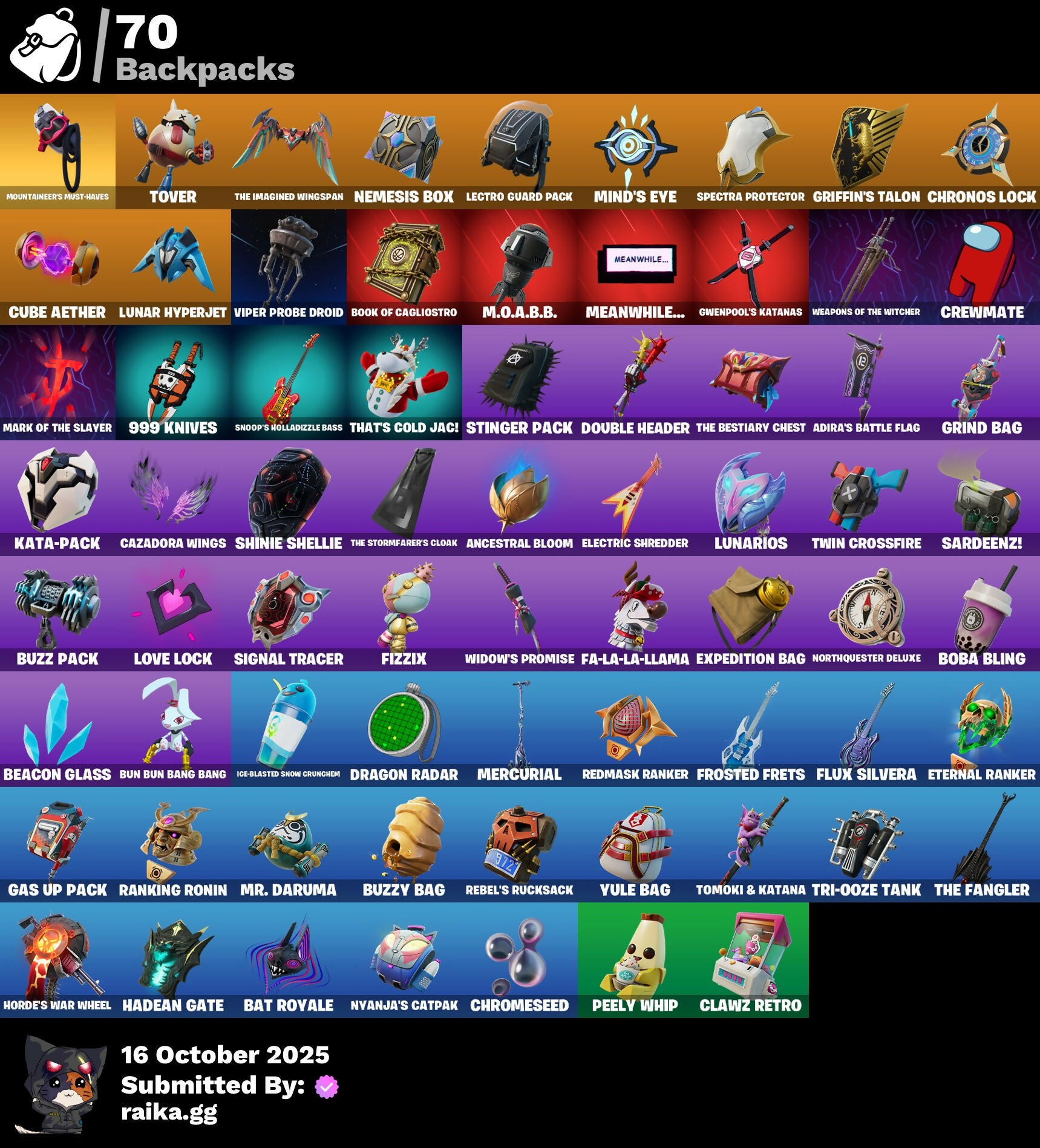 2.0's Revenge, 212th Battalion Trooper, 501st Trooper, 999 Knives, Adira, Adira's Armor, Adira's Battle Flag, Adventure Aerial, Aerial, Aerial Classic, Aerial Swagger, Ancestral Bloom, Arachrobatics, Arctic Adeline, Arm The Pumpkin!, Articulated Blade Wing, Astro Armor, Aurelian, Backup Blades, Balance Board, Banner Icon, Baseball, Bat Royale, Battle Bloom, Battle Mode, Battle Ready Era, Beacon Glass, Big Guns, Black Hole, Blade Of The Waning Moon, Blizzard Bomber, Blowin' Up, Board Breaker, Boba Bling, Book of Cagliostro, Bubbloon, Bun Bun Bang Bang, Bun Bun Blast, Bushranger, Buttoned Up, Buzz Pack, Buzzsaw Breacher, Buzzy Bag, Bytes, Bytes' Sigil, Cacodemon, Cap K.O., Carbon Scarlet, Cazadora Wings, Cerberus Bite, Chain Surfer, Chaos Directive, Chomp Cud!!, Choose Naughty, Chrome Marked, Chrome Punk, Chromebrella, Chromeseed, Chromestruck Fire, Chronos Lock, Classic Age, Clawz Retro, Cliffside Soarer, Combat Elite, Comfy Cats, Conjure Weapon, Contour Camo, Courageous Mikasa, Crashed Chiller, Crewmate, Crowning Achievement, Crucible Blade, Cube Aether, Cubic Scepter, Curling Iron, Cyclo Curl, Cymitar, D.C. 63, Dagger Dance, Daisies, Dark Side Rising, Darth Shader, Darth Vader, Designated Hitters, Destroyer Signature, Dirtbike Challenge, Distraction Dance, Doctor Strange, Dogg Treat, Doom Brella, Doom Slayer, Double Header, Dragon Radar, Dragon Rider, Dragon Rune Lance, Dragon Rune Lances, Dragon Spirit, Dusty, Electric Shredder, Emergency Raft, Energy Claw, Ensnared, Era, Erisa, Erisa Alert, Erisa's Crest, Eternal Ranker, Evie, Exile's Emblem, Expedition Bag, Eye of Agamotto, Fa-La-La-Llama, Fancy Feet, Fanged Foresight, Fiery Descent, Fishbone Flayer, Fizzix, Flip Flyer, Flux Silvera, Follow The Butterfly, Freshly Forged, Frosted Frets, Fusion!, Gas Up Pack, Geared Up, Geralt, Geralt Of Rivia, Get Out Of Your Mind, Golden Scythe, Griffin's Talon, Grind Bag, Gringle Gift, Grriz, Grrizzy Gooper, Grrizzy Gunz, Guardian Daggers, Gum Brawler, Gumbo, Gunn-Brella, Gunnar, Gunnar's Special, Gwen Stacy, Gwen's Spiderchute, Gwen-Step, Gwenpool, Gwenpool's Glee, Gwenpool's Katanas, Gwettermann Jacket, Hadean Gate, Hades Insignia, Hand of Trace, Handheld Missile, Har-Har-Har!, Haven, Heart Sign, Heart's Carver, Heart's Desire, Heartwinder, Hexture, Hop and a Wink, Hope's Look, Horde's War Wheel, Hot Slurp Balloon, Humbug Slicer, Hunter's Reach, Hypnot-Eyes, Ice-Blasted Snow Crunchem, If Looks Could..., Igni Sign, Imagined, Imperial March, In Her Sights, Indiana Jones, Indiana Jones' Hat, Infield Fly, Infinite Swirl, Inflate-A-Roach, It Is Finished, It's... You?, Jet Signals, K.O. Club, K.O. Cruiser, Ka-Choom!, Kata Tech Burstwing, Kata-Pack, Kiara K.O., Knight's Honor, Lambda-Class Shuttle, Laser Focused, Lbc Signature, Lectro Guard Pack, Lectro Tech, Lectrostatic Impactor, Legendary Blade Of Insight, Lennox Rose, Lil' Prancer, Lina Scorch, Lithic, Lord Vader, Love It!, Love Lock, Lucky Lance, Lumi Jellie, Lunar Defender, Lunar Glow, Lunar Hyperjet, Lunar Party, Lunar Skyspan, Lunarian Luxury, Lunarios, M.O.A.B.B., Machine Of War, Machinist In Control, Mad Mask, Magnorepulsor Board, Make A Seat, Malik, Malik's Honor, Malik's Sigil, Mandala Disc, Mariposa's Mask, Mark Of The Prowler, Mark of the Slayer, Massai, Massai Fire, Master Plan, Meanwhile..., Menacing Trace, Meow Skulls, Meow-Wow-Wow!, Mercurial, Mid-Swing, Mind's Eye, Mini Slayer Fistbump, Modern Rōnin, Molten Max Axe, Moonglide, Moonglow, Alight, Mountaineer's Must-Haves, Mr. Daruma, Mrbeast Gaming, Muscle Memory, Nana-Brella, Nanamantium, Nanner Bashers, Naughty Or Nice?, Nemesis Box, Never Yield, Nezumi, Night Kama, Ninja Stance: Leo, Nolan Takes Aim, Nomad's Spear, Northquester Deluxe, Nyanja's Catpak, Omg I Love It, Omni Sword, On, Ooh Yum!, Original Issue, Pairing Blades, Paradigm (Reality-659), Paradigm Shift, Pastel Stryder, Peel Out, Peelverine, Peelverine Wings, Peelverines Attack, Peely Whip, Peppermint Paraglider, Per Aspera Ad Astra, Pig-Gwen Scooter, Plastic Patroller, Polished Stone, Polysynth Kite, Pony Tails, Ponytail, Praetor Shroud, Prime Meridian, Prowler, Prowler Tag, Psionic Surfer, Pull Up, Punch Saw, Radiant 1, Raider's Relics, Ranking Ronin, Rebel Brella, Rebel's Rucksack, Red Hot Revenge, Redmask Ranker, Relik, Relik Beckons, Reloaded 'N Ready!, Renzo The Destroyer, Revel, Rian, Rian Skull, Rian's Roar, Rogue Archaeology, Rose Light Daggers, Sabina, Sabina's Shuriken, Sardeenz!, Season's Guffings, Secret Scimitars, Segway Tour, Selene, Seven Signet, Shadow Vox, Shanta's Lifebloom, Shinie Shellie, Shogun 'Brella, Showboat, Shuriken Spinner, Sigil Of The Empire, Signal Tracer, Skeleglider, Skull-A-Tron, Sky Prowler, Sky Scout, Slammin' Bass, Slayer Juice Wrld, Slayer's Helm, Sled Ready Guff, Sledgecracker, Slurpmatic, Slush-Faced, Slushy Sneak, Snap, Snoop's Holladizzle Bass, Snow Sailer, Snowsuited, Snowtooth, Solitary Defender, Soundwave Series - Gen Hoshino, Soundwave Series - Gen Hosinyo, Sovereign Griffin, Sparkli Scampi, Spectra Protector, Spectrakinetic, Spellwork Scimitar, Spider, Spider Snare, Spider-Gwen, Spikes, Spinal Vinyl, Stacked!, Starry Sockets, Steady, Stealth Silver, Stinger Pack, Storm Brawler, Storm Crash, Stormfarer, Stormfarer Strike, Stormshielder Blades, Style Supreme, Sultura, Summer Strider, Sunglasses, Swag Shot, Sweat-Free, Swing Away, Syndicate, Syndicate Strike, Take A 'Bow, Tao Mandalas, That's Cold Jac!, The Awakening, The Balance Of Two, The Bestiary Chest, The Destroyer's Destroyer, The Dip, The Fangler, The Herald's Leer, The Imagined, The Imagined Aura, The Imagined Blade, The Imagined Wingspan, The King's Oath, The Nothing's Gift, The Olympian, The Origin, The Peerless Parasol, The Power Inside, The Stormfarer's Cloak, The Umbrella, This Is Fine, Timesweeper, Toasty Roast, Tomoki & Katana, Tover, Trace, Tree Keys, Tri-Ooze Tank, Tsuki 2.0, Turbulent Blade, Twin Crossfire, Twyn, Utility Claymore, Venom Riff, Vibrant Boogie, Vibrant Heart, Vibrant Llama, Vibrant Star, Victory Br