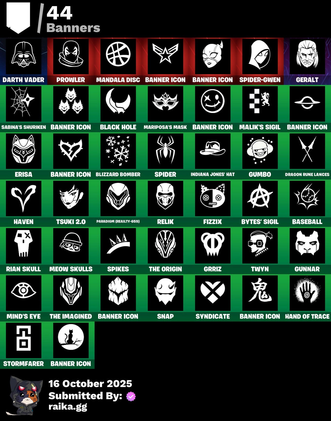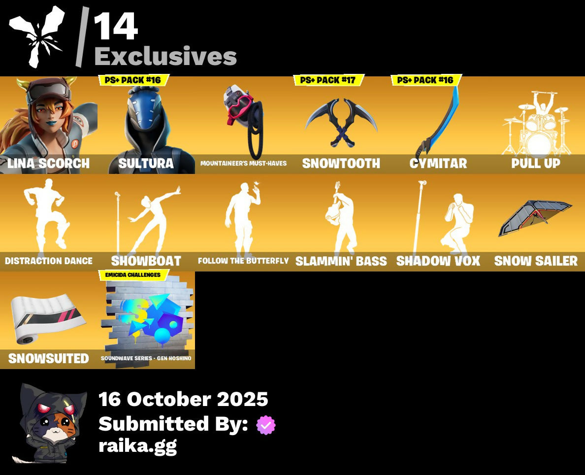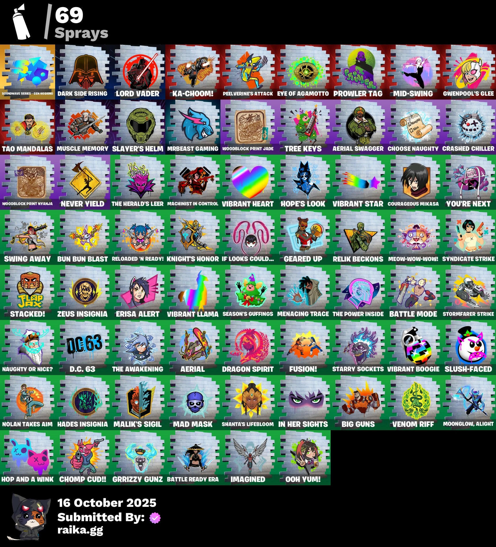 2.0's Revenge, 212th Battalion Trooper, 501st Trooper, 999 Knives, Adira, Adira's Armor, Adira's Battle Flag, Adventure Aerial, Aerial, Aerial Classic, Aerial Swagger, Ancestral Bloom, Arachrobatics, Arctic Adeline, Arm The Pumpkin!, Articulated Blade Wing, Astro Armor, Aurelian, Backup Blades, Balance Board, Banner Icon, Baseball, Bat Royale, Battle Bloom, Battle Mode, Battle Ready Era, Beacon Glass, Big Guns, Black Hole, Blade Of The Waning Moon, Blizzard Bomber, Blowin' Up, Board Breaker, Boba Bling, Book of Cagliostro, Bubbloon, Bun Bun Bang Bang, Bun Bun Blast, Bushranger, Buttoned Up, Buzz Pack, Buzzsaw Breacher, Buzzy Bag, Bytes, Bytes' Sigil, Cacodemon, Cap K.O., Carbon Scarlet, Cazadora Wings, Cerberus Bite, Chain Surfer, Chaos Directive, Chomp Cud!!, Choose Naughty, Chrome Marked, Chrome Punk, Chromebrella, Chromeseed, Chromestruck Fire, Chronos Lock, Classic Age, Clawz Retro, Cliffside Soarer, Combat Elite, Comfy Cats, Conjure Weapon, Contour Camo, Courageous Mikasa, Crashed Chiller, Crewmate, Crowning Achievement, Crucible Blade, Cube Aether, Cubic Scepter, Curling Iron, Cyclo Curl, Cymitar, D.C. 63, Dagger Dance, Daisies, Dark Side Rising, Darth Shader, Darth Vader, Designated Hitters, Destroyer Signature, Dirtbike Challenge, Distraction Dance, Doctor Strange, Dogg Treat, Doom Brella, Doom Slayer, Double Header, Dragon Radar, Dragon Rider, Dragon Rune Lance, Dragon Rune Lances, Dragon Spirit, Dusty, Electric Shredder, Emergency Raft, Energy Claw, Ensnared, Era, Erisa, Erisa Alert, Erisa's Crest, Eternal Ranker, Evie, Exile's Emblem, Expedition Bag, Eye of Agamotto, Fa-La-La-Llama, Fancy Feet, Fanged Foresight, Fiery Descent, Fishbone Flayer, Fizzix, Flip Flyer, Flux Silvera, Follow The Butterfly, Freshly Forged, Frosted Frets, Fusion!, Gas Up Pack, Geared Up, Geralt, Geralt Of Rivia, Get Out Of Your Mind, Golden Scythe, Griffin's Talon, Grind Bag, Gringle Gift, Grriz, Grrizzy Gooper, Grrizzy Gunz, Guardian Daggers, Gum Brawler, Gumbo, Gunn-Brella, Gunnar, Gunnar's Special, Gwen Stacy, Gwen's Spiderchute, Gwen-Step, Gwenpool, Gwenpool's Glee, Gwenpool's Katanas, Gwettermann Jacket, Hadean Gate, Hades Insignia, Hand of Trace, Handheld Missile, Har-Har-Har!, Haven, Heart Sign, Heart's Carver, Heart's Desire, Heartwinder, Hexture, Hop and a Wink, Hope's Look, Horde's War Wheel, Hot Slurp Balloon, Humbug Slicer, Hunter's Reach, Hypnot-Eyes, Ice-Blasted Snow Crunchem, If Looks Could..., Igni Sign, Imagined, Imperial March, In Her Sights, Indiana Jones, Indiana Jones' Hat, Infield Fly, Infinite Swirl, Inflate-A-Roach, It Is Finished, It's... You?, Jet Signals, K.O. Club, K.O. Cruiser, Ka-Choom!, Kata Tech Burstwing, Kata-Pack, Kiara K.O., Knight's Honor, Lambda-Class Shuttle, Laser Focused, Lbc Signature, Lectro Guard Pack, Lectro Tech, Lectrostatic Impactor, Legendary Blade Of Insight, Lennox Rose, Lil' Prancer, Lina Scorch, Lithic, Lord Vader, Love It!, Love Lock, Lucky Lance, Lumi Jellie, Lunar Defender, Lunar Glow, Lunar Hyperjet, Lunar Party, Lunar Skyspan, Lunarian Luxury, Lunarios, M.O.A.B.B., Machine Of War, Machinist In Control, Mad Mask, Magnorepulsor Board, Make A Seat, Malik, Malik's Honor, Malik's Sigil, Mandala Disc, Mariposa's Mask, Mark Of The Prowler, Mark of the Slayer, Massai, Massai Fire, Master Plan, Meanwhile..., Menacing Trace, Meow Skulls, Meow-Wow-Wow!, Mercurial, Mid-Swing, Mind's Eye, Mini Slayer Fistbump, Modern Rōnin, Molten Max Axe, Moonglide, Moonglow, Alight, Mountaineer's Must-Haves, Mr. Daruma, Mrbeast Gaming, Muscle Memory, Nana-Brella, Nanamantium, Nanner Bashers, Naughty Or Nice?, Nemesis Box, Never Yield, Nezumi, Night Kama, Ninja Stance: Leo, Nolan Takes Aim, Nomad's Spear, Northquester Deluxe, Nyanja's Catpak, Omg I Love It, Omni Sword, On, Ooh Yum!, Original Issue, Pairing Blades, Paradigm (Reality-659), Paradigm Shift, Pastel Stryder, Peel Out, Peelverine, Peelverine Wings, Peelverines Attack, Peely Whip, Peppermint Paraglider, Per Aspera Ad Astra, Pig-Gwen Scooter, Plastic Patroller, Polished Stone, Polysynth Kite, Pony Tails, Ponytail, Praetor Shroud, Prime Meridian, Prowler, Prowler Tag, Psionic Surfer, Pull Up, Punch Saw, Radiant 1, Raider's Relics, Ranking Ronin, Rebel Brella, Rebel's Rucksack, Red Hot Revenge, Redmask Ranker, Relik, Relik Beckons, Reloaded 'N Ready!, Renzo The Destroyer, Revel, Rian, Rian Skull, Rian's Roar, Rogue Archaeology, Rose Light Daggers, Sabina, Sabina's Shuriken, Sardeenz!, Season's Guffings, Secret Scimitars, Segway Tour, Selene, Seven Signet, Shadow Vox, Shanta's Lifebloom, Shinie Shellie, Shogun 'Brella, Showboat, Shuriken Spinner, Sigil Of The Empire, Signal Tracer, Skeleglider, Skull-A-Tron, Sky Prowler, Sky Scout, Slammin' Bass, Slayer Juice Wrld, Slayer's Helm, Sled Ready Guff, Sledgecracker, Slurpmatic, Slush-Faced, Slushy Sneak, Snap, Snoop's Holladizzle Bass, Snow Sailer, Snowsuited, Snowtooth, Solitary Defender, Soundwave Series - Gen Hoshino, Soundwave Series - Gen Hosinyo, Sovereign Griffin, Sparkli Scampi, Spectra Protector, Spectrakinetic, Spellwork Scimitar, Spider, Spider Snare, Spider-Gwen, Spikes, Spinal Vinyl, Stacked!, Starry Sockets, Steady, Stealth Silver, Stinger Pack, Storm Brawler, Storm Crash, Stormfarer, Stormfarer Strike, Stormshielder Blades, Style Supreme, Sultura, Summer Strider, Sunglasses, Swag Shot, Sweat-Free, Swing Away, Syndicate, Syndicate Strike, Take A 'Bow, Tao Mandalas, That's Cold Jac!, The Awakening, The Balance Of Two, The Bestiary Chest, The Destroyer's Destroyer, The Dip, The Fangler, The Herald's Leer, The Imagined, The Imagined Aura, The Imagined Blade, The Imagined Wingspan, The King's Oath, The Nothing's Gift, The Olympian, The Origin, The Peerless Parasol, The Power Inside, The Stormfarer's Cloak, The Umbrella, This Is Fine, Timesweeper, Toasty Roast, Tomoki & Katana, Tover, Trace, Tree Keys, Tri-Ooze Tank, Tsuki 2.0, Turbulent Blade, Twin Crossfire, Twyn, Utility Claymore, Venom Riff, Vibrant Boogie, Vibrant Heart, Vibrant Llama, Vibrant Star, Victory Br