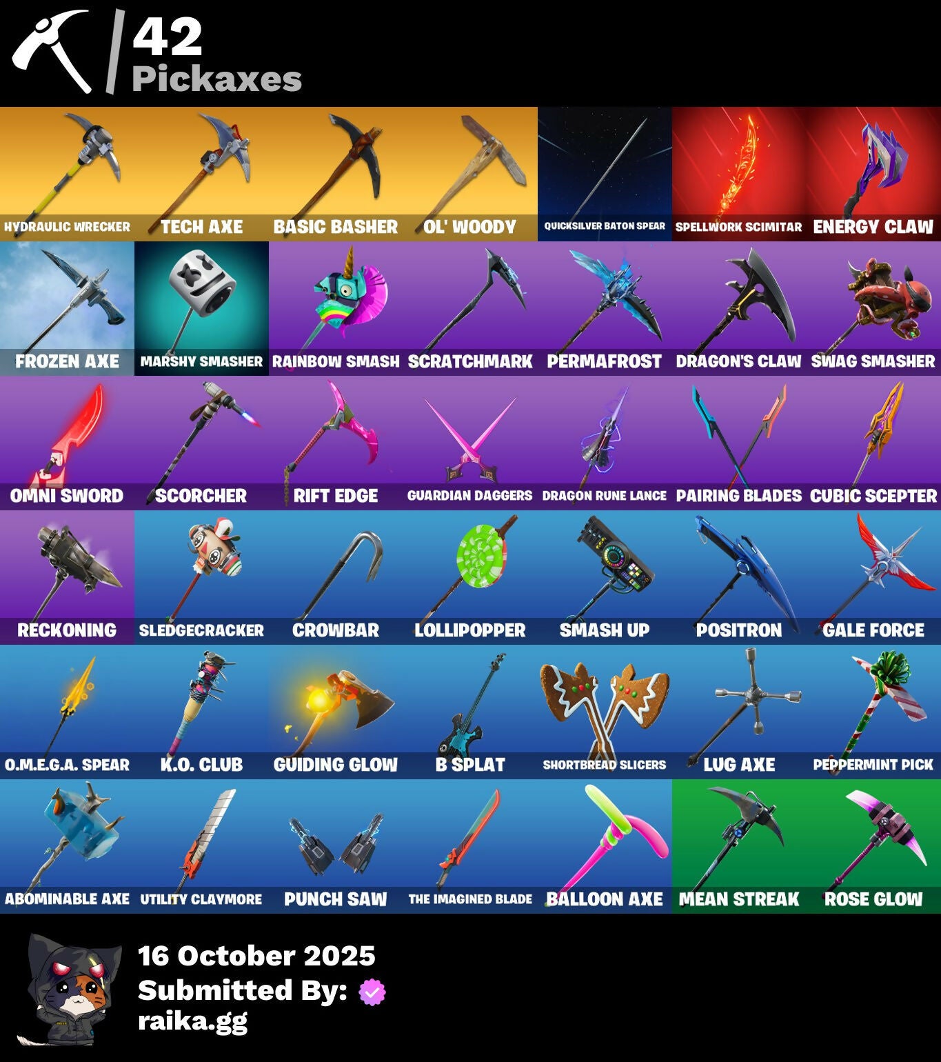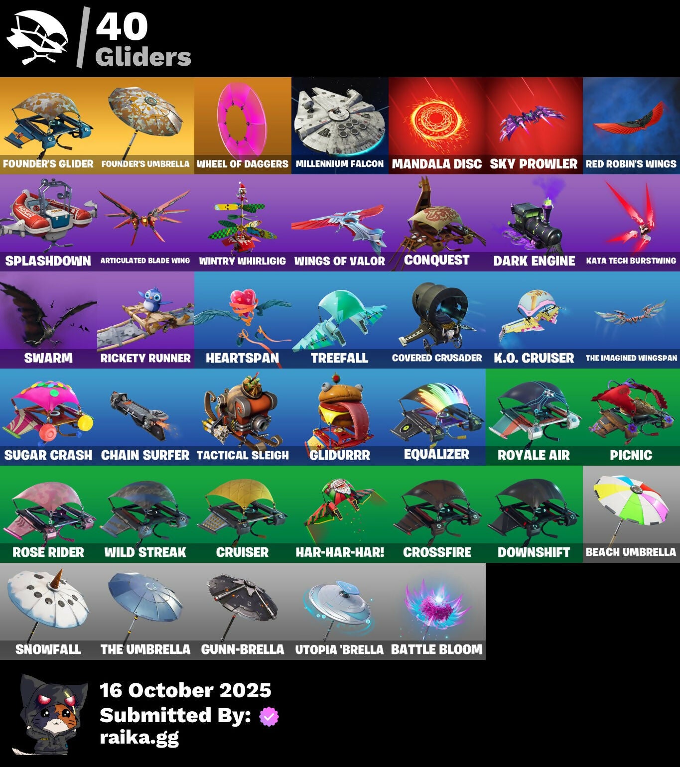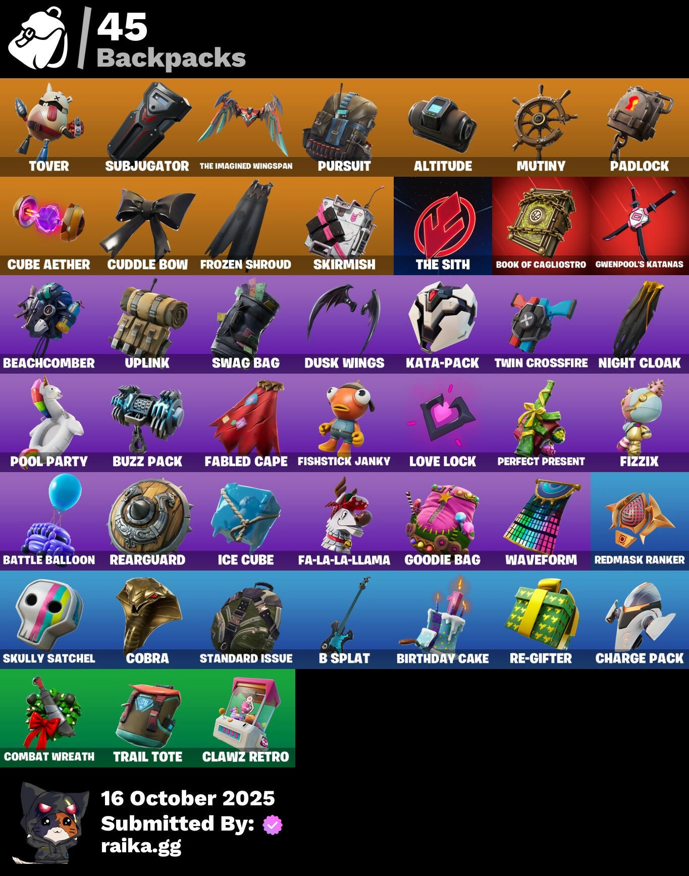 2.0's Revenge, Abominable Axe, Abstract, Adira, Adira's Armor, Altitude, Arctic Adeline, Arctic Camo, Arrow, Articulated Blade Wing, B Splat, Bag Of Coal, Baited, Balloon Axe, Bananas, Banner, Banner Icon, Basic Basher, Bat, Batman, Battle Balloon, Battle Bloom, Battle Bus Balloon, Battle Mode, Battlehawk, Beach Umbrella, Beachcomber, Big Guns, Birthday Cake, Blackheart, Blowin' Up, Boogie, Book of Cagliostro, Breakdown, Brite Bomber, Buzz Pack, Cactus Maze, Calamity, Calculated, Campfire, Carbide, Carbon & Gold, Carbon Fiber, Cat Flip, Chain Surfer, Chains, Chalk Outline, Charge Pack, Circle, Clawz Retro, Cobra, Combat Elite, Combat Wreath, Comet, Conjure Weapon, Conquest, Constructor, Covered Crusader, Crazy Castle, Crossfire, Crowbar, Cruiser, Cube Aether, Cubic Scepter, Cuddle Bow, Cuddle Hearts, Cuddle Team Hula, Cuddle Team Leader, Cyclo Curl, DJ Yonder, Dagger Dance, Dark Engine, Dice, Dinosaur, Disco, Do It!, Doctor Strange, Dog Bowl, Dolphin, Downshift, Dragon Rune Lance, Dragon Stance, Dragon's Claw, Drift, Duck, Durrr, Durrr Burger, Dusk, Dusk Wings, E.G.O., Energy Claw, Enforcer, Equalizer, Erisa, Erisa Alert, Erisa's Crest, Evie, Eye Of Agamotto, Fa-La-La-Llama, Fable, Fabled Cape, Fake Door, Falling Leaf, Fence, Festive Paper, Fishstick Janky, Fizzix, Flamenco, Flippin' Away, Floating Island, Flowy Hat, Fly, Founder's Glider, Founder's Umbrella, Fox Clan Mask, Frozen Axe, Frozen Shroud, Fryangles, Gale Force, Game Over, Geared Up, Gentleman's Dab, Get Funky, Gg Ornament, Gg Potion, Gg Smiley, Gg Snakes, Gg Snowman, Giddy-Up, Glidurrr, Glyph, Golf Ball, Golf Clap, Good Vibes, Goodie Bag, Gremlins, Gringle Gift, Grumpy Tree, Guardian Daggers, Guiding Glow, Gunn-Brella, Gunnar, Gunnar's Special, Gwenpool's Katanas, Ham, Hand Horns, Happy Birthday!, Har-Har-Har!, Heart, Hearts, Heartspan, Heavy Metal Omega, Hero Emblem, Hot Marat, Huntress, Hybrid, Hydraulic Wrecker, Ice Cream Truck, Ice Cube, If Looks Could..., Imagined, Indigo Ice, Infinity Blade, It's Go Time!, Jellyfish, Jubilation, K.O. Club, K.O. Cruiser, Kata Tech Burstwing, Kata-Pack, Keep It Mello, Kiara K.O., Kymera Swarm, Laser Chomp, Lil' Prancer, Llama Bell, Llama De Muertos, Lollipopper, Looted, Love Lock, Lt. Evergreen, Lucha Gg, Lug Axe, Lynx, Mandala Disc, Manhole Cover, Marshy Smasher, Mean Streak, Mello Made It Right, Melting Snowman, Meow Moon, Mercurial, Merry Marauder, Mic Drop, Millennium Falcon, Monks, Moth, Mutiny, Naughty Or Nice?, Neon Cat, New Year 2020, Night Cloak, Nightshade, Norse Llama, O.M.E.G.A. Spear, Ol' Woody, Omni Sword, Oni, Only 90's Kids, Orange Justice, Original Issue, Padlock, Pairing Blades, Palm Trees, Peekaboo, Pencil, Peppermint Pick, Perfect Present, Permafrost, Phantom, Pickaxe, Picnic, Pineapple, Pixel Raven, Pixels Royale, Polka Dots, Pool Party, Popcorn, Porthole, Positron, Potato Aim, Powder, Prismatic Keepsakes, Prowler, Prowler Tag, Punch Saw, Pursuit, Quicksilver Baton Spear, Racing Checkers, Ragnarok, Rainbow, Rainbow Smash, Re-Gifter, Rearguard, Reckoning, Red Robin's Wings, Redline, Redmask Ranker, Regal Wave, Respect, Respect The Peace, Rickety Runner, Ride The Pony, Rift Edge, Rocket, Rook, Rose Glow, Rose Rider, Rose Team Leader, Royal Stroll, Royale Air, Running Man, Scorcher, Scratchmark, Scuba Gear, Season's Guffings, Segway Tour, Sgt. Winter, Shackle, Shimmer, Shopping Cart, Shortbread Slicers, Sith, Skirmish, Skull & Beard, Skull Trooper, Skully, Skully Satchel, Sky Prowler, Sled Ready Guff, Sledgecracker, Sledgehammer, Slitherin', Slush-Faced, Slushy Sneak, Smash Up, Snap, Snow Clan Shuriken, Snowfall, Snowshaker, Soldier, Spellwork Scimitar, Spider Badass, Spiderweb, Splashdown, Spray Can, Stage, Stage 4, Stage 4 - No Ponytail, Stage 5, Stage 5 - No Shoulder Pad, Stage 8, Standard Issue, Stay Smooth, Strawberry Paws, Subjugator, Sugar Crash, Suited Up, Sun, Sun Strider, Sunglasses, Sushi, Swag Bag, Swag Smasher, Swarm, Swipe It, Syndicate, Syndicate Strike, Tactical Sleigh, Take A 'Bow, Take The Elf, Tao Mandalas, Tartan, Tech Axe, Teeth, Teknique, The Ace, The Balance Of Two, The Brood, The Crack, The Dip, The Empire, The Imagined, The Imagined Aura, The Imagined Blade, The Imagined Wingspan, The Origin, The Prisoner, The Sith, The Umbrella, Tic-Tac-Toe, Timer, Tinseltoes, Tomatohead, Tover, Trail Tote, Trash Can, Treefall, Tribal, Trog, Trog Drawings, Trophy, Tropical Camo, True Heart, Tsuki 2.0, Twin Crossfire, Ultra Red, Uplink, Utility Claymore, Utopia 'Brella, Valentine, Vanishing Boy Wonder, Vibrant Boogie, Vibrant Heart, Vibrant Llama, Vibrant Star, Viking Ship, Wallcrawler, Warpaint, Waveform, Welcome!, Well Wrapped, Wheel Of Daggers, Whiplash, White, Wild Rainbow, Wild Streak, Wings Of Valor, Wintry Whirligig, Wooly Warrior, Wreath, X Mark, X-4 Stormwing, You're Awesome, Yummy, Zenith, Zig-Zag, Zoey