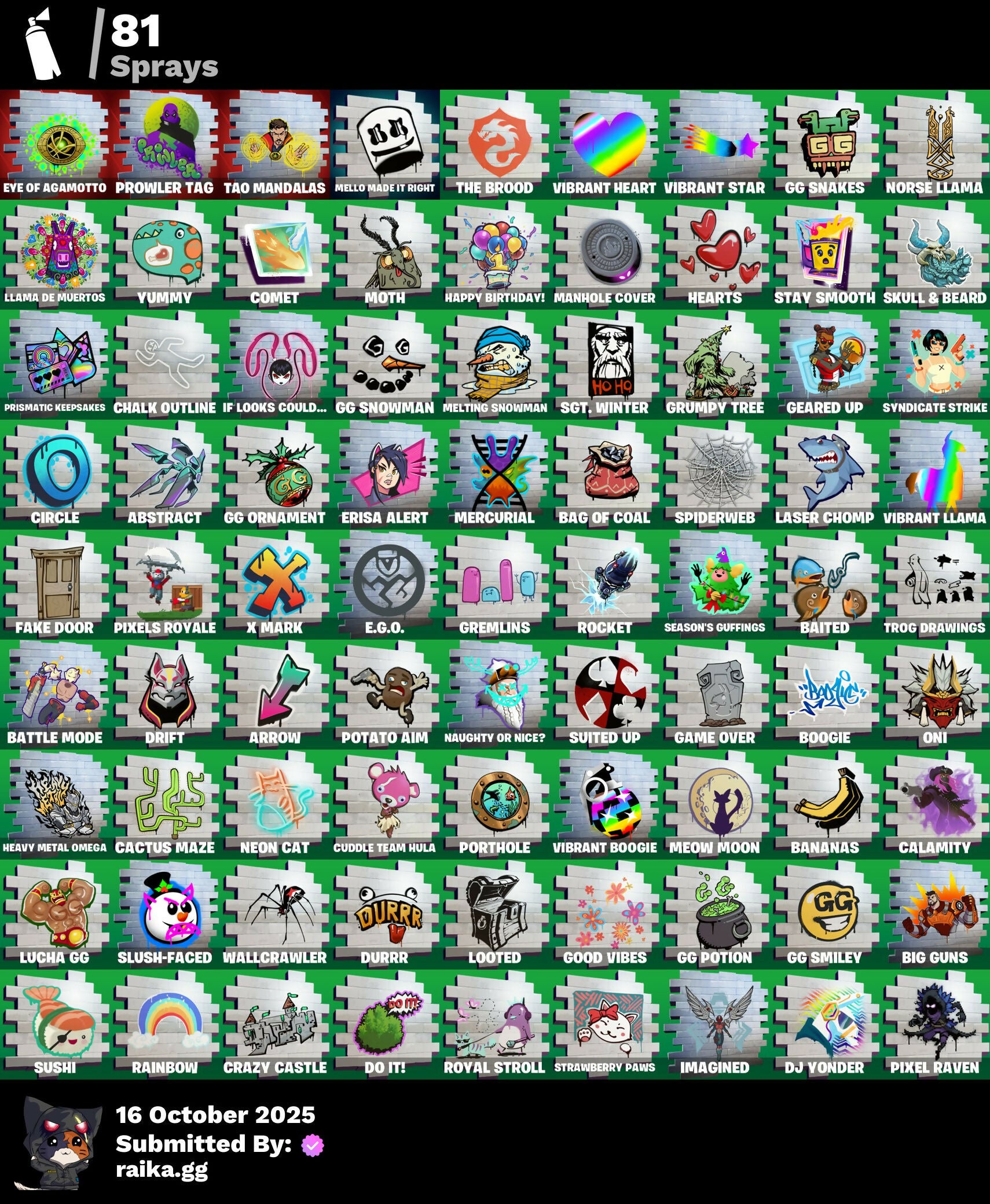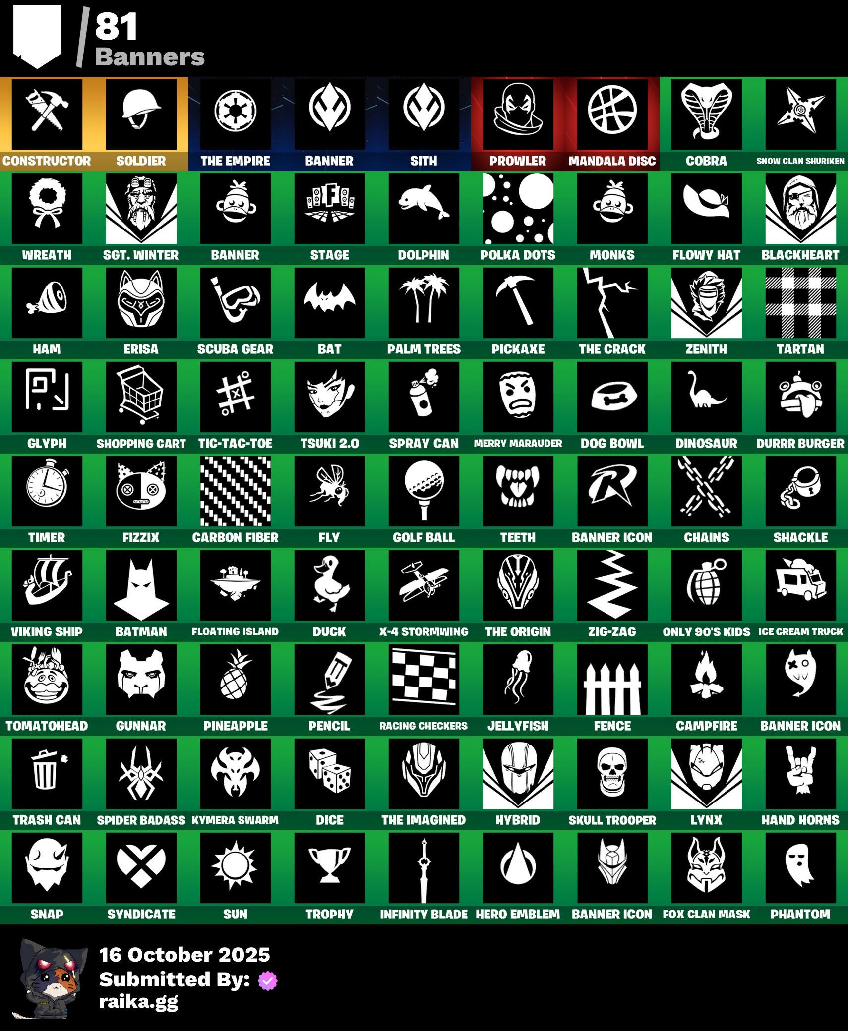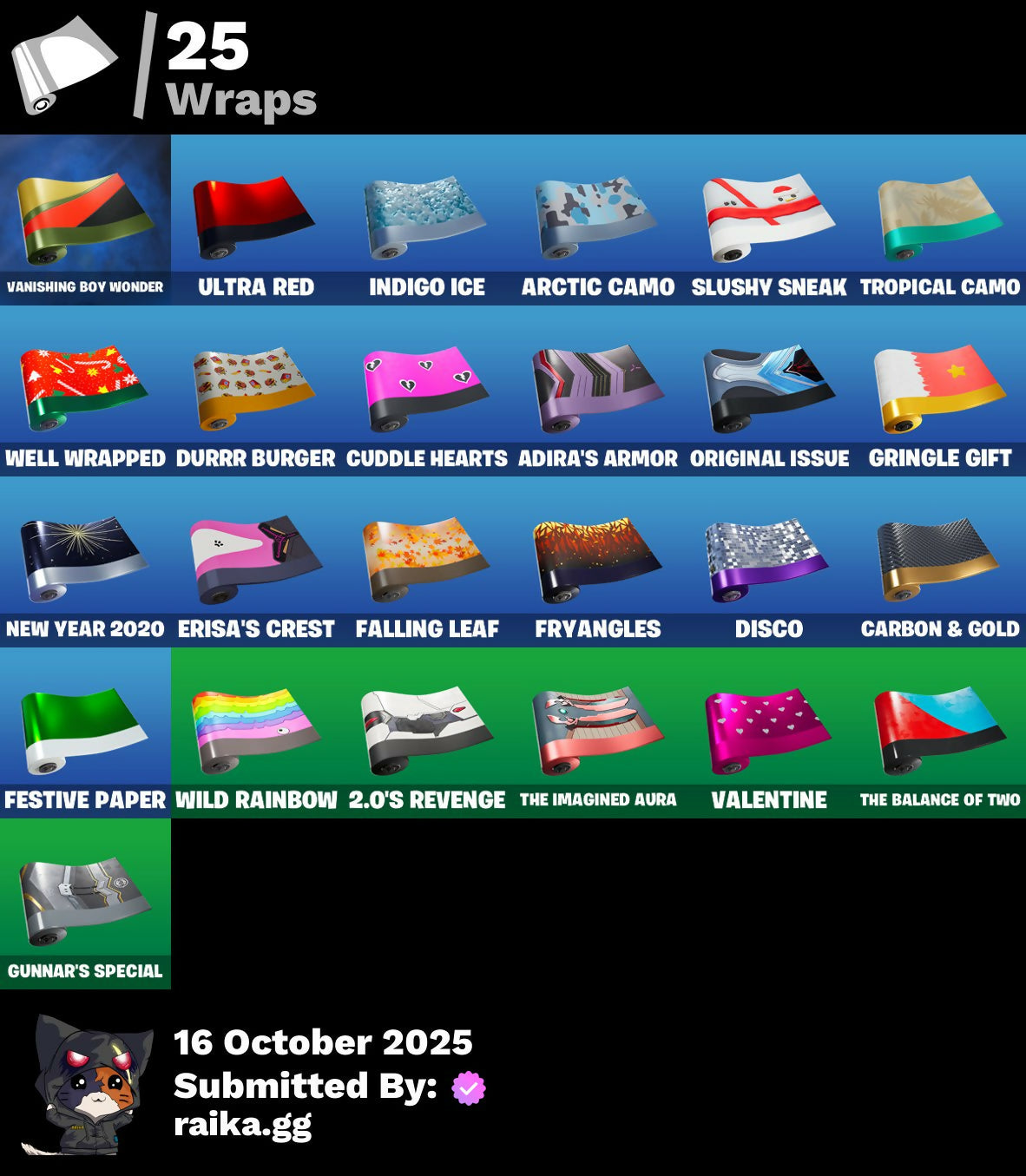 2.0's Revenge, Abominable Axe, Abstract, Adira, Adira's Armor, Altitude, Arctic Adeline, Arctic Camo, Arrow, Articulated Blade Wing, B Splat, Bag Of Coal, Baited, Balloon Axe, Bananas, Banner, Banner Icon, Basic Basher, Bat, Batman, Battle Balloon, Battle Bloom, Battle Bus Balloon, Battle Mode, Battlehawk, Beach Umbrella, Beachcomber, Big Guns, Birthday Cake, Blackheart, Blowin' Up, Boogie, Book of Cagliostro, Breakdown, Brite Bomber, Buzz Pack, Cactus Maze, Calamity, Calculated, Campfire, Carbide, Carbon & Gold, Carbon Fiber, Cat Flip, Chain Surfer, Chains, Chalk Outline, Charge Pack, Circle, Clawz Retro, Cobra, Combat Elite, Combat Wreath, Comet, Conjure Weapon, Conquest, Constructor, Covered Crusader, Crazy Castle, Crossfire, Crowbar, Cruiser, Cube Aether, Cubic Scepter, Cuddle Bow, Cuddle Hearts, Cuddle Team Hula, Cuddle Team Leader, Cyclo Curl, DJ Yonder, Dagger Dance, Dark Engine, Dice, Dinosaur, Disco, Do It!, Doctor Strange, Dog Bowl, Dolphin, Downshift, Dragon Rune Lance, Dragon Stance, Dragon's Claw, Drift, Duck, Durrr, Durrr Burger, Dusk, Dusk Wings, E.G.O., Energy Claw, Enforcer, Equalizer, Erisa, Erisa Alert, Erisa's Crest, Evie, Eye Of Agamotto, Fa-La-La-Llama, Fable, Fabled Cape, Fake Door, Falling Leaf, Fence, Festive Paper, Fishstick Janky, Fizzix, Flamenco, Flippin' Away, Floating Island, Flowy Hat, Fly, Founder's Glider, Founder's Umbrella, Fox Clan Mask, Frozen Axe, Frozen Shroud, Fryangles, Gale Force, Game Over, Geared Up, Gentleman's Dab, Get Funky, Gg Ornament, Gg Potion, Gg Smiley, Gg Snakes, Gg Snowman, Giddy-Up, Glidurrr, Glyph, Golf Ball, Golf Clap, Good Vibes, Goodie Bag, Gremlins, Gringle Gift, Grumpy Tree, Guardian Daggers, Guiding Glow, Gunn-Brella, Gunnar, Gunnar's Special, Gwenpool's Katanas, Ham, Hand Horns, Happy Birthday!, Har-Har-Har!, Heart, Hearts, Heartspan, Heavy Metal Omega, Hero Emblem, Hot Marat, Huntress, Hybrid, Hydraulic Wrecker, Ice Cream Truck, Ice Cube, If Looks Could..., Imagined, Indigo Ice, Infinity Blade, It's Go Time!, Jellyfish, Jubilation, K.O. Club, K.O. Cruiser, Kata Tech Burstwing, Kata-Pack, Keep It Mello, Kiara K.O., Kymera Swarm, Laser Chomp, Lil' Prancer, Llama Bell, Llama De Muertos, Lollipopper, Looted, Love Lock, Lt. Evergreen, Lucha Gg, Lug Axe, Lynx, Mandala Disc, Manhole Cover, Marshy Smasher, Mean Streak, Mello Made It Right, Melting Snowman, Meow Moon, Mercurial, Merry Marauder, Mic Drop, Millennium Falcon, Monks, Moth, Mutiny, Naughty Or Nice?, Neon Cat, New Year 2020, Night Cloak, Nightshade, Norse Llama, O.M.E.G.A. Spear, Ol' Woody, Omni Sword, Oni, Only 90's Kids, Orange Justice, Original Issue, Padlock, Pairing Blades, Palm Trees, Peekaboo, Pencil, Peppermint Pick, Perfect Present, Permafrost, Phantom, Pickaxe, Picnic, Pineapple, Pixel Raven, Pixels Royale, Polka Dots, Pool Party, Popcorn, Porthole, Positron, Potato Aim, Powder, Prismatic Keepsakes, Prowler, Prowler Tag, Punch Saw, Pursuit, Quicksilver Baton Spear, Racing Checkers, Ragnarok, Rainbow, Rainbow Smash, Re-Gifter, Rearguard, Reckoning, Red Robin's Wings, Redline, Redmask Ranker, Regal Wave, Respect, Respect The Peace, Rickety Runner, Ride The Pony, Rift Edge, Rocket, Rook, Rose Glow, Rose Rider, Rose Team Leader, Royal Stroll, Royale Air, Running Man, Scorcher, Scratchmark, Scuba Gear, Season's Guffings, Segway Tour, Sgt. Winter, Shackle, Shimmer, Shopping Cart, Shortbread Slicers, Sith, Skirmish, Skull & Beard, Skull Trooper, Skully, Skully Satchel, Sky Prowler, Sled Ready Guff, Sledgecracker, Sledgehammer, Slitherin', Slush-Faced, Slushy Sneak, Smash Up, Snap, Snow Clan Shuriken, Snowfall, Snowshaker, Soldier, Spellwork Scimitar, Spider Badass, Spiderweb, Splashdown, Spray Can, Stage, Stage 4, Stage 4 - No Ponytail, Stage 5, Stage 5 - No Shoulder Pad, Stage 8, Standard Issue, Stay Smooth, Strawberry Paws, Subjugator, Sugar Crash, Suited Up, Sun, Sun Strider, Sunglasses, Sushi, Swag Bag, Swag Smasher, Swarm, Swipe It, Syndicate, Syndicate Strike, Tactical Sleigh, Take A 'Bow, Take The Elf, Tao Mandalas, Tartan, Tech Axe, Teeth, Teknique, The Ace, The Balance Of Two, The Brood, The Crack, The Dip, The Empire, The Imagined, The Imagined Aura, The Imagined Blade, The Imagined Wingspan, The Origin, The Prisoner, The Sith, The Umbrella, Tic-Tac-Toe, Timer, Tinseltoes, Tomatohead, Tover, Trail Tote, Trash Can, Treefall, Tribal, Trog, Trog Drawings, Trophy, Tropical Camo, True Heart, Tsuki 2.0, Twin Crossfire, Ultra Red, Uplink, Utility Claymore, Utopia 'Brella, Valentine, Vanishing Boy Wonder, Vibrant Boogie, Vibrant Heart, Vibrant Llama, Vibrant Star, Viking Ship, Wallcrawler, Warpaint, Waveform, Welcome!, Well Wrapped, Wheel Of Daggers, Whiplash, White, Wild Rainbow, Wild Streak, Wings Of Valor, Wintry Whirligig, Wooly Warrior, Wreath, X Mark, X-4 Stormwing, You're Awesome, Yummy, Zenith, Zig-Zag, Zoey