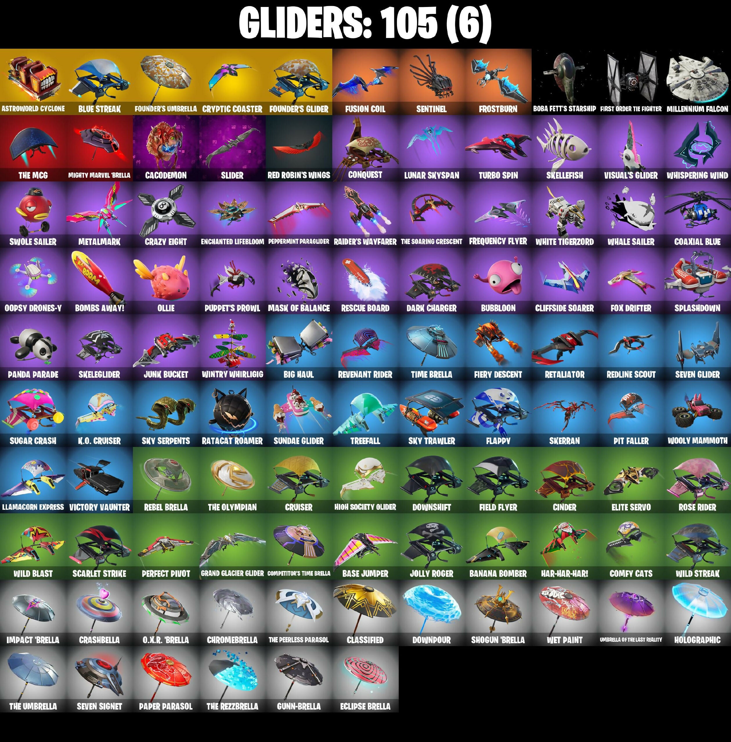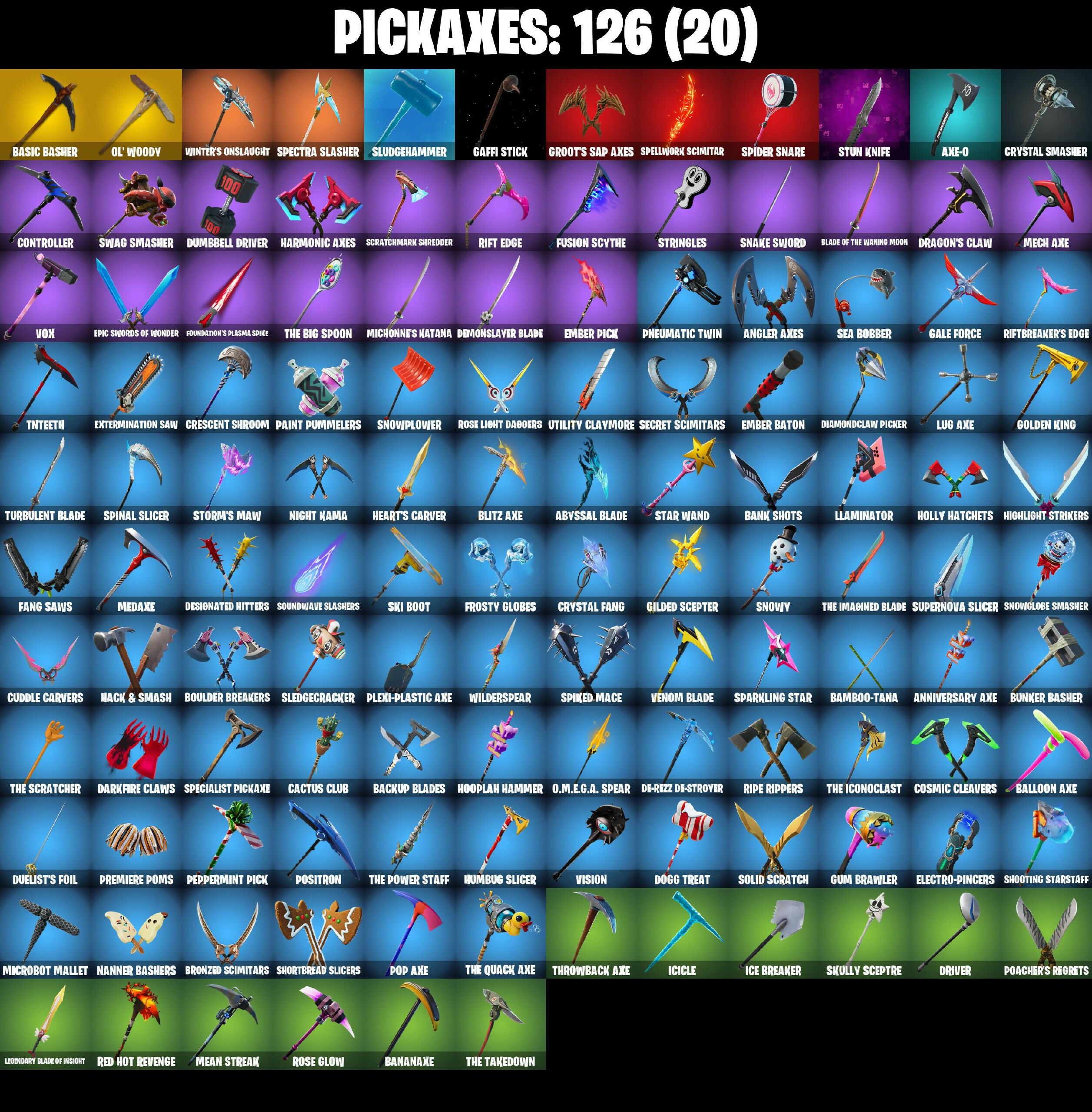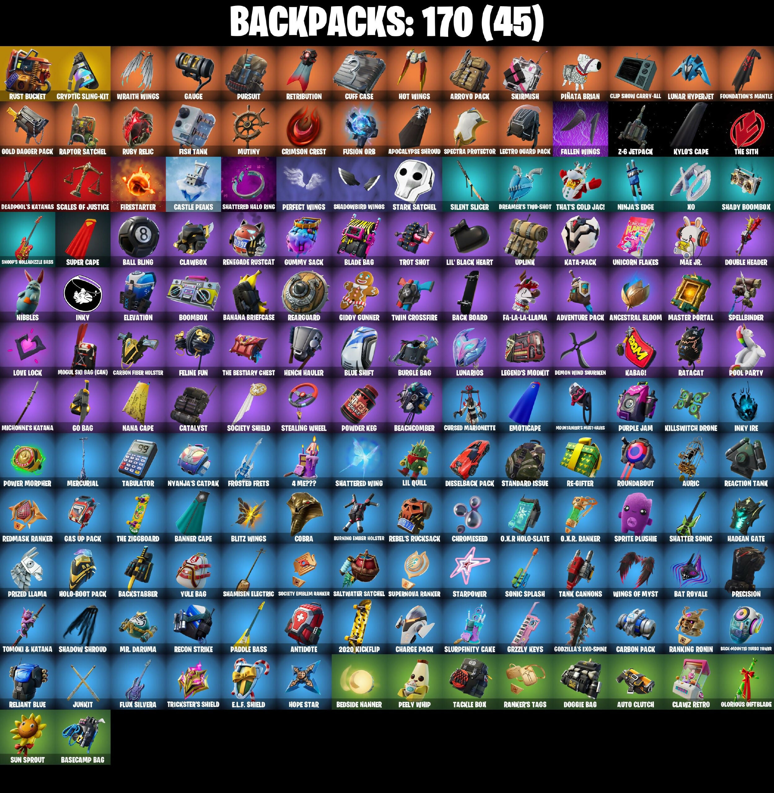 2020 Kickflip, 4 Me???, 8-Ball Vs Scratch, Absenz, Abyssal Blade, Adventure Pack, Agent Peely, Ancestral Bloom, Angler Axes, Anniversary Axe, Antidote, Apocalypse Shroud, Arctic Adeline, Arm The Pumpkin!, Arroyo Pack, Assault Trooper, Astroworld Cyclone, Aura, Auric, Auto Clutch, Axe-0, B.R.U.T.E. Gunner, Baba Vaga, Back Board, Back-Mounted Turbo Tower, Backstabber, Backup Blades, Ball Bling, Balloon Axe, Bamboo-Tana, Banana Bomber, Banana Briefcase, Bananaxe, Bank Shots, Banner Cape, Base Jumper, Basecamp Bag, Basic Basher, Bat Royale, Battlehawk, Beachcomber, Bear Hug, Bedside Nanner, Beep Beep, Big Haul, Bike To Go, Blackheart, Blade Bag, Blade of the Waning Moon, Blaze, Blitz Axe, Blitz Wings, Blizzard Bomber, Blue Shift, Blue Streak, Blue Striker, Blue Team Leader, Boba Fett, Boba Fett's Starship, Boing!, Bombs Away!, Boogie Down, Boombox, Boulder Breakers, Branded Brigadier, Breakin', Bronzed Scimitars, Brush Your Shoulders, Brutus, Bubbloon, Bunker Basher, Bunker Jonesy, Burgle Bag, Burning Ambition Valeria, Burning Ember Holster, C'Mere, Cacodemon, Cactus Club, Calculated, Call Me, Cameo Vs Chic, Cap Kick, Carbide, Carbon Commando, Carbon Fiber Holster, Carbon Pack, Card Drop, Castle Peaks, Castor, Catalyst, Champion Kyra, Charge Pack, Charlotte, Choice Knit, Chrome Punk, Chromebrella, Chromeseed, Cinder, Classified, Clawbox, Clawz Retro, Cliffside Soarer, Clip Show Carry-All, Cloud Striker, Cluck Strut, Coaxial Blue, Cobra, Codename E.L.F., Coin Flip, Comfy Cats, Commando, Competitor's Time Brella, Conga, Conquest, Controller, Corrupted, Cosmic Cleavers, Crashbrella, Crazy Eight, Crescent Shroom, Crimson Crest, Crowning Achievement, Cruiser, Cryptic Coaster, Cryptic Sling-Kit, Crystal, Crystal Fang, Crystal Smasher, Cuddle Carvers, Cuff Case, Cursed Marionette, Cyclo Curl, Dab, Dagger Dance, Dancin' Domino, Dark, Dark Charger, Darkfire Claws, De-Rezz De-Stroyer, Deadpool, Deadpool's Katanas, Demi, Demon Wind Shuriken, Demonslayer Blade, Designated Hitters, Diamond Throne, Diamondclaw Picker, Dieselback Pack, Do The 'Split, Dogg Treat, Doggie Bag, Double Header, Downpour, Downshift, Doze Dab, Dragon Stance, Dragon's Claw, Dream, Dreamer's Two-Shot, Drift, Driver, Droop, Duelist's Foil, Dumbbell Driver, Dunk On 'Em, Dusk Knight, Dynamo, E.L.F. Shield, Eclipse Brella, Electro-Pincers, Elevation, Elite Servo, Ember Baton, Ember Pick, Emoticape, Enchanted Lifebloom, Epic Swords of Wonder, Extermination Saw, Fa-La-La-Llama, Face Palm, Fallen Love Ranger, Fallen Wings, Fancy Peter Griffin, Fang Saws, Feline Fun, Field Flyer, Fiery Descent, Finesse Finisher, Finger Guns, Firestarter, First Order Tie Fighter, Fish Tank, Fishstick, Fist Bump, Flapjackie, Flappy, Flashback Breakdown, Flex On 'Em, Flippin' Away, Flux Silvera, Focused, Foil Flex, Foundation's Mantle, Foundation's Plasma Spike, Founder's Glider, Founder's Umbrella, Fox Drifter, Frequency Flyer, Frostburn, Frosted Frets, Frosty Globes, Frozen Fishstick, Frozen Nog Ops, Fusion, Fusion Coil, Fusion Orb, Fusion Scythe, Gaffi Stick, Gale Force, Gas Up Pack, Gauge, Gear Specialist Maya, Gentleman's Dab, Get Griddy, Giddy Gunner, Gilded Scepter, Ginger Gunner, Glorious Giftblade, Go Bag, Godzilla's Exo-Spine, Gold Dagger Pack, Gold Midas, Golden King, Good Sportsmanship, Grand Glacier Glider, Grizzly Keys, Groot's Sap Axes, Gum Brawler, Gumbo, Gummy Sack, Gunn-Brella, Hack & Smash, Hadean Gate, Hairpin, Hand-Forged, Har-Har-Har!, Harbinger Armor Omegarok, Harmonic Axes, Have A Seat, Haven, Heart's Carver, Hello Friend, Hench Hauler, High Five, High Society Glider, Highlight Strikers, Holiday Boxy, Holly Hatchets, Holo-Boot Pack, Holographic, Hooplah Hammer, Hope, Hope Star, Hot Wings, Hula Hoopin', Humbug Slicer, Huntress, Hybrid, Hype!, I Declare!, I'm A Mystery, Ice Breaker, Icicle, Impact 'Brella, Infectious, Infiltrator, Inky, Inky Ire, Instinct, Iris, Jackie, Jet Signals, Jolly Roger, Jonesy The First, Journey Vs Hazard, Jubilation, Jump Jets, Jumpshot, Jun-Hwan, Jungle, Junk Bucket, Junkit, K.O. Cruiser, Kabag!, Kata-Pack, Kev, Killswitch Drone, Knife Sharpener, Knight’s Helm, Komplex, Krisabelle, Kylo Ren, Kylo's Cape, Laid Back Shuffle, Lectro Guard Pack, Legend's Modkit, Legendary Blade of Insight, Leviathan, Lil Quill, Lil Split, Lil' Black Heart, Lil' Longboat, Lil' Monster, Lil' Prancer, Lina Scorch, Llamacorn Express, Llaminator, Love It!, Love Lock, Lt. Evergreen, Lt. John Llama, Lug Axe, Lunar Charge, Lunar Hyperjet, Lunar Skyspan, Lunarios, Lunch Break, Mae Jr., Mask Off, Mask of Balance, Master Portal, Mean Streak, Mech Axe, Medaxe, Meowscles, Mercurial, Metal Mouth, Metalmark, Michonne, Michonne's Katana, Microbot Mallet, Microflip, Mighty Marvel 'Brella, Millennium Falcon, Mogul Master (Can), Mogul Ski Bag (Can), Montague, Mountaineer's Must-Haves, Mr. Daruma, Mullet Marauder, Mutiny, Mwahaha, Nailed It, Nana Cape, Nanner Bashers, Nibbles, Night Kama, Ninja, Ninja Style, Ninja's Edge, Nisha, No Sweat, Nog Ops, Nyanja's Catpak, O.M.E.G.A. Spear, O.X.R Holo-Slate, O.X.R. 'Brella, O.X.R. Ranker, Ol' Woody, Ollie, Omegarok, Oopsy Drones-V, Orange Justice, Oscar, Paddle Bass, Paint Pummellers, Panda Parade, Pandemonium, Paper Parasol, Party Hips, Paws & Claws, Peace Out, Peely Whip, Peppermint Paraglider, Peppermint Pick, Perfect Pivot, Perfect Shadow, Perfect Wings, Peter Griffin, Phew!, Pinata Brian, Pit Faller, Plexi-Plastic Axe, Pneumatic Twin, Poacher's Regrets, Point & Shoot, Point Patroller, Polar Peely, Pool Party, Pop Axe, Popcorn, Popular Vibe, Positron, Powder Keg, Power Morpher, Precision, Premiere Poms, Prized Llama, Prodigy, Puppet's Prowl, Purple, Purple Jam, Pursuit, Rage Quit, Raider's Wayfarer, Ranker's Tags, Ranking Ronin, Rapscallion, Raptor, Raptor Satchel, Ratacat, Ratacat Roamer, Re-Gifter, Reaction Tank, Ready When You Are, Rearguard, Rebel Brella, Rebel's Rucksack, Recon Strike, Red Hot Revenge, Red Jade, Red Robin's Wings, Redline, Redline Scout, Redmask Ranker, Regal Wave, Reliant Blue, Rem