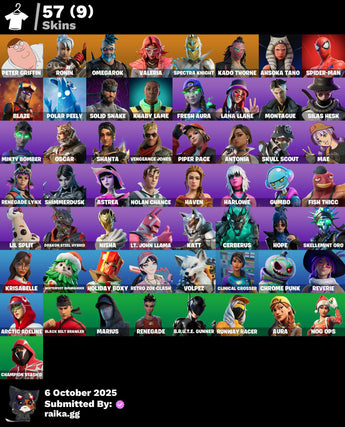 [PC/PSN/XBOX] 57 skins | Peter Griffin | Ronin | Omegarok | Valeria | Spectra Knight | Kado Thorne | Ahsoka Tano | Spider-Man | Blaze | Polar Peely | 700 VB / FN