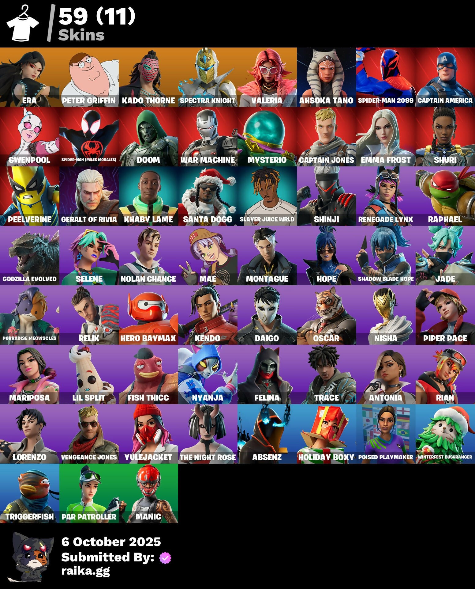 [PC/PSN/XBOX] 59 skins | Era | Peter Griffin | Kado Thorne | Spectra Knight | Valeria | Ahsoka Tano | Spider-Man 2099 | Captain America | Gwenpool | 50 VB / FN