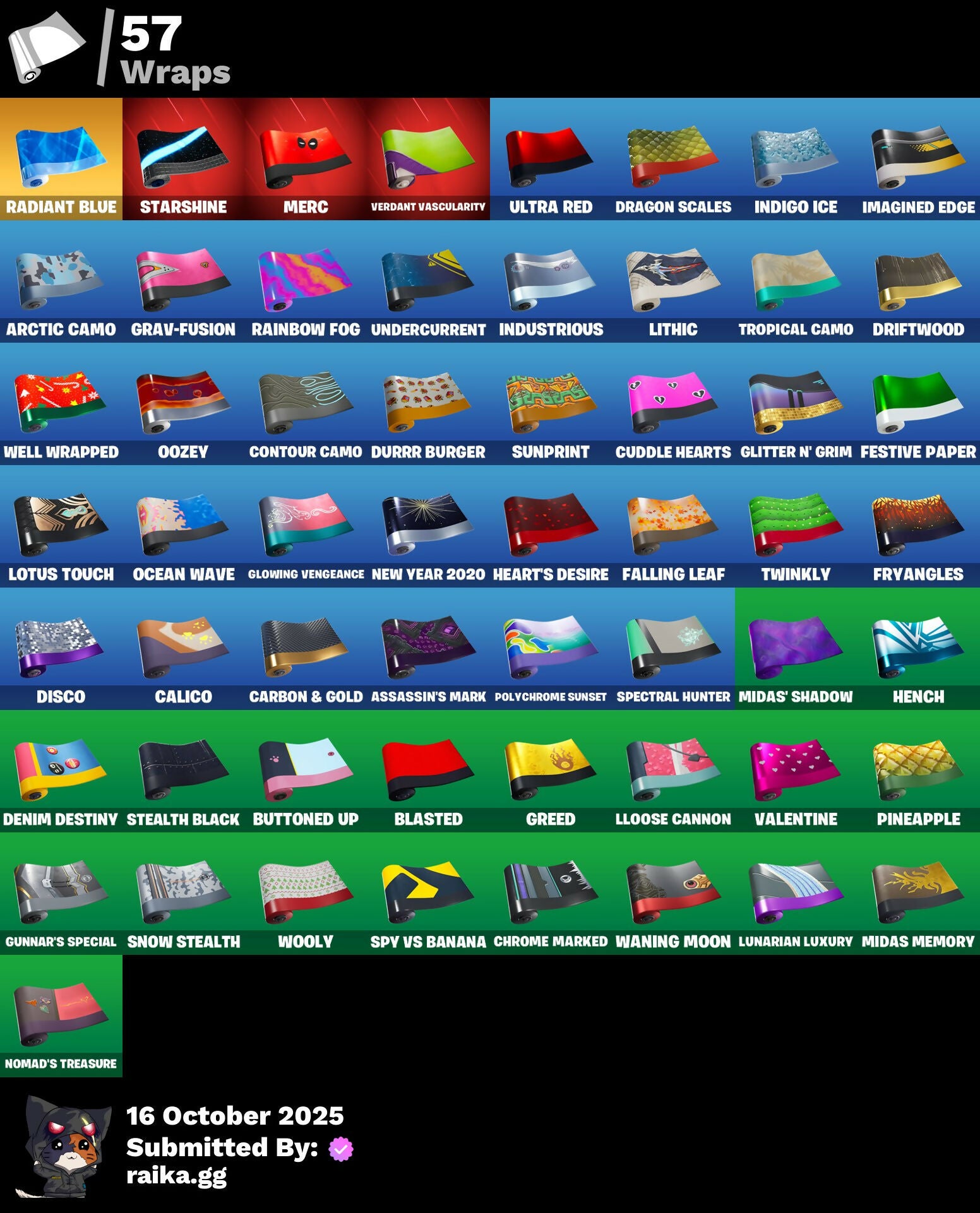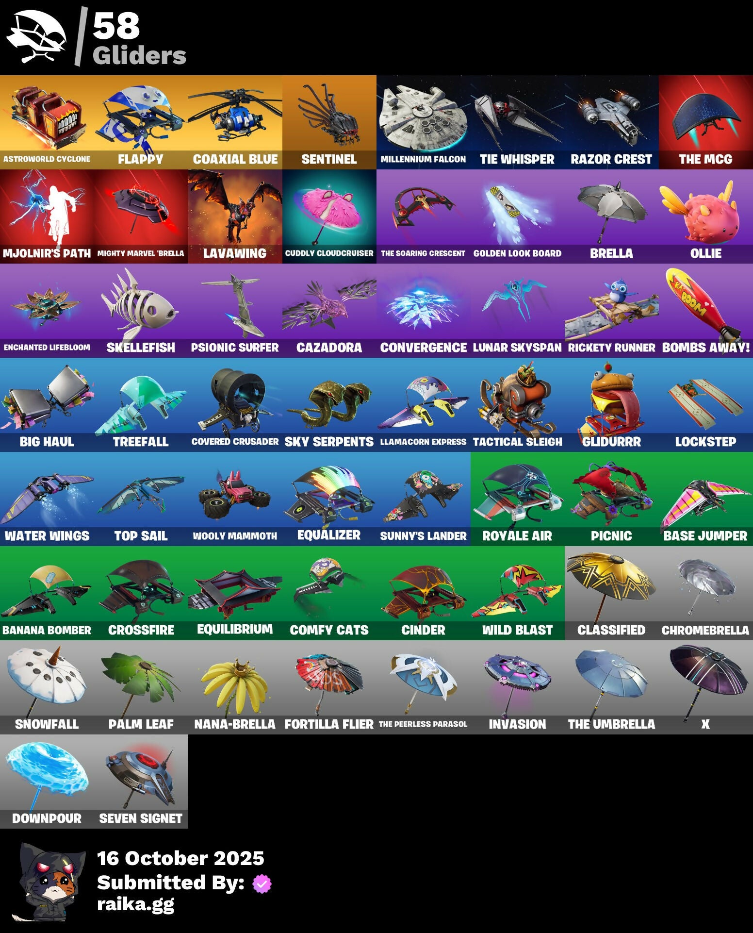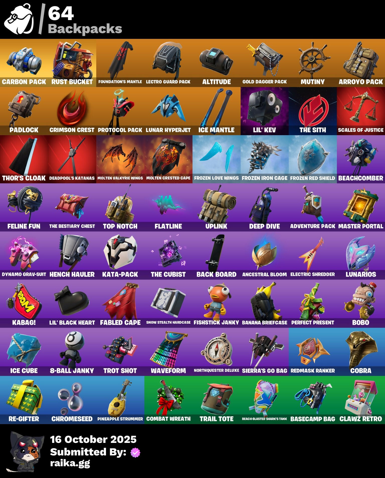8-Ball Janky, A.L.T.E.R., Abominable Axe, Adventure Pack, Aftermath, Agent Nana, Agent Peely, Air Shredder, Altitude, Ancestral Bloom, Arctic Camo, Arroyo Pack, Assassin's Mark, Astro Jack, Astroworld Cyclone, Back Board, Backup Blades, Bag Of Coal, Baited, Banana Bomber, Banana Briefcase, Bananas, Bananaxe, Banner, Base Jumper, Basecamp Bag, Batman, Battle Bus Balloon, Beach-Blasted Shark's Tank, Beachcomber, Beep Beep, Big Haul, Blackheart, Blade Of The Waning Moon, Blasted, Blinding Lights, Bobo, Bolt, Bombastic Winterfest, Bombs Away!, Boot It, Boulder Breakers, Brella, Brite Bomber, Bronzed Scimitars, Brutus, Bunny Hop, Buttoned Up, Bytes' Sigil, Calamity, Calico, Call Me, Campfire, Carbon & Gold, Carbon Commando, Carbon Pack, Cash Grab, Cat Flip, Cazadora, Charlotte, Charlotte's Logo, Choice Knit, Chomp Cud!!, Choppy, Chrome Marked, Chrome Punk, Chromebrella, Chromeseed, Cinder, Classified, Clawz Retro, Coaxial Blue, Cobra, Coconuts, Coin Flip, Combat Wreath, Comet, Comfy Cats, Conga, Contour Camo, Controller, Convergence, Count It!, Covered Crusader, Cowboy Chat, Crabby King, Crazy Castle, Crazyboy, Crescent Shroom, Crimson Crest, Crossfire, Cube Assassin, Cube Edge, Cuddle Hearts, Cuddle Team Hula, Cuddly Cloudcruiser, Cyclo Curl, D.C. 63, DJ Yonder, Dance Mat, Dance Monkey, Dark, Deadpool, Deadpool's Katanas, Deep Dive, Demons Beware, Denim Destiny, Dice, Disco, Dive Knives, Dolphin, Downpour, Dragon Scales, Dragon Stance, Dragon's Claw, Driftwood, Durrr Burger, Dynamite, Dynamo Grav-Suit, E.G.O., Electric Shredder, Electro Swing, Ember, Enchanted Lifebloom, Eon Blades, Epic Swords Of Wonder, Equalizer, Equilibrium, Everything's Fine, Expedition, Eye Of Agamotto, Fable, Fabled Cape, Fade, Fallen Love Ranger, Falling Leaf, Feline Fun, Festive Paper, Fish Hook, Fishbone, Fishstick Janky, Fist, Flappy, Flatline, Flippin' Away, Flippin' Incredible, Flipside, Floating Island, Fortilla Flier, Foundation's Mantle, Fox, Free Flow, Frozen Axe, Frozen Iron Cage, Frozen Love Ranger, Frozen Love Wings, Frozen Raven, Frozen Red Knight, Frozen Red Shield, Fryangles, G.O.A.T., GG Ornament, GG Potion, GG Snakes, GG Snowman, Gear Specialist Maya, Gentleman's Dab, Get Funky, Get Gone, Get Griddy, Giddy-Up, Glidurr, Glitter N' Grim, Glowing Vengeance, Gold, Gold Dagger Pack, Gold Touch, Golden Agent, Golden King, Golden Look Board, Golden Shine, Golden Touch, Golf Clap, Grav-Fusion, Greed, Grriz, Grumpy Tree, Guggi Was Here, Guiding Glow, Gunnar's Special, Hack & Smash, Ham, Hammerhead, Hammers Of Justice, Hand Horns, Hand of Trace, Haven, Heart's Desire, Hello Friend, Hench, Hench Hauler, Hidden Haven, Holly Hatchets, Hot Marat, Hybrid, Ice Cube, Ice Kingdom Emblem, Ice Mantle, Ice Scepter, Imagined Edge, Imagined Order, Indigo Ice, Industrious, Infinity Blade, Invasion, It's Go Time!, Jellyfish, Jennifer Walters, Jolly Roger, Jules, Jumping Jacks, Kabag!, Kaboom!, Kata-Pack, Keep It Mello, Kittanas, Krisabelle, Kymera Swarm, Laguna, Lamp, Lavawing, Lectro Guard Pack, Legendary Blade Of Insight, Lil' Black Heart, Lil' Kev, Lil' Monster, Lithic, Llama De Muertos, Llamacorn Express, Llaminator, Lloose Cannon, Lock It Up, Lockpick, Lockstep, Lotus Touch, Love It!, Love Ranger, Lt. Evergreen, Lt. John Llama, Lunar Charge, Lunar Hyperjet, Lunar Skyspan, Lunarian Luxury, Lunarios, Lynx, Mad Mask, Mandalorian, Manhole Cover, Mask Off, Master Engineer, Master Portal, Melting Snowman, Menacing Trace, Meow Moon, Meow Skulls, Meow-Wow-Wow!, Meowabunga!, Meowscles, Merc, Mercurial, Mermaid, Merry Marauder, Mic Drop, Midas Memory, Midas' Shadow, Midnight Rumble, Mighty Marvel 'Brella, Mighty Tree, Millennium Falcon, Mjolnir, Mjolnir Strike, Mjolnir's Path, Molten Battle Hound, Molten Crested Cape, Molten Max Axe, Molten Valkyrie, Molten Valkyrie Wings, Monks, Moth, Mutiny, Nana Nana, Nana-Brella, Neon Cat, New Year 2020, Night, Nomad's Treasure, Northquester Deluxe, Ocean, Ocean Wave, Octopus, Ollie, Onesie, Oni Mask, Oozey, Padlock, Palm Leaf, Pandemonium, Paradigm (Reality-659), Pastel, Paws & Claws, Peeled, Peely, Peppermint Pick, Perfect Present, Phantom, Phone It In, Pickaxe, Picnic, Pineapple, Pineapple Strummer, Pixel Ramirez, Planet, Pneumatic Twin, Point It Out, Polar Peely, Polychrome Sunset, Porthole, Powder, Protector, Protocol Pack, Psionic Surfer, Quickstrike, Radiant Blue, Rainbow Fog, Rave Digger, Razor Crest, Re-Gifter, Reckoning, Recon Ranger, Redmask Ranker, Regal Wave, Relik, Respect The Peace, Rickety Runner, Ride The Corn!, Roach, Rock Love, Rocket, Ronin, Ronin's Mission, Rose Light Daggers, Roses, Royale Air, Running Man, Rust Bucket, Salute, Scales of Justice, Scarlet Defender, Scootin', Scorcher, Scratchmark, Scuba Jonesy, Season 7, Sentinel, Serrated Steelblades, Seven Signet, Sgt. Winter, Shackle, Shadow Ghost, Shanta, Shanta's Lifebloom, Shaolin Sit-Up, Share The Love, She-Hulk Smash, Shimmer, Shooting Starstaff, Shortbread Slicers, Side Hustle, Sidewinder, Sierra, Sierra's Go Bag, Sith, Skeleton Key, Skellefish, Sky Serpents, Skye, Slam Dunk, Sleet Spike, Slone, Smash O'-Lantern, Smash Up, Snakebite, Snare Solo, Snoozefest, Snow Clan Shuriken, Snow Stealth, Snow Stealth Hardcase, Snow Stealth Slone, Snowfall, Snowflake, Snowman, Snowplower, Snowshaker, So Square, Solid Scratch, Specialist Pickaxe, Spectral Hunter, Spider Snare, Spider-Gwen, Spiderweb, Spikes, Spreading Chaos, Springy, Spy Vs Banana, Squat Kick, Stage 4, Stage 4 - No Ponytail, Stage 5, Stage 8, Stand Together, Starfall, Starshine, Stay Smooth, Stealth Black, Summit Striker, Sun, Sunny's Lander, Sunprint, Swag Smasher, Switchstep, Tactical Sleigh, Take The Elf, Tartan, The Bestiary Chest, The Brood, The Crack, The Crew, The Cubist, The End, The Ice King, The Mcg, The Peerless Parasol, The Prisoner, The Sith, The Soaring Crescent, The Umbrella, Thor, Thor's Cloak, Throwback Axe, Tide Axes, Tie Whisper, Tiger Stripes, Timer, Tnteeth, Tntina, Toona Fish, Top Notch, Top Sail, Tra La La, Trail Tote, Trash Can, Treasure 