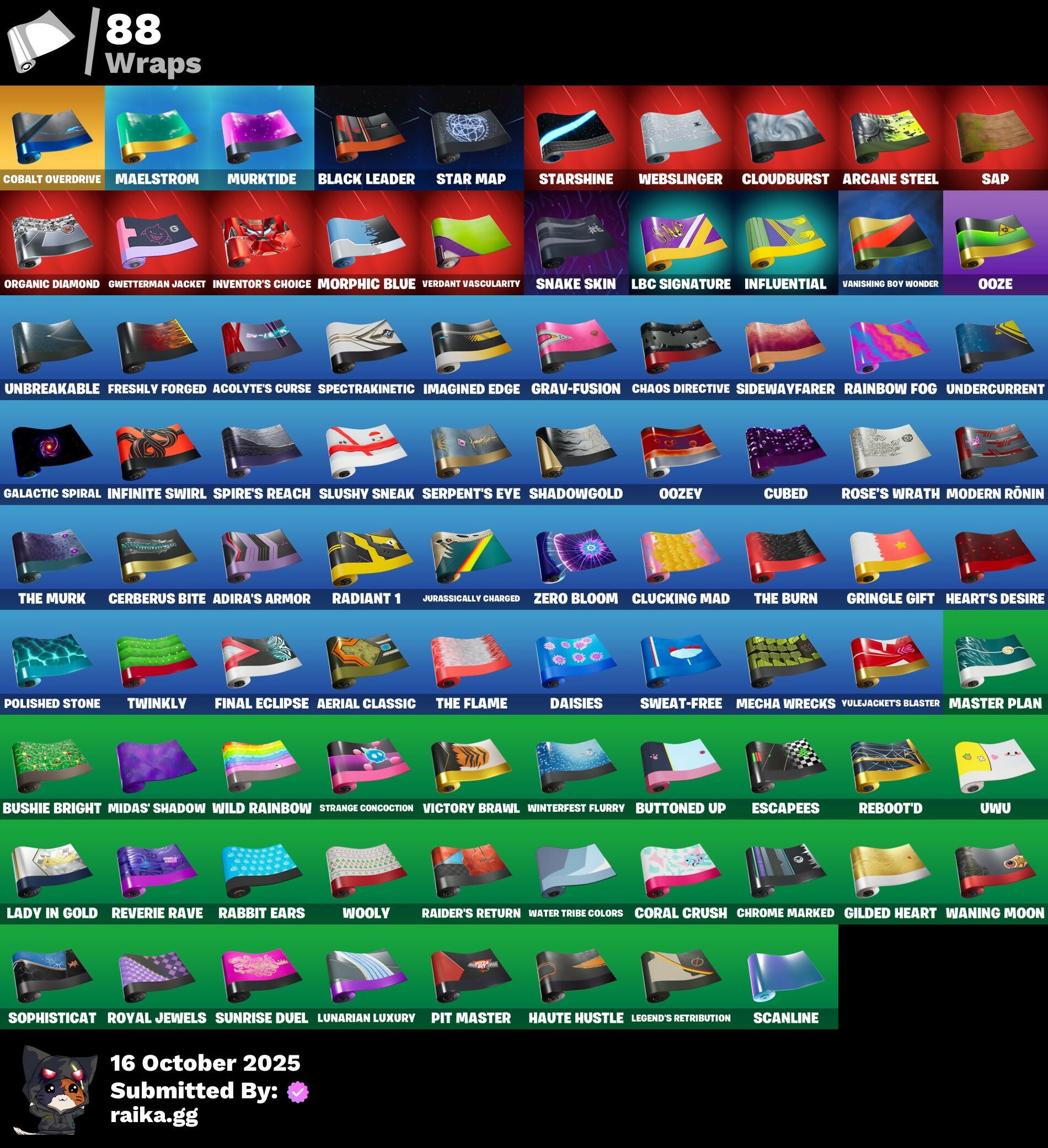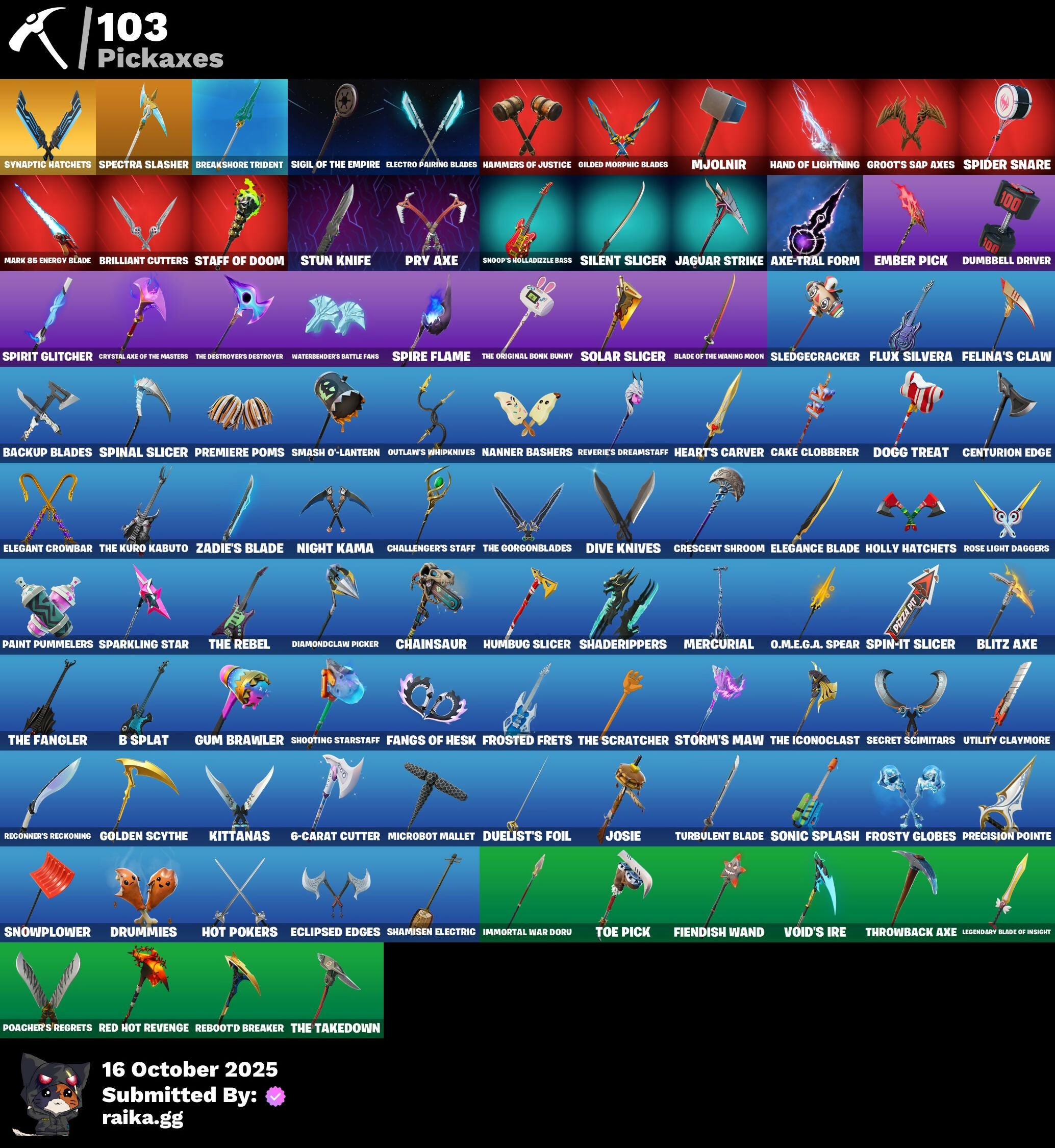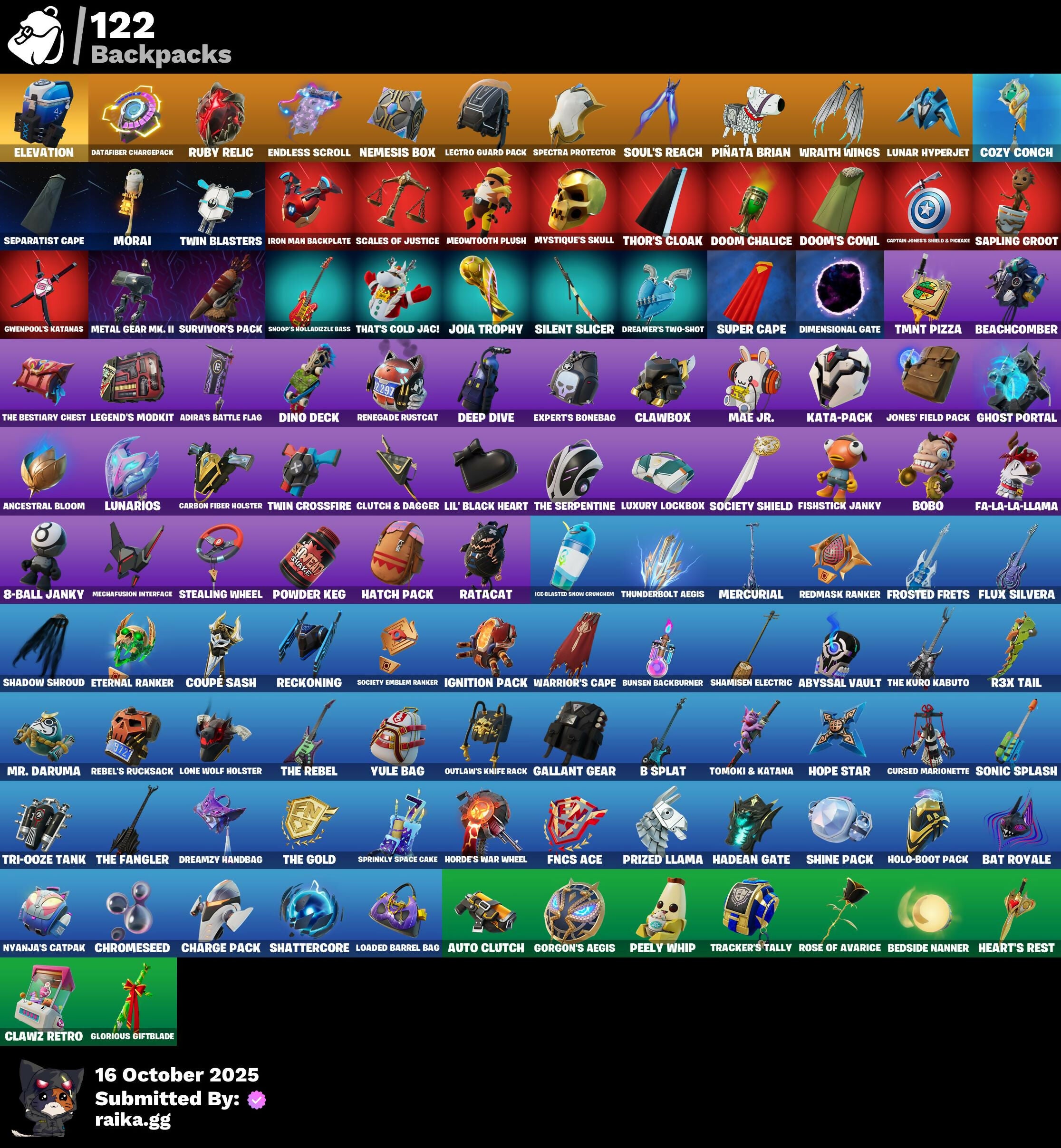 6-Carat Cutter, 8-Ball Janky, Abyssal Vault, Acolyte's Curse, Adira's Armor, Adira's Battle Flag, Aerial, Aerial Classic, Aerial Swagger, Agent Jones, Agent Jones (Jump 31), Ahsoka Tano, Ancestral Bloom, Antonia, Antonia in Action, Aphrodite, Arcane Energy Glider, Arcane Steel, Ares, Aura, Auto Clutch, Avatar's Flourish, Axe-Tral Form, Azarath Metrion Zinthos!, B Splat, B.R.U.T.E. Competitor, Backup Blades, Baron's Hoard, Bat Royale, Battle Mode, Bawk Off, Beachcomber, Bean Bag, Beatzbunny, Bedside Nanner, Beef Blade, Berserker Barrage, Birthday Bud, Black Leader, Black One X-Wing, Blade Of The Waning Moon, Blitz Axe, Blocko, Bobo, Bombastic Winterfest, Bone Patrol, Boogie Down, Boots 'N' Cats, Both Eyes Open, Bounty 'Brella, Breakshore Trident, Brilliant Cutters, Bubbloon, Buffer Fish, Bullet Rider, Bunsen Backburner, Burning Ambition Valeria, Bushie Bright, Buttoned Up, Bytes' Sigil, Cacodemon, Cake Clobberer, Captain Jones's Shield & Pickaxe, Captain Llamerica, Carbon Fiber Holster, Cardistry, Cauldron Chill, Centurion, Centurion Edge, Cerberus, Cerberus Bite, Cerberus Medallion, Chainsaur, Challenger Cerberus, Challenger's Staff, Chaos Directive, Charge Pack, Charlotte's Logo, Chemist's Cloudglider, Chimpanski Wants You, Choice Knit, Chomp Cud!!, Choose Naughty, Choppy, Chrome Marked, Chromebrella, Chromeseed, Clara, Clawbox, Clawz Retro, Clean Sweep, Cliffside Soarer, Cloud Striker, Cloudburst, Cluck, Cluck (Slurpy), Clucking Mad, Clutch & Dagger, Cobalt Overdrive, Collector Kado Thorne, Combat Giller, Comfy Cats, Competitor Medusa, Conch Call, Coral Crush, Coupé Sash, Courageous Mikasa, Cozy Conch, Crack It, Crashed Chiller, Crashed Shield, Crescent Shroom, Crowning Achievement, Crystal Axe Of The Masters, Cube Marking, Cubed, Cursed Marionette, D.C. 63, Daisies, Datafiber Chargepack, Daughter of Trigon, Dawn Duelist Nisha, Dealer's Deck, Death Star 'Brella, Deep Dive, Demons Beware, Denied, Determined Korra, Determined Renegade, Diamond Diva, Diamond Throne, Diamondclaw Picker, Dice Roll, Dimensional Gate, Dino Deck, Diva's Grin, Dive Knives, Doctor Doom, Dogg Treat, Doom Chalice, Doom's Cowl, Dragon Rune Lances, Dragon Spirit, Dreamer's Two-Shot, Dreamzy Handbag, Drones-V View, Dropout, Drummies, Duelist's Foil, Dumbbell Driver, Dumbell Driver, Eclipse Brella, Eclipsed Edges, Eggar, Electro Pairing Blades, Elegance Blade, Elegant Crowbar, Elevation, Elite Servo, Ember Pick, Emma's Influence, Endless Scroll, Escapees, Eternal Ranker, Evasive Maneuvers, Expert's Bonebag, Eye of Agamotto, FNCS Ace, Fa-La-La-Llama, Fangs Of Hesk, Felina, Felina's Claw, Fiendish Wand, Final Eclipse, Fish Thicc, Fishstick Janky, Fist Bump, Fixer, Flaky Feast, Flapjack Flyer, Flashback Breakdown, Flight Risk, Flippin' Away, Flux Silvera, Focused, Foil Flex, Fortilla Flier, Foundational 'Brella, Freshly Forged, Frosted Frets, Frosty Globes, Galactic Spiral, Gallant Gear, Gathering Storm, Get Griddy, Ghost Portal, Gilded Heart, Gilded Morphic Blades, Glorious Giftblade, Glyph Master, God Emperor Doom, Golden Scythe, Golden Wolf, Gorgon's Aegis, Grand Glacier Glider, Grav-Fusion, Grim King Hades, Gringle Gift, Groot, Groot Glow, Groots Sap Axes, Grriz, Guggi Was Here, Gum Brawler, Gumbo, Gwenpool's Katanas, Gwetterman Jacket, Hadean Gate, Hades Insignia, Hammerhead, Hammers Of Justice, Hand Of Lightning, Har-Har-Har!, Hatch Pack, Haute Hustle, Have A Seat, Haven, Heart Collector, Heart's Carver, Heart's Desire, Heart's Rest, Heartwinder, Heavy Metal Omega, High Society Glider, Holiday Boxy, Holly Hatchets, Holo-Boot Pack, Hope, Hope Star, Hope's Look, Hordes War Wheel, Hot Pokers, Humbug Slicer, Hunter's Crest, Hypno-Bat, I'm A Mystery, IO Field Flyer, Ice-Blasted Snow Cruncher, Ignition Pack, Imagined Edge, Imagined Order, Immortal War Doru, Imperial March, In Her Sights, Infinite Swirl, Influential, Introducing..., Invasion, Inventor's Choice, Iron Man, Iron Man Backplate, It Is Finished, It's Like This, It's... You?, Jaguar Strike, Je Suis Montague, Jennifer Walters, Jet Signals, Joia Trophy, Jones Underground, Jones' Field Pack, Josie, Jumbo Popcorn, Jurassically Charged, Ka-Choom!, Kablammo!, Kado Thorne, Kata-Pack, Khaby Lame, King Flamingo, King Wings, King's Seal, Kittanas, Knife Sharpener, Knight's Helm, Knight's Honor, Korra, Krisabelle, Kymera Swarm, LBC Signature, Lady In Gold, Lara Croft, Lectro Guard Pack, Legend's Modkit, Legend's Retribution, Legendary Blade Of Insight, Lightning King, Lil Split, Lil' Black Heart, Lil' T-6 Shuttle, Loaded Barrel Bag, Lone Wolf Holster, Lord Vader, Love It!, Lunar Hyperjet, Lunar Skyspan, Lunarian Luxury, Lunarios, Luxury Lockbox, Ma-Ya-Hi, Mad Mask, Mae, Mae Jr., Mae's Sigil, Maelstrom, Mark 85 Energy Blade, Mark 90 Flight Pack, Mask of Balance, Master Plan, Mecha Wrecks, Mechafusion Interface, Medusa, Meow Skulls, Meow-Wow-Wow!, Meowtooth Plush, Mercurial, Metal Gear Mk. II, Microbot Mallet, Midas' Shadow, Mighty Marvel 'Brella, Missing: Peely, Mjolnir, Mjolnir Strike, Mjolnir's Path, Modern Rōnin, Montague, Morai, Morphic Blue, Mr. Daruma, Murktide, Mystique, Mystique's Skull, Nailed It, Nanner Bashers, Nemesis Box, Never Yield, Neymar Jr, Neymar Jr., Night Kama, Ninja Stance: Donnie, Ninja Stance: Leo, Ninja Stance: Mikey, Ninja Stance: Raph, Nisha, Nolan Chance, Nolan Takes Aim, Nolan's Sigil, Nyanja's Catpak, O.M.E.G.A. Spear, Old Snake, Oopsy Drones-V, Ooze, Oozey, Organic Diamond, Oscar, Outlaw's Knife Rack, Outlaw's Whipknives, Paint Pummellers, Paradigm (Reality-659), Peelverine's Attack, Peely Whip, Peppermint Paraglider, Perfect Pivot, Peter Griffin, Petercopter, Petervision, Piercing Ace, Piper Pace, Pit Faller, Pit Master, Pitcycle, Pizza Pit, Pizza Run, Piñata Brian, Planet, Poacher's Regrets, Point & Shoot, Polar Peely, Polished Stone, Popular Vibe, Poseidon, Powder Keg, Precision Pointe, Premiere Poms, Primal Hunter, Prismatic Keepsakes, Prized Llama, Pry Axe, Punk Ororo, Punk Powerglider, Puppet's Prowl, R3x Tail, Rabbit Ears, Racer's In