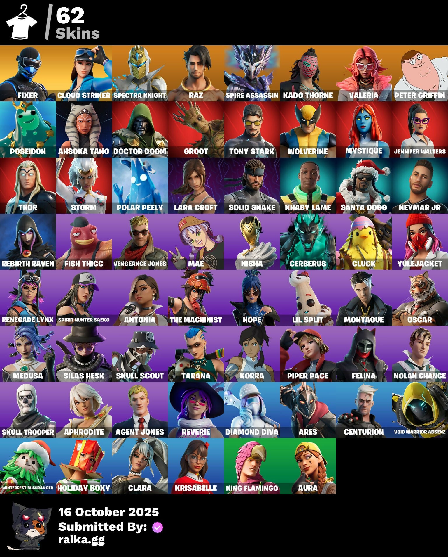[PC/PSN/XBOX] 62 skins | Lara Croft | Fixer | Cloud Striker | Spectra Knight | Raz | Spire Assassin | Kado Thorne | Valeria | Peter Griffin | Poseidon | 300 VB / FN