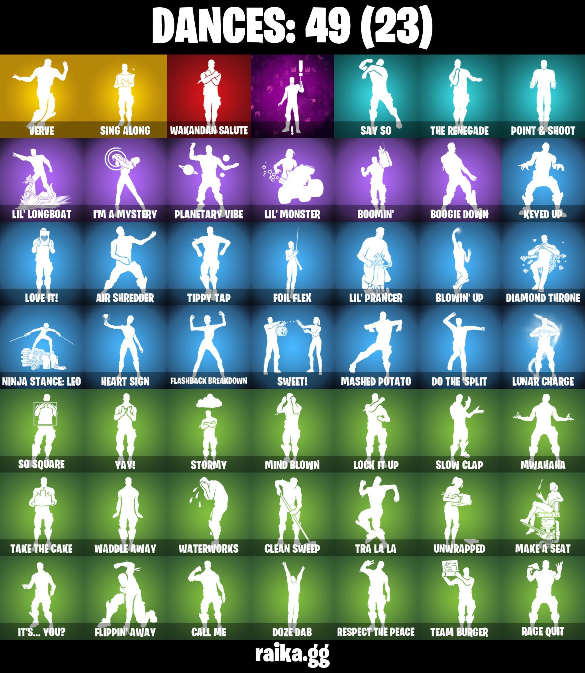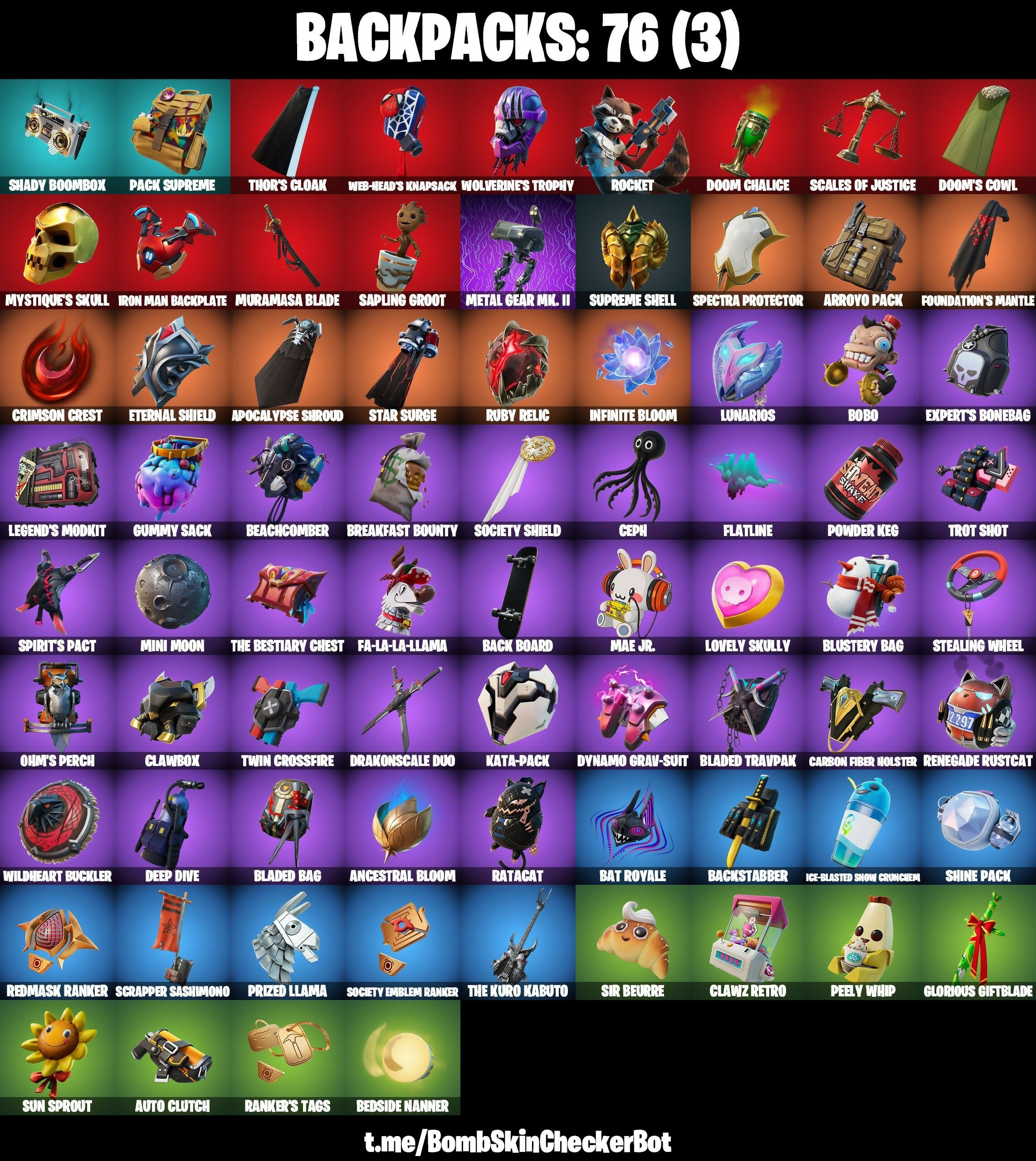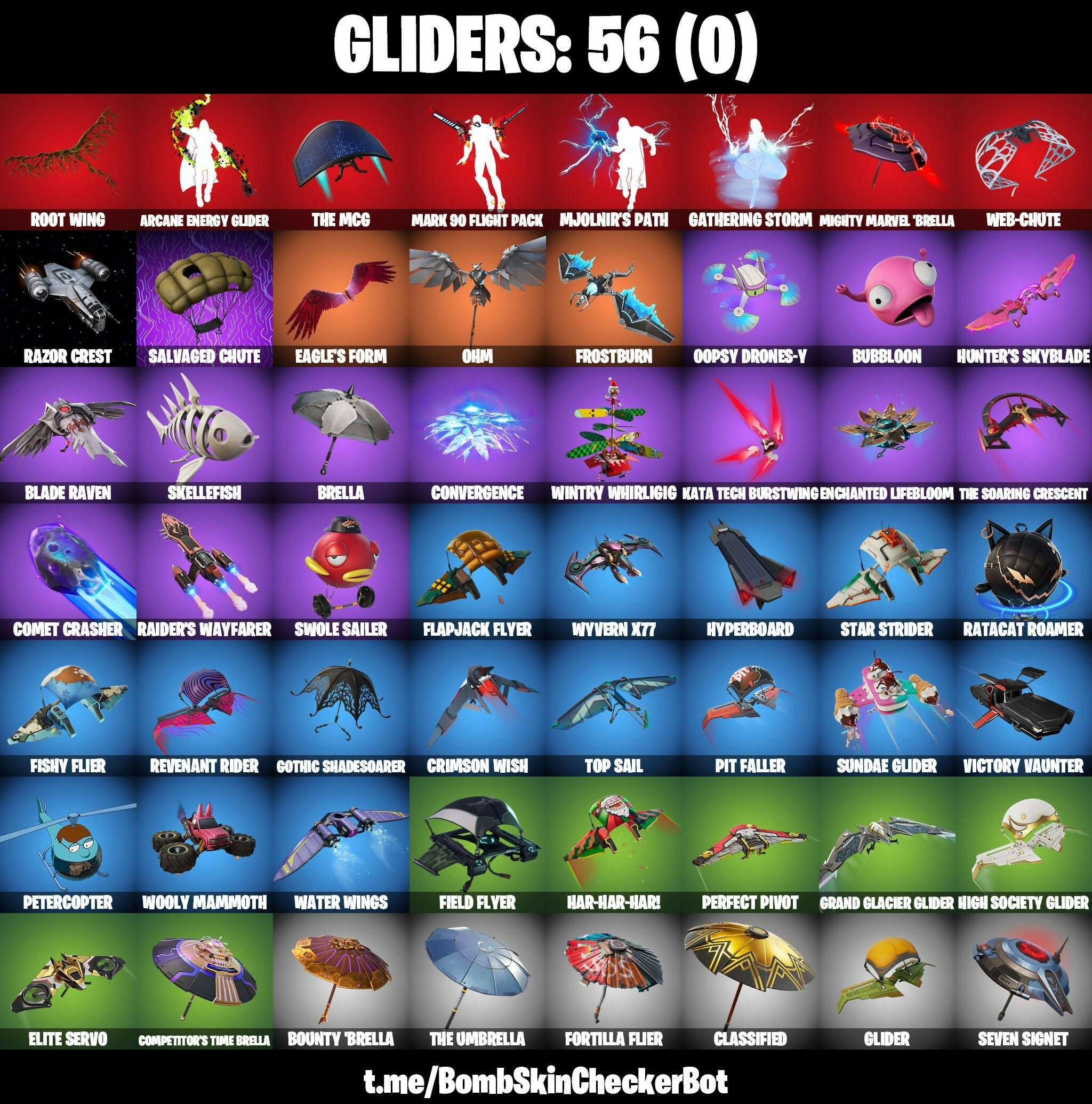 Aftermath, Air Shredder, Ancestral Bloom, Apocalypse Shroud, Aquaman, Arcane Energy Glider, Arctic Adeline, Arroyo Pack, Auto Clutch, Back Board, Backstabber, Basic Basher, Bat Royale, Beachcomber, Bedside Nanner, Blade Raven, Bladed Bag, Bladed Travpak, Blowin' Up, Blustery Bag, Bobo, Boogie Down, Boomin', Bounty 'Brella, Breakfast Bounty, Brella, Bubbloon, Call Me, Carbon Fiber Holster, Ceph, Classified, Clawbox, Clawz Retro, Clean Sweep, Comet Crasher, Competitor's Time Brella, Convergence, Crimson Crest, Crimson Wish, Deep Dive, Diamond Diva, Diamond Throne, Do The 'Split, Doctor Doom, Doom Chalice, Doom's Cowl, Doze Dab, Drakon Steel Hybrid, Drakonscale Duo, Dynamo Grav-Suit, Eagle's Form, Elite Servo, Enchanted Lifebloom, Eternal Knight, Eternal Shield, Evie, Expert's Bonebag, Fa-la-la-llama, Fade, Field Flyer, Fishy Flier, Flapjack Flyer, Flashback Breakdown, Flatline, Flippin' Away, Foil Flex, Forbidden Ace, Fortilla Flier, Foundation's Mantle, Frostburn, Gathering Storm, Glider, Glorious Giftblade, Gothic Shadesoarer, Grand Glacier Glider, Groot, Guff Gringle, Gumbo, Gummy Sack, Har-Har-Har!, Harlowe, Haven, Heart Sign, High Society Glider, Holiday Boxy, Hope, Hunter's Skyblade, Hyperboard, I'm A Mystery, Ice-Blasted Snow Crunchiem, Infinite Bloom, Iron Man Backplate, It's... You?, Jennifer Walters, Jules, Kata Tech Burstwing, Kata-Pack, Keyed Up, Kit, Kondor, Legend's Modkit, Lexa, Lil Split, Lil' Longboat, Lil' Monster, Lil' Prancer, Lock It Up, Love It!, Lovely Skully, Lt. John Llama, Lunar Charge, Lunarios, Mae Jr., Make A Seat, Mancake, Mandalorian, Manic, Mark 90 Flight Pack, Mashed Potato, Mave, Metal Gear Mk. II, Mighty Marvel 'Brella, Mind Blown, Mini Moon, Mjolnir's Path, Montague, Muramasa Blade, Mwahaha, Mystique, Mystique's Skull, Nathan Drake, Ninja Stance: Leo, Nisha, Ocean, Ohm, Ohm's Perch, Ol' Woody, Omegarok, Oopsy Drones-Y, Oscar, Pack Supreme, Peely Whip, Perfect Pivot, Petercopter, Phaedra, Pit Faller, Planetary Vibe, Point & Shoot, Powder Keg, Predator, Prized Llama, Rage Quit, Raider's Wayfarer, Ranker's Tags, Ratacat, Ratacat Roamer, Razor Crest, Red Strike, Redmask Ranker, Reese, Renegade Lynx, Renegade Rustcat, Respect The Peace, Revenant Rider, Rocket, Ronin, Root Wing, Ruby Relic, Runway Racer, Salvaged Chute, Samurai Scrapper, Sapling Groot, Say So, Scales of Justice, Scarlet Commander, Scrapper Sashimono, Scuba Jonesy, Seven Signet, Shady Boombox, Shanta, Shine Pack, Sing Along, Siona, Sir Beurre, Skellefish, Skull Scout, Slim Shady, Slow Clap, Snap, So Square, Society Emblem Ranker, Society Shield, Solid Snake, Spectra Knight, Spectra Protector, Spider-Man, Spirit's Pact, Star Strider, Star Surge, Stealing Wheel, Storm, Stormy, Sun Sprout, Sundae Glider, Supreme Shell, Sweet!, Swole Sailer, Take The Cake, Team Burger, The Bestiary Chest, The Foundation, The Kuro Kabuto, The McG, The Renegade, The Soaring Crescent, The Umbrella, Thor, Thor's Cloak, Tippy Tap, Tony Stark, Top Sail, Tra La La, Tracy Trouble, Trot Shot, Tsuki 2.0, Tune Squad Lebron, Twin Crossfire, Unwrapped, Vengeance Jones, Verve, Victory Vaunter, Waddle Away, Wakandan Salute, Water Wings, Waterworks, Web-Chute, Web-Head's Knapsack, Wildheart Buckler, Winterfest Bushranger, Wintry Whirligig, Wolverine Zero, Wolverine's Trophy, Wooly Mammoth, Wyvern X77, Yay!, Yellowjacket