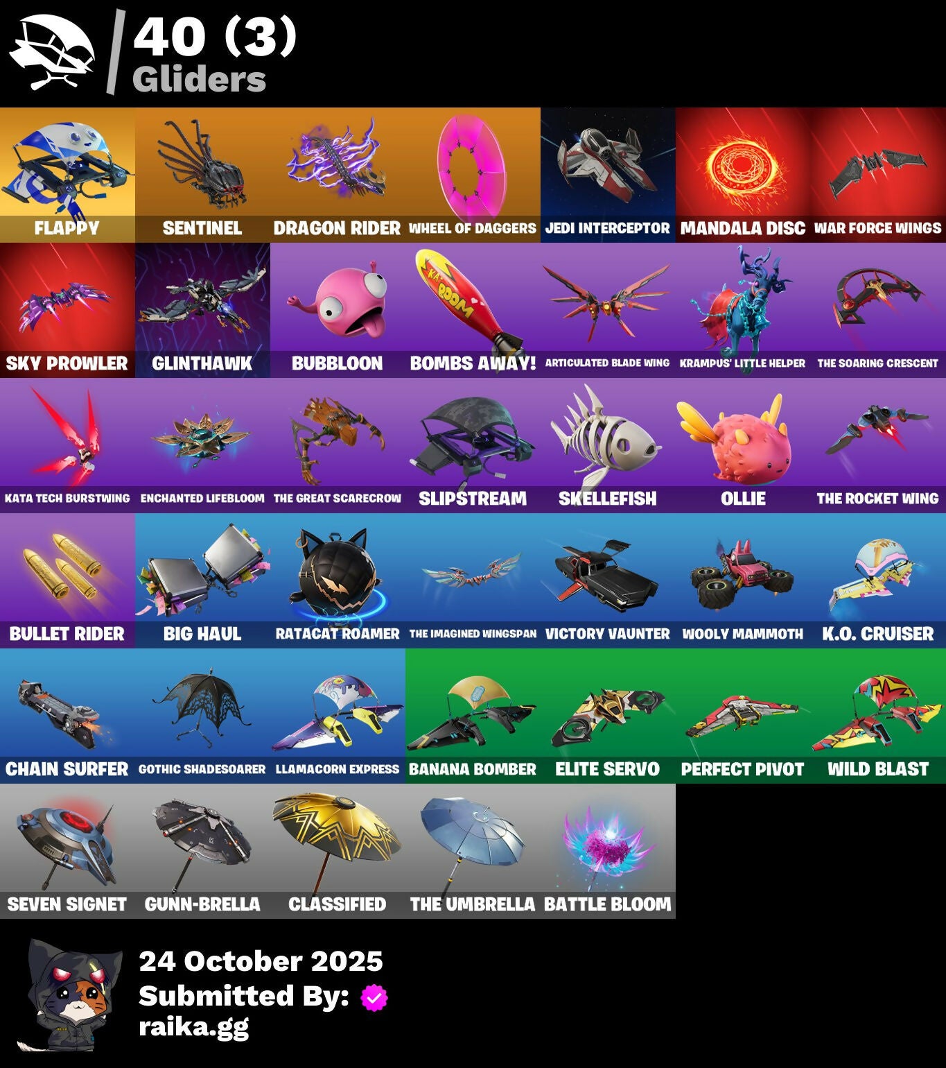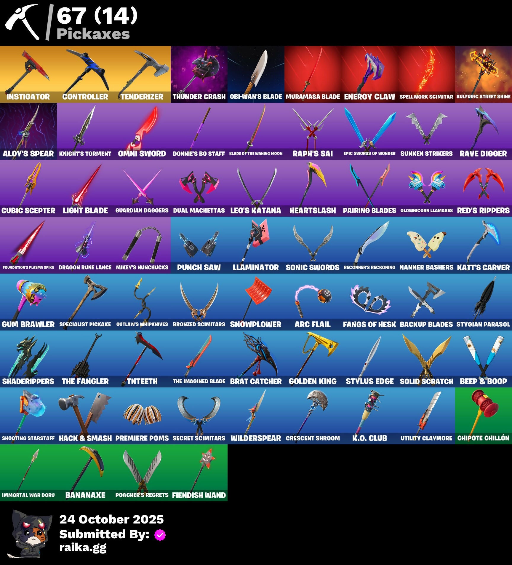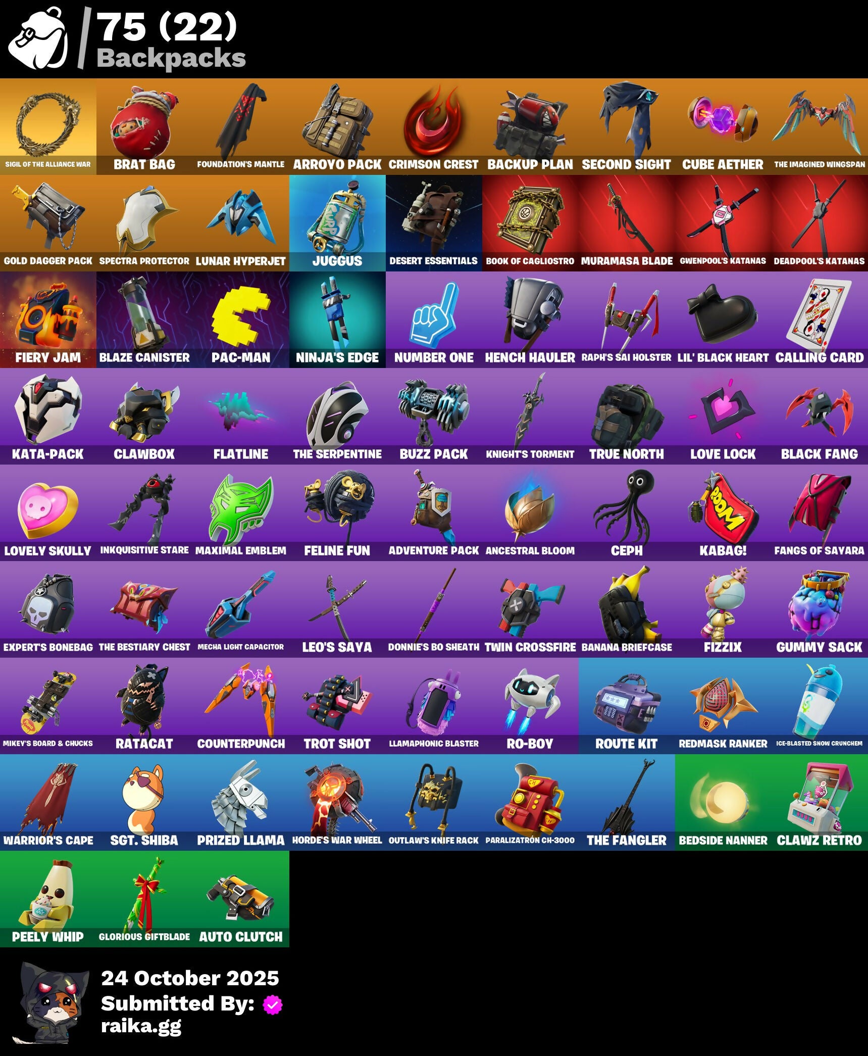 2.0's Revenge, Adira, Adira's Armor, Adventure Pack, Aftermath, Agent Nana, Agent Peely, Aloy, Aloy's Spear, Ancestral Bloom, Arc Flail, Ares, Arroyo Pack, Articulated Blade Wing, Aurum Eques, Auto Clutch, Backup Blades, Backup Plan, Banana Bomber, Banana Briefcase, Bananaxe, Banner, Banner Icon, Battle Bloom, Battle Mode, Bedside Nanner, Beep & Boop, Beep Beep, Big Chuggus, Big Guns, Big Haul, Birdie, Black Fang, Blade Of The Waning Moon, Blasted, Blaze Canister, Blocko, Bombastic Winterfest, Bombs Away!, Book Of Cagliostro, Brat Bag, Brat Catcher, Bronzed Scimitars, Brutus, Bubbaloon, Bullet Rider, Bushie Bright, Buzz Pack, Calico, Call Me, Calling Card, Cap K.O., Cash Grab, Cauldron Chill, Ceph, Cerberus, Chain Surfer, Charlotte's Logo, Chipote Chillón, Chomp Cud!!, Classified, Clawbox, Clawz Retro, Coin Flip, Combat Elite, Comet, Conjure Weapon, Controller, Counterpunch, Cowboy Chat, Crescent Shroom, Crimson Crest, Crowning Achievement, Crystaline, Cube Aether, Cubic Scepter, Cyclo Curl, D.C. 63, Dagger Dance, Deadeye, Deadpool, Deadpool's Katanas, Demons Beware, Denim Destiny, Desert Essentials, Doctor Strange, Donatello, Donnie's Bo Sheath, Donnie's Bo Staff, Doze Dab, Dragon Rider, Dragon Rune Lance, Dual Machettas, Dynamite, El Chapulín Colorado, Elite Servo, Elite's Sigil, Enchanted Lifebloom, Energy Claw, Epic Swords Of Wonder, Erisa, Erisa Alert, Erisa's Crest, Everything's Fine, Evie, Expert's Bonebag, Eye Of Agamotto, Fangs Of Hesk, Fangs Of Savara, Feline Fun, Fiendish Wand, Fiery Flow, Fiery Jam, Fishbone, Fizzix, Flappy, Flatline, Flippin' Away, Foundation's Mantle, Foundation's Plasma Spike, Foundational, Freestylin', Fryangles, Galaxian, Gear Specialist Maya, Geared Up, Glinthawk, Glitter N' Grim, Glorious Giftblade, Glownicorn Llamaxes, Gold Dagger Pack, Gold Touch, Golden King, Golden Shine, Gothic Shadesoarer, Guardian Daggers, Gum Brawler, Gumbo, Gummy Sack, Gunn-Brella, Gunnar, Gunnar's Special, Gwenpool's Katanas, Gwetterman Jacket, Hack & Smash, Haute Hustle, Haven, Havoc, Heart Sign, Heart's Desire, Heart-Rizon, Heartslash, Hench, Hench Hauler, Here Comes Trubble, Hidden Haven, Holiday Boxy, Hop And A Wink, Hope, Hope's Look, Horde's War Wheel, I Am Fearless, I'm A Mystery, Ice Hunter Aloy, Ice-Blasted Snow Crunchem, If Looks Could..., Imagined, Immortal War Doru, In Her Sights, Inquisitive Stare, Instigator, Jedi Interceptor, Juggus, Jungle King, K.O. Club, K.O. Cruiser, Ka-choom!, Kabag!, Kaboom!, Kata Tech Burstwing, Kata-Pack, Katt, Katt's Carver, Kiara K.O., Knight's Honor, Knight's Torment, Krampus, Krampus' Little Helper, Lana Llane, Leo's Katana, Leo's Saya, Leonardo, Light Blade, Lil' Black Heart, Lil' Monster, Llamacorn Express, Llamaphonic Blaster, Llaminator, Lloose Cannon, Lobby Classic, Lotus Touch, Love It!, Love Lock, Loveless, Lovely Skully, Lt. John Llama, Lunar Charge, Lunar Hyperjet, Mandala Disc, Mark Of The Prowler, Mask Off, Maximal Emblem, Mecha, Mecha Light Capacitor, Mecha Reborn, Mecha Strike Commander, Menacing Trace, Meowscles, Michelangelo, Midas, Midas Memory, Mighty Tree, Mikey's Board & Chucks, Mikey's Nunchucks, Muramasa Blade, Mwahaha, Nanner Bashers, Ninja, Ninja's Edge, Nomad's Treasure, Number One, Obi-Wan Kenobi, Obi-Wan's Blade, Obi-Wan's Message, Off, Ollie, Omega Knight, Omni Sword, Optimus Primal, Original Issue, Oscar, Outlaw's Knife Rack, Outlaw's Whipknives, Pac-Brained, Pac-Man, Pairing Blades, Pandemonium, Paradigm (Reality-659), Paralizatron CH-3000, Paws & Claws, Peace, Peely Whip, Per Aspera Ad Astra, Perfect Pivot, Phaedra, Poacher's Regrets, Premiere Poms, Prized Llama, Prowler, Prowler Tag, Punch Saw, Raider's Return, Raph's Sai, Raph's Sai Holster, Raphael, Ratacat, Ratacat Roamer, Rave Digger, Reconner's Reckoning, Red Claw, Red's Rippers, Redmask Ranker, Ride The Corn!, Ro-Boy, Ronin, Ronin's Mission, Roses, Route Kit, Sayara, Sayara Sight, Second Sight, Secret Scimitars, Segway Tour, Sentinel, Seven Signet, Sgt. Shiba, Shaderippers, Shanta, Shanta's Lifebloom, Shield-Weaver, Shooting Shuffle, Shooting Starstaff, Shredded Red, Side Hustle, Sidewayfarer, Sigil Of The Alliance War, Silas Hesk, Skellefish, Skull Scout, Sky Prowler, Skye, Slap Juice., Slipstream, Slurp Co., Snap, Snowplower, Solid Profile, Solid Scratch, Sonic Swords, Southpaw, Specialist Pickaxe, Spectra Protector, Spectrakinetic, Spellwork Scimitar, Springy, Spy Vs Banana, Sticker 'Em Up, Stygian Parasol, Style Supreme, Stylus Edge, Sub Commander, Sulfuric Street Shine, Sunglasses, Sunken Strikers, Sweat-Free, Syndicate, Syndicate Strike, Take A 'Bow, Tao Mandalas, Tardis, Tectonic Komplex, Tenderizer, The Bestiary Chest, The Dip, The Fangler, The Foundation, The Great Scarecrow, The Imagined, The Imagined Aura, The Imagined Blade, The Imagined Wingspan, The Inquisitor, The Macarena, The Origin, The Rocket Wing, The Serpentine, The Soaring Crescent, The Umbrella, Thunder Crash, Tnteeth, Tntina, Tracy Trouble, Tracy's Arsenal, Trailblazer, Trot Shot, Troubled Gum, True Foundation, True North, Tsuki 2.0, Twin Crossfire, Twinkly, Utility Claymore, Vibrant Boogie, Vibrant Heart, Vibrant Llama, Vibrant Star, Vibrant Vibin', Victory Brawl, Victory Vaunter, Wade Grenade, Waning Moon, War Force Wings, Warrior's Cape, Wheel Of Daggers, Wild Blast, Wild Rainbow, Wilderspear, Winterfest Bushranger, Winterfest Flurry, Wolverine Zero, Wooly Mammoth, Zoe Clash