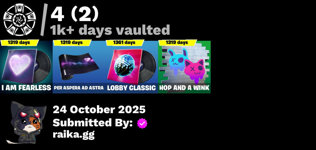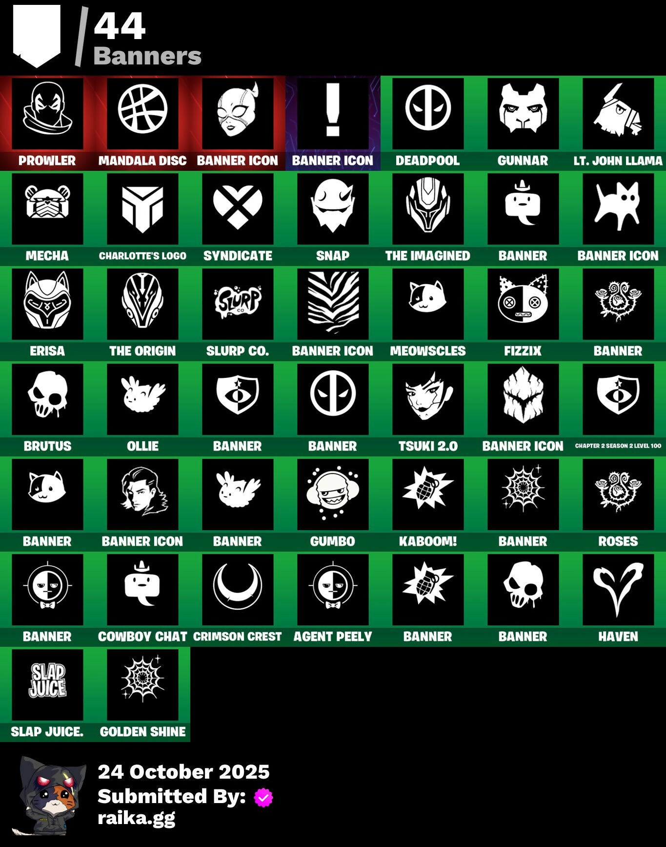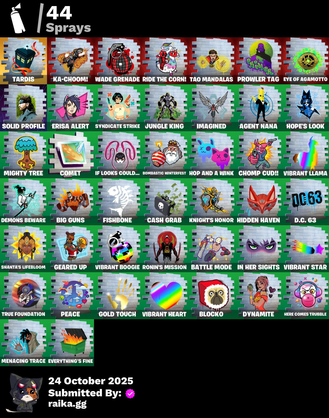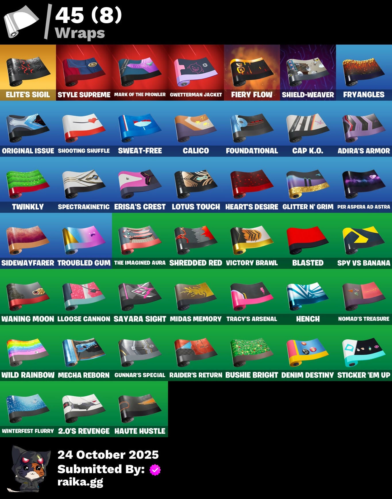 2.0's Revenge, Adira, Adira's Armor, Adventure Pack, Aftermath, Agent Nana, Agent Peely, Aloy, Aloy's Spear, Ancestral Bloom, Arc Flail, Ares, Arroyo Pack, Articulated Blade Wing, Aurum Eques, Auto Clutch, Backup Blades, Backup Plan, Banana Bomber, Banana Briefcase, Bananaxe, Banner, Banner Icon, Battle Bloom, Battle Mode, Bedside Nanner, Beep & Boop, Beep Beep, Big Chuggus, Big Guns, Big Haul, Birdie, Black Fang, Blade Of The Waning Moon, Blasted, Blaze Canister, Blocko, Bombastic Winterfest, Bombs Away!, Book Of Cagliostro, Brat Bag, Brat Catcher, Bronzed Scimitars, Brutus, Bubbaloon, Bullet Rider, Bushie Bright, Buzz Pack, Calico, Call Me, Calling Card, Cap K.O., Cash Grab, Cauldron Chill, Ceph, Cerberus, Chain Surfer, Charlotte's Logo, Chipote Chillón, Chomp Cud!!, Classified, Clawbox, Clawz Retro, Coin Flip, Combat Elite, Comet, Conjure Weapon, Controller, Counterpunch, Cowboy Chat, Crescent Shroom, Crimson Crest, Crowning Achievement, Crystaline, Cube Aether, Cubic Scepter, Cyclo Curl, D.C. 63, Dagger Dance, Deadeye, Deadpool, Deadpool's Katanas, Demons Beware, Denim Destiny, Desert Essentials, Doctor Strange, Donatello, Donnie's Bo Sheath, Donnie's Bo Staff, Doze Dab, Dragon Rider, Dragon Rune Lance, Dual Machettas, Dynamite, El Chapulín Colorado, Elite Servo, Elite's Sigil, Enchanted Lifebloom, Energy Claw, Epic Swords Of Wonder, Erisa, Erisa Alert, Erisa's Crest, Everything's Fine, Evie, Expert's Bonebag, Eye Of Agamotto, Fangs Of Hesk, Fangs Of Savara, Feline Fun, Fiendish Wand, Fiery Flow, Fiery Jam, Fishbone, Fizzix, Flappy, Flatline, Flippin' Away, Foundation's Mantle, Foundation's Plasma Spike, Foundational, Freestylin', Fryangles, Galaxian, Gear Specialist Maya, Geared Up, Glinthawk, Glitter N' Grim, Glorious Giftblade, Glownicorn Llamaxes, Gold Dagger Pack, Gold Touch, Golden King, Golden Shine, Gothic Shadesoarer, Guardian Daggers, Gum Brawler, Gumbo, Gummy Sack, Gunn-Brella, Gunnar, Gunnar's Special, Gwenpool's Katanas, Gwetterman Jacket, Hack & Smash, Haute Hustle, Haven, Havoc, Heart Sign, Heart's Desire, Heart-Rizon, Heartslash, Hench, Hench Hauler, Here Comes Trubble, Hidden Haven, Holiday Boxy, Hop And A Wink, Hope, Hope's Look, Horde's War Wheel, I Am Fearless, I'm A Mystery, Ice Hunter Aloy, Ice-Blasted Snow Crunchem, If Looks Could..., Imagined, Immortal War Doru, In Her Sights, Inquisitive Stare, Instigator, Jedi Interceptor, Juggus, Jungle King, K.O. Club, K.O. Cruiser, Ka-choom!, Kabag!, Kaboom!, Kata Tech Burstwing, Kata-Pack, Katt, Katt's Carver, Kiara K.O., Knight's Honor, Knight's Torment, Krampus, Krampus' Little Helper, Lana Llane, Leo's Katana, Leo's Saya, Leonardo, Light Blade, Lil' Black Heart, Lil' Monster, Llamacorn Express, Llamaphonic Blaster, Llaminator, Lloose Cannon, Lobby Classic, Lotus Touch, Love It!, Love Lock, Loveless, Lovely Skully, Lt. John Llama, Lunar Charge, Lunar Hyperjet, Mandala Disc, Mark Of The Prowler, Mask Off, Maximal Emblem, Mecha, Mecha Light Capacitor, Mecha Reborn, Mecha Strike Commander, Menacing Trace, Meowscles, Michelangelo, Midas, Midas Memory, Mighty Tree, Mikey's Board & Chucks, Mikey's Nunchucks, Muramasa Blade, Mwahaha, Nanner Bashers, Ninja, Ninja's Edge, Nomad's Treasure, Number One, Obi-Wan Kenobi, Obi-Wan's Blade, Obi-Wan's Message, Off, Ollie, Omega Knight, Omni Sword, Optimus Primal, Original Issue, Oscar, Outlaw's Knife Rack, Outlaw's Whipknives, Pac-Brained, Pac-Man, Pairing Blades, Pandemonium, Paradigm (Reality-659), Paralizatron CH-3000, Paws & Claws, Peace, Peely Whip, Per Aspera Ad Astra, Perfect Pivot, Phaedra, Poacher's Regrets, Premiere Poms, Prized Llama, Prowler, Prowler Tag, Punch Saw, Raider's Return, Raph's Sai, Raph's Sai Holster, Raphael, Ratacat, Ratacat Roamer, Rave Digger, Reconner's Reckoning, Red Claw, Red's Rippers, Redmask Ranker, Ride The Corn!, Ro-Boy, Ronin, Ronin's Mission, Roses, Route Kit, Sayara, Sayara Sight, Second Sight, Secret Scimitars, Segway Tour, Sentinel, Seven Signet, Sgt. Shiba, Shaderippers, Shanta, Shanta's Lifebloom, Shield-Weaver, Shooting Shuffle, Shooting Starstaff, Shredded Red, Side Hustle, Sidewayfarer, Sigil Of The Alliance War, Silas Hesk, Skellefish, Skull Scout, Sky Prowler, Skye, Slap Juice., Slipstream, Slurp Co., Snap, Snowplower, Solid Profile, Solid Scratch, Sonic Swords, Southpaw, Specialist Pickaxe, Spectra Protector, Spectrakinetic, Spellwork Scimitar, Springy, Spy Vs Banana, Sticker 'Em Up, Stygian Parasol, Style Supreme, Stylus Edge, Sub Commander, Sulfuric Street Shine, Sunglasses, Sunken Strikers, Sweat-Free, Syndicate, Syndicate Strike, Take A 'Bow, Tao Mandalas, Tardis, Tectonic Komplex, Tenderizer, The Bestiary Chest, The Dip, The Fangler, The Foundation, The Great Scarecrow, The Imagined, The Imagined Aura, The Imagined Blade, The Imagined Wingspan, The Inquisitor, The Macarena, The Origin, The Rocket Wing, The Serpentine, The Soaring Crescent, The Umbrella, Thunder Crash, Tnteeth, Tntina, Tracy Trouble, Tracy's Arsenal, Trailblazer, Trot Shot, Troubled Gum, True Foundation, True North, Tsuki 2.0, Twin Crossfire, Twinkly, Utility Claymore, Vibrant Boogie, Vibrant Heart, Vibrant Llama, Vibrant Star, Vibrant Vibin', Victory Brawl, Victory Vaunter, Wade Grenade, Waning Moon, War Force Wings, Warrior's Cape, Wheel Of Daggers, Wild Blast, Wild Rainbow, Wilderspear, Winterfest Bushranger, Winterfest Flurry, Wolverine Zero, Wooly Mammoth, Zoe Clash