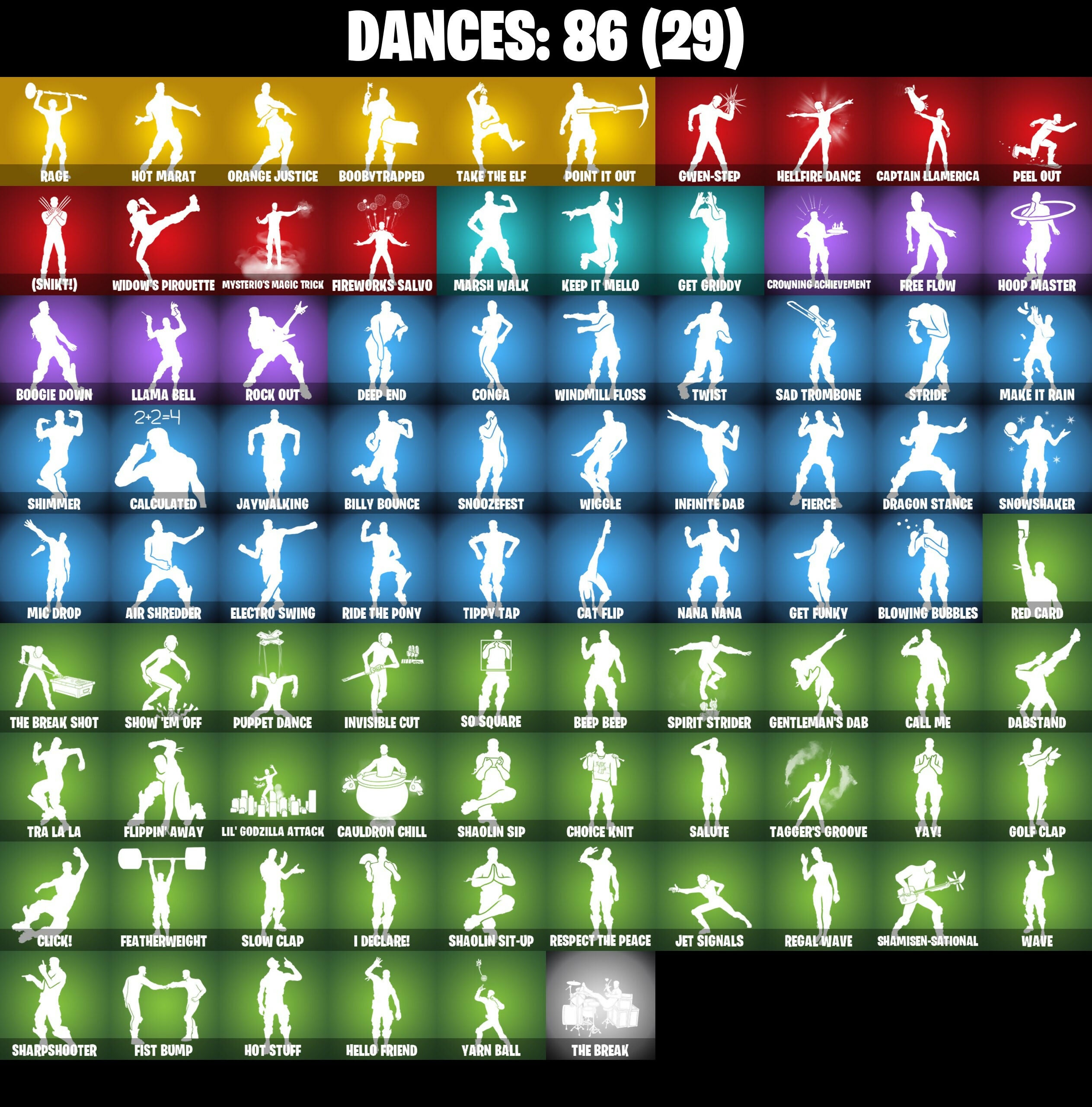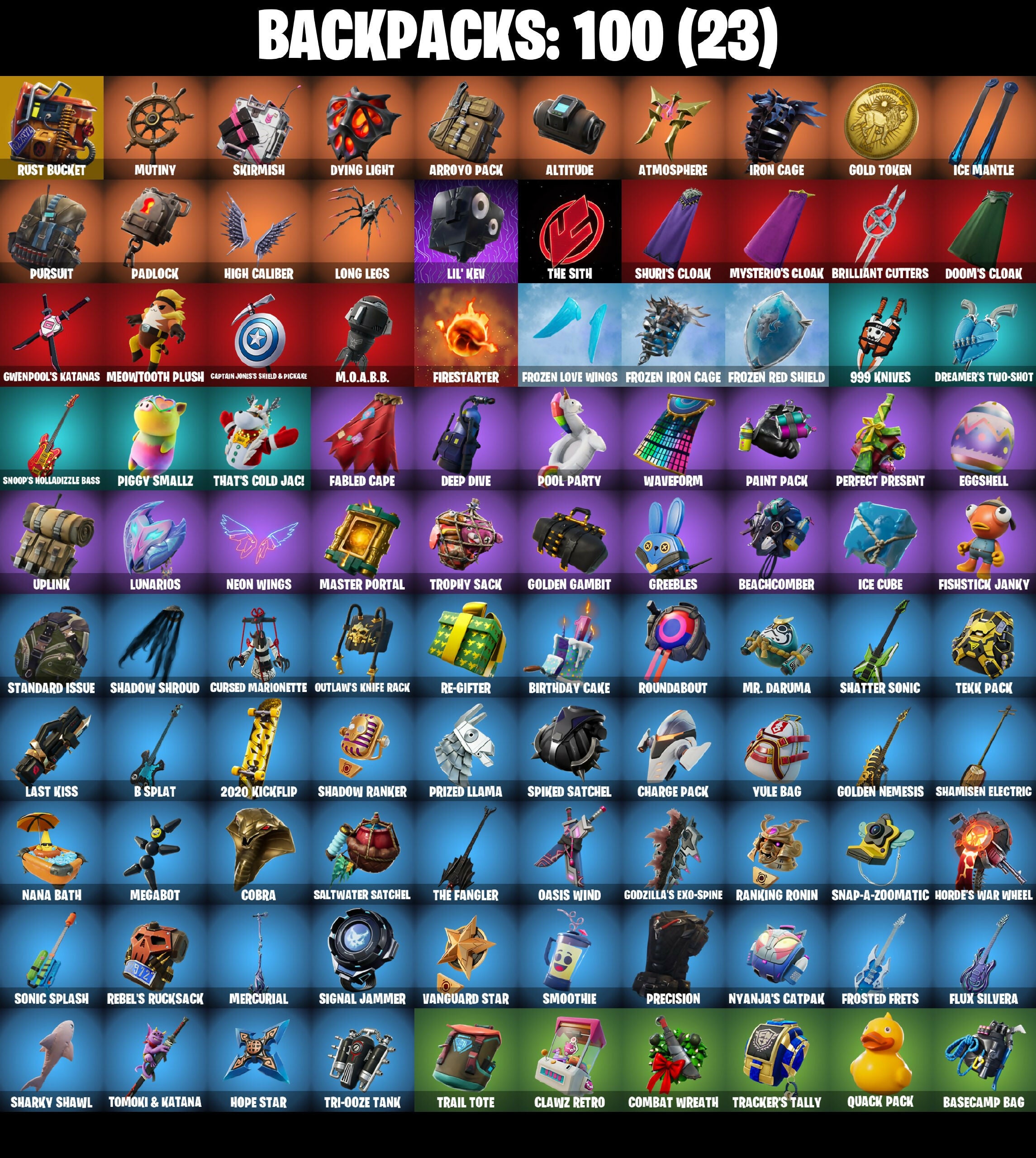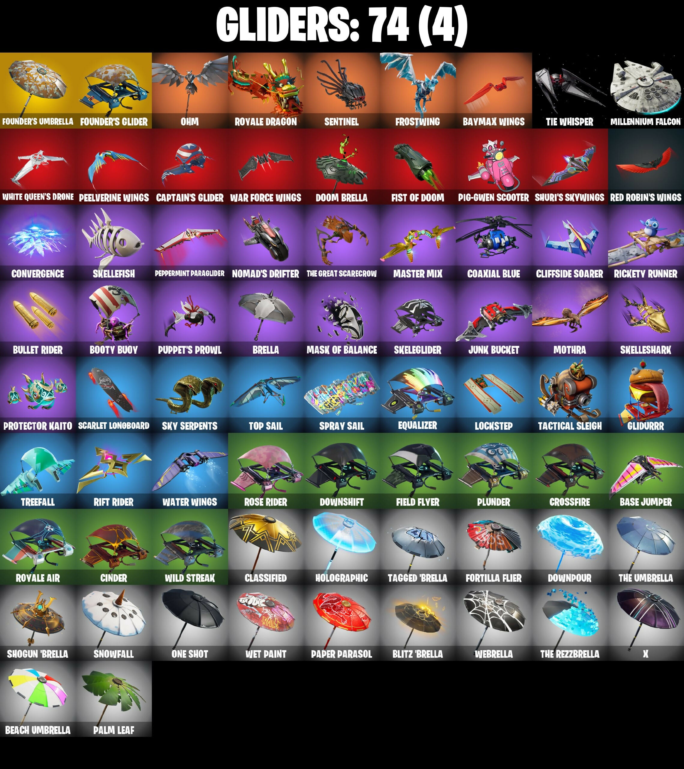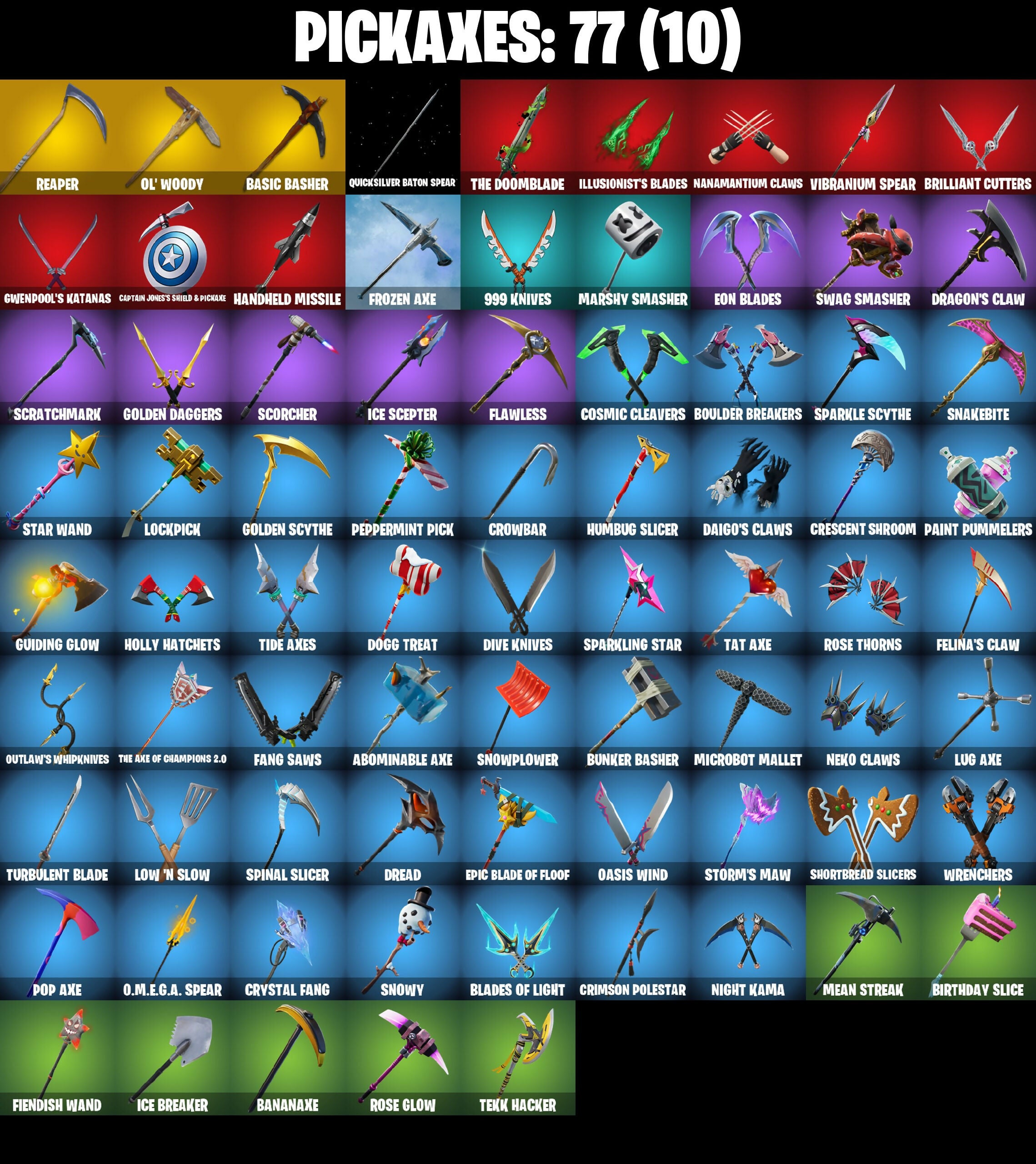 (SNIKT!), 2020 Kickflip, 999 Knives, Abominable Axe, Air Shredder, Altitude, Arachne, Ariana Grande, Arroyo Pack, Atmosphere, B Splat, Bananaxe, Base Jumper, Basecamp Bag, Basic Basher, Battle Bus Balloon, Baymax Wings, Beach Umbrella, Beachcomber, Beep Beep, Billy Bounce, Birthday Cake, Birthday Slice, Black Panther (Shuri), Black Queen, Blackheart, Blades of Light, Blaze, Blitz 'Brella, Blowing Bubbles, Boobytrapped, Boogie Down, Booty Buoy, Boulder Breakers, Bracer, Breakpoint, Brella, Brilliant Cutters, Bullet Rider, Bunker Basher, Bunny Brawler, Burnoff, Calculated, Call Me, Camo War Machine, Captain Jones, Captain Jones's Shield & Pickaxe, Captain Llamerica, Captain's Glider, Cat Flip, Catalyst, Cauldron Chill, Charge Pack, Choice Knit, Cinder, Classic Peelverine, Classified, Clawz Retro, Click!, Cliffside Soarer, Clinical Crosser, Coaxial Blue, Cobra, Combat Wreath, Conga, Convergence, Cosmic Cleavers, Cozy Chomps, Crescent Shroom, Crimson Polestar, Crossfire, Crowbar, Crowning Achievement, Crystal, Crystal Fang, Cursed Marionette, Dabstand, Daigo, Daigo's Claws, Dark, Dark Gwenpool, Deep Dive, Deep End, Demon Hunter Hope, Dive Knives, Dogg Treat, Doom, Doom Brella, Doom's Cloak, Downpour, Downshift, Dragon Stance, Dragon's Claw, Dread, Dreamer's Two-Shot, Dusk Knight, Dying Light, Eggshell, Electro Swing, Ember, Emma Frost, Energized Godzilla, Eon Blades, Epic Blade of Floof, Equalizer, Explorer Emilie, Fabled Cape, Fade, Fang Saws, Featherweight, Felina, Felina's Claw, Field Flyer, Fiendish Wand, Fierce, Firestarter, Fireworks Salvo, Fishstick Janky, Fist Bump, Fist of Doom, Flawless, Flippin' Away, Flux Silvera, Fortilla Flier, Founder's Glider, Founder's Umbrella, Free Flow, Frosted Frets, Frostwing, Frozen Axe, Frozen Iron Cage, Frozen Love Ranger, Frozen Love Wings, Frozen Raven, Frozen Red Knight, Frozen Red Shield, Gentleman's Dab, Get Funky, Get Griddy, Glidurrr, Glow, Godzilla Evolved, Godzilla's Exo-Spine, Gold, Gold Token, Golden Daggers, Golden Gambit, Golden Nemesis, Golden Scythe, Golf Clap, Greebles, Guiding Glow, Gwen-Step, Gwenpool, Gwenpool's Katanas, Handheld Missile, Hellfire Dance, Hello Friend, Helmet On, Hero Baymax, High Caliber, Holly Hatchets, Holographic, Hoodie, Hoop Master, Hope Star, Horde's War Wheel, Hot Marat, Hot Stuff, Humbug Slicer, Hybrid, I Declare!, Ice Breaker, Ice Cube, Ice Mantle, Ice Scepter, Illusionist's Blades, Illusory Mysterio, Infinite Dab, Invisible Cut, Iris, Iron Cage, Jade, Jaywalking, Jet Signals, Joltara, Jules, Junk Bucket, Keep It Mello, Kendo, Kintsugi Daigo, Last Kiss, Lil' Godzilla Attack, Lil' Kev, Llama Bell, Lockpick, Lockstep, Long Legs, Low 'N Slow, Lt. Evergreen, Lucky Nyanja, Lug Axe, Lunarios, Luxe, Lynx, M.O.A.B.B., Make It Rain, Marigold, Marsh Walk, Marshy Smasher, Mask, Mask of Balance, Masked Scuba Jonesy, Master Key, Master Mix, Master Portal, Mean Streak, Megabot, Meowtooth Plush, Mercurial, Mic Drop, Microbot Mallet, Millennium Falcon, Mothra, Mr. Dappermint, Mr. Daruma, Mutiny, Mysterio, Mysterio's Cloak, Mysterio's Magic Trick, Nana Bath, Nana Nana, Nanamatium Claws, Neko Claws, Neon Wings, Night, Night Kama, Nomad's Drifter, Nyanja, Nyanja's Catpax, O.M.E.G.A. Spear, Oasis Wind, Ocean, Ohm, Ol' Woody, One Shot, Onesie, Orange Justice, Outlaw's Knife Rack, Outlaw's Whipknives, Padlock, Paint Pack, Paint Pummeler, Palm Leaf, Paper Parasol, Par Patroller, Peel Out, Peelverine, Peelverine Wings, Peely, Peppermint Paraglider, Peppermint Pick, Perfect Present, Pig-Gwen Scooter, Piggy Smallz, Plunder, Point It Out, Pool Party, Pop Axe, Powder, Precision, Prized Llama, Protector Kaito, Puppet Dance, Puppet's Prowl, Pursuit, Quack Pack, Quicksilver Baton Spear, Rage, Ranking Ronin, Raven, Re-Gifter, Reaper, Rebel's Rucksack, Red Card, Red Jade, Red Robin's Wings, Regal Wave, Respect The Peace, Rickety Runner, Ride The Pony, Rift Rider, Riptide Ocean, Rock Out, Rose Glow, Rose Rider, Rose Team Leader, Rose Thorns, Roundabout, Royale Air, Royale Dragon, Ruin, Rust Bucket, Sad Trombone, Saltwater Satchel, Salute, Samurai Baymax, Sandstorm, Santa Dogg, Scarlet Longboard, Scavenger, Scorcher, Scorpion, Scratchmark, Scuba Jonesy, Sentinel, Sgt. Winter, Shadow Blade Hope, Shadow Ranker, Shadow Shroud, Shamisen Electric, Shamisen-Sational, Shaolin Sip, Shaolin Sit-Up, Sharky Shawl, Sharpshooter, Shatter Sonic, Shimmer, Shogun 'Brella, Shortbread Slicers, Show 'Em Off, Shuri, Shuri's Cloak, Shuri's Skywings, Sidewinder, Signal Jammer, Siren, Skeleglider, Skellefish, Skellesshark, Skirmish, Sky Serpents, Slayer Juice Wrld, Slow Clap, Smoothie, Snakebite, Snap-A-Zoomatic, Snoop's Holidazzle Bass, Snoozefest, Snowfall, Snowplower, Snowshaker, Snowy, So Square, Sonic Splash, Sparkle Scythe, Sparkling Star, Spiked Satchel, Spinal Slicer, Spirit Strider, Spray Sail, Stage 4, Stage 4 - No Ponytail, Stage 8, Standard Issue, Star Wand, Storm's Maw, Stride, Swag Smasher, Tactical Sleigh, Tagged 'Brella, Tagger's Groove, Take The Elf, Tat Axe, Tekk Hacker, Tekki Pack, That's Cold Jac!, The Axe of Champions 2.0, The Break, The Break Shot, The Doomsblade, The Fangler, The Great Scarecrow, The Ice King, The Night Rose, The Prisoner, The Rezzbrella, The Sith, The Umbrella, Tide Axes, Tie Whisper, Tilted Teknique, Tippy Tap, Tomoki & Katana, Top Sail, Tra La La, Tracker's Tally, Trail Tote, Treefall, Tri-Ooze Tank, Tribal, Trog, Trophy Sack, Turbulent Blade, Twist, Uplink, Vanguard Star, Vay!, Vibranium Spear, War Force Wings, War Machine, Warpaint, Water Wings, Wave, Waveform, Webrella, Wet Paint, White, White Queen's Drone, Widow's Pirouette, Wiggle, Wild Streak, Windmill Floss, Wooly Warrior, World Cup, Wrenchers, X, X-Lord, Xander, Yarn Ball, Yond3r, Yule Bag, Yulejacket, Zenith