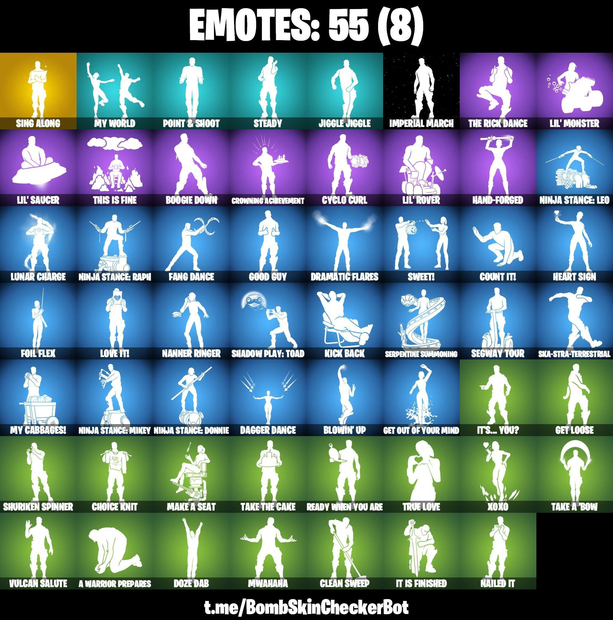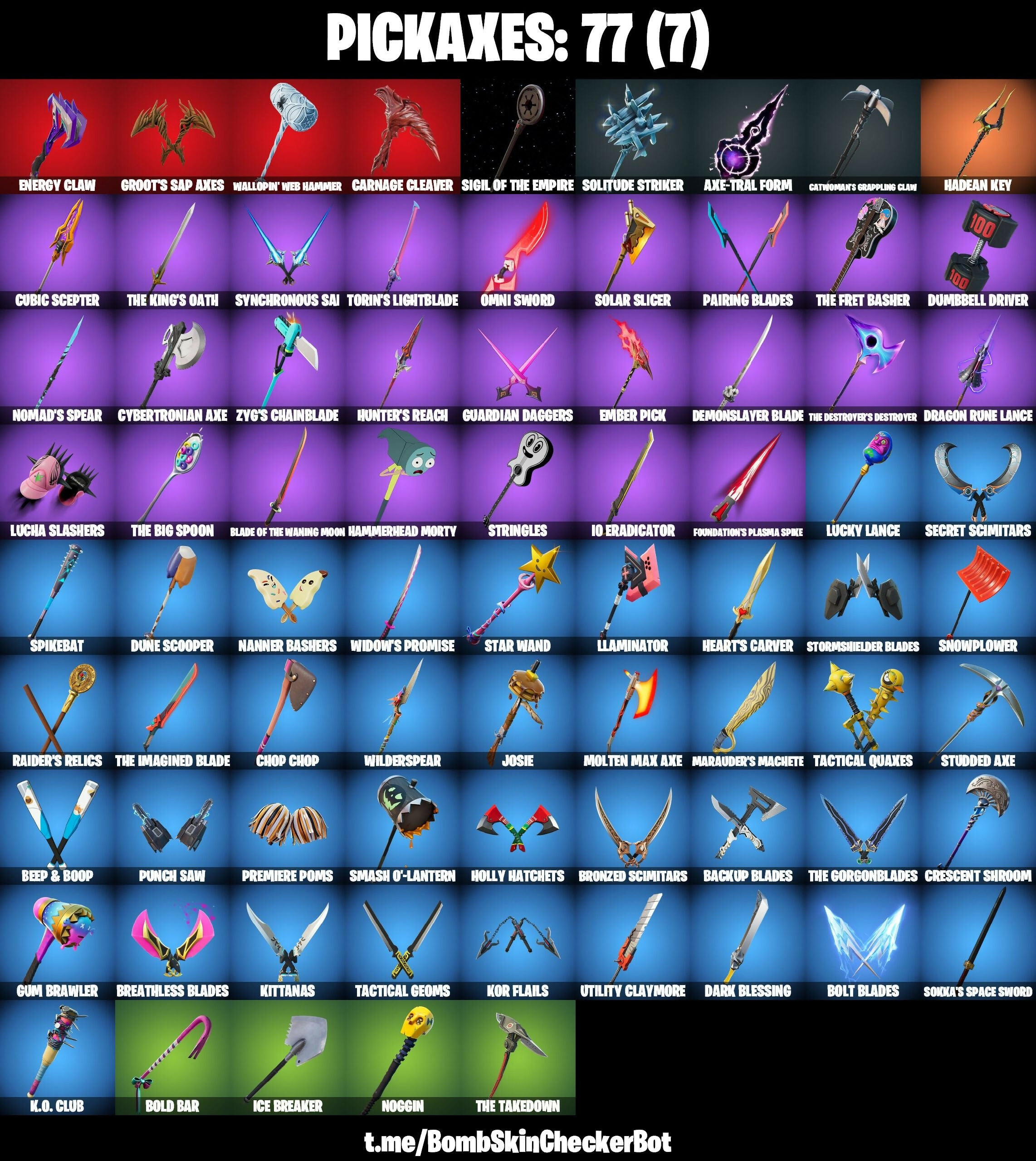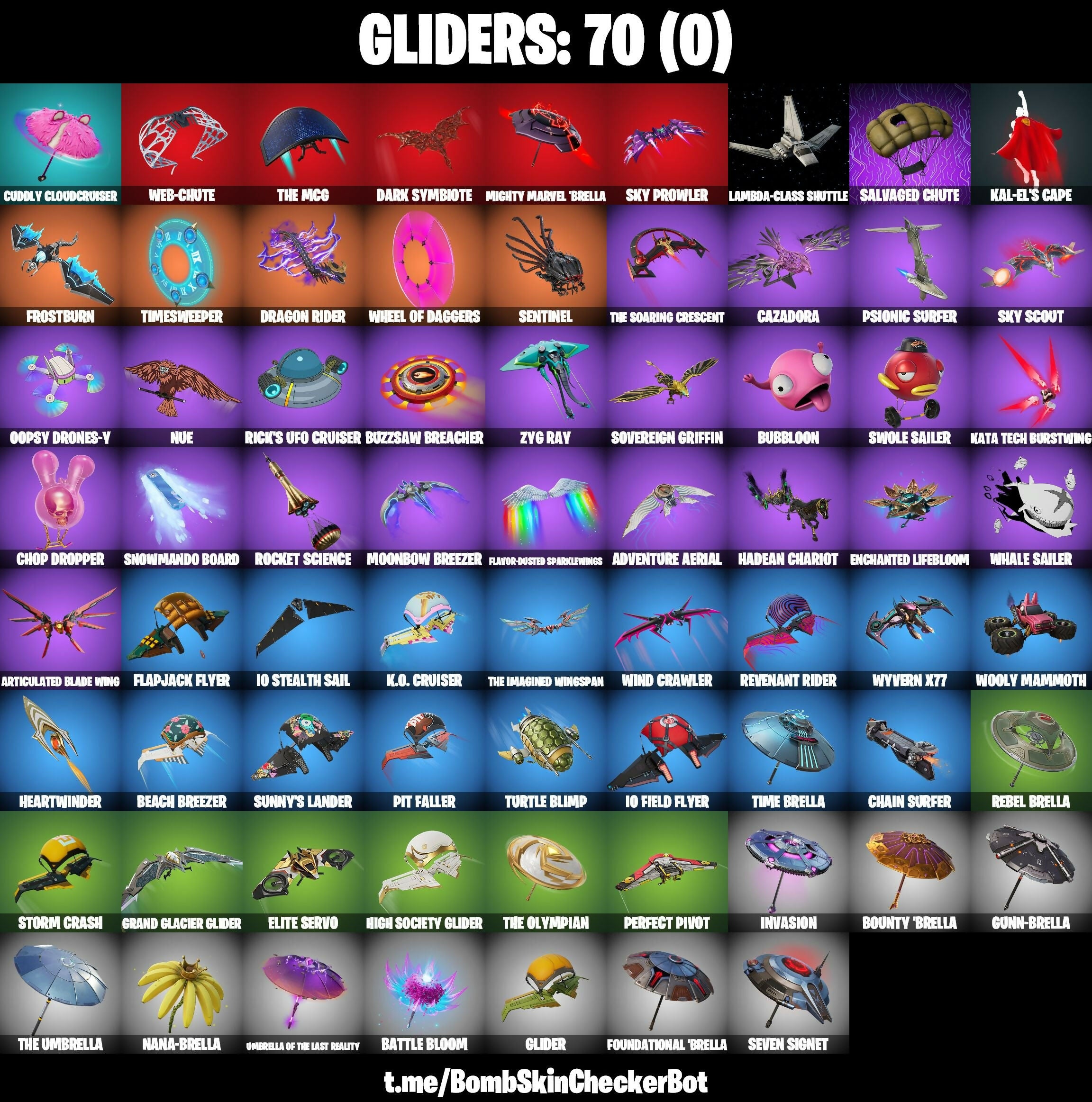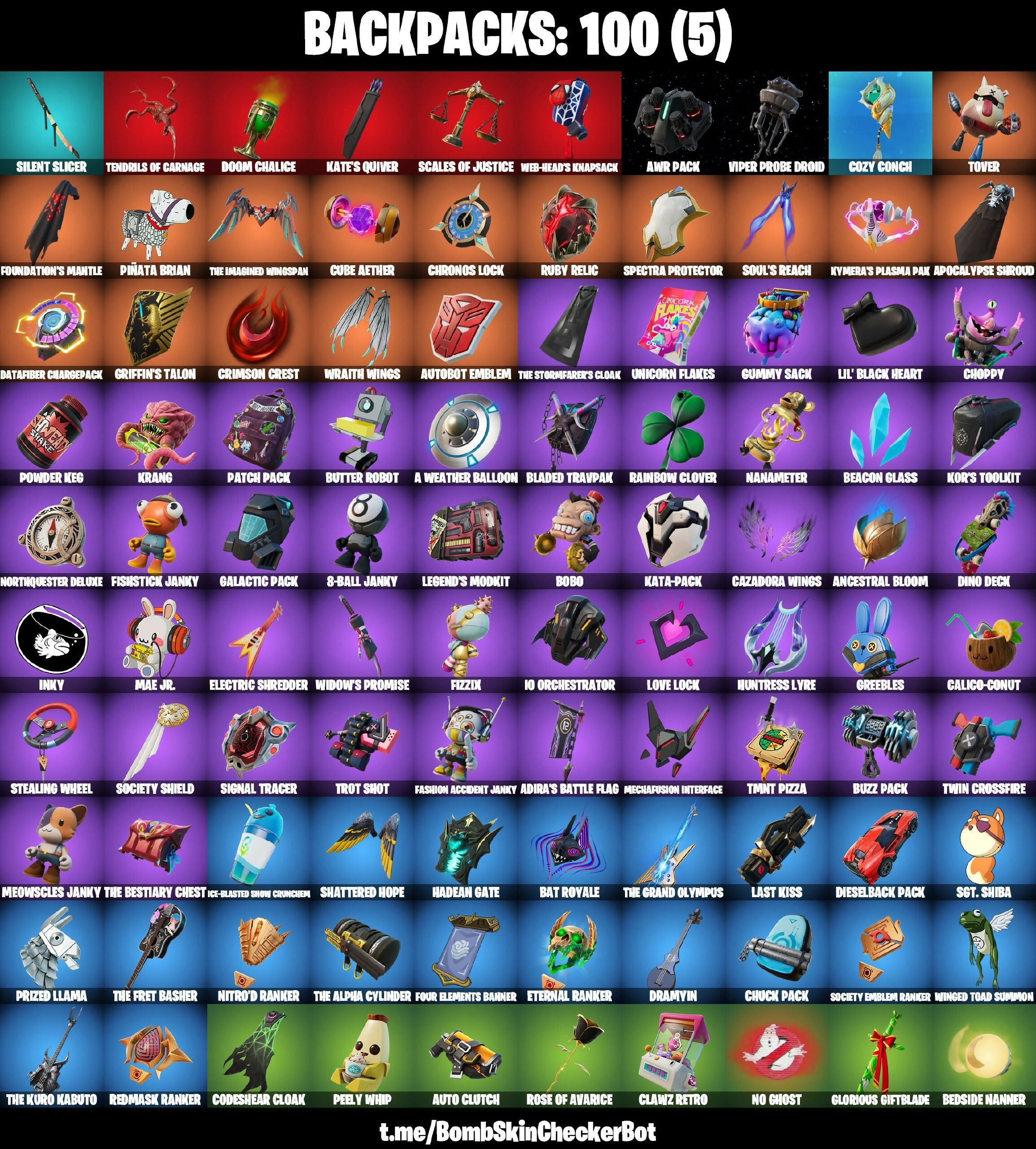 8-Ball Janky, A Warrior Prepares, A Weather Balloon, Adira, Adira's Battle Flag, Adventure Aerial, Ancestral Bloom, Apocalypse Shroud, Articulated Blade Wing, Auto Clutch, Autobot Emblem, Awr Pack, Axe-tral Form, Back Up Blades, Bat Royale, Battle Bloom, Beach Breezer, Beacon Glass, Bedside Nanner, Beep & Boop, Blade Of The Waning Moon, Bladed Travpak, Blowin' Up, Bobo, Bold Bar, Bolt Blades, Boogie Down, Bounty 'Brella, Breathless Blades, Bronzed Scimitars, Bubbloon, Butter Robot, Buzz Pack, Buzzsaw Breacher, Calico-Conut, Carnage, Carnage Cleaver, Castaway Jonesy, Catwoman's Grappling Claw, Cazadora, Cazadora Wings, Chain Surfer, Charlotte, Choice Knit, Chop Chop, Chop Dropper, Choppy, Chronos Lock, Chuck Pack, Clawz Retro, Clean Sweep, Codeshear Cloak, Color Crush, Count It!, Cozy Conch, Crescent Shroom, Crimson Crest, Crowning Achievement, Cube Aether, Cubic Scepter, Cuddly Cloudcruiser, Cybertronian Axe, Cyclo Curl, D'ark, Dagger Dance, Dark Blessing, Dark Symbiote, Darth Vader, Datafiber Chargepack, Demonslayer Blade, Diesel Back Pack, Dino Deck, Doctor Slone, Doom Chalice, Doze Dab, Dragon Rider, Dragon Rune Lance, Dramatic Flares, Dramyin, Dumbbell Driver, Dune Scooper, Electric Shredder, Elite Servo, Ember Pick, Enchanted Lifebloom, Energy Claw, Envoy, Era, Erisa, Eternal Ranker, Evie, Explorer Emilie, Fabio Sparklemane, Fang Dance, Fashion Accident Janky, Fishstick Janky, Fizzix, Flapjack Flyer, Flavor-Dusted Sparkllewings, Focus, Foil Flex, Foundation's Mantle, Foundation's Plasma Spike, Foundational 'Brella, Four Elements Banner, Frostburn, Galactic Pack, Get Loose, Get Out Of Your Mind, Glider, Glorious Giftblade, Good Guy, Grand Glacier Glider, Greebles, Griffin's Talon, Groot's Sap Axes, Guardian Daggers, Guggimon, Gum Brawler, Gumbo, Gummy Sack, Gunn-Brella, Gunnar, Hadean Chariot, Hadean Gate, Hadean Key, Hammerhead Morty, Hand-Forged, Harlowe, Haven, Headhunter Prime, Heart Sign, Heart's Carver, Heartwinder, High Society Glider, Holiday Boxy, Holly Hatchets, Human Bill, Hunter's Reach, Huntress Lyre, Ice Breaker, Ice-Blasted Snow Crunch'em, Imperial March, Inky, Invasion, Io Eradicator, Io Field Flyer, Io Orchestrator, Io Stealth Sail, It Is Finished, It's... You?, J.B. Chimpanski, Jiggle Jiggle, Joey, Josie, K.O. Club, K.O. Cruiser, Kal-El's Cape, Kata Tech Burstwing, Kata-Pack, Kate Bishop, Kate's Quiver, Kiara K.O., Kick Back, Kittanas, Kor, Kor Flails, Kor's Toolkit, Krang, Krisabelle, Kymera, Kymera's Plasma Pak, Lambda-Class Shuttle, Last Kiss, Legend's Modkit, Lil' Black Heart, Lil' Monster, Lil' Rover, Lil' Saucer, Llaminator, Lorenzo, Love It!, Love Lock, Lt. John Llama, Lucha Slashers, Lucky Lance, Lucky Rider, Lunar Charge, Mae Jr., Make A Seat, Malik, Marauder's Machete, Mariposa, Mechafusion Interface, Melody Maverick, Meowscles Janky, Midas' Shadow, Mighty Marvel 'Brella, Min-Joon, Modena Icon, Molten Max Axe, Moonbow Breezer, Mr. Dappermint, Mwahaha, My Cabbages!, My World, Nailed It, Nana-Brella, Nanameter, Nanner Bashers, Nanner Ringer, Ninja Stance: Donnie, Ninja Stance: Leo, Ninja Stance: Mikey, Ninja Stance: Raph, Nitro'd Ranker, No Ghost, Noggin, Nomad's Spear, Northquester Deluxe, Nue, Omni Sword, Oopsy Drones-Y, Optimus Prime, Pairing Blades, Patch Pack, Peely Whip, Per Aspera Ad Astra, Perfect Pivot, Pinata Brian, Pit Faller, Pitstop, Point & Shoot, Poised Playmaker, Polar Peely, Powder Keg, Premiere Poms, Prized Llama, Prowler, Psionic Surfer, Punch Saw, Raider's Relics, Rainbow Clover, Ready When You Are, Rebel Brella, Redmask Ranker, Relik, Revenant Rider, Rian, Rick Sanchez, Rick's Ufo Cruiser, Rocket Science, Ronin, Rose Of Avarice, Ruby Relic, Runway Racer, Sabina, Salvaged Chute, Scales Of Justice, Scuba Crystal, Secret Scimitars, Segway Tour, Sentinel, Serpentine Summoning, Seven Signet, Sgt. Shiba, Shadow Play: Toad, Shanta, Shattered Hope, Shuriken Spinner, Sigil Of The Empire, Signal Tracer, Silent Slicer, Sing Along, Siren, Ska-Stra-Terrestrial, Sky Prowler, Sky Scout, Smash O'-Lantern, Snap, Snowmando Board, Snowplower, Society Emblem Ranker, Society Shield, Solar Slicer, Solitude Striker, Sonka's Space Sword, Soul's Reach, Sovereign Griffin, Spectra Protector, Spiderman Gilded Reality, Spikebat, Star Wand, Steady, Stealing Wheel, Storm Crash, Stormfarer, Stormshielder Blades, Stringles, Studded Axe, Sunny, Sunny's Lander, Sweet!, Swole Sailer, Synchronous Sai, Tactical Geoms, Tactical Quaxes, Take A Bow, Take The Cake, Tendrils Of Carnage, The Alpha Cylinder, The Bestiary Chest, The Big Spoon, The Destroyer's Destroyer, The Foundation, The Fret Basher, The Gorgonblades, The Grand Olympus, The Imagined, The Imagined Blade, The Imagined Wingspan, The King's Oath, The Kuro Kabuto, The Mcg, The Olympian, The Origin, The Rick Dance, The Soaring Crescent, The Stormfarer's Cloak, The Takedown, The Umbrella, This Is Fine, Time Brella, Timesweeper, Tmnt Pizza, Toona Fish, Torin, Torin's Lightblade, Tover, Trace, Trot Shot, True Love, Tsuki 2.0, Turtle Blimp, Twin Crossfire, Umbrella Of The Last Reality, Unicorn Flakes, Utility Claymore, Viper Probe Droid, Vulcan Salute, Wallopin' Web Hammer, Web-Chute, Web-Head's Knapsack, Whale Sailer, Wheel Of Daggers, Widow's Promise, Wilderspear, Wind Crawler, Winged Toad Summon, Winterfest Bushranger, Wooly Mammoth, Wraith Wings, Wyvern Xt7, XoXo, Zoe Clash, Zyg, Zyg Ray, Zyg's Chainblade