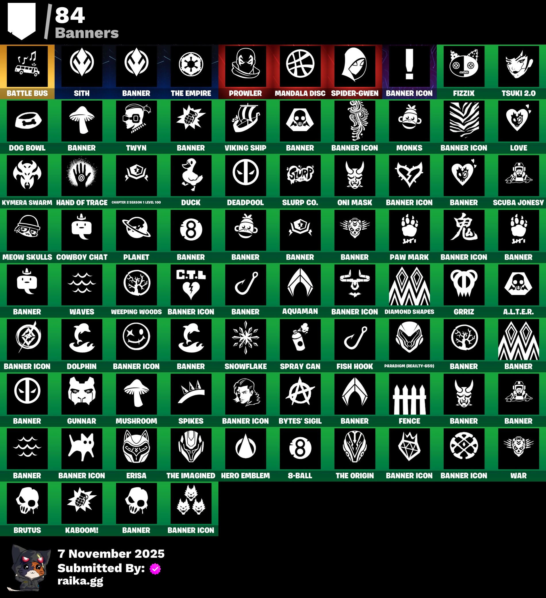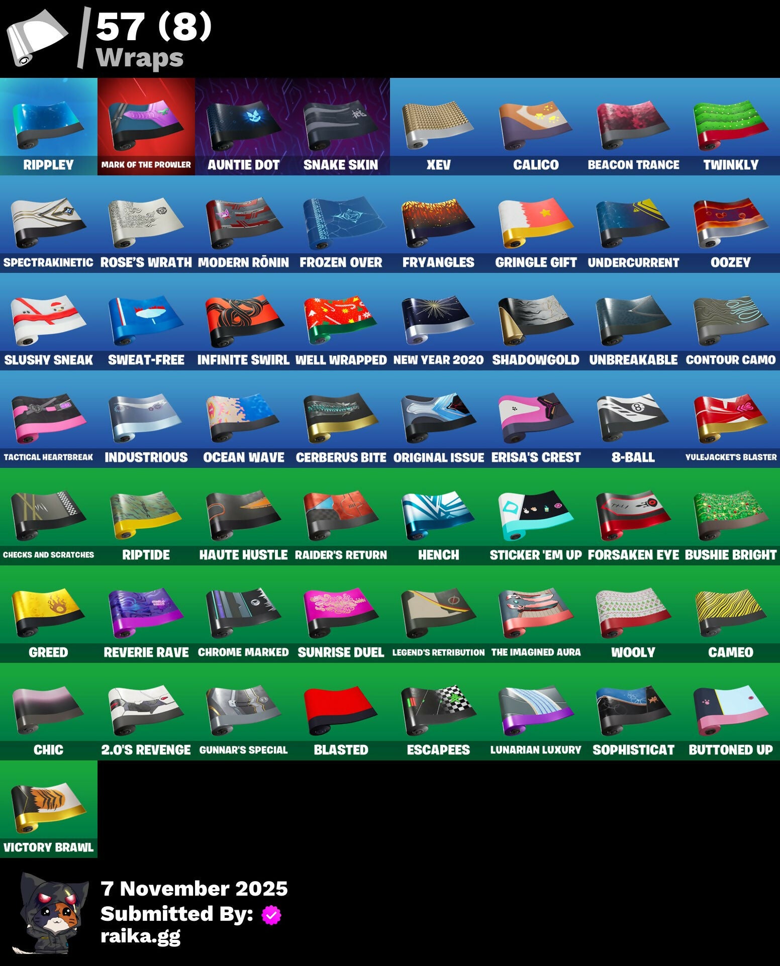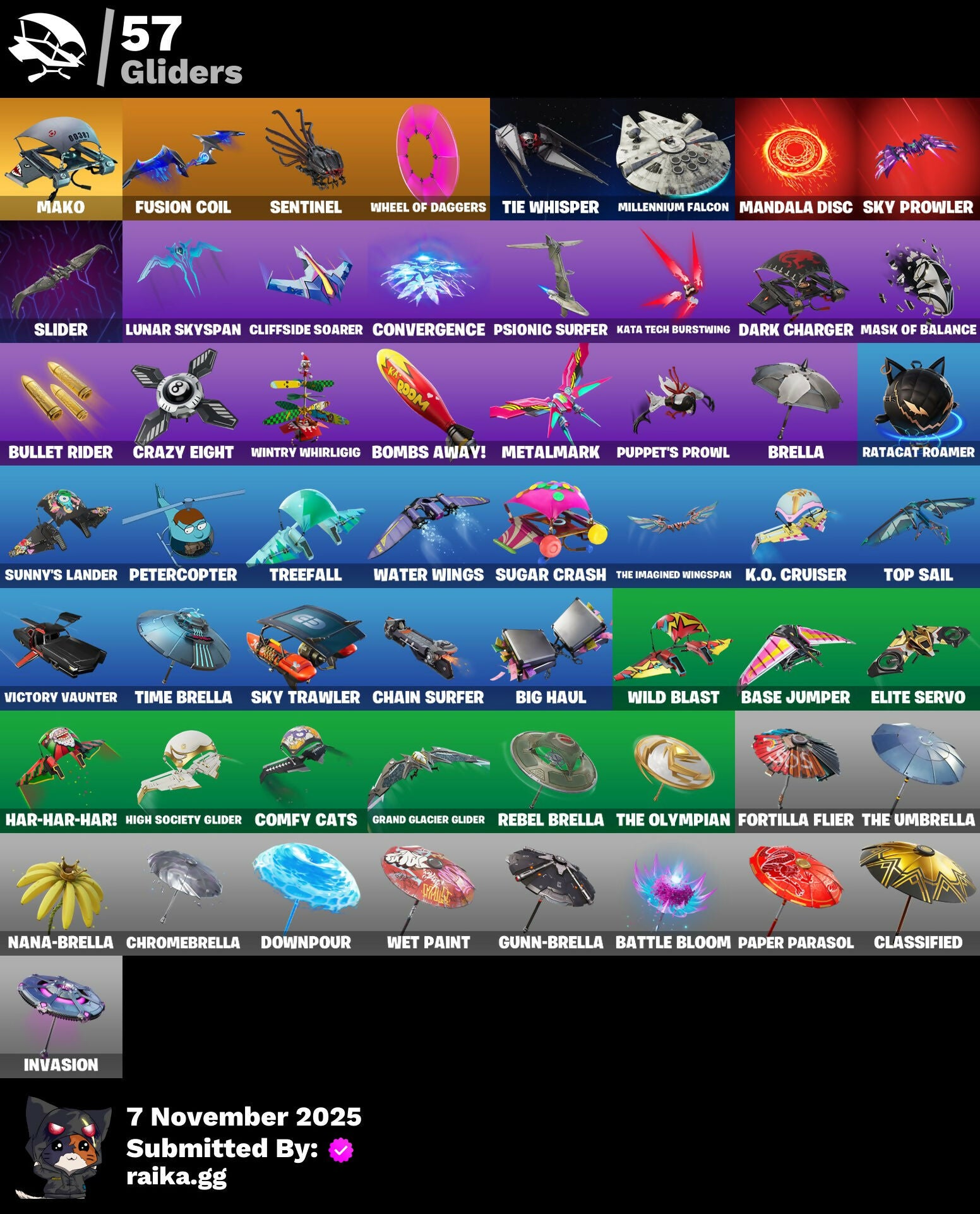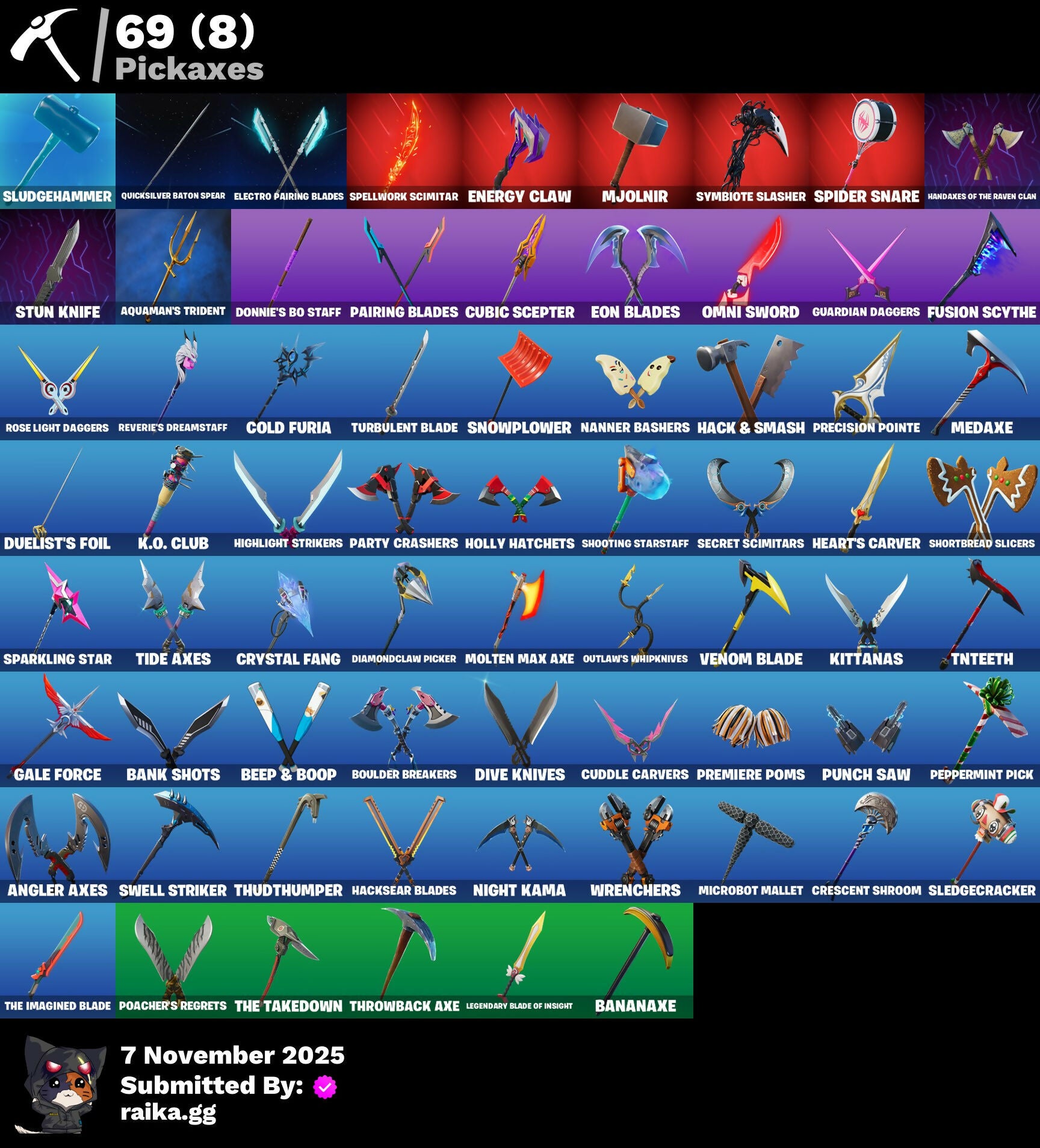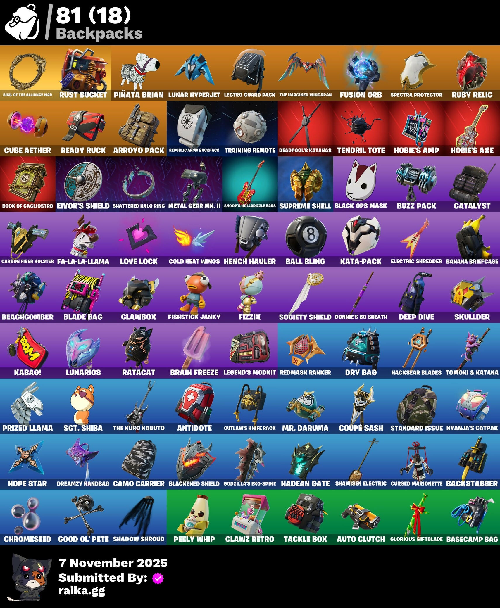 2.0's Revenge, 212th Battalion Trooper, 501st Trooper, 8-Ball, 8-Ball vs Scratch, A.L.T.E.R., Aerial, Agent Nana, Agent Peely, Ahsoka's Clone Trooper, Air Shredder, Angler Axes, Antidote, Aquaman, Aquaman's Trident, Arctic Adeline, Arroyo Pack, Arthur Curry, Auntie Dot, Auto Clutch, Backstabber, Ball Bling, Banana Briefcase, Bananaxe, Bank Shots, Banner, Banner Icon, Base Jumper, Basecamp Bag, Battle Bloom, Battle Bus, Battlehawk, Beachcomber, Beacon Trance, Beep & Boop, Bees!, Big Guns, Big Haul, Black Ops Mask, Blackened Shield, Blade Bag, Blasted, Blocko, Boing!, Bombastic Winterfest, Bombs Away!, Boogie Down, Book Of Cagliostro, Boulder Breakers, Boy's A Liar, Brain Freeze, Brella, Brutus, Bullet Rider, Bushie Bright, Buttoned Up, Buzz Pack, Bytes' Sigil, Calico, Call Me, Cameo, Cameo vs Chic, Camo Carrier, Carbide, Carbon Fiber Holster, Cash Grab, Catalyst, Cerberus Bite, Chain Surfer, Chalk Outline, Checks And Scratches, Chic, Choice Knit, Choose Naughty, Chrome Marked, Chromebrella, Chromeseed, Clara, Classified, Clawbox, Clawz Retro, Cliffside Soarer, Clone Trooper, Cold Furia, Cold Heat Wings, Combat Elite, Combat Tech Jules, Comet, Comfy Cats, Conjure Weapon, Contour Camo, Convergence, Corrupted, Coruscant Guard, Coupé Sash, Courageous Mikasa, Cowboy Chat, Crabby King, Crashed Chiller, Crazy Castle, Crazy Eight, Crescent Shroom, Crowning Achievement, Crystal Fang, Cube Aether, Cubic Scepter, Cuddle Carvers, Cursed Marionette, Cyclo Curl, Dagger Dance, Dance Monkey, Dancin' Domino, Dark Charger, Deadpool, Deadpool's Katanas, Deep Dive, Diamond Shapes, Diamond Throne, Diamondclaw Picker, Diva's Grin, Dive Knives, Doctor Strange, Dog Bowl, Doggo, Dolphin, Donatello, Donnie's Bo Sheath, Donnie's Bo Staff, Downpour, Doze Dab, Dreamzy Handbag, Droop, Dry Bag, Duck, Duelist's Foil, Dynamite, E.G.O., Eivor Varinsdottir, Eivor's Shield, Electric Shredder, Electro Pairing Blades, Elite Servo, Energy Claw, Eon Blades, Erisa, Erisa Alert, Erisa's Crest, Escapees, Evie, Eye Of Agamotto, Fa-La-La-Llama, Fade, Fence, Fish Hook, Fishstick Janky, Fist Bump, Fizzix, Flippin' Away, Flippin' Sexy, Foil Flex, Forsaken Eye, Fortilla Flier, Frozen Over, Fryangles, Fusion, Fusion Coil, Fusion Orb, Fusion Scythe, Fusion! Hah!!, GG Smiley, GG Snakes, GG Snowman, Gale Force, Gear Specialist Maya, Geared Up, Gentleman's Dab, Get Gone, Get Griddy, Glorious Giftblade, Godzilla's Exo-Spine, Good Ol' Pete, Grand Glacier Glider, Greed, Grey, Gringle Gift, Groovy!, Grriz, Guardian Daggers, Guggi Was Here, Gunn-Brella, Gunnar, Gunnar's Special, Hack & Smash, Hacksear Blades, Hadean Gate, Hades Insignia, Hammerhead, Hand Of Trace, Handaxes of the Raven Clan, Har-Har-Har!, Haute Hustle, Hazard, Heart Of A King, Heart's Carver, Hearts, Hench, Hench Hauler, Hero Emblem, High Five, High Society Glider, Highlight Strikers, Hobie's Amp, Hobie's Axe, Holiday Boxy, Holly Hatchets, Hope, Hope Star, Hope's Look, Hula Hoopin', I Declare!, I'm A Mystery, If Looks Could..., Imagined, Industrious, Infinite Swirl, Invasion, Itachi Uchiha, Je Suis Montague, Jones Underground, Journey, Journey vs Hazard, Jules, K.O. Club, K.O. Cruiser, Kabag!, Kaboom!, Kata Tech Burstwing, Kata-Pack, Kiara K.O., Kick It, Kittanas, Knight's Honor, Krisabelle, Kymera Swarm, Lectro Guard Pack, Legend's Modkit, Legend's Retribution, Legendary Blade of Insight, Lil' Prancer, Lil' Supercar, Lobby Classic, Love, Love Lock, Luke Skywalker, Lunar Hyperjet, Lunar Skyspan, Lunarian Luxury, Lunarios, Mad Mask, Mako, Mandala Disc, Mark Of The Prowler, Mask of Balance, Masked Scuba Jonesy, Master Engineer, Medaxe, Menacing Trace, Meow Skulls, Meow-Wow-Wow!, Meowabunga!, Mercurial, Metal Gear Mk. II, Metalmark, Microbot Mallet, Millennium Falcon, Missing: Peely, Mjolnir, Modern Rōnin, Molten Max Axe, Monks, Montague, Mr. Daruma, Mushroom, Nana-Brella, Nanner Bashers, Naughty Or Nice?, Never Gonna, New Year 2020, Night Kama, Ninja Stance: Leo, Nisha, Nord Warrior, Nyanja's Catpak, Ocean, Ocean Wave, Old Snake, Omni Sword, Oni Mask, Oozey, Orange Justice, Original Issue, Oscar, Outlaw's Knife Rack, Outlaw's Whipknives, Pairing Blades, Paper Parasol, Paradigm (Reality-659), Party Crashers, Paw Mark, Peely Whip, Peppermint Pick, Petercopter, Petervision, Pinata Brian, Pink, Planet, Poacher's Regrets, Polar Peely, Popcorn, Precision Pointe, Premiere Poms, Prized Llama, Prowler, Prowler Tag, Psionic Surfer, Punch Saw, Puppet's Prowl, Purple, Quicksilver Baton Spear, Raider's Return, Rainbow, Ratacat, Ratacat Roamer, Ready Ruck, Rebel Brella, Redmask Ranker, Remedy vs Toxin, Republic Army Backpack, Respect The Peace, Reverie, Reverie Rave, Reverie's Dreamstaff, Ride The Corn!, Riposte Ready, Rippley, Rippley vs Sludge, Riptide, Riptide Ocean, Rogue Agent, Rollie, Rose Light Daggers, Rose's Wrath, Ruby Relic, Rust Bucket, Salute, Scootin', Scuba Jonesy, Season's Guffings, Secret Scimitars, Segway Tour, Sentinel, Sgt. Shiba, Shadow Shroud, Shadow Spar, Shadowgold, Shady Doggo, Shamisen Electric, Sharpshooter, Shattered Halo Ring, Shock Brawler Oscar, Shooting Starstaff, Shortbread Slicers, Shoto Todoroki, Side Hustle, Sigil Of The Alliance War, Sith, Skullder, Sky Prowler, Sky Trawler, Sled Ready Guff, Sledgecracker, Slider, Sludgehammer, Slurp Co., Slush-Faced, Slushy Sneak, Snake Skin, Snare Solo, Snoop's Holladizzle Bass, Snowflake, Snowplower, Snowshaker, So Square, Society Shield, Solid Profile, Solid Snake, Sophisticat, Sorana, Sparkling Star, Spectra Protector, Spectrakinetic, Spellwork Scimitar, Spider Snare, Spider-Gwen, Spider-Punk, Spikes, Spray Can, Squid Up, Stacked!, Standard Issue, Starlit, Sticker 'Em Up, Stun Knife, Sugar Crash, Sunglasses, Sunny's Lander, Sunrise Duel, Supreme Shell, Sweat-Free, Swell Striker, Symbiote Slasher, Tackle Box, Tactical Heartbreak, Take A 'Bow, Tao Mandalas, Teknique, Tendril Tote, The Break, The Dip, The Empire, The Imagined, The Imagined Aura, The Imagined Blade, The Imagined Wingspan, The Kuro Kabuto, The Olympian, The