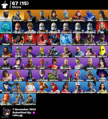 [PC/PSN/XBOX] 67 skins | Shady Doggo | Rogue Agent | Fade | Carbide | Sorana | The Origin | The Imagined | Fusion | Gear Specialist Maya | Rippley vs Sludge | 250 VB / FN