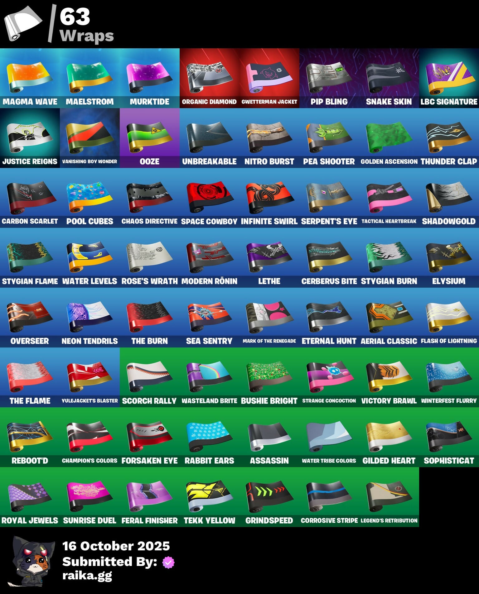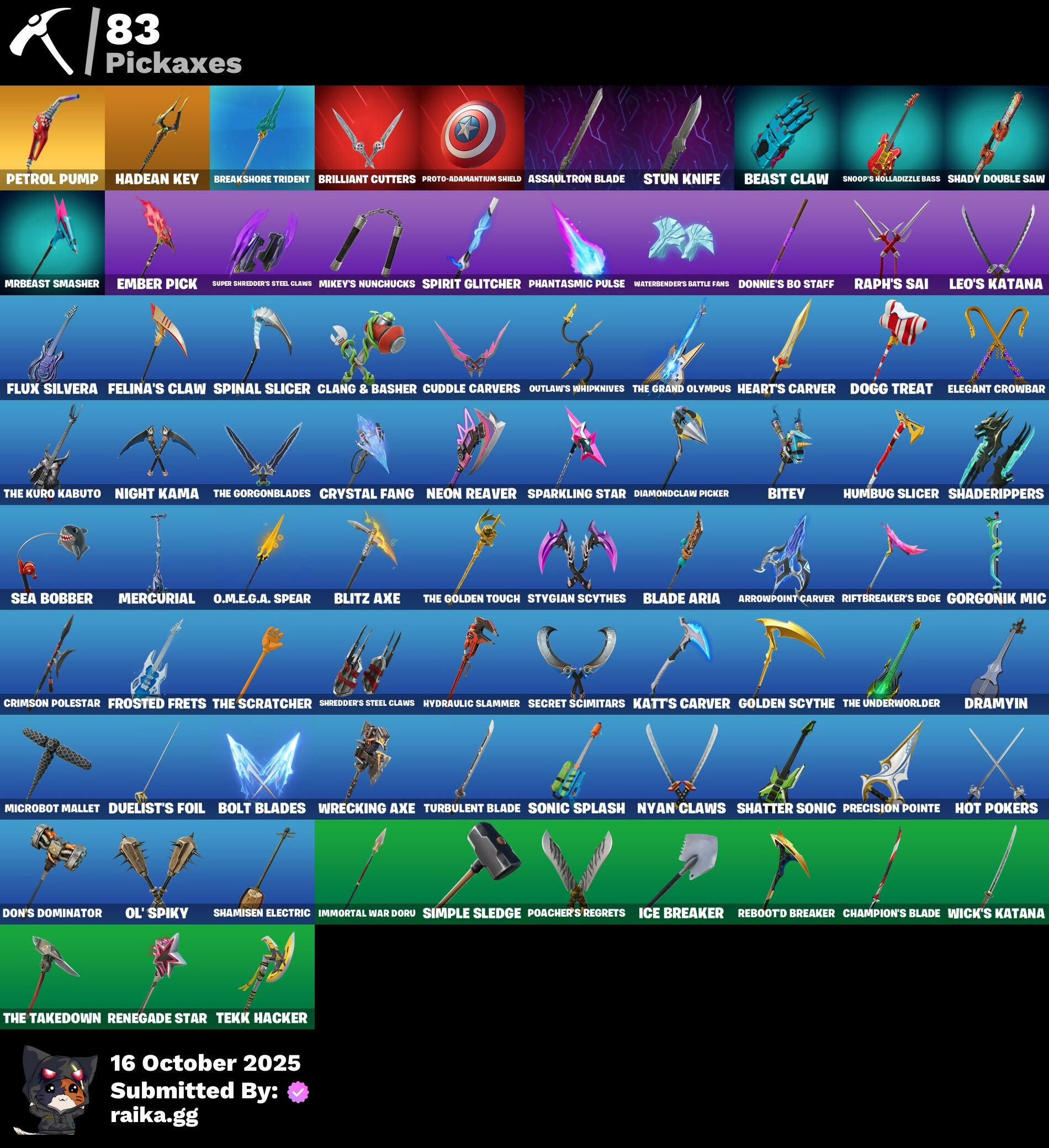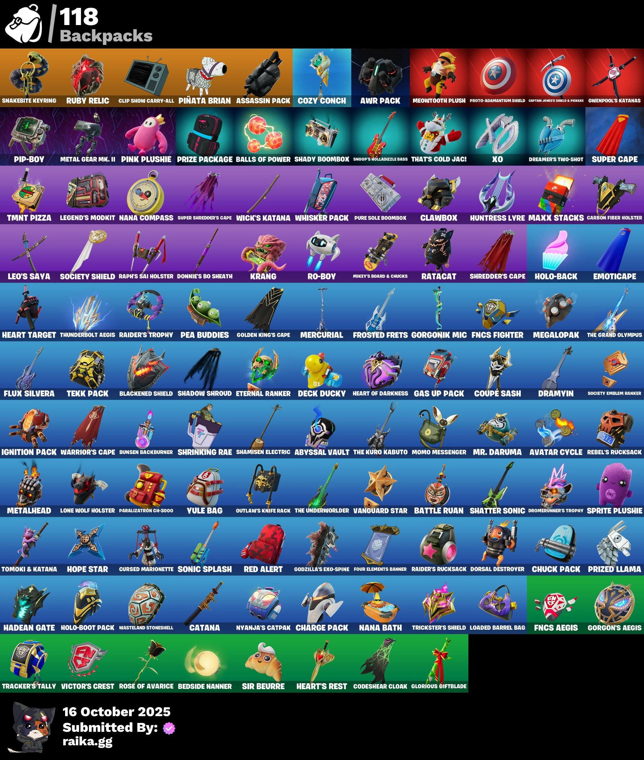 Aang, Aang's Air Sphere, Abyssal Vault, Ad Victorian!, Adventure Peely, Aerial Classic, Aerial Swagger, Airie, Aphrodite, Ares, Armored Victory, Arrowpoint Carver, Artemis, Ascendant Midas, Assassin, Assassin Pack, Assaultron Blade, Avatar Cycle, Avatar's Flourish, Awr Pack, Axo's Big Moment, Azuki, Balanced, Balls of Power, Banner Icon, Baron's Hoard, Battle Prep, Battle Prep: Super, Battle Ruan, Bear Hug, Beast Claw, Bedside Nanner, Bike To Go, Birthday Bud, Bitey, Black Knight T-60 Power Armor, Blackened Shield, Blade Aria, Blazing Fire Cerberus, Blitz 'Brella, Blitz Axe, Blocko, Bolt Blades, Boogie Down, Bounce Wit' It, Breakin', Breakshore Trident, Brilliant Cutters, Brite & Speedy, Brite Moves, Brite Raider, Bullet Rider, Bullseye, Bunsen Backburner, Burning Ambition Valeria, Bushie Bright, C.T.L, Captain America, Captain Jones's Shield & Pickaxe, Captain Llamerica, Carbon Fiber Holster, Carbon Scarlet, Card Drop, Catana, Cerberus, Cerberus Bite, Cerberus Medallion, Champion Stash'D, Champion's Blade, Champion's Colors, Chaos Directive, Charge Pack, Chemist's Cloudglider, Choose Naughty, Chuck Pack, Clang & Basher, Clara, Clawbox, Cliffside Soarer, Clip Show Carry-All, Codeshear Cloak, Codsworth's Cleanup, Combat Giller, Conch Call, Contract Giller, Corrosive Stripe, Corrosive Tag, Coupé Sash, Cozy Conch, Crashed Chiller, Crashed Shield, Crimson Polestar, Crowning Achievement, Crystal Fang, Cuddle Carvers, Cursed Marionette, Dark Charger, Dawn Duelist Nisha, Dealer's Deck, Deck Ducky, Determined Korra, Diamond Throne, Diamondclaw Picker, Diva's Grin, Dogg Treat, Don Target, Don's Dominator, Donatello, Donnie's Bo Sheath, Donnie's Bo Staff, Doom Brella, Dorsal Destroyer, Dramyin, Dreamer's Two-Shot, Drome Drifter, Dromerunner's Trophy, Duelist's Foil, El Chapulín Colorado, Elegant Crowbar, Elemental Cycle, Elite Servo, Elysian Artemis, Elysium, Ember Pick, Emma's Influence, Emoticape, Eternal Hunt, Eternal Ranker, FNCS Aegis, FNCS Fighter, Fancy Peter Griffin, Felina's Claw, Feral Finisher, Fire Show, Fist Bump, Flash Of Lightning, Flux Silvera, Focus, Foil Flex, Forsaken Eye, Four Elements Banner, Fox Drifter, Frosted Frets, Fully Charged Drift, Gas Up Pack, Get Griddy, Gilded Heart, Glorious Giftblade, Godzilla's Exo-Spine, Golden Ascension, Golden King's Cape, Golden Scythe, Golden Wolf, Gorgon's Aegis, Gorgonik Mic, Grand Glacier Glider, Grim King Hades, Grindspeed, Groovy!, Gunmetal Idol, Gwenpool's Katanas, Gwetterman Jacket, Hadean Chariot, Hadean Gate, Hadean Key, Hades, Hades Insignia, Heart Collector, Heart Target, Heart of Darkness, Heart's Carver, Heart's Rest, Heart-Stopper, Heartbreak Shuffle, Heartbreaker Aphrodite, Heartwinder, Heavy Metal Omega, High Society Glider, Holiday Boxy, Holo-Back, Holo-Boot Pack, Hope, Hope Star, Hope's Look, Hot Pokers, Humbug Slicer, Huntress Lyre, Hydraulic Slammer, Hype!, I'm A Mystery, Ice Breaker, Ignition Pack, Immortal Form, Immortal War Doru, Immortal Zeus, Infinite Swirl, Jabba Switchway, Je Suis Montague, Jet Signals, Jing, John Wick, Joltara, Jones Underground, Jungle, Junker 'Brella, Justice Reigns, Ka-Choom!, Katt, Katt's Carver, Knife Sharpener, Korra, Korra's Air Glider, Krang, LBC Signature, Legend's Modkit, Legend's Retribution, Leo's Katana, Leo's Saya, Leonardo, Lethe, Lil' Supercar, Lina Scorch, Loaded Barrel Bag, Lone Wolf Holster, Machinist In Control, Maelstrom, Magma Wave, Magmatic Poseidon, Magneto's Grasp, Make A Seat, Maniacal Krang, Mark Of The Renegade, Mask Of Balance, Masked Hades, Maxx Stacks, Maxxed Out Max, Mecha Strike Defender, Medusa, Megalo Don, Megalopak, Meowtooth Plush, Mercurial, Metal Gear Mk. II, Metalhead, Michelangelo, Microbot Mallet, Mikey's Board & Chucks, Mikey's Nunchucks, Missing: Peely, Mobile Megalodon, Modern Rōnin, Momo Messenger, Montague, Moonbow Breezer, Moonlit Mystery, Mr. Daruma, Mrbeast, Mrbeast Smasher, Mrbeast6000, Murktide, Nana Bath, Nana Compass, Neon Man O' War, Neon Reaver, Neon Tendrils, Never Yield, Night Hunter Scarr, Night Kama, Ninja Stance: Donnie, Ninja Stance: Leo, Ninja Stance: Mikey, Ninja Stance: Raph, Nisha, Nitro Burst, Nitro Fusion Megalo Don, Nyan Claws, Nyanja's Catpak, O.M.E.G.A. Spear, O.X.R. 'Brella, Odyssey, Ol' Spiky, Old Snake, Ooze, Organic Diamond, Oscar, Oscar's Roar, Outlaw's Knife Rack, Outlaw's Whipknives, Overseer, Paralizatron CH-3000, Party Beats, Pea Buddies, Pea Buds, Pea Part Harmony, Pea Shooter, Pea-Rigibles, Peabody, Peas Out, Peelverine's Attack, Peppermint Paraglider, Perfect Pivot, Perfect Score, Persephone, Peter Griffin, Petercopter, Petervision, Petrol Pump, Phantasmic Pulse, Phone It In, Piercing Ace, Pink Plushie, Pip Bling, Pip-Boy, Piñata Brian, Poacher's Regrets, Pool Cubes, Popular Vibe, Poseidon, Poseidon Insignia, Powerful Poseidon, Precision Pointe, Prize Package, Prized Llama, Proto-Adamantium Shield, Pull Up, Puppet's Prowl, Pure Sole Boombox, Queen In Gold, Rabbit Ears, Rage Quit, Raider's Rucksack, Raider's Trophy, Rap Boy, Raph's Sai, Raph's Sai Holster, Raphael, Ratacat, Ratacat Roamer, Ready To Raid, Real Slim Shady, Rebel Brella, Rebel's Rucksack, Reboot'd, Reboot'd Breaker, Red Alert, Red Robin's Wings, Redline Scout, Remix 'Brella, Renegade Runner, Renegade Star, Rescue Board, Riftbreaker's Edge, Ringmaster Scarr, Riposte Ready, Ro-Boy, Rose of Avarice, Rose's Wrath, Rough Cut Montague, Royal Jewels, Ruby, Ruby Relic, Rust, Santa Dogg, Scarlet Commander, Scarlet Longboard, Scorch Rally, Sea Bobber, Sea Chariot, Sea Sentry, Secret Scimitars, Serpent's Eye, Serpentine Summoning, Shadebox, Shaderippers, Shadow Shroud, Shadow Vox, Shadow's Bite, Shadowgold, Shady Boombox, Shady Double Saw, Shamisen Electric, Shatter Sonic, Shock Brawler Oscar, Shogun 'Brella, Showboat, Shredder, Shredder's Cape, Shredder's Steel Claws, Shrinking Rae, Simple Sledge, Sir Beurre, Skeleglider, Slammin' Bass, Slap Juice., Slider, Slim Shady, Slurp Co., Slurp King's Challenge, Snake Skin, Snake-Eyed, Snakebite Keyring, Snoop's Holl