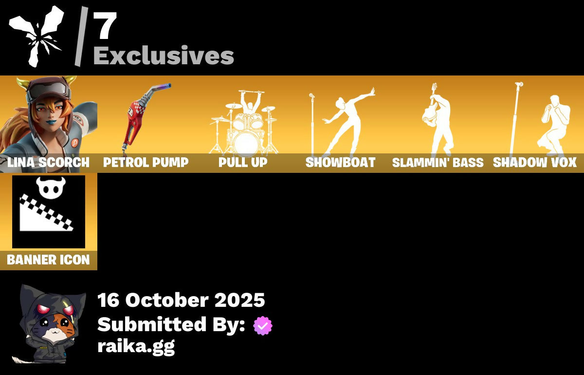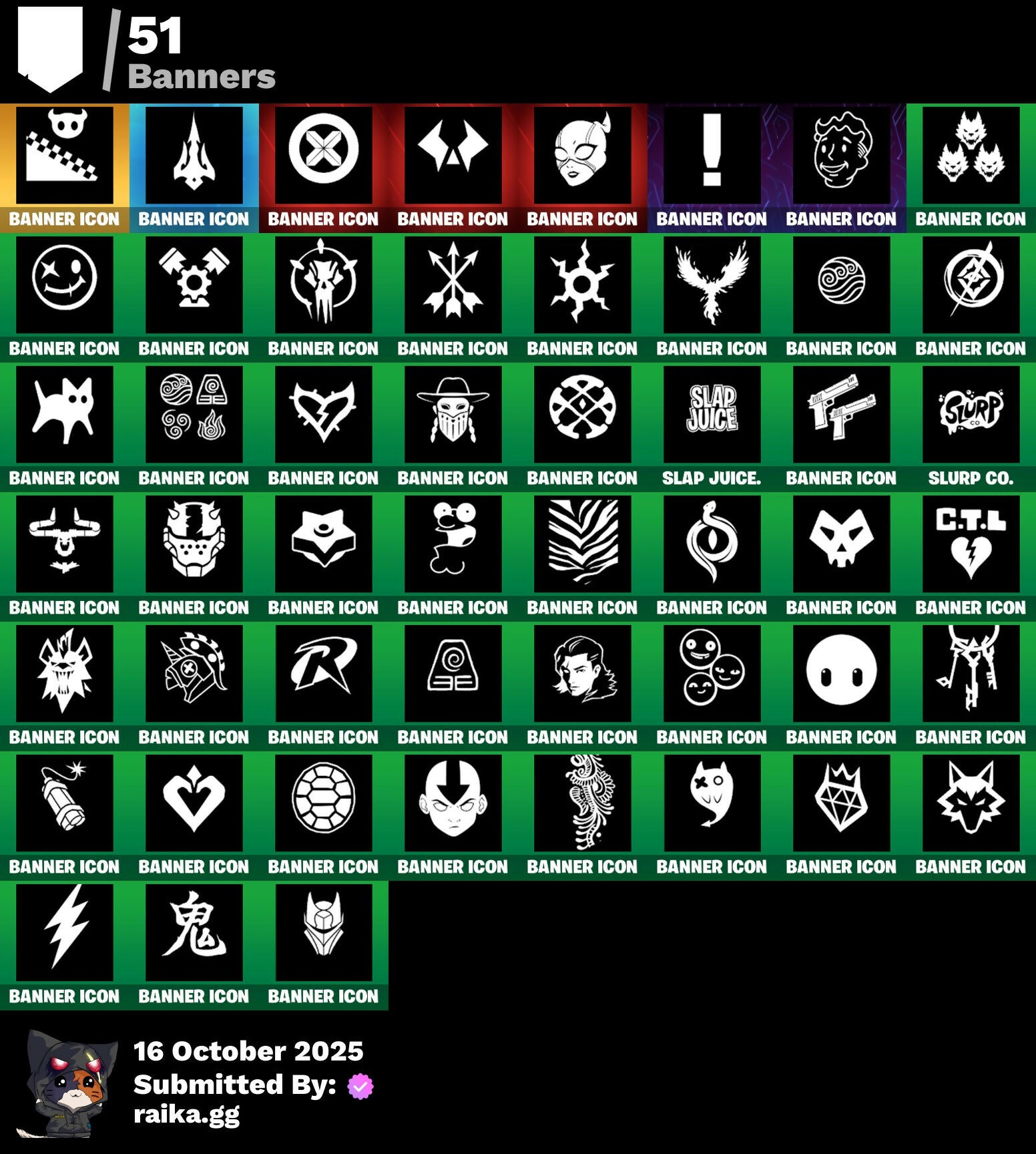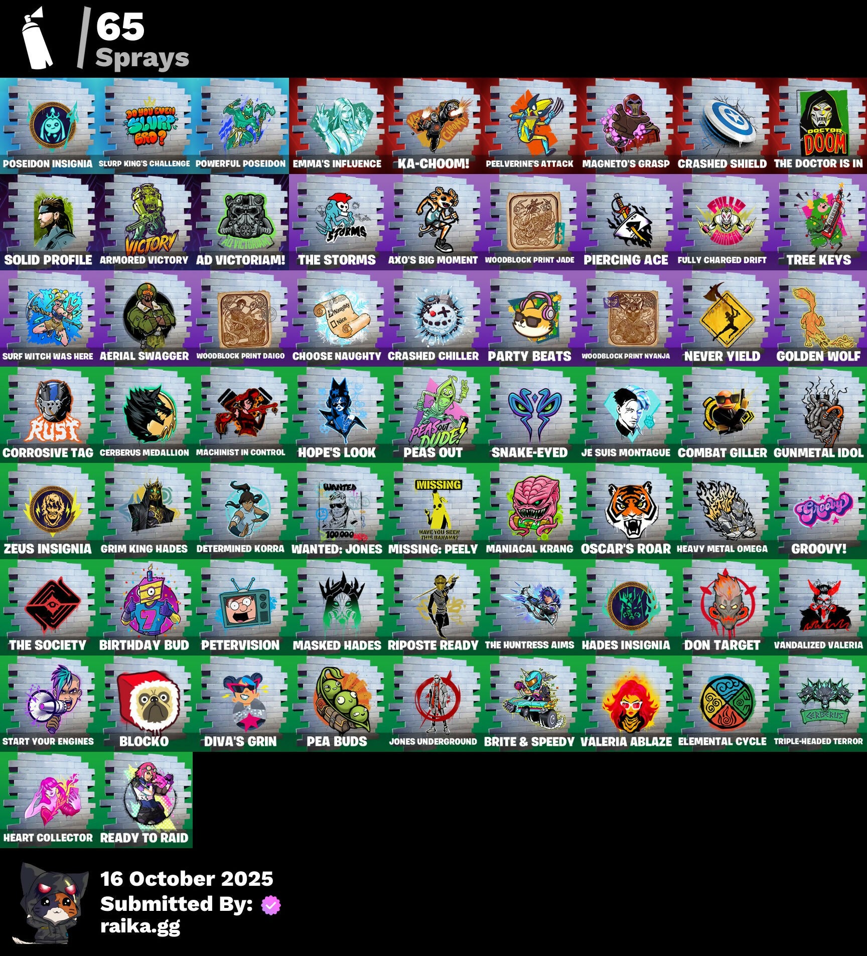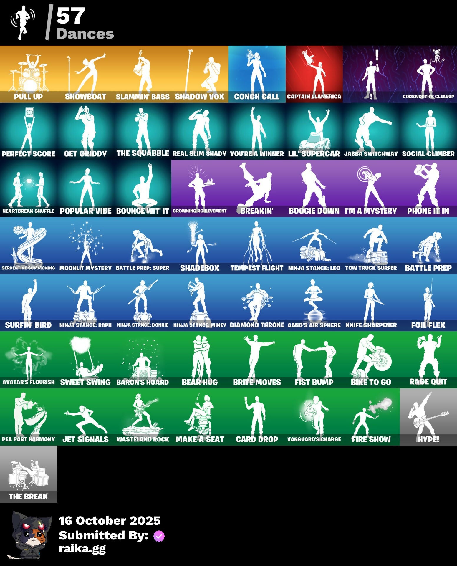 Aang, Aang's Air Sphere, Abyssal Vault, Ad Victorian!, Adventure Peely, Aerial Classic, Aerial Swagger, Airie, Aphrodite, Ares, Armored Victory, Arrowpoint Carver, Artemis, Ascendant Midas, Assassin, Assassin Pack, Assaultron Blade, Avatar Cycle, Avatar's Flourish, Awr Pack, Axo's Big Moment, Azuki, Balanced, Balls of Power, Banner Icon, Baron's Hoard, Battle Prep, Battle Prep: Super, Battle Ruan, Bear Hug, Beast Claw, Bedside Nanner, Bike To Go, Birthday Bud, Bitey, Black Knight T-60 Power Armor, Blackened Shield, Blade Aria, Blazing Fire Cerberus, Blitz 'Brella, Blitz Axe, Blocko, Bolt Blades, Boogie Down, Bounce Wit' It, Breakin', Breakshore Trident, Brilliant Cutters, Brite & Speedy, Brite Moves, Brite Raider, Bullet Rider, Bullseye, Bunsen Backburner, Burning Ambition Valeria, Bushie Bright, C.T.L, Captain America, Captain Jones's Shield & Pickaxe, Captain Llamerica, Carbon Fiber Holster, Carbon Scarlet, Card Drop, Catana, Cerberus, Cerberus Bite, Cerberus Medallion, Champion Stash'D, Champion's Blade, Champion's Colors, Chaos Directive, Charge Pack, Chemist's Cloudglider, Choose Naughty, Chuck Pack, Clang & Basher, Clara, Clawbox, Cliffside Soarer, Clip Show Carry-All, Codeshear Cloak, Codsworth's Cleanup, Combat Giller, Conch Call, Contract Giller, Corrosive Stripe, Corrosive Tag, Coupé Sash, Cozy Conch, Crashed Chiller, Crashed Shield, Crimson Polestar, Crowning Achievement, Crystal Fang, Cuddle Carvers, Cursed Marionette, Dark Charger, Dawn Duelist Nisha, Dealer's Deck, Deck Ducky, Determined Korra, Diamond Throne, Diamondclaw Picker, Diva's Grin, Dogg Treat, Don Target, Don's Dominator, Donatello, Donnie's Bo Sheath, Donnie's Bo Staff, Doom Brella, Dorsal Destroyer, Dramyin, Dreamer's Two-Shot, Drome Drifter, Dromerunner's Trophy, Duelist's Foil, El Chapulín Colorado, Elegant Crowbar, Elemental Cycle, Elite Servo, Elysian Artemis, Elysium, Ember Pick, Emma's Influence, Emoticape, Eternal Hunt, Eternal Ranker, FNCS Aegis, FNCS Fighter, Fancy Peter Griffin, Felina's Claw, Feral Finisher, Fire Show, Fist Bump, Flash Of Lightning, Flux Silvera, Focus, Foil Flex, Forsaken Eye, Four Elements Banner, Fox Drifter, Frosted Frets, Fully Charged Drift, Gas Up Pack, Get Griddy, Gilded Heart, Glorious Giftblade, Godzilla's Exo-Spine, Golden Ascension, Golden King's Cape, Golden Scythe, Golden Wolf, Gorgon's Aegis, Gorgonik Mic, Grand Glacier Glider, Grim King Hades, Grindspeed, Groovy!, Gunmetal Idol, Gwenpool's Katanas, Gwetterman Jacket, Hadean Chariot, Hadean Gate, Hadean Key, Hades, Hades Insignia, Heart Collector, Heart Target, Heart of Darkness, Heart's Carver, Heart's Rest, Heart-Stopper, Heartbreak Shuffle, Heartbreaker Aphrodite, Heartwinder, Heavy Metal Omega, High Society Glider, Holiday Boxy, Holo-Back, Holo-Boot Pack, Hope, Hope Star, Hope's Look, Hot Pokers, Humbug Slicer, Huntress Lyre, Hydraulic Slammer, Hype!, I'm A Mystery, Ice Breaker, Ignition Pack, Immortal Form, Immortal War Doru, Immortal Zeus, Infinite Swirl, Jabba Switchway, Je Suis Montague, Jet Signals, Jing, John Wick, Joltara, Jones Underground, Jungle, Junker 'Brella, Justice Reigns, Ka-Choom!, Katt, Katt's Carver, Knife Sharpener, Korra, Korra's Air Glider, Krang, LBC Signature, Legend's Modkit, Legend's Retribution, Leo's Katana, Leo's Saya, Leonardo, Lethe, Lil' Supercar, Lina Scorch, Loaded Barrel Bag, Lone Wolf Holster, Machinist In Control, Maelstrom, Magma Wave, Magmatic Poseidon, Magneto's Grasp, Make A Seat, Maniacal Krang, Mark Of The Renegade, Mask Of Balance, Masked Hades, Maxx Stacks, Maxxed Out Max, Mecha Strike Defender, Medusa, Megalo Don, Megalopak, Meowtooth Plush, Mercurial, Metal Gear Mk. II, Metalhead, Michelangelo, Microbot Mallet, Mikey's Board & Chucks, Mikey's Nunchucks, Missing: Peely, Mobile Megalodon, Modern Rōnin, Momo Messenger, Montague, Moonbow Breezer, Moonlit Mystery, Mr. Daruma, Mrbeast, Mrbeast Smasher, Mrbeast6000, Murktide, Nana Bath, Nana Compass, Neon Man O' War, Neon Reaver, Neon Tendrils, Never Yield, Night Hunter Scarr, Night Kama, Ninja Stance: Donnie, Ninja Stance: Leo, Ninja Stance: Mikey, Ninja Stance: Raph, Nisha, Nitro Burst, Nitro Fusion Megalo Don, Nyan Claws, Nyanja's Catpak, O.M.E.G.A. Spear, O.X.R. 'Brella, Odyssey, Ol' Spiky, Old Snake, Ooze, Organic Diamond, Oscar, Oscar's Roar, Outlaw's Knife Rack, Outlaw's Whipknives, Overseer, Paralizatron CH-3000, Party Beats, Pea Buddies, Pea Buds, Pea Part Harmony, Pea Shooter, Pea-Rigibles, Peabody, Peas Out, Peelverine's Attack, Peppermint Paraglider, Perfect Pivot, Perfect Score, Persephone, Peter Griffin, Petercopter, Petervision, Petrol Pump, Phantasmic Pulse, Phone It In, Piercing Ace, Pink Plushie, Pip Bling, Pip-Boy, Piñata Brian, Poacher's Regrets, Pool Cubes, Popular Vibe, Poseidon, Poseidon Insignia, Powerful Poseidon, Precision Pointe, Prize Package, Prized Llama, Proto-Adamantium Shield, Pull Up, Puppet's Prowl, Pure Sole Boombox, Queen In Gold, Rabbit Ears, Rage Quit, Raider's Rucksack, Raider's Trophy, Rap Boy, Raph's Sai, Raph's Sai Holster, Raphael, Ratacat, Ratacat Roamer, Ready To Raid, Real Slim Shady, Rebel Brella, Rebel's Rucksack, Reboot'd, Reboot'd Breaker, Red Alert, Red Robin's Wings, Redline Scout, Remix 'Brella, Renegade Runner, Renegade Star, Rescue Board, Riftbreaker's Edge, Ringmaster Scarr, Riposte Ready, Ro-Boy, Rose of Avarice, Rose's Wrath, Rough Cut Montague, Royal Jewels, Ruby, Ruby Relic, Rust, Santa Dogg, Scarlet Commander, Scarlet Longboard, Scorch Rally, Sea Bobber, Sea Chariot, Sea Sentry, Secret Scimitars, Serpent's Eye, Serpentine Summoning, Shadebox, Shaderippers, Shadow Shroud, Shadow Vox, Shadow's Bite, Shadowgold, Shady Boombox, Shady Double Saw, Shamisen Electric, Shatter Sonic, Shock Brawler Oscar, Shogun 'Brella, Showboat, Shredder, Shredder's Cape, Shredder's Steel Claws, Shrinking Rae, Simple Sledge, Sir Beurre, Skeleglider, Slammin' Bass, Slap Juice., Slider, Slim Shady, Slurp Co., Slurp King's Challenge, Snake Skin, Snake-Eyed, Snakebite Keyring, Snoop's Holl