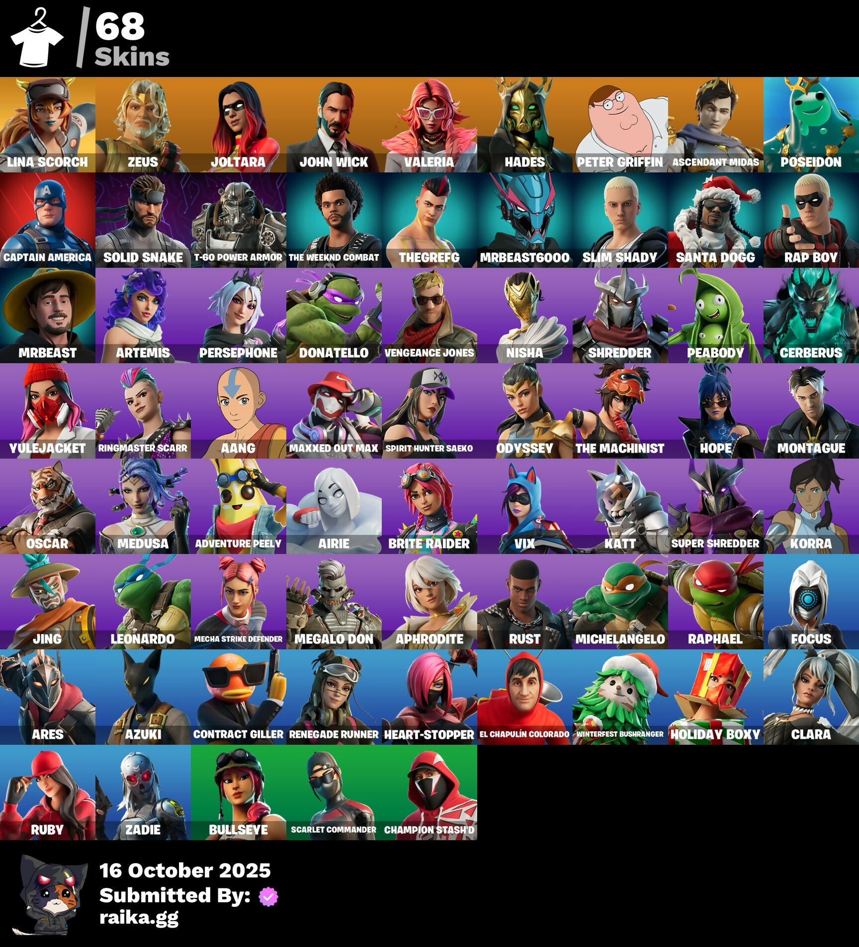 [PC/PSN/XBOX] 68 skins | Lina Scorch | Zeus | Joltara | John Wick | Valeria | Hades | Peter Griffin | Ascendant Midas | Poseidon | Captain America | 100 VB / FN