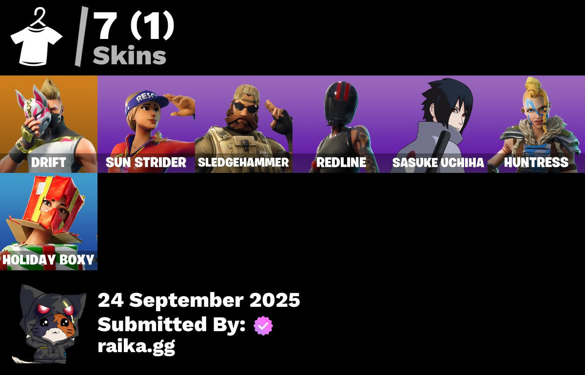 [PC/PSN/XBOX] 7 skins | Drift | Sun Strider | Sledgehammer | Redline | Sasuke Uchiha | Huntress | Holiday Boxy | Rust Bucket | Nemesis Box | 400 VB / FN