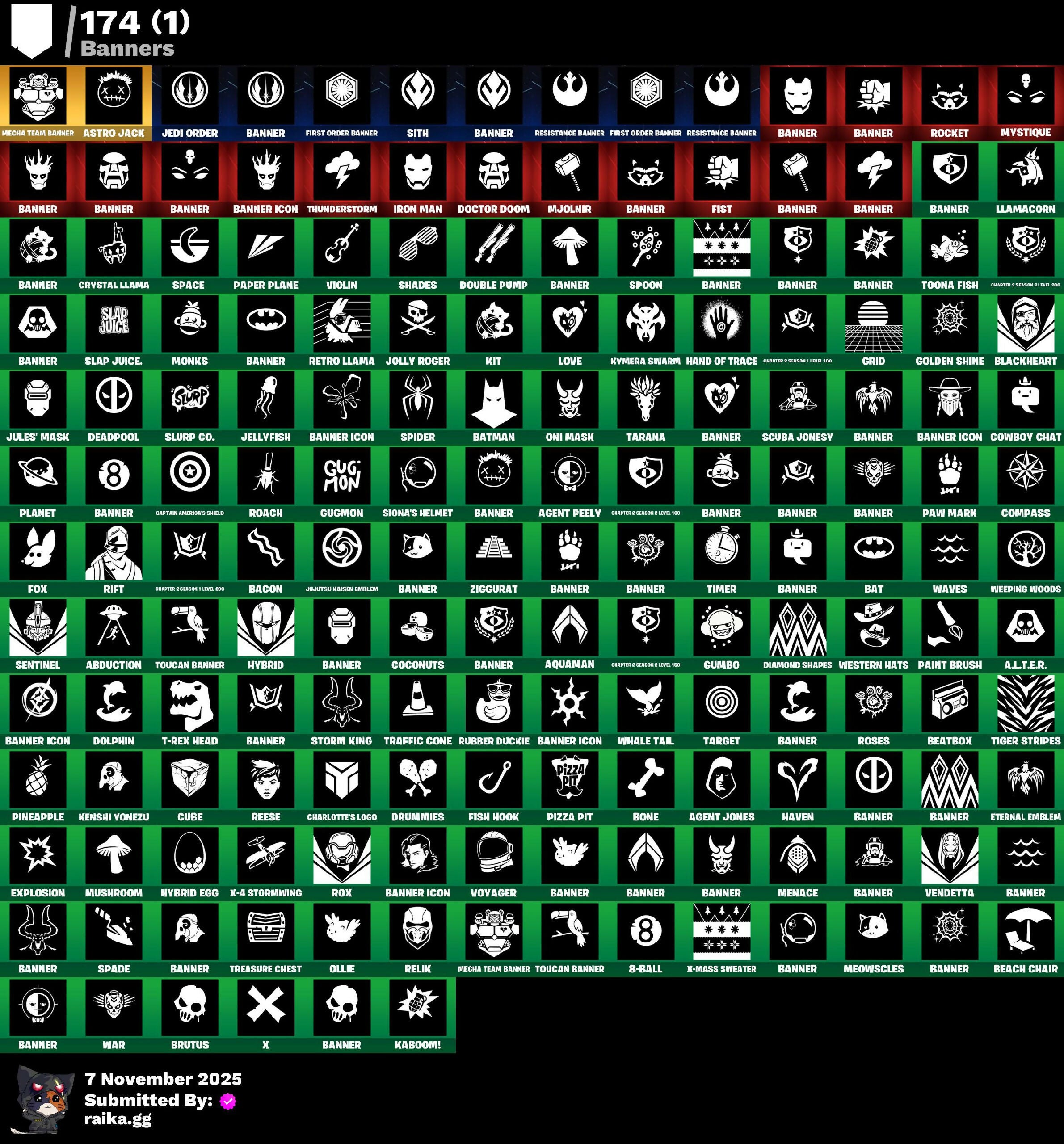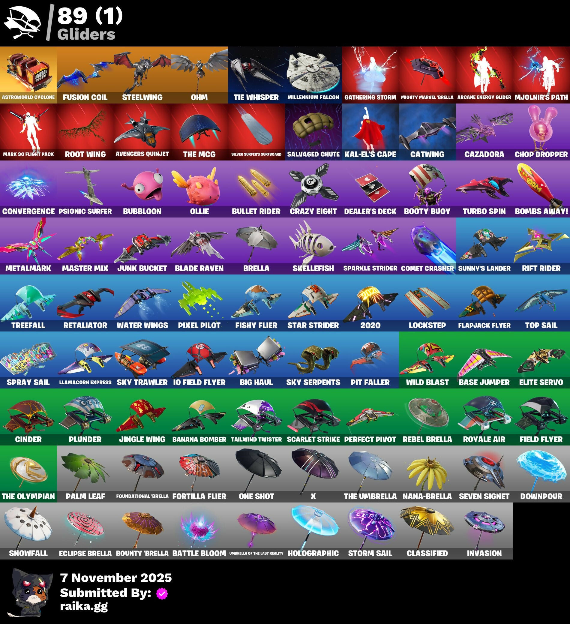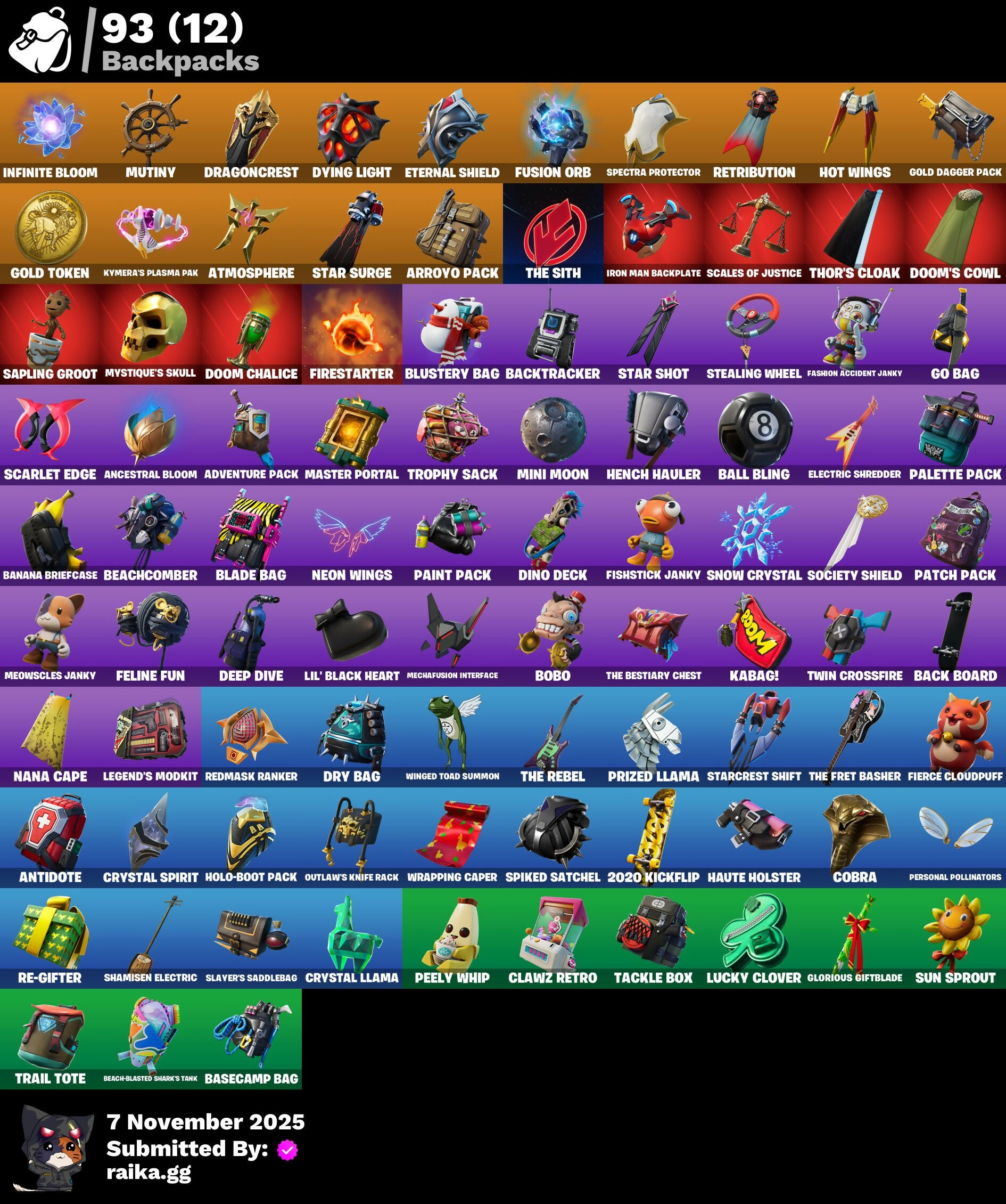 2020, 2020 Kickflip, 8-Ball, 8-Ball Vs Scratch, A.L.T.E.R., Abduction, Adventure Pack, Afterparty, Agent Jones, Agent Nana, Agent Peely, Air Shredder, Ancestral Bloom, Angler Axes, Antidote, Aquaman, Arcane Energy Glider, Arcane Steel, Ark, Arroyo Pack, Astro Jack, Astroworld Cyclone, Athleisure Assassin, Atmosphere, Aura, Avengers Logo, Avengers Quinjet, Back Board, Backtracker, Backup Blades, Bacon, Ball Bling, Banana Bomber, Banana Briefcase, Bananaxe, Bank Shots, Banner, Banner Icon, Base Jumper, Basecamp Bag, Bat, Batarang, Batman, Battle Bloom, Battle Call, Battle Mode, Beach Chair, Beach-Blasted Shark's Tank, Beachcomber, Beacon Trance, Beamers, Beatbox, Beep Beep, Bees!, Berserker Barrage!, Bhangra Boogie, Big Haul, Black Knight, Black Ops Sword, Blackheart, Blade Bag, Blade Of The Waning Moon, Blade Raven, Blasted, Blaze, Blocko, Blowing Bubbles, Blustery Bag, Bob Cut, Bobo, Boing!, Bombs Away!, Bone, Boobytrapped, Boogeyman, Boot It, Booty Buoy, Bot, Both Eyes Open, Boulder Breakers, Bounce Berry, Bouncer, Bounty 'Brella, Breakneck, Breathless Blades, Brella, Brite Bomber, Brutus, Bubloon, Bullet Rider, Bunker Basher, Bunker Jonesy, Burst Case Scenario, Bush Peek, Bushie Bright, Butterfly, Calico, Call Me, Callsign Skull, Cameo, Cameo Vs Chic, Captain America's Shield, Cash Grab, Catalyst, Catwing, Cazadora, Cerberus Bite, Charlotte's Logo, Chic, Chillshot, Chimpanski Wants You, Choice Knit, Chomp Cud!!, Chop Chop, Chop Dropper, Cinder, Classified, Clawz Retro, Clean Sweep, Click!, Cloudburst, Cluck Strut, Cobra, Coconuts, Coin Flip, Comet, Comet Crasher, Compass, Conga, Contour Camo, Convergence, Corrupted, Cosmic Cleavers, Cowboy Chat, Crabby King, Crazy Eight, Crescent Shroom, Crowned, Crowning Achievement, Crunk Bunny, Crystal Llama, Crystal Spirit, Cube, Cupid’s Daggers, Cursed, Dabstand, Dance Mat, Dark, Deadpool, Dealer's Deck, Deep Dive, Deep End, Demi, Demons Beware, Denim Destiny, Diamond Shapes, Dino Deck, Dive Knives, Doctor Doom, Doggo, Dolphin, Doom Chalice, Doom's Cowl, Double Pump, Downpour, Dragon Scales, Dragon Stance, Dragoncrest, Dragon’s Claw, Dread, Dribblin', Drift, Driftwood, Driver, Droop, Droopy, Dropout, Drummies, Dry Bag, Dusty Devastation, Dying Light, Dynamite, E.G.O., Eclipse Brella, Electric Shredder, Electro Swing, Elite Servo, Ember, Emote Camo, Eon Blades, Epic Swords Of Wonder, Eq, Eternal, Eternal Emblem, Eternal Knight, Eternal Shield, Eternal Voyager, Etheria, Everything's Fine, Explosion, Face Palm, Fade, Fade Out, Fallen Love Ranger, Falling Leaf, Falling Snow, Fang Saws, Fashion Accident Janky, Fate, Featherweight, Feelin' Jaunty, Feline Fun, Field Flyer, Fierce Clouduff, Fire V Ice, Firestarter, First Order Banner, Fish Hook, Fishbone, Fishstick Janky, Fishy Flier, Fist, Flapjack Flyer, Flippin' Away, Foil Flex, Fort Knighted, Fortilla Flier, Foundational 'Brella, Fox, Frosted, Frostwing, Frosty Globes, Fryangles, Fuel Rod And Tongs, Fusion, Fusion Coil, Fusion Orb, Fusion Scythe, G.O.A.T., GG Snakes, GG Snowman, Gangnam Style, Gathering Storm, Gear Specialist Maya, Gemstone, Gilded Morphic Blades, Gilded Scepter, Glorious Giftblade, Go Bag, Gold Brutus, Gold Dagger Pack, Gold Midas, Gold Token, Gold Touch, Golden King, Golden Shine, Golf Clap, Grav-Fusion, Greed, Grid, Groot, Groot Glow, Groot’s Sap Axes, Guggi Was Here, Gugmon, Gum Brawler, Gumbo, Hack & Smash, Hammerhead, Hammers Of Justice, Hand Of Lightning, Hand Signals, Hand of Trace, Happy Kit, Harmonic Axes, Hat - Dark, Haute Holster, Have A Seat, Haven, Heart Sign, Hello Friend, Hench, Hench Hauler, High Five, Highlight Strikers, Holiday Boxy, Holo-Boot Pack, Holographic, Hoodie, Hoop Master, Hope's Look, Hot Pokers, Hot Wings, Hula Hoopin', Hybrid, Hybrid Egg, I Declare!, I'm Diamond, IO Field Flyer, In Her Sights, Industrious, Infinite Bloom, Infinity Gauntlet, Invasion, Inventor's Choice, Iron Man, Iron Man Backplate, It's Complicated, It's Dynamite!, Jaywalking, Jazz Hands, Jedi Order, Jellyfish, Jennifer Walters, Jingle Wing, Jolly Roger, Josie, Journey, Journey Vs Hazard, Jubilation, Jujutsu Kaisen Emblem, Jules, Jules' Mask, Jump Jets, Junk Bucket, Jurassically Charged, Kabag!, Kaboom!, Kal-El's Cape, Keep It Mello, Kenshi Vonezu, Kevin, Kevin Runes, Keyed Up, King's Wrath, Kit, Knight's Helm, Knight's Honor, Knighted, Kon's Bark, Kymera, Kymera Swarm, Kymera's Plasma Pak, Laid Back Shuffle, Laser Blaze, Legend's Modkit, Lil' Black Heart, Lil' Saucer, Lion's Roar, Lithic, Llamacorn, Llamacorn Express, Lobby Classic, Lockpick, Lockstep, Love, Love It!, Love Ranger, Low ‘N Slow, Lt. Evergreen, Lucky Clover, Luxe, Mark 85 Energy Blade, Mark 90 Flight Pack, Mask, Masked Scuba Jonesy, Masq Mark, Master Engineer, Master Key, Master Mix, Master Plan, Master Portal, Maximum Drift, Mech Axe, Mecha Fish, Mecha Team Banner, Mechafusion Interface, Medaxe, Menace, Menacing Trace, Meowabunga!, Meowscles, Meowscles Janky, Meowstermind, Mercurial, Mermaid, Metalmark, Midas Memory, Midas' Shadow, Mighty Marvel 'Brella, Mighty Tree, Millennium Falcon, Mini Moon, Mjolnir, Mjolnir Strike, Mjolnir's Path, Moisty Mire, Molten Max Axe, Monks, Morphic Blue, Mushroom, Mutiny, Mystique, Mystique's Skull, Nailed It, Nana Cape, Nana Nana, Nana-Brella, Nanner Bashers, Neon Tropics, Neon Wings, New Year 2020, Night, Ninja Style, Nog Ops, Nolan Takes Aim, Nope, Ocean, Ocean Wave, Ohm, Ollie, One Shot, Oni Mask, Oozey, Origin, Outlaw's Knife Rack, Outlaw’s Whipknives, Overcharged, Paint Brush, Paint Pack, Palette Pack, Palm Leaf, Pandemonium, Paper Plane, Party Hips, Patch Pack, Paw Mark, Paws & Claws, Peace Out, Peeled, Peely, Peely Whip, Peppermint Pick, Perfect Pivot, Personal Pollinators, Piercing Ace, Pigskin, Pineapple, Pink, Pink Splatter, Pirate Parrot, Pirouette, Pit Faller, Pixel Jonesy, Pixel Pilot, Pizza Pit, Pizza Run, Planet, Planetary Vibe, Plunder, Polar Renegade, Polychrome Sunset, Power Claws, Power Surge, Prized Llama, Psionic Surfer, Psycho, Pulse Phase, Punk Ororo, Quac