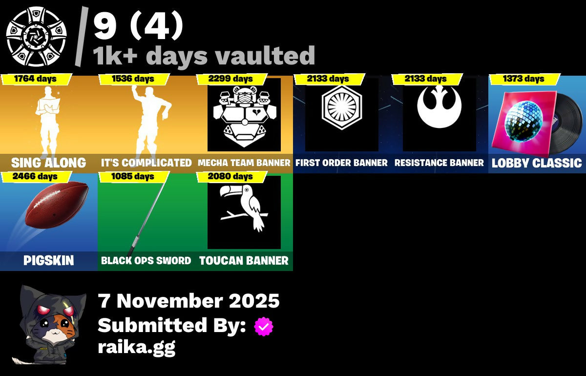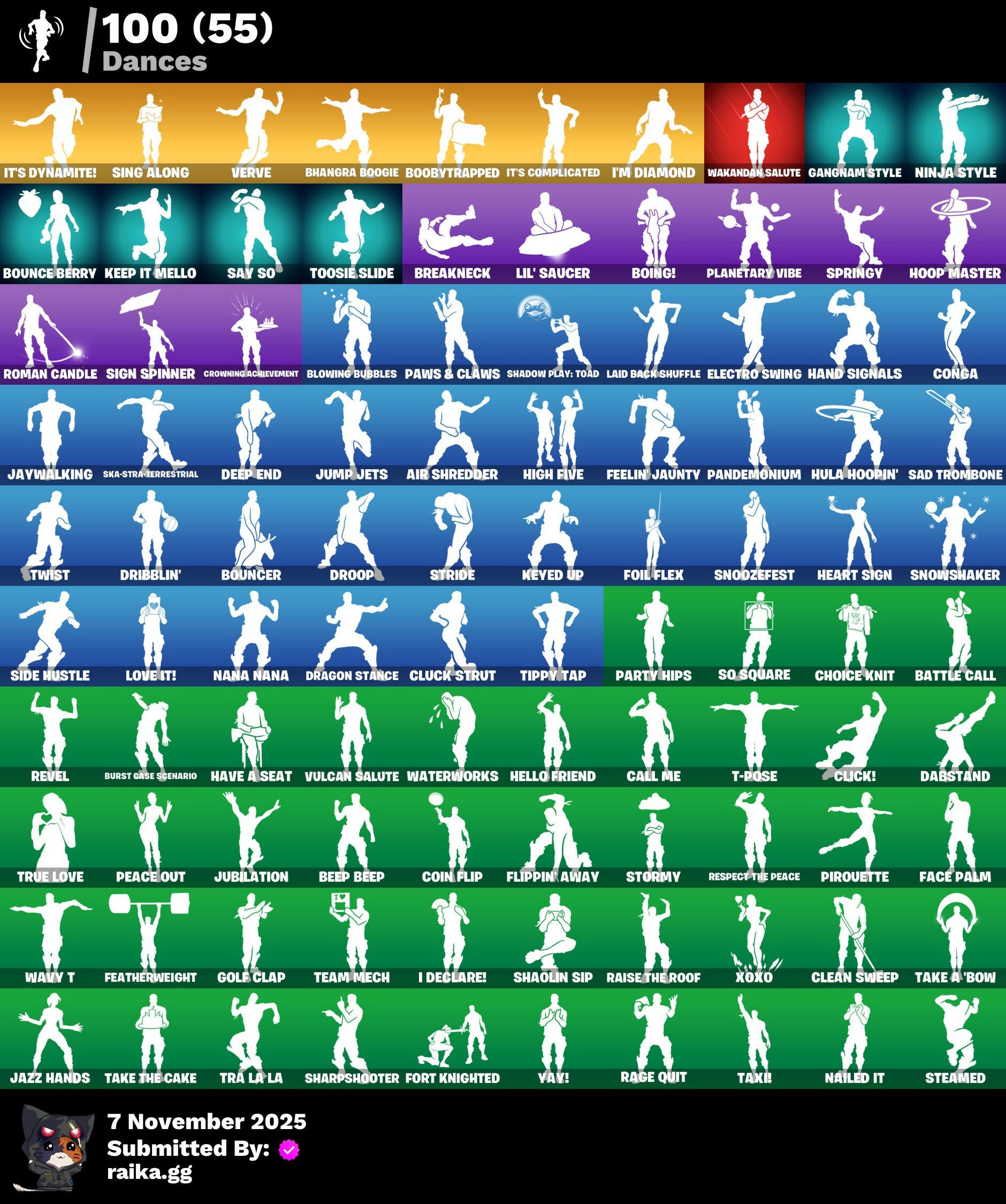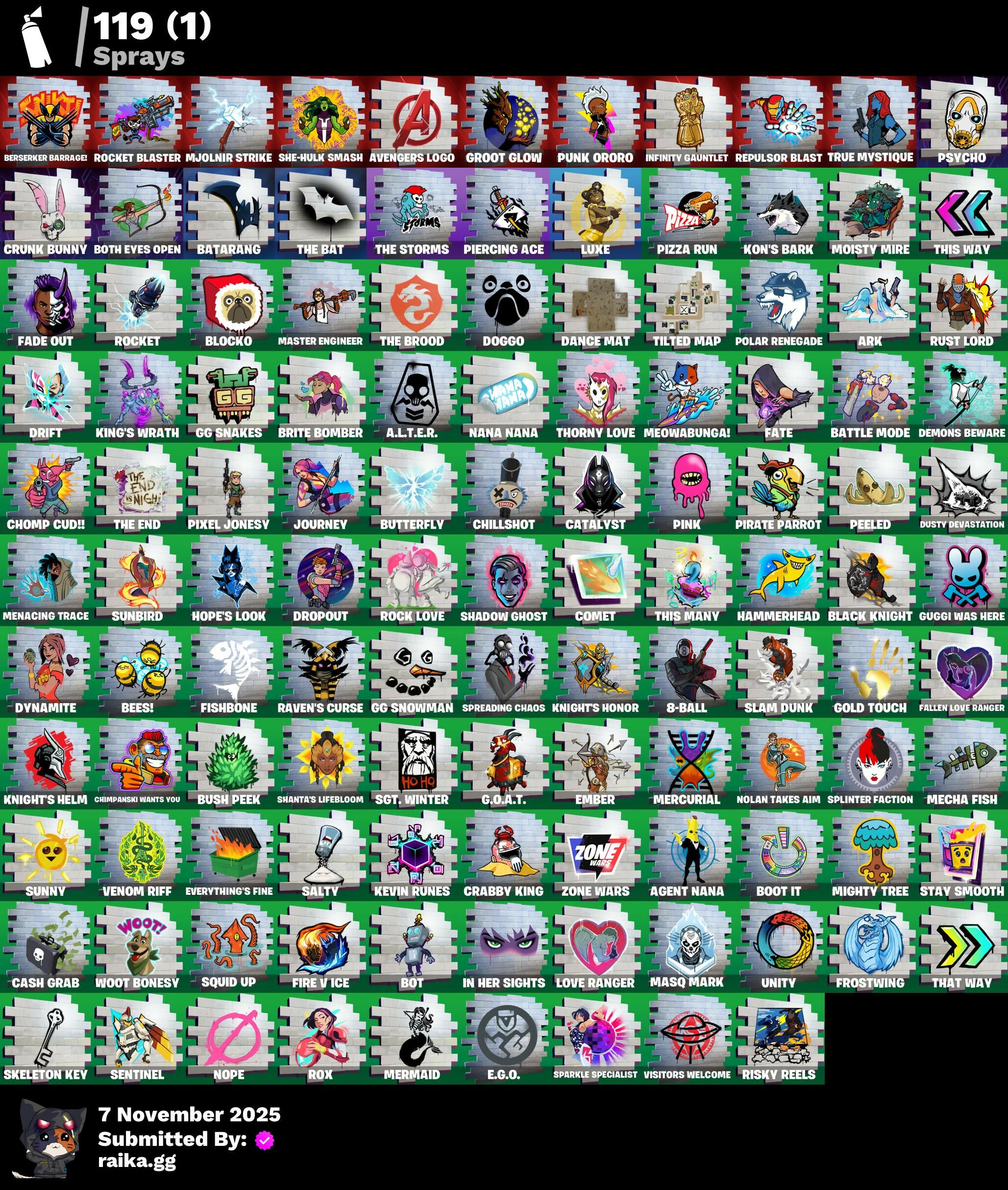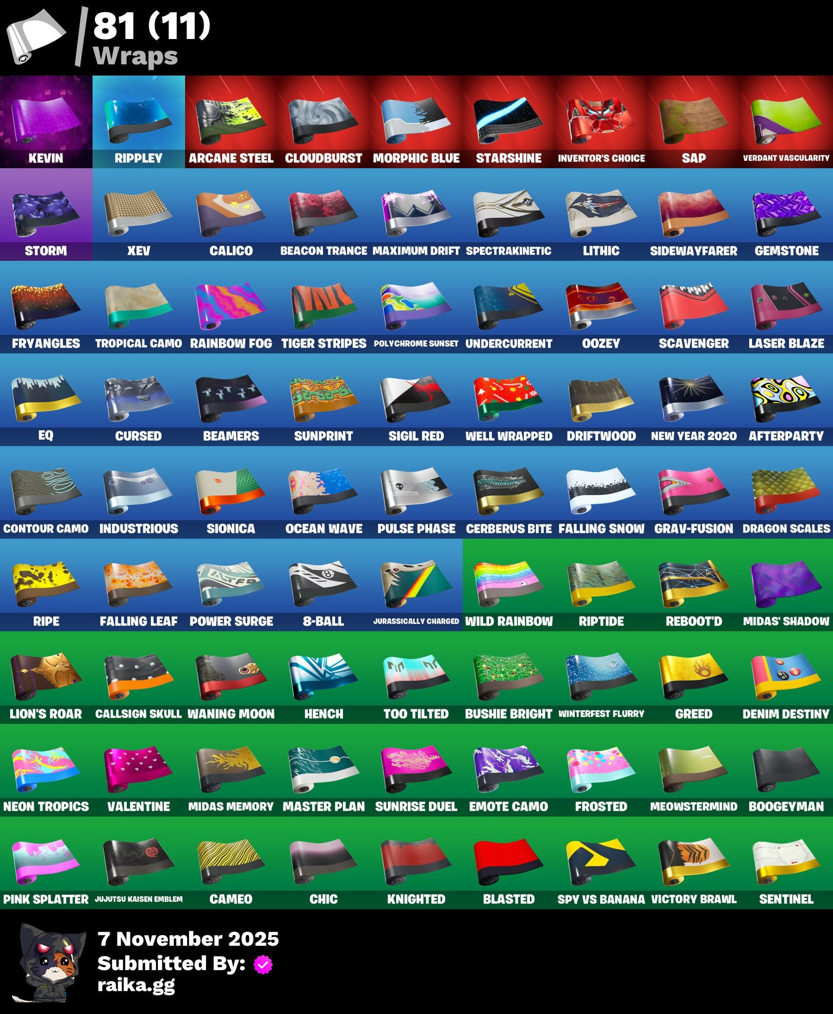 2020, 2020 Kickflip, 8-Ball, 8-Ball Vs Scratch, A.L.T.E.R., Abduction, Adventure Pack, Afterparty, Agent Jones, Agent Nana, Agent Peely, Air Shredder, Ancestral Bloom, Angler Axes, Antidote, Aquaman, Arcane Energy Glider, Arcane Steel, Ark, Arroyo Pack, Astro Jack, Astroworld Cyclone, Athleisure Assassin, Atmosphere, Aura, Avengers Logo, Avengers Quinjet, Back Board, Backtracker, Backup Blades, Bacon, Ball Bling, Banana Bomber, Banana Briefcase, Bananaxe, Bank Shots, Banner, Banner Icon, Base Jumper, Basecamp Bag, Bat, Batarang, Batman, Battle Bloom, Battle Call, Battle Mode, Beach Chair, Beach-Blasted Shark's Tank, Beachcomber, Beacon Trance, Beamers, Beatbox, Beep Beep, Bees!, Berserker Barrage!, Bhangra Boogie, Big Haul, Black Knight, Black Ops Sword, Blackheart, Blade Bag, Blade Of The Waning Moon, Blade Raven, Blasted, Blaze, Blocko, Blowing Bubbles, Blustery Bag, Bob Cut, Bobo, Boing!, Bombs Away!, Bone, Boobytrapped, Boogeyman, Boot It, Booty Buoy, Bot, Both Eyes Open, Boulder Breakers, Bounce Berry, Bouncer, Bounty 'Brella, Breakneck, Breathless Blades, Brella, Brite Bomber, Brutus, Bubloon, Bullet Rider, Bunker Basher, Bunker Jonesy, Burst Case Scenario, Bush Peek, Bushie Bright, Butterfly, Calico, Call Me, Callsign Skull, Cameo, Cameo Vs Chic, Captain America's Shield, Cash Grab, Catalyst, Catwing, Cazadora, Cerberus Bite, Charlotte's Logo, Chic, Chillshot, Chimpanski Wants You, Choice Knit, Chomp Cud!!, Chop Chop, Chop Dropper, Cinder, Classified, Clawz Retro, Clean Sweep, Click!, Cloudburst, Cluck Strut, Cobra, Coconuts, Coin Flip, Comet, Comet Crasher, Compass, Conga, Contour Camo, Convergence, Corrupted, Cosmic Cleavers, Cowboy Chat, Crabby King, Crazy Eight, Crescent Shroom, Crowned, Crowning Achievement, Crunk Bunny, Crystal Llama, Crystal Spirit, Cube, Cupid’s Daggers, Cursed, Dabstand, Dance Mat, Dark, Deadpool, Dealer's Deck, Deep Dive, Deep End, Demi, Demons Beware, Denim Destiny, Diamond Shapes, Dino Deck, Dive Knives, Doctor Doom, Doggo, Dolphin, Doom Chalice, Doom's Cowl, Double Pump, Downpour, Dragon Scales, Dragon Stance, Dragoncrest, Dragon’s Claw, Dread, Dribblin', Drift, Driftwood, Driver, Droop, Droopy, Dropout, Drummies, Dry Bag, Dusty Devastation, Dying Light, Dynamite, E.G.O., Eclipse Brella, Electric Shredder, Electro Swing, Elite Servo, Ember, Emote Camo, Eon Blades, Epic Swords Of Wonder, Eq, Eternal, Eternal Emblem, Eternal Knight, Eternal Shield, Eternal Voyager, Etheria, Everything's Fine, Explosion, Face Palm, Fade, Fade Out, Fallen Love Ranger, Falling Leaf, Falling Snow, Fang Saws, Fashion Accident Janky, Fate, Featherweight, Feelin' Jaunty, Feline Fun, Field Flyer, Fierce Clouduff, Fire V Ice, Firestarter, First Order Banner, Fish Hook, Fishbone, Fishstick Janky, Fishy Flier, Fist, Flapjack Flyer, Flippin' Away, Foil Flex, Fort Knighted, Fortilla Flier, Foundational 'Brella, Fox, Frosted, Frostwing, Frosty Globes, Fryangles, Fuel Rod And Tongs, Fusion, Fusion Coil, Fusion Orb, Fusion Scythe, G.O.A.T., GG Snakes, GG Snowman, Gangnam Style, Gathering Storm, Gear Specialist Maya, Gemstone, Gilded Morphic Blades, Gilded Scepter, Glorious Giftblade, Go Bag, Gold Brutus, Gold Dagger Pack, Gold Midas, Gold Token, Gold Touch, Golden King, Golden Shine, Golf Clap, Grav-Fusion, Greed, Grid, Groot, Groot Glow, Groot’s Sap Axes, Guggi Was Here, Gugmon, Gum Brawler, Gumbo, Hack & Smash, Hammerhead, Hammers Of Justice, Hand Of Lightning, Hand Signals, Hand of Trace, Happy Kit, Harmonic Axes, Hat - Dark, Haute Holster, Have A Seat, Haven, Heart Sign, Hello Friend, Hench, Hench Hauler, High Five, Highlight Strikers, Holiday Boxy, Holo-Boot Pack, Holographic, Hoodie, Hoop Master, Hope's Look, Hot Pokers, Hot Wings, Hula Hoopin', Hybrid, Hybrid Egg, I Declare!, I'm Diamond, IO Field Flyer, In Her Sights, Industrious, Infinite Bloom, Infinity Gauntlet, Invasion, Inventor's Choice, Iron Man, Iron Man Backplate, It's Complicated, It's Dynamite!, Jaywalking, Jazz Hands, Jedi Order, Jellyfish, Jennifer Walters, Jingle Wing, Jolly Roger, Josie, Journey, Journey Vs Hazard, Jubilation, Jujutsu Kaisen Emblem, Jules, Jules' Mask, Jump Jets, Junk Bucket, Jurassically Charged, Kabag!, Kaboom!, Kal-El's Cape, Keep It Mello, Kenshi Vonezu, Kevin, Kevin Runes, Keyed Up, King's Wrath, Kit, Knight's Helm, Knight's Honor, Knighted, Kon's Bark, Kymera, Kymera Swarm, Kymera's Plasma Pak, Laid Back Shuffle, Laser Blaze, Legend's Modkit, Lil' Black Heart, Lil' Saucer, Lion's Roar, Lithic, Llamacorn, Llamacorn Express, Lobby Classic, Lockpick, Lockstep, Love, Love It!, Love Ranger, Low ‘N Slow, Lt. Evergreen, Lucky Clover, Luxe, Mark 85 Energy Blade, Mark 90 Flight Pack, Mask, Masked Scuba Jonesy, Masq Mark, Master Engineer, Master Key, Master Mix, Master Plan, Master Portal, Maximum Drift, Mech Axe, Mecha Fish, Mecha Team Banner, Mechafusion Interface, Medaxe, Menace, Menacing Trace, Meowabunga!, Meowscles, Meowscles Janky, Meowstermind, Mercurial, Mermaid, Metalmark, Midas Memory, Midas' Shadow, Mighty Marvel 'Brella, Mighty Tree, Millennium Falcon, Mini Moon, Mjolnir, Mjolnir Strike, Mjolnir's Path, Moisty Mire, Molten Max Axe, Monks, Morphic Blue, Mushroom, Mutiny, Mystique, Mystique's Skull, Nailed It, Nana Cape, Nana Nana, Nana-Brella, Nanner Bashers, Neon Tropics, Neon Wings, New Year 2020, Night, Ninja Style, Nog Ops, Nolan Takes Aim, Nope, Ocean, Ocean Wave, Ohm, Ollie, One Shot, Oni Mask, Oozey, Origin, Outlaw's Knife Rack, Outlaw’s Whipknives, Overcharged, Paint Brush, Paint Pack, Palette Pack, Palm Leaf, Pandemonium, Paper Plane, Party Hips, Patch Pack, Paw Mark, Paws & Claws, Peace Out, Peeled, Peely, Peely Whip, Peppermint Pick, Perfect Pivot, Personal Pollinators, Piercing Ace, Pigskin, Pineapple, Pink, Pink Splatter, Pirate Parrot, Pirouette, Pit Faller, Pixel Jonesy, Pixel Pilot, Pizza Pit, Pizza Run, Planet, Planetary Vibe, Plunder, Polar Renegade, Polychrome Sunset, Power Claws, Power Surge, Prized Llama, Psionic Surfer, Psycho, Pulse Phase, Punk Ororo, Quac