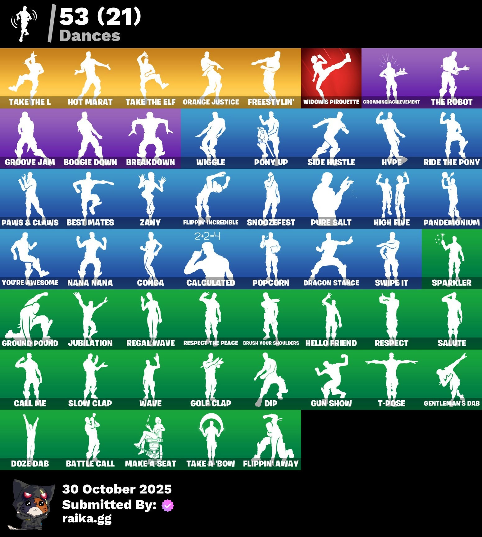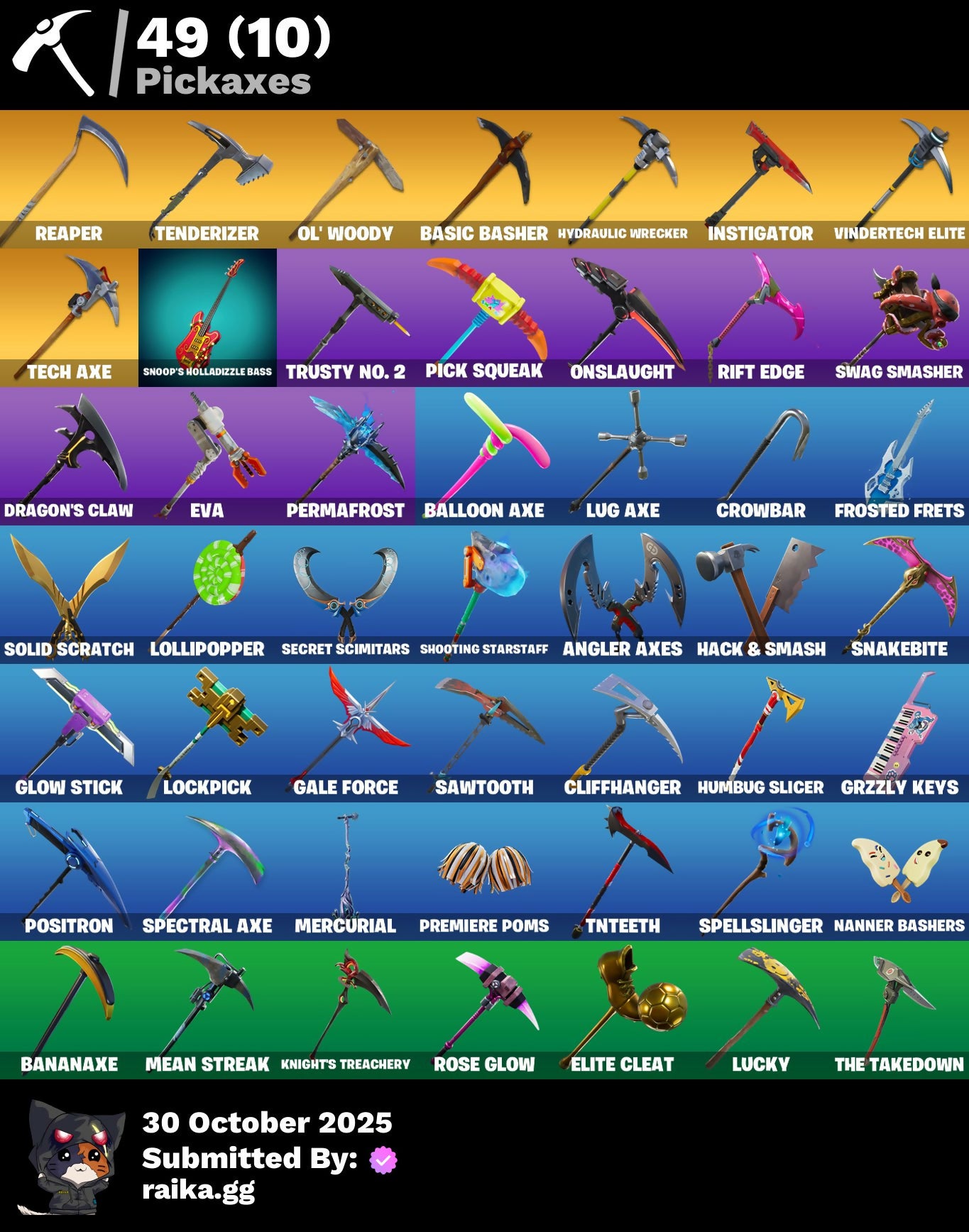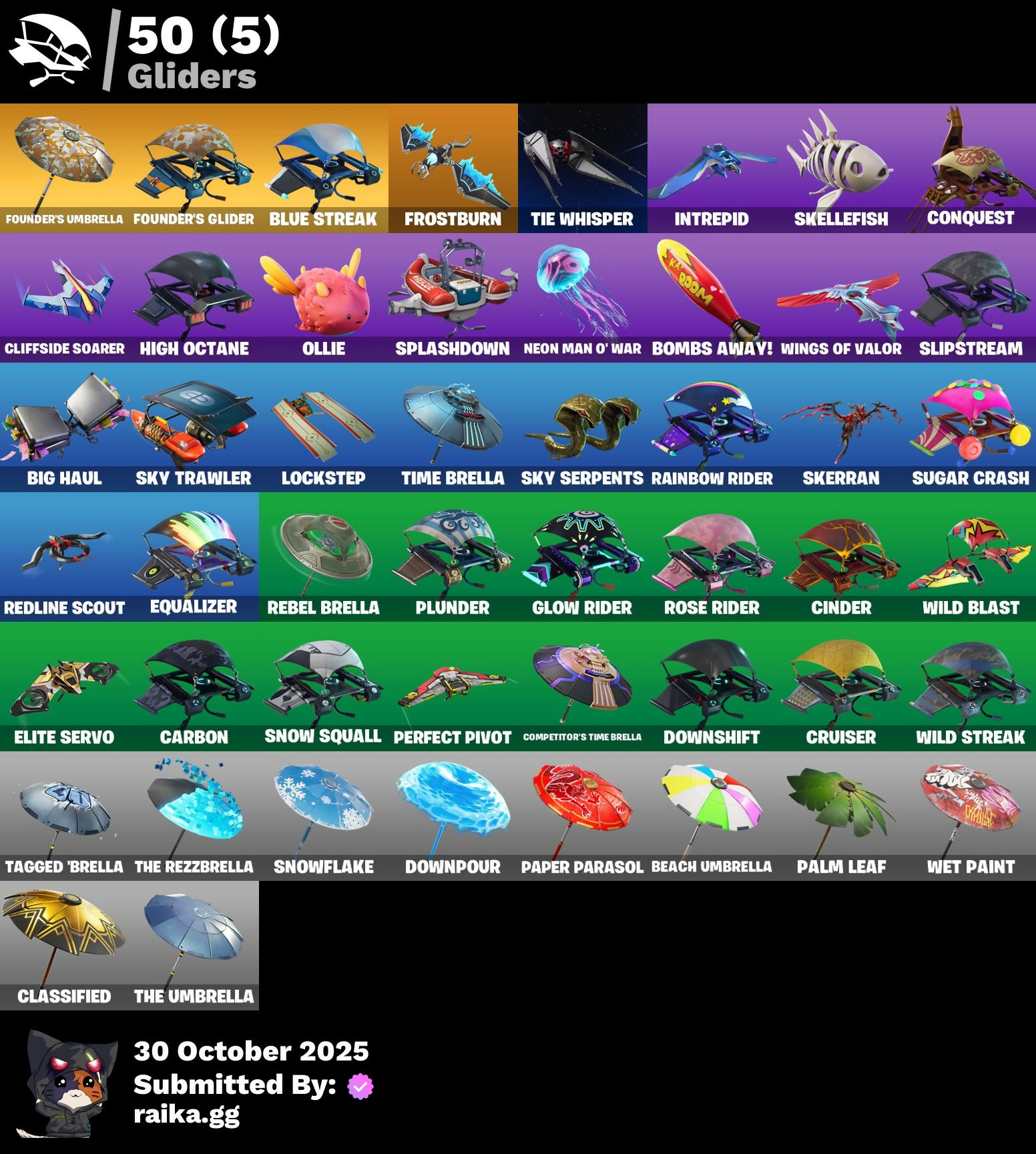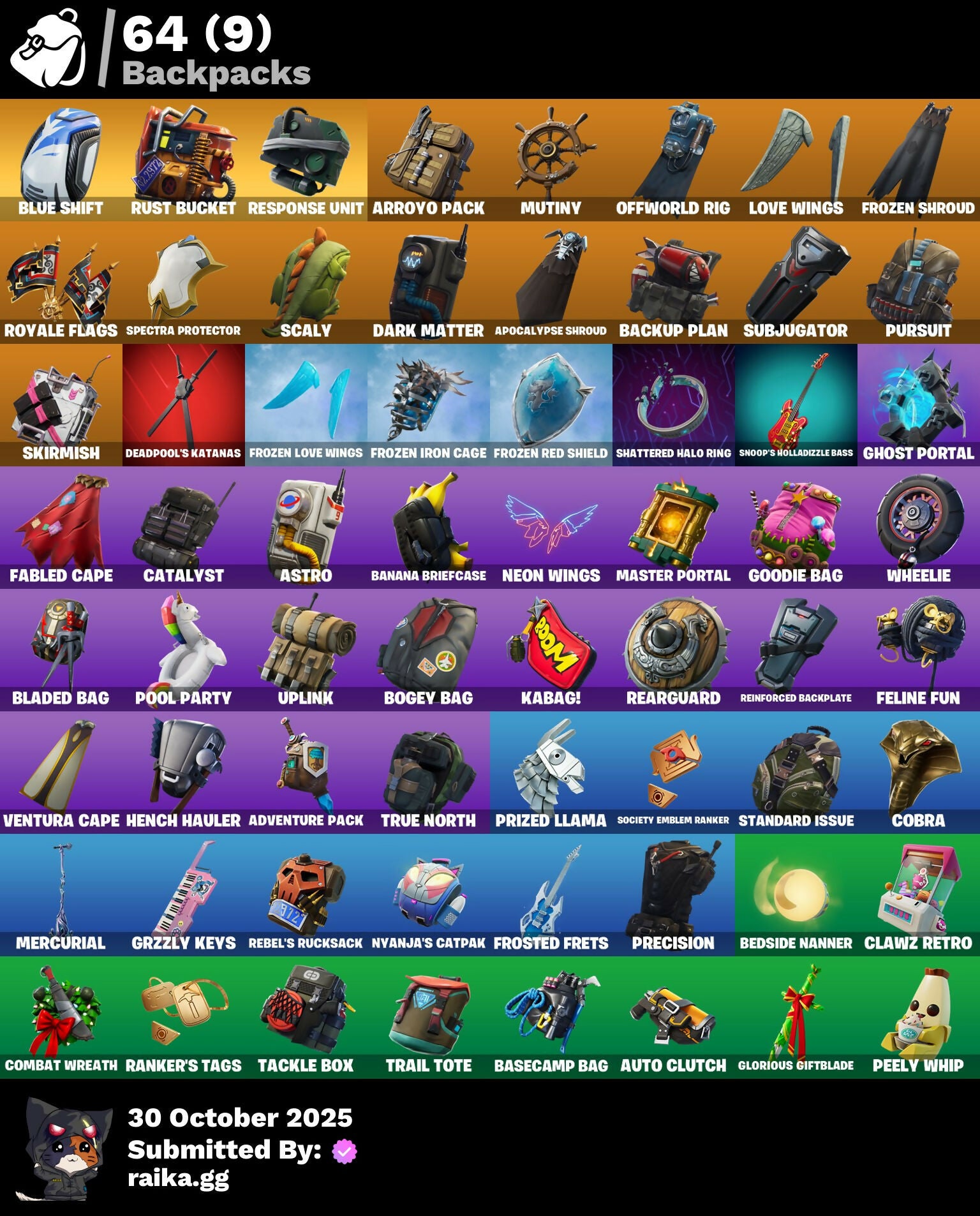 Adventure Pack, Agent Peely, Angler Axes, Apocalypse Shroud, Arroyo Pack, Astro, Auto Clutch, Backup Plan, Balloon Axe, Banana Briefcase, Bananaxe, Basecamp Bag, Basic Basher, Battle Call, Battlehawk, Beach Umbrella, Bedside Nanner, Best Mates, Big Haul, Blackheart, Bladed Bag, Blue Shift, Blue Streak, Blue Striker, Blue Team Leader, Bogey Bag, Bombs Away!, Boogie Down, Breakdown, Brite Bomber, Brush Your Shoulders, Brutus, Burnout, Calculated, Call Me, Carbide, Carbon, Catalyst, Cinder, Classified, Clawz Retro, Cliffhanger, Cliffside Soarer, Cobalt, Cobra, Combat Wreath, Conga, Conquest, Crowbar, Crowning Achievement, Cruiser, Dark Matter, Dark Voyager, Deadpool, Deadpool's Katanas, Dip, Downpour, Downshift, Doze Dab, Dragon Stance, Dragon's Claw, Drift, Elite Agent, Elite Cleat, Elite Servo, Enforcer, Equalizer, Eva, Fabled Cape, Feline Fun, Flippin' Away, Flippin' Incredible, Founder's Glider, Founder's Umbrella, Freestylin', Frostburn, Frosted Frets, Frozen Iron Cage, Frozen Love Ranger, Frozen Love Wings, Frozen Raven, Frozen Red Knight, Frozen Red Shield, Frozen Shroud, Gale Force, Gear Specialist Maya, Gentleman's Dab, Ghost Portal, Glorious Giftblade, Glow Rider, Glow Stick, Golf Clap, Goodie Bag, Groove Jam, Ground Pound, Grzzly Keys, Gun Show, Hack & Smash, Havoc, Hello Friend, Hench Hauler, High Five, High Octane, Holiday Boxy, Hot Marat, Humbug Slicer, Huntress, Hybrid, Hydraulic Wrecker, Hype, Instigator, Intrepid, Journey Vs Hazard, Jubilation, Kabag!, Knight's Treachery, Liteshow, Lockpick, Lockstep, Lollipopper, Love Ranger, Love Wings, Lucky, Lug Axe, Make A Seat, Master Portal, Mean Streak, Meowscles, Mercurial, Midnight Ops, Mission Specialist, Moonwalker, Munitions Expert, Mutiny, Nana Nana, Nanner Bashers, Neon Man O' War, Neon Wings, Nitelite, Nog Ops, Nyanja's Catpak, Offworld Rig, Ol' Woody, Ollie, Omega, Onslaught, Orange Justice, Palm Leaf, Pandemonium, Paper Parasol, Paws & Claws, Peely, Peely Whip, Perfect Pivot, Permafrost, Pick Squeak, Plunder, Poised Playmaker, Pony Up, Pool Party, Popcorn, Positron, Precision, Premiere Poms, Prized Llama, Pure Salt, Pursuit, Ragnarok, Rainbow Rider, Ranker's Tags, Reaper, Rearguard, Rebel Brella, Rebel's Rucksack, Red Strike, Red-Nosed Raider, Redline, Redline Scout, Reflex, Regal Wave, Reinforced Backplate, Respect, Respect The Peace, Response Unit, Rex, Ride The Pony, Rift Edge, Rippley Vs Sludge, Rogue Agent, Rook, Rose Glow, Rose Rider, Rose Team Leader, Royale Flags, Runway Racer, Rust Bucket, Rust Lord, Salute, Santa Dogg, Sawtooth, Scaly, Secret Scimitars, Shattered Halo Ring, Shooting Starstaff, Side Hustle, Sidewinder, Skellefish, Skerran, Skirmish, Skull Trooper, Sky Serpents, Sky Trawler, Sledgehammer, Slipstream, Slow Clap, Snakebite, Snoop's Holladizzle Bass, Snoozefest, Snow Squall, Snowflake, Society Emblem Ranker, Solid Scratch, Sparkler, Spectra Protector, Spectral Axe, Spellslinger, Splashdown, Squad Leader, Standard Issue, Sub Commander, Subjugator, Sugar Crash, Sun Strider, Swag Smasher, Swipe It, T-Pose, Tackle Box, Tagged 'Brella, Take A 'Bow, Take The Elf, Take The L, Tech Axe, Teknique, Tenderizer, The Mighty Volt, The Reaper, The Rezzbrella, The Robot, The Takedown, The Umbrella, The Visitor, Tie Whisper, Time Brella, Tnteeth, Tntina, Trail Tote, Trailblazer, True North, Trusty No. 2, Turk Vs Riptide, Uplink, Valor, Ventura, Ventura Cape, Vindertech Elite, Warpaint, Wave, Wet Paint, Wheelie, Whiplash, Widow's Pirouette, Wiggle, Wild Blast, Wild Streak, Wingman, Wings of Valor, Winterfest Bushranger, Wukong, You're Awesome, Zany, Zoey