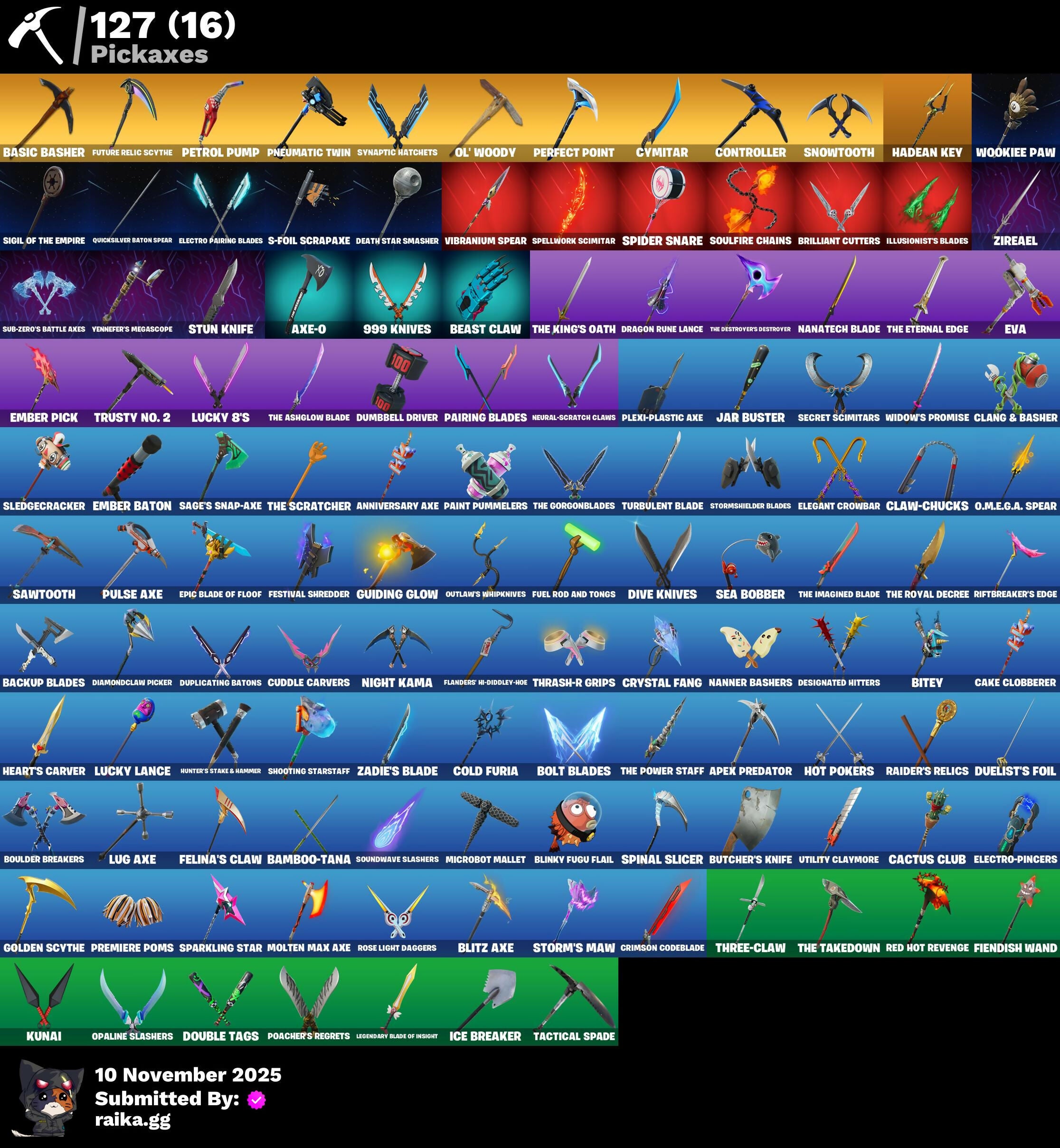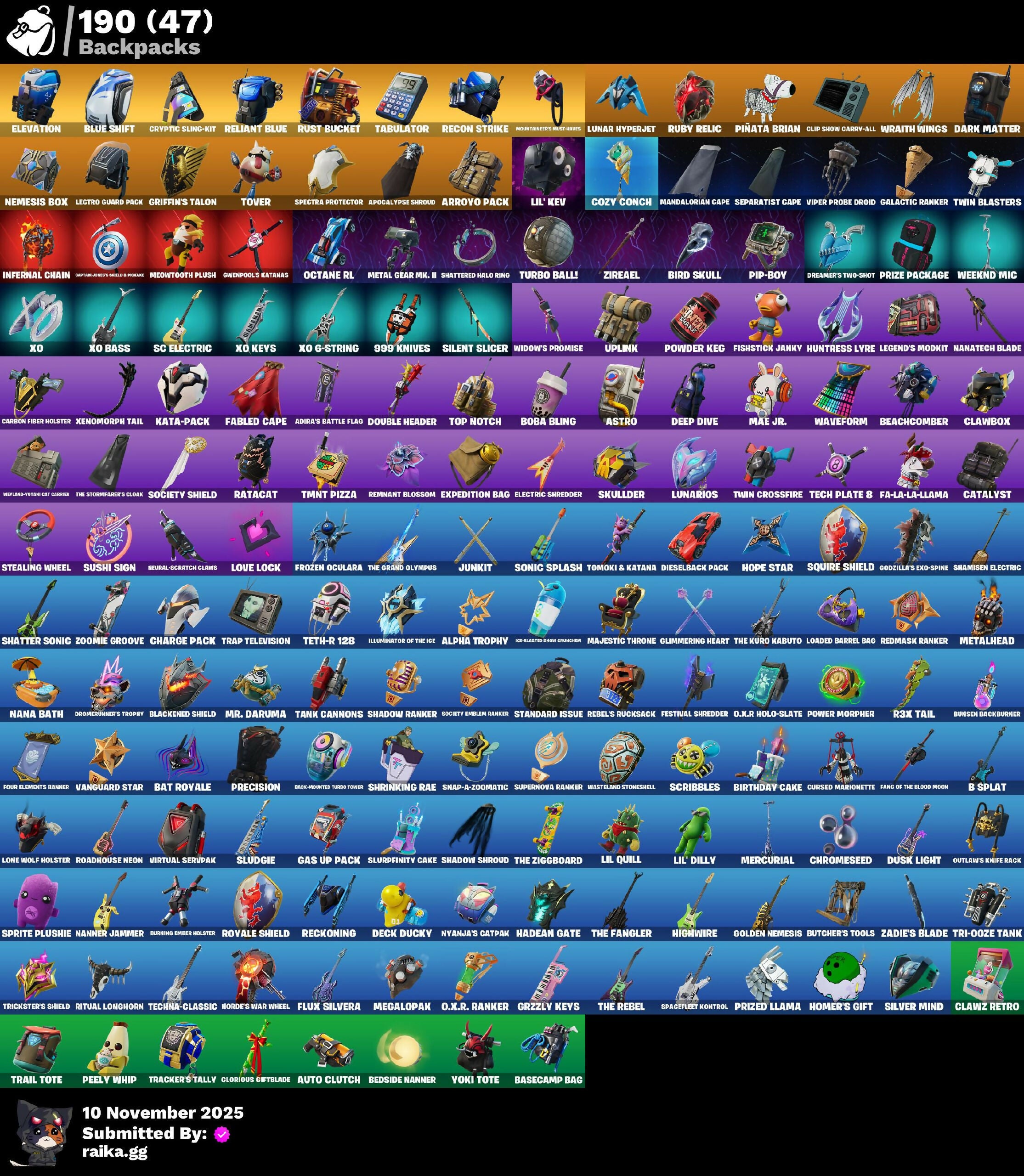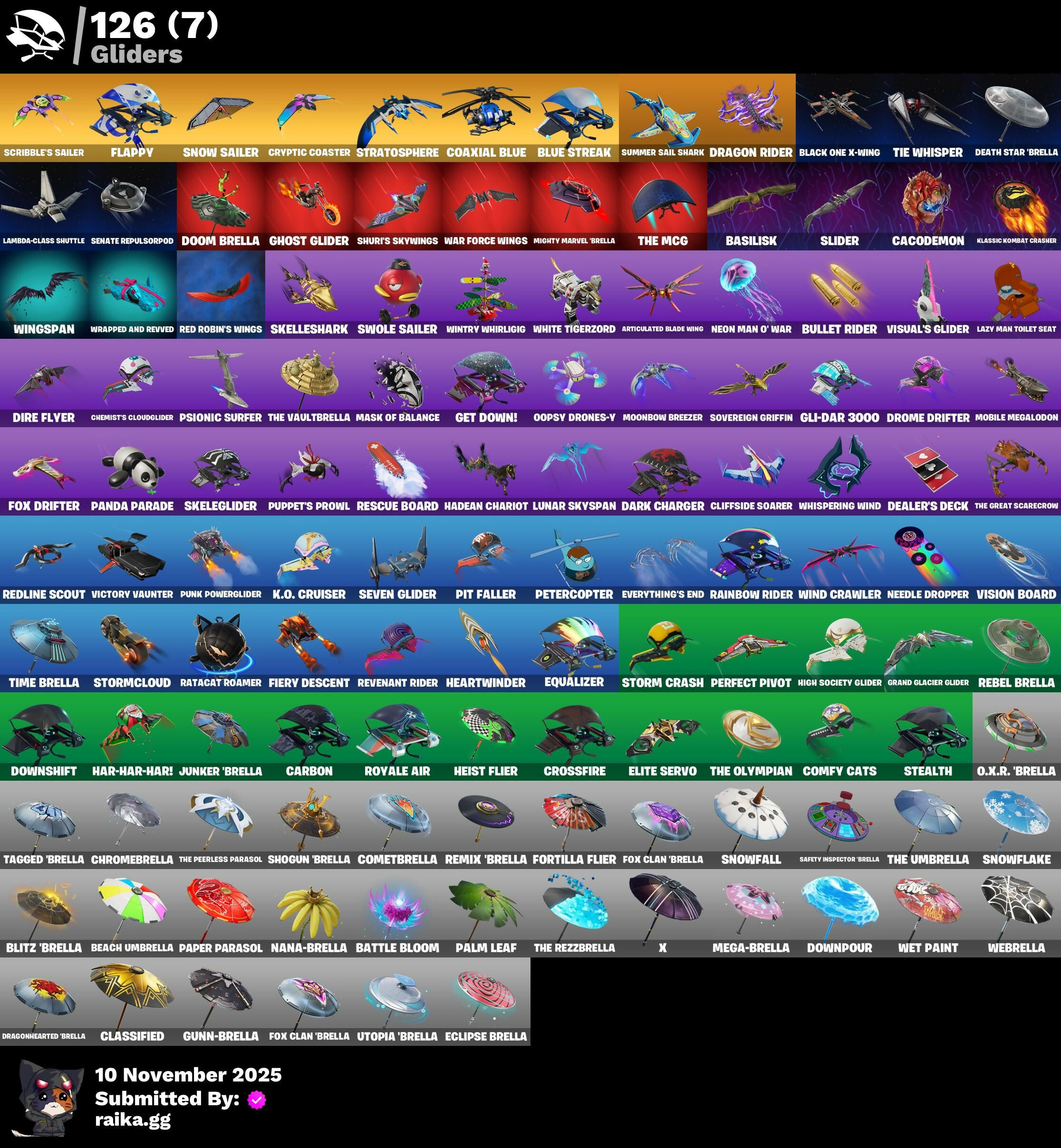212th Battalion Trooper, 501st Trooper, 999 Knives, Adira, Adira's Battle Flag, Afk, Alpha Trophy, Anniversary Axe, Apex Predator, Apocalypse Shroud, Arctic Adeline, Arroyo Pack, Articulated Blade Wing, Ascend!, Astro, Auto Clutch, Axe-O, B Splat, Backup Blades, Bamboo-Tana, Baron's Hoard, Basecamp Bag, Basic Basher, Basilisk, Bat Royale, Battle Bloom, Battle Call, Beach Umbrella, Beachcomber, Bear Hug, Beast Claw, Bedside Nanner, Best Mates, Bike To Go, Billy, Bird Skull, Birthday Cake, Bitey, Black One X-Wing, Black Wings, Blackened Shield, Blinky Fugu Flail, Blitz 'Brella, Blitz Axe, Blizzard Bomber, Blowin' Up, Blue Shift, Blue Squire, Blue Streak, Blue Striker, Blue Team Leader, Boba Bling, Bolt Blades, Boo'd Up Groove, Boogie Down, Boulder Breakers, Breaking Point, Brilliant Cutters, Bullet Rider, Bunsen Backburner, Burning Ember Holster, Butcher's Knife, Butcher's Tools, Cacodemon, Cactus Club, Cake Clobberer, Call Me, Capoeira, Captain Llamerica, Carbon, Carbon Fiber Holster, Card Drop, Catalyst, Cauldron Chill, Charge Pack, Chemist's Cloudglider, Chrome Punk, Chromebrella, Chromeseed, Ciri, Clang & Basher, Classified, Claw-Chucks, Clawbox, Clawz Retro, Cliffside Soarer, Cloud Striker, Coaxial Blue, Colby, Cold Furia, Cometbrella, Comfy Cats, Committed, Controller, Copines, Cozy Conch, Crimson Codeblade, Crossfire, Crowning Achievement, Cryptic Coaster, Cryptic Sling-Kit, Crystal Fang, Crz-8, Cuddle Carvers, Cupid's Arrow, Curling Iron, Cursed Marionette, Cyclo Curl, Cymitar, Dagger Dance, Dark Charger, Dark Matter, Dark Side, Dark Voyager, Darth Vader, Dealer's Deck, Death Rockers, Death Star 'Brella, Death Star Smasher, Deck Ducky, Deep Dive, Designated Hitters, Diamond Throne, Diamondclaw Picker, Dieselback Pack, Dire Flyer, Dive Knives, Doom Brella, Double Header, Double Tags, Downpour, Downshift, Doze Dab, Dragon Rider, Dragon Rune Lance, Dragonhearted 'Brella, Dreamer's Two-Shot, Drome Drifter, Dromerunner's Trophy, Duelist's Foil, Dumbbell Driver, Duplicating Batons, Dusk Knight, Dusk Light, Eclipse Brella, Electric Shredder, Electro Pairing Blades, Electro-Pincers, Elegant Crowbar, Elevation, Elite Servo, Ellen Ripley, Ember Baton, Ember Pick, Epic Blade Of Floof, Equalizer, Eva, Everything's End, Evie, Expedition Bag, Fa-La-La-Llama, Fabled Cape, Face Palm, Fancy Feet, Fang of the Blood Moon, Fastest Fastball, Felina, Felina's Claw, Festival Shredder, Fiendish Wand, Fiery Descent, Fishstick Janky, Fist Bump, Fixer, Flanders' Hi-Diddley-Hoe, Flappy, Flippin' Away, Flux Silvera, Focused, Foil Flex, Follow The Butterfly, Fortilla Flier, Four Elements Banner, Fox Clan 'Brella, Fox Drifter, Frozen Oculata, Fuel Rod And Tongs, Full Googly, Future Relic Scythe, Galactic Ranker, Gas Up Pack, Gentleman's Dab, Get Down!, Ghost Glider, Ghost Rider, Gli-Dar 3000, Glimmering Heart, Glorious Giftblade, Golden Nemesis, Golden Scythe, Golf Clap, Good Sportsmanship, Grand Glacier Glider, Griffin's Talon, Grizzly Keys, Guiding Glow, Guitar Walk, Gun Show, Gunn-Brella, Hadean Chariot, Hadean Gate, Hadean Key, Hang Loose, Har-Har-Har!, Have A Seat, Heads Up, Heart's Carver, Heartburst, Heartwinder, Heist Flier, Hello Friend, High Society Glider, Highwire, Holiday Boxy, Homer's Gift, Hope, Hope Star, Horde's War Wheel, Hot Marat, Hot Pokers, Hunter's Stake & Hammer, Huntress Lyre, Hypnot-Eyes, I'm A Mystery, Ice Breaker, Illusionist's Blades, Imperial March, In The End, Infernal Chain, Introducing..., It Is Finished, It's Go Time!, Jar Buster, Jet Signals, Jubilation, Jun-Hwan, Junker 'Brella, Junkit, K.O. Cruiser, Kata-Pack, Kingsley, Kiss Kiss, Klassic Kombat Crasher, Knife Sharpener, Kunai, Lambda-Class Shuttle, Lazy Man Toilet Seat, Lectro Guard Pack, Legend's Modkit, Legendary Blade Of Insight, Lil Quill, Lil' Dilly, Lil' Kev, Lil' Prancer, Lil' Station Wagon, Lina Scorch, Loaded Barrel Bag, Lone Wolf Holster, Love Lock, Lucky 8's, Lucky Lance, Lug Axe, Lunar Hyperjet, Lunar Skyspan, Lunarios, Mae Jr., Majestic Throne, Make A Seat, Malik, Mandalorian Cape, Mandalorian Warrior, Mask of Balance, Master Of Puppets, Meat Grinder, Mega-Brella, Megalopak, Meowtooth Plush, Mercurial, Metal Gear Mk. II, Metalhead, Microbot Mallet, Microflip, Mighty Marvel 'Brella, Mini Dogfight, Mission Specialist, Mobile Megalodon, Molten Max Axe, Montague, Moonbow Breezer, Moonwalker, Mr. Daruma, Mrbeast6000, Nana Bath, Nana-Brella, Nanatech Blade, Nanner Bashers, Nanner Jammer, Needle Dropper, Nemesis Box, Neon Man O' War, Neural-Scratch Claws, Neuralynx, Night Kama, Ninja Stance: Donnie, Ninja Stance: Leo, Nisha, Nyanja's Catpak, O.M.E.G.A. Spear, O.X.R Holo-Slate, O.X.R Ranker, O.X.R. 'Brella, Octane RL, Ol' Woody, Old School, Oopsy Drones-V, Opaline Slashers, Orange Justice, Oscar, Outlaw's Knife Rack, Outlaw's Whipknives, Owenpool's Katanas, P33ly, Pac-Brained, Paint Pummelers, Pairing Blades, Palm Leaf, Panda Parade, Paper Parasol, Peely Whip, Perfect Pivot, Perfect Point, Peter Griffin, Petercopter, Petrol Pump, Pig The Butcher, Pip-Boy, Pit Faller, Piñata Brian, Plexi-Plastic Axe, Pneumatic Twin, Poacher's Regrets, Point & Shoot, Point Patroller, Pony Up, Popular Vibe, Powder Keg, Power Morpher, Precision, Prefect Patroller, Premiere Poms, Prize Package, Prized Llama, Prodigy, Psionic Surfer, Pull Up, Pulse Axe, Pumped!, Pumpernickel, Punk Powerglider, Puppet's Prowl, Quicksilver Baton Spear, R3X Tail, Raider's Relics, Rainbow Rider, Ratacat, Ratcat Roamer, Raven's Legion, Rebel Brella, Rebel's Rucksack, Reckoning, Recon Strike, Red Card, Red Hot Revenge, Red Robin's Wings, Redline Scout, Redmask Ranker, Regal Wave, Reliant Blue, Remix 'Brella, Remnant Blossom, Rescue Board, Respect The Peace, Revenant Rider, Riches, Ride The Pony, Riftbreaker's Edge, Ritual Longhorn, Roadhouse Neon, Rock Out, Rock Paper Scissors, Rogue Agent, Rose Light Daggers, Roundabout, Royale Air, Royale Knight, Royale Shield, Ruby Relic, Runway Racer, Rust Bucket, Rust Lord, S-Foil Scrapaxe, SC Electric, Sabina, Sackin', Safet